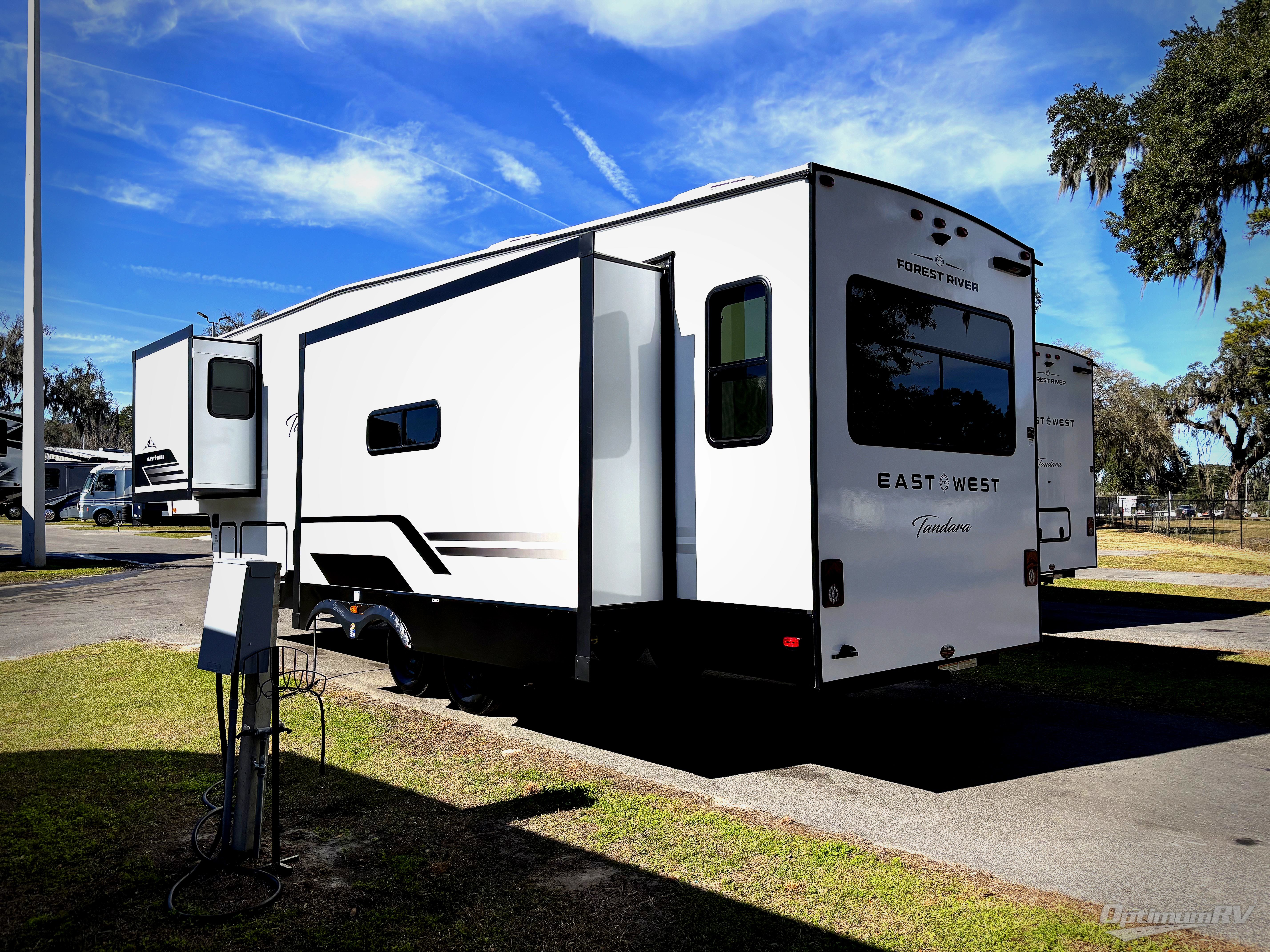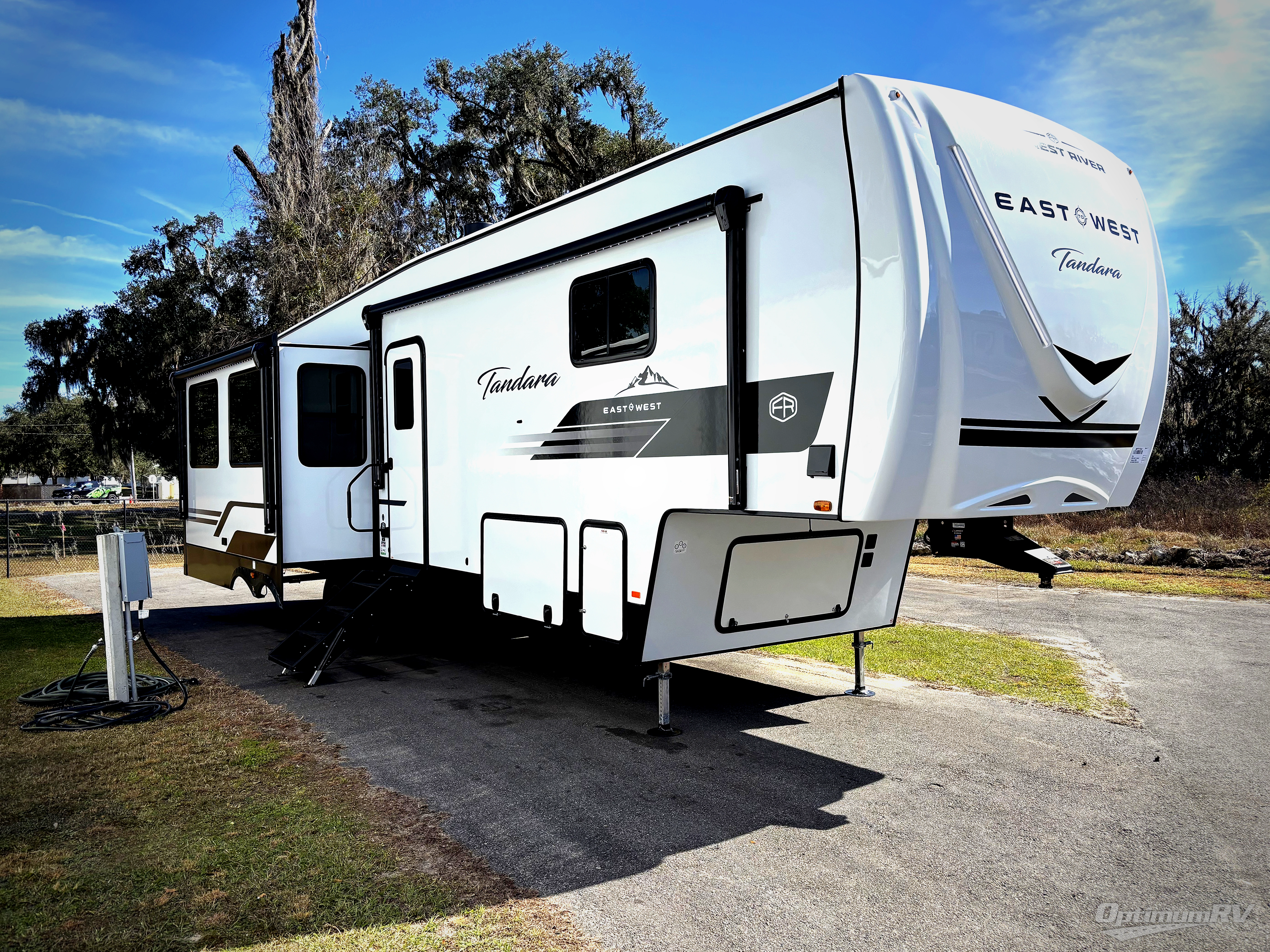 With any Tandara fifth wheel by EAST TO WEST, you will enjoy many standard features to make each trip enjoyable. The Tandara Exterior Luxury Package includes a universal all-in-one docking station, an automatic leveling system, metal slam latch cargo doors, and a 200W solar panel for off-grid capabilities. You will also appreciate the Tandara Climate Package with ductless flooring, dual attic vents, plus a heated and enclosed underbelly for added protection. Inside, you'll find a flush floor kitchen slide, Slow Rise roller shades, solid surface kitchen countertops, and more stand-out features included in the Tandara Interior Luxury Package.