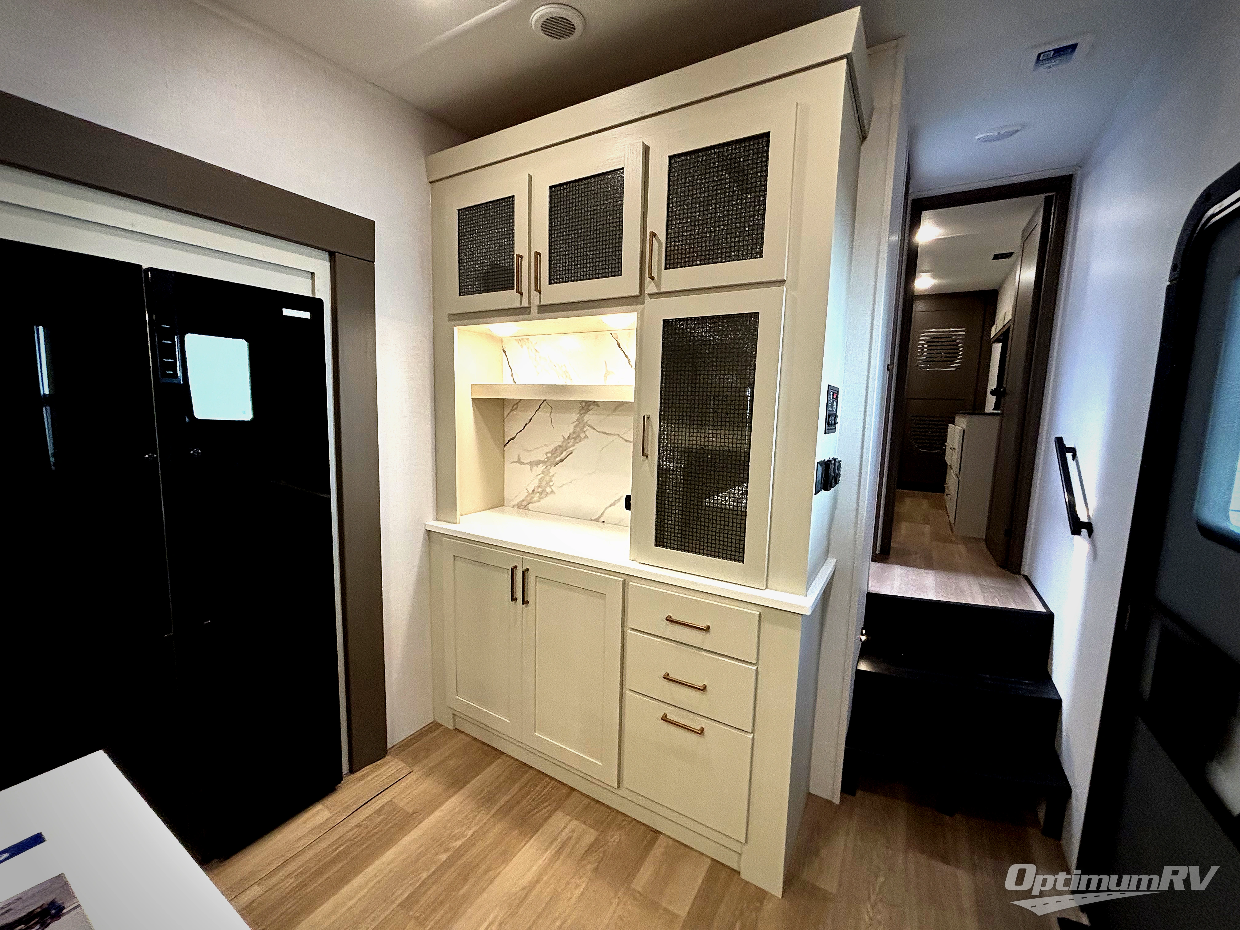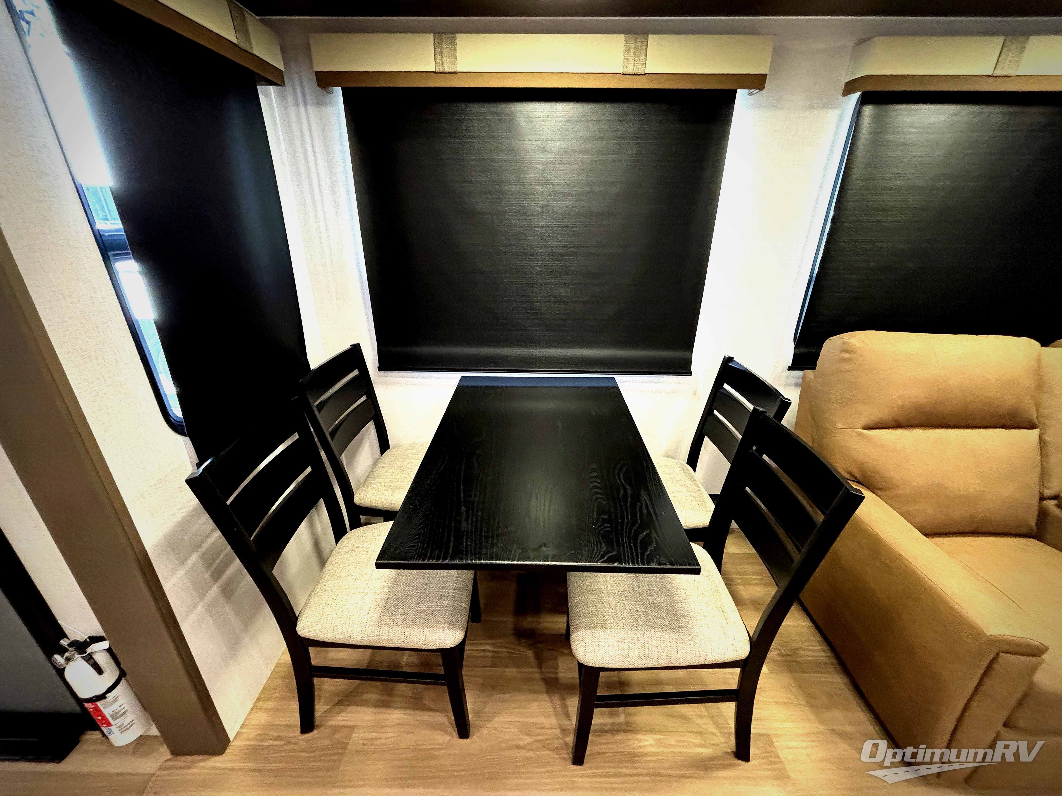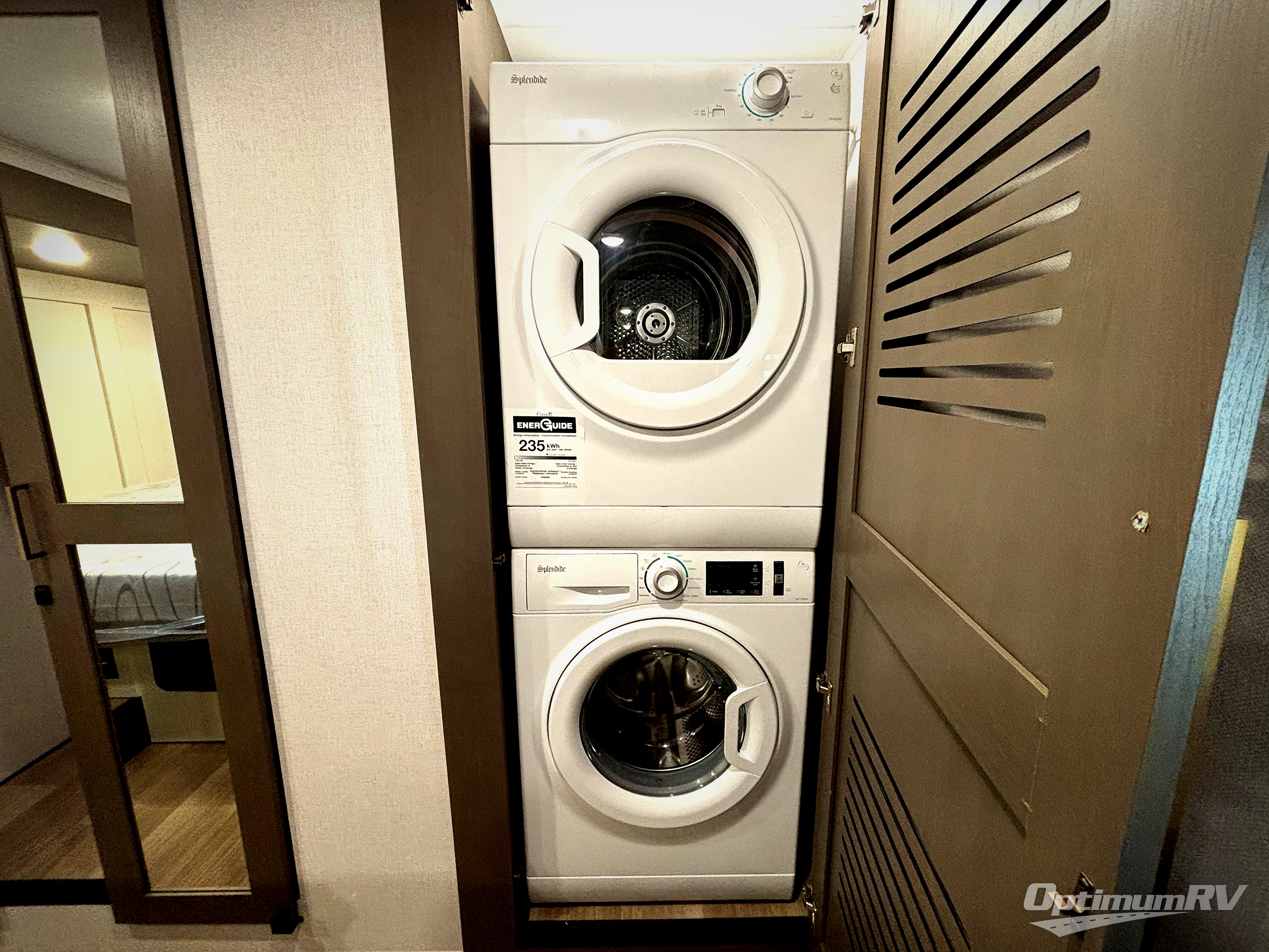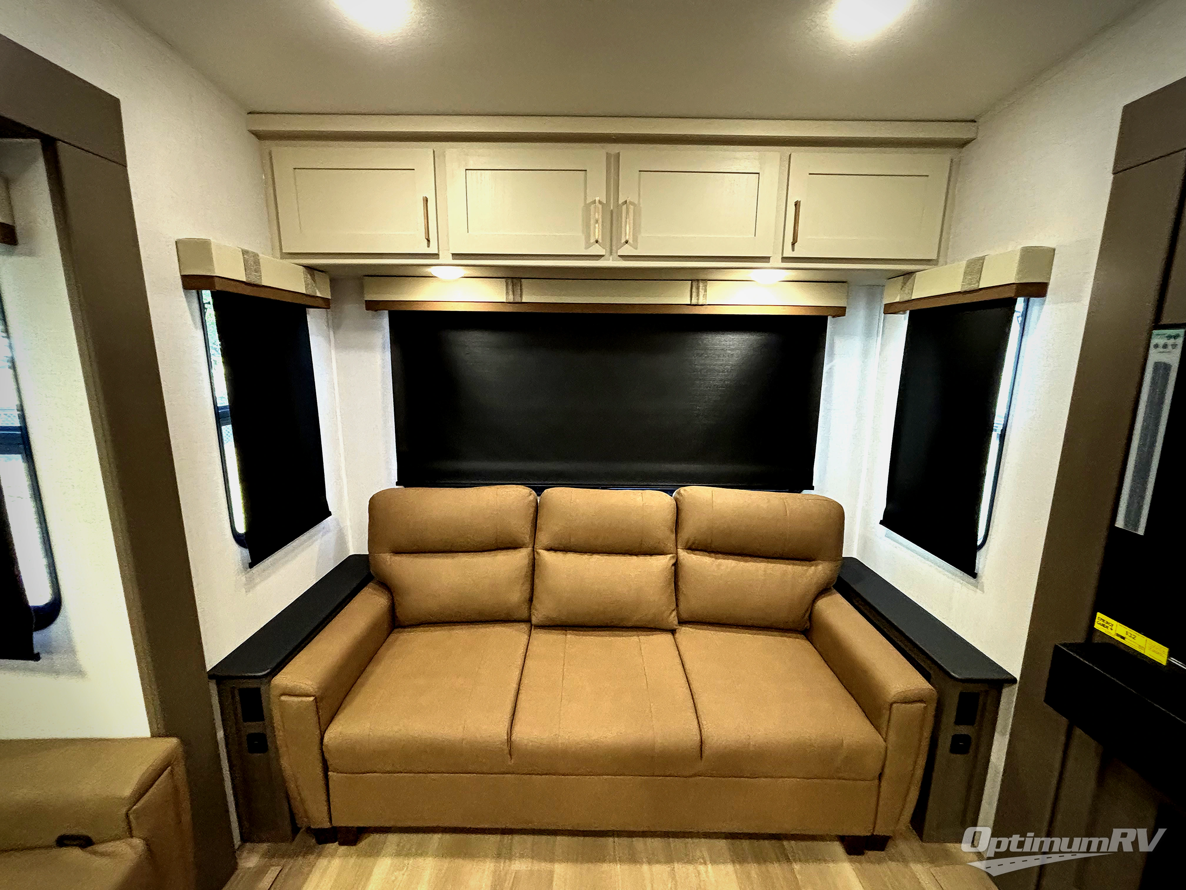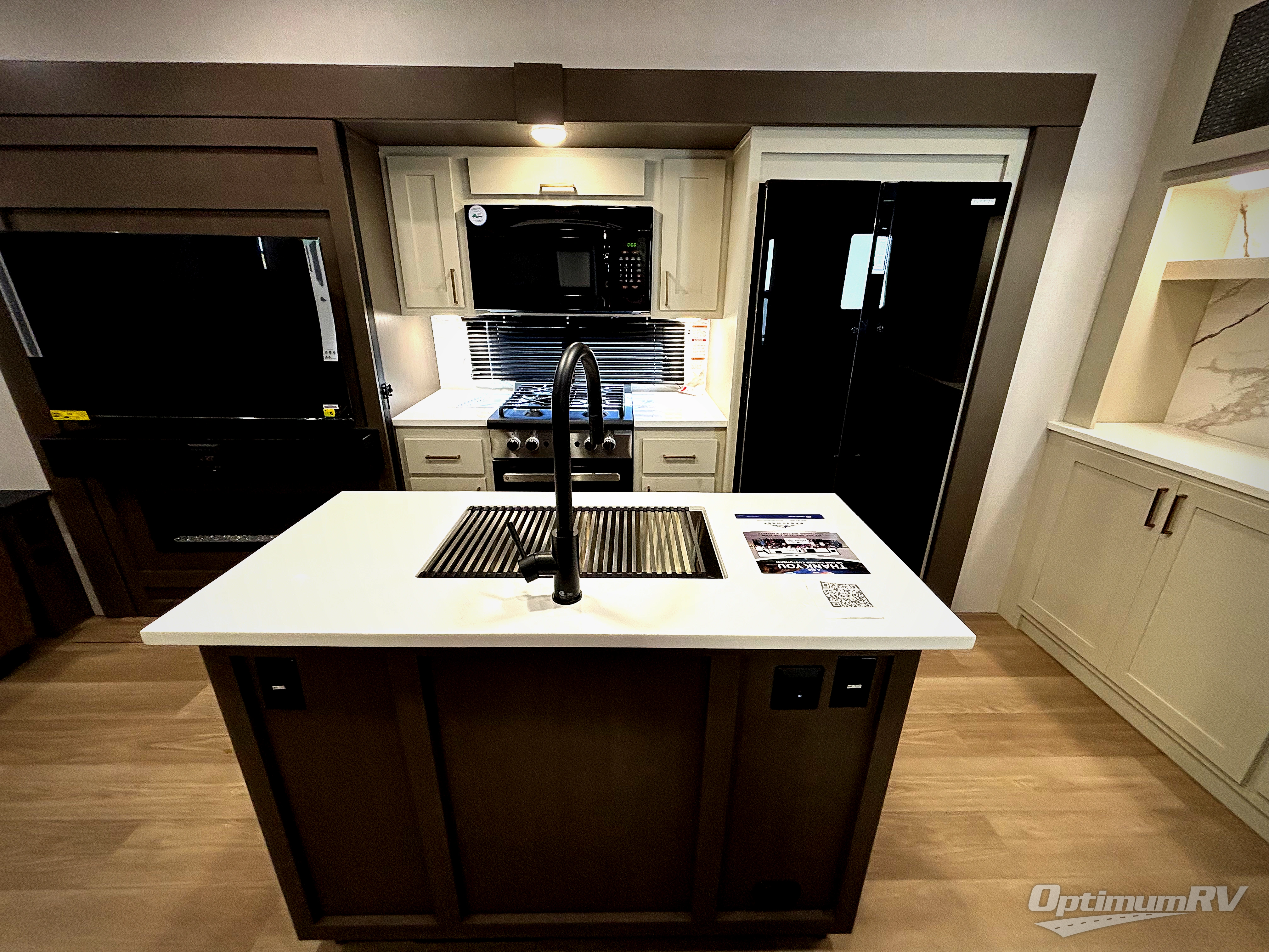 Enjoy luxury camping trips in this triple slide out fifth wheel! Once you've unloaded your gear, you can make lunch on the four burner 24" range, and the chef is sure to appreciate the kitchen island for more counter space. Your crew can dine at the free-standing dinette and relax on the theater seating across from the 50" TV and fireplace. There is also a hidden pantry behind the TV, and the queen bed hide-a-bed sofa will provide a place for guests to sleep! You'll find your own space up front in the private bedroom, complete with a king bed slide out with storage underneath, a dresser, plus a front wardrobe and stackable washer/dryer prep!