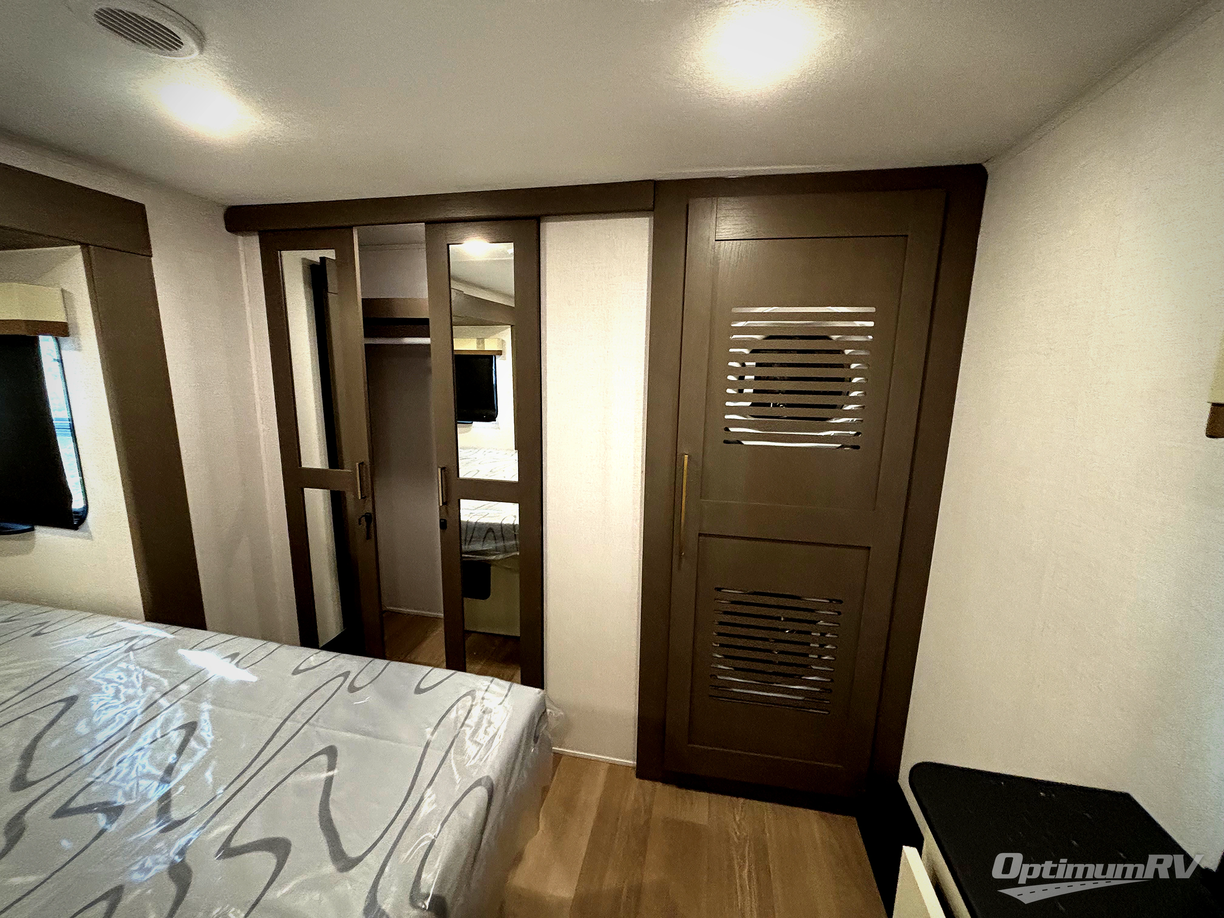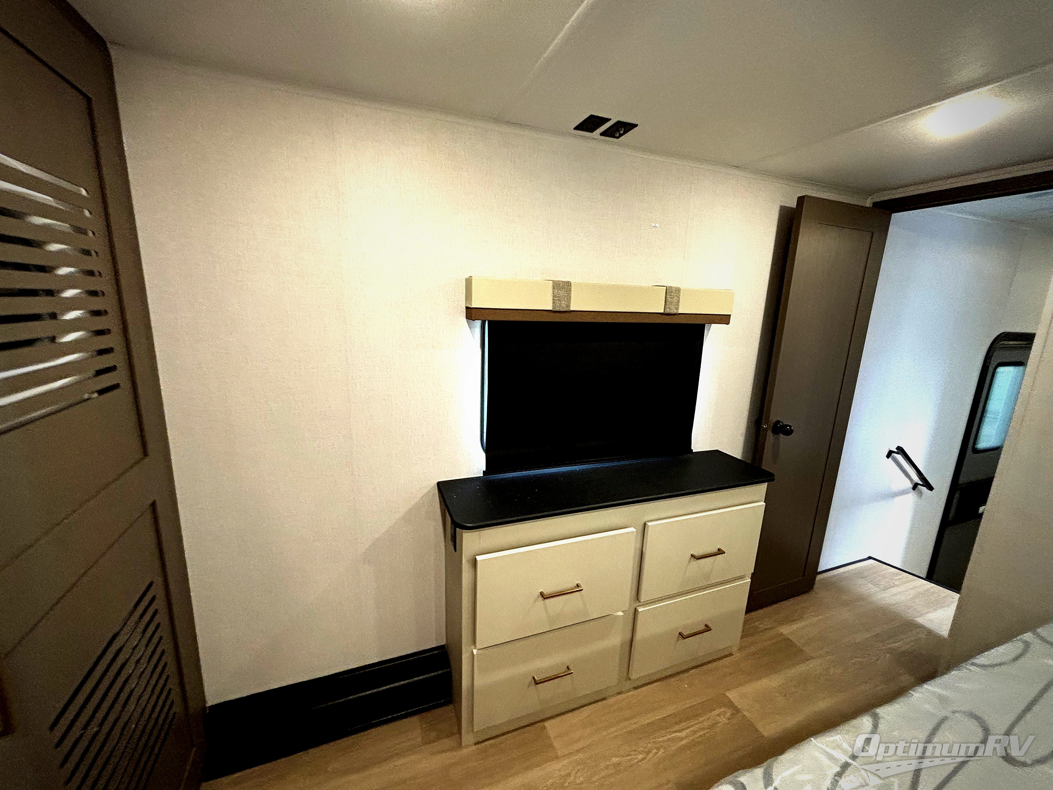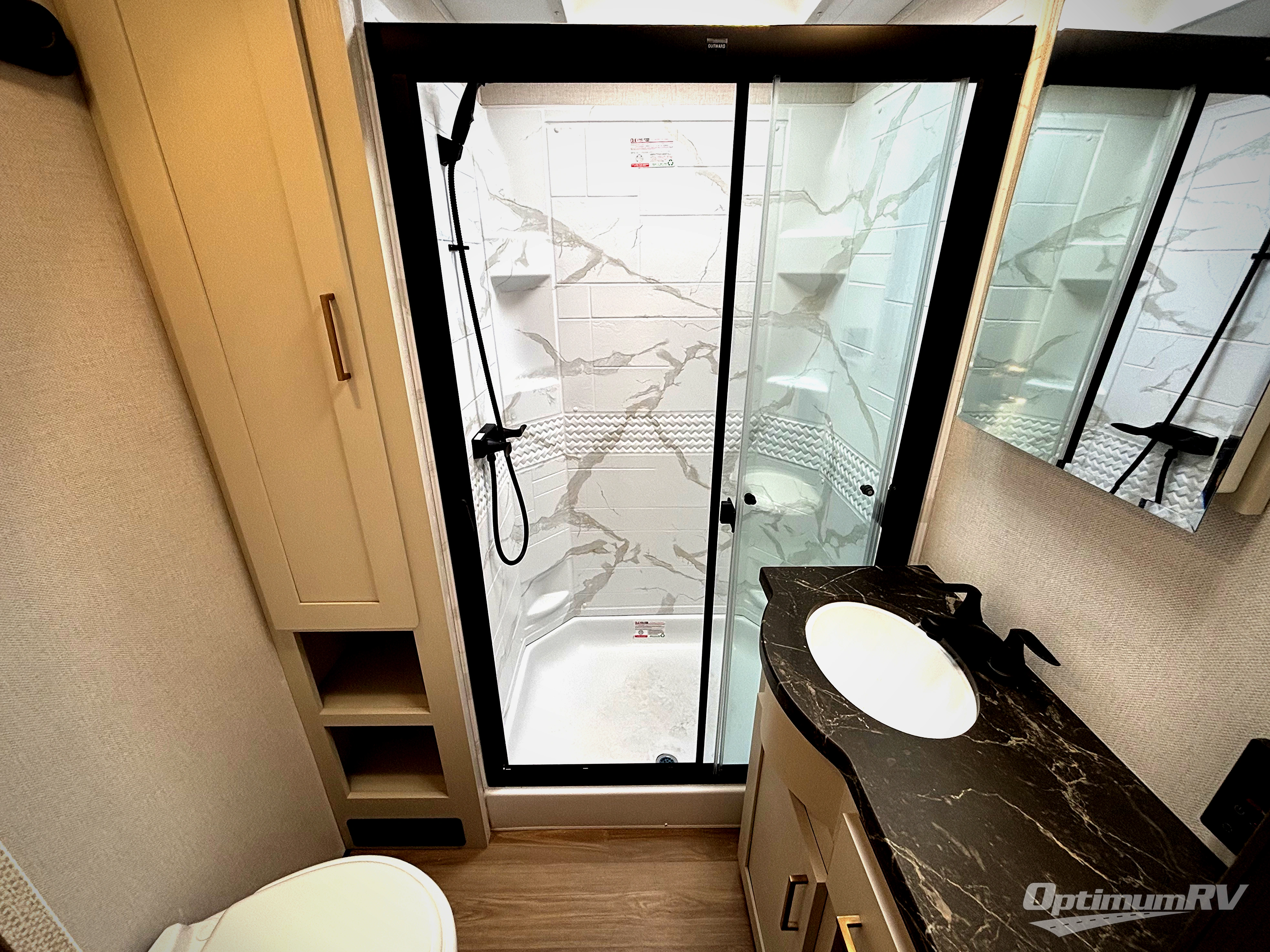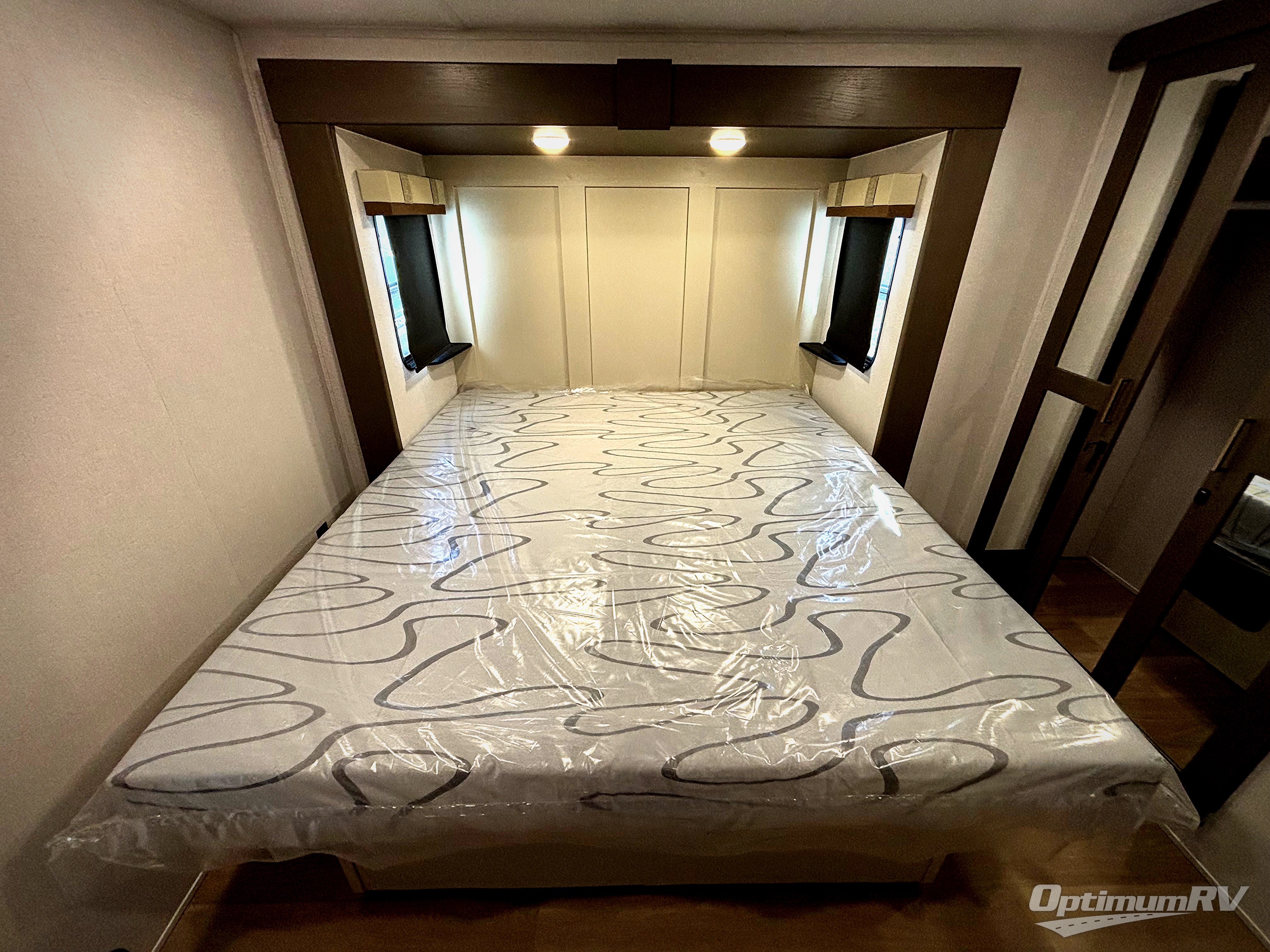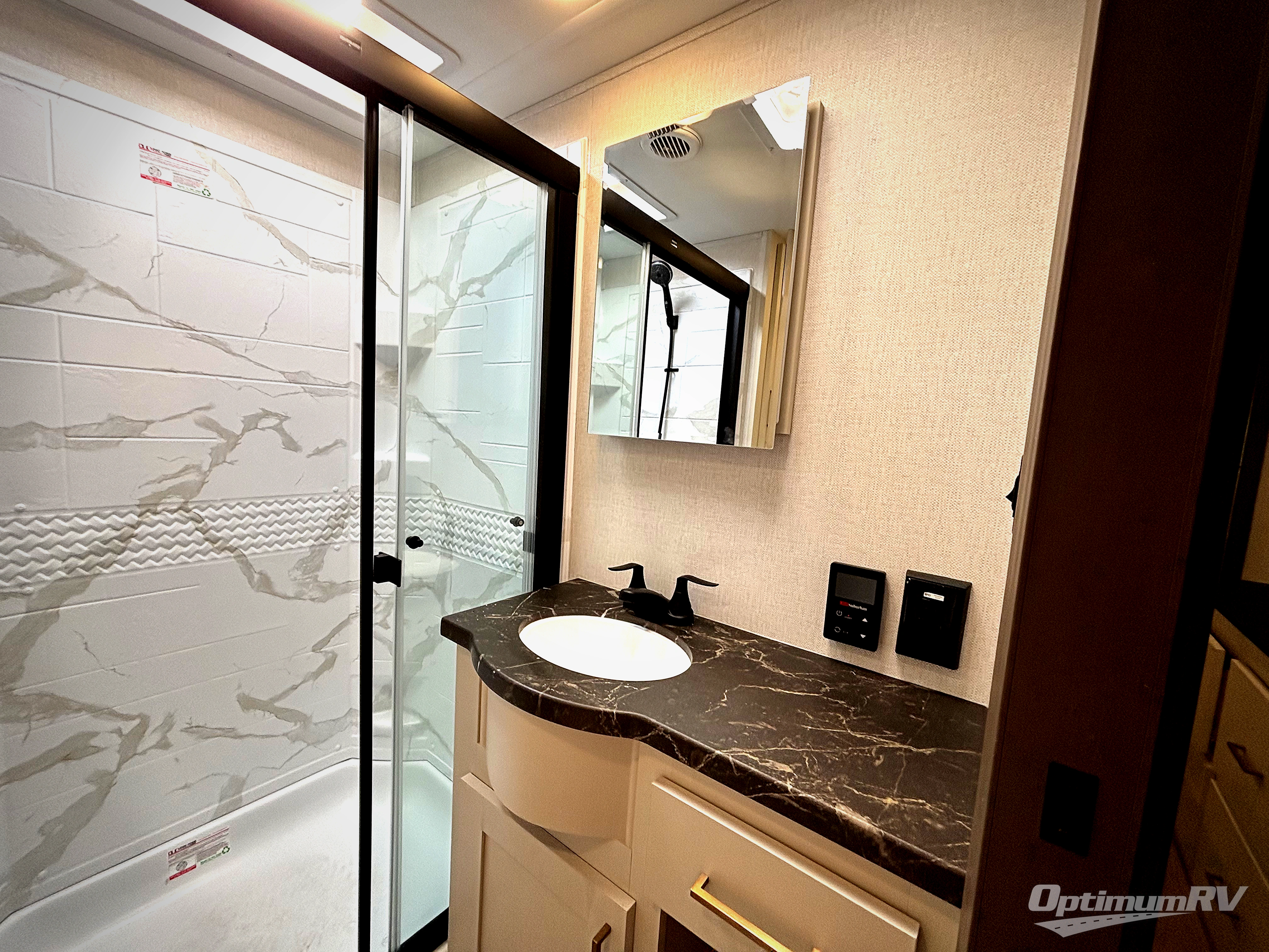 Enjoy luxury camping trips in this triple slide out fifth wheel! Once you've unloaded your gear, you can make lunch on the four burner 24" range, and the chef is sure to appreciate the kitchen island for more counter space. Your crew can dine at the free-standing dinette and relax on the theater seating across from the 50" TV and fireplace. There is also a hidden pantry behind the TV, and the queen bed hide-a-bed sofa will provide a place for guests to sleep! You'll find your own space up front in the private bedroom, complete with a king bed slide out with storage underneath, a dresser, plus a front wardrobe and stackable washer/dryer prep!