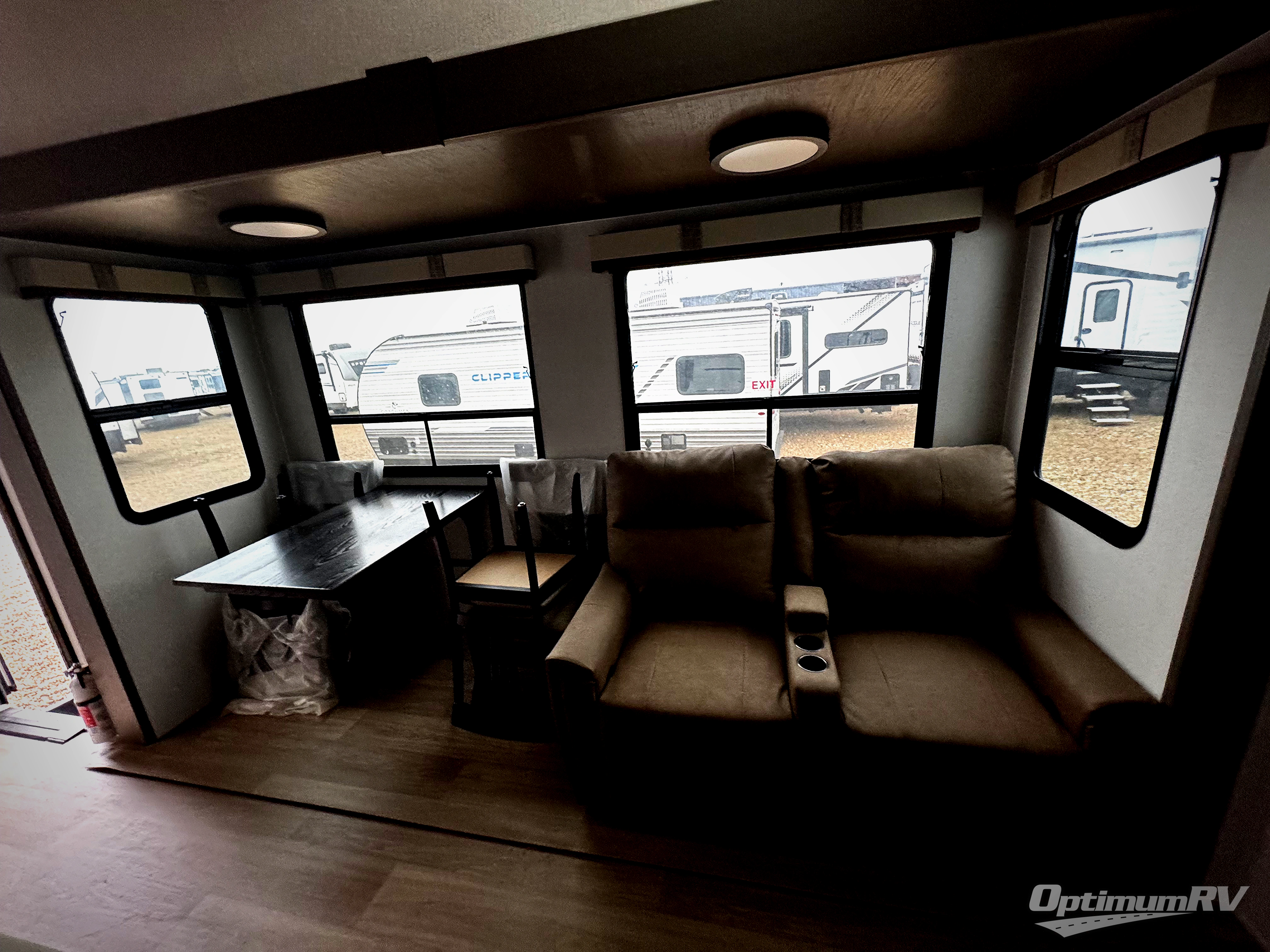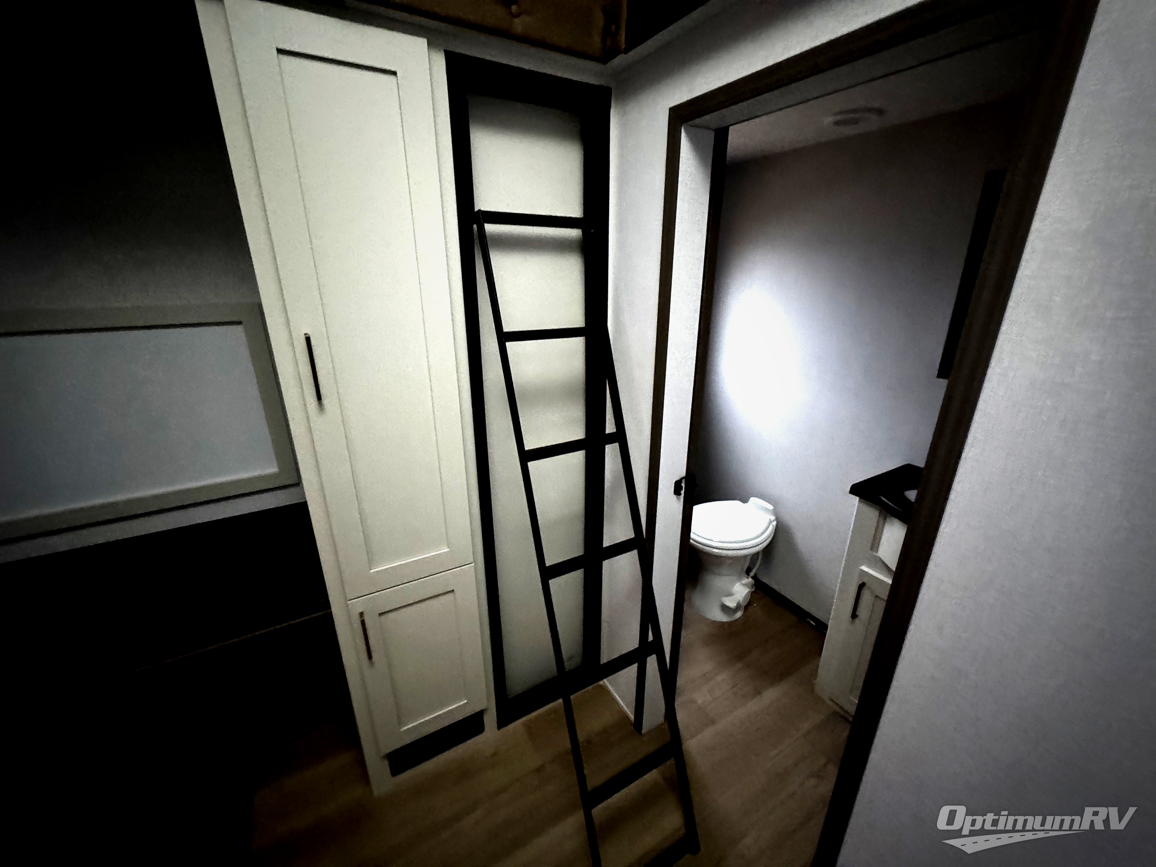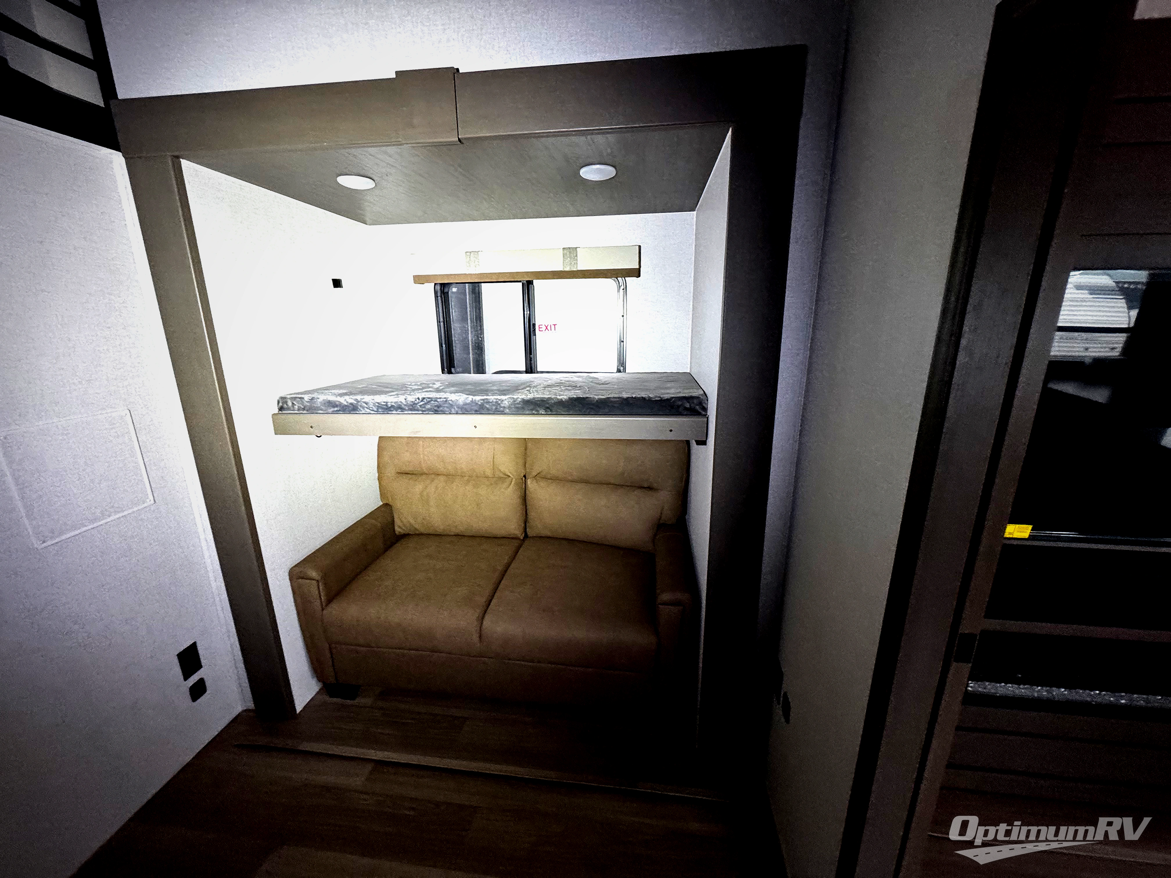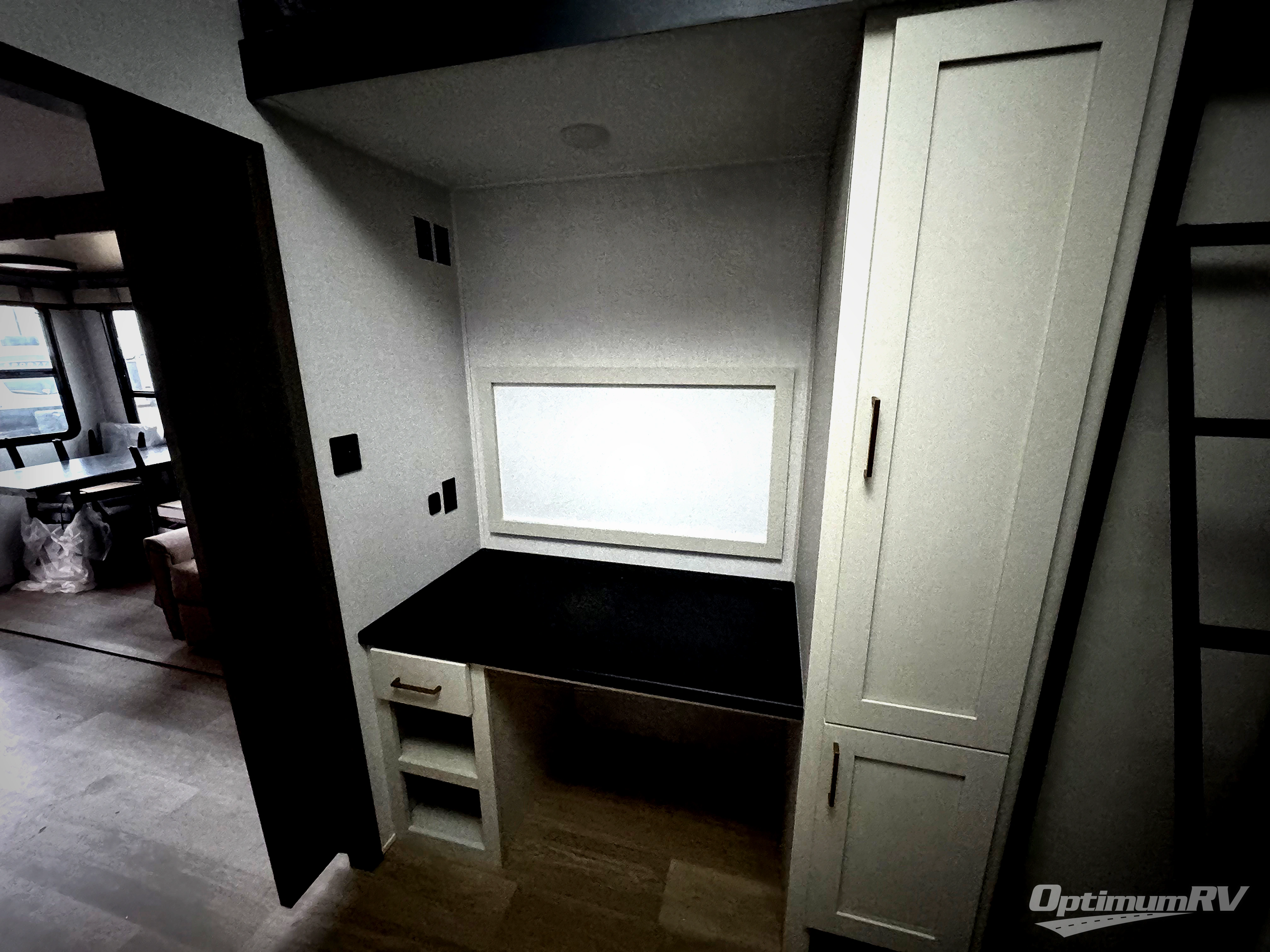 This is the perfect fifth wheel if you enjoy bringing along extra friends and family! You'll have the front private bedroom all to yourselves with a king bed slide out, a dresser with TV prep, plus a large front wardrobe and stackable washer/dryer prep. And a full bath is right next door for easy use. Your guests will love the rear bunkhouse suite with a hide-a-bed sofa and fold-down bunk and a desk with a chair. There is also a full rear bath with its own exterior entry door and a loft area for even more sleeping or storage space. In the morning, you can all meet in the combined kitchen and living area that includes dual opposing slides for more space, a kitchen island, and a hutch for additional storage. There is also theater seating in direct view of the 50" TV and fireplace, along with a dinette with four chairs where you can dine together.
