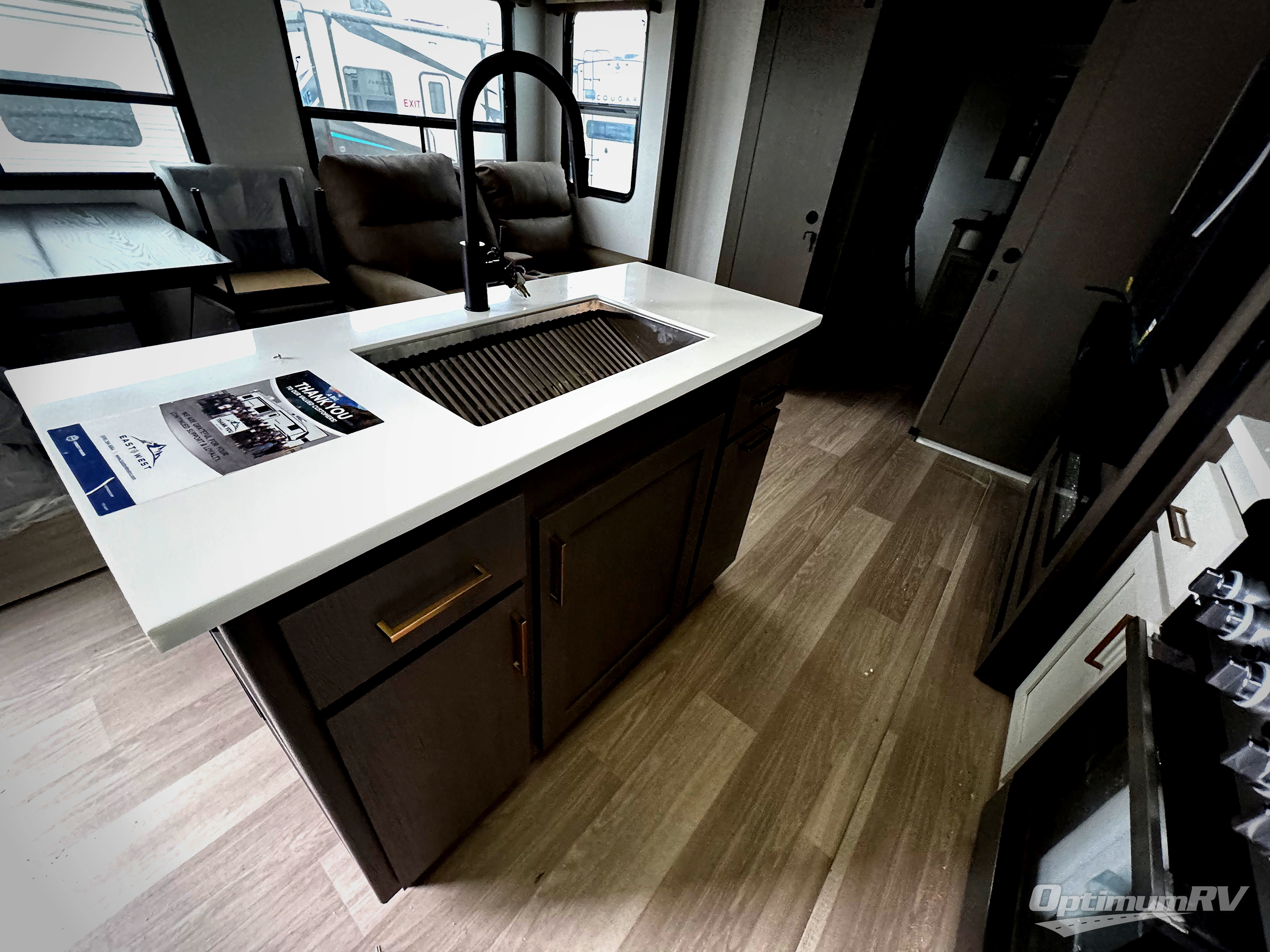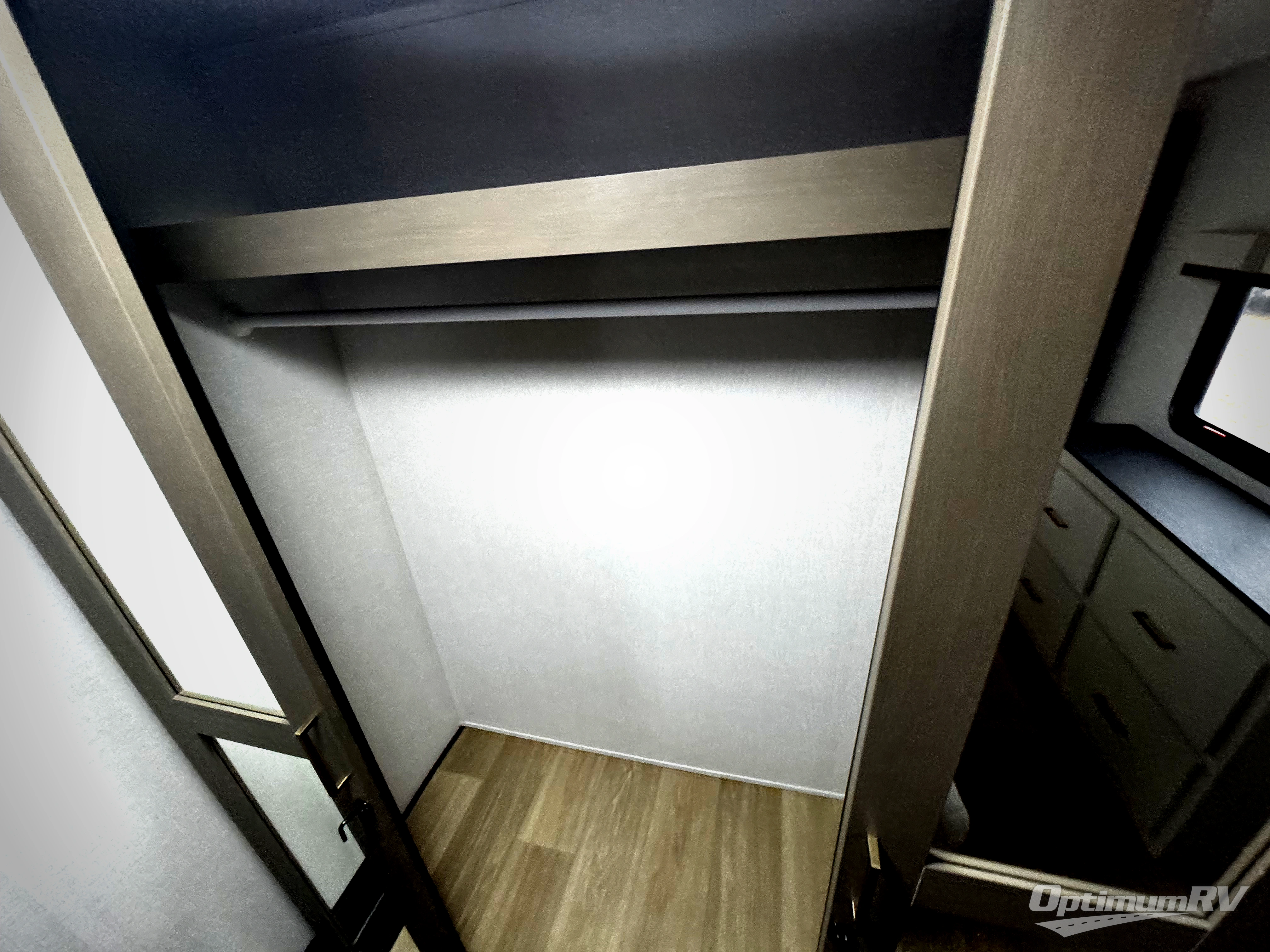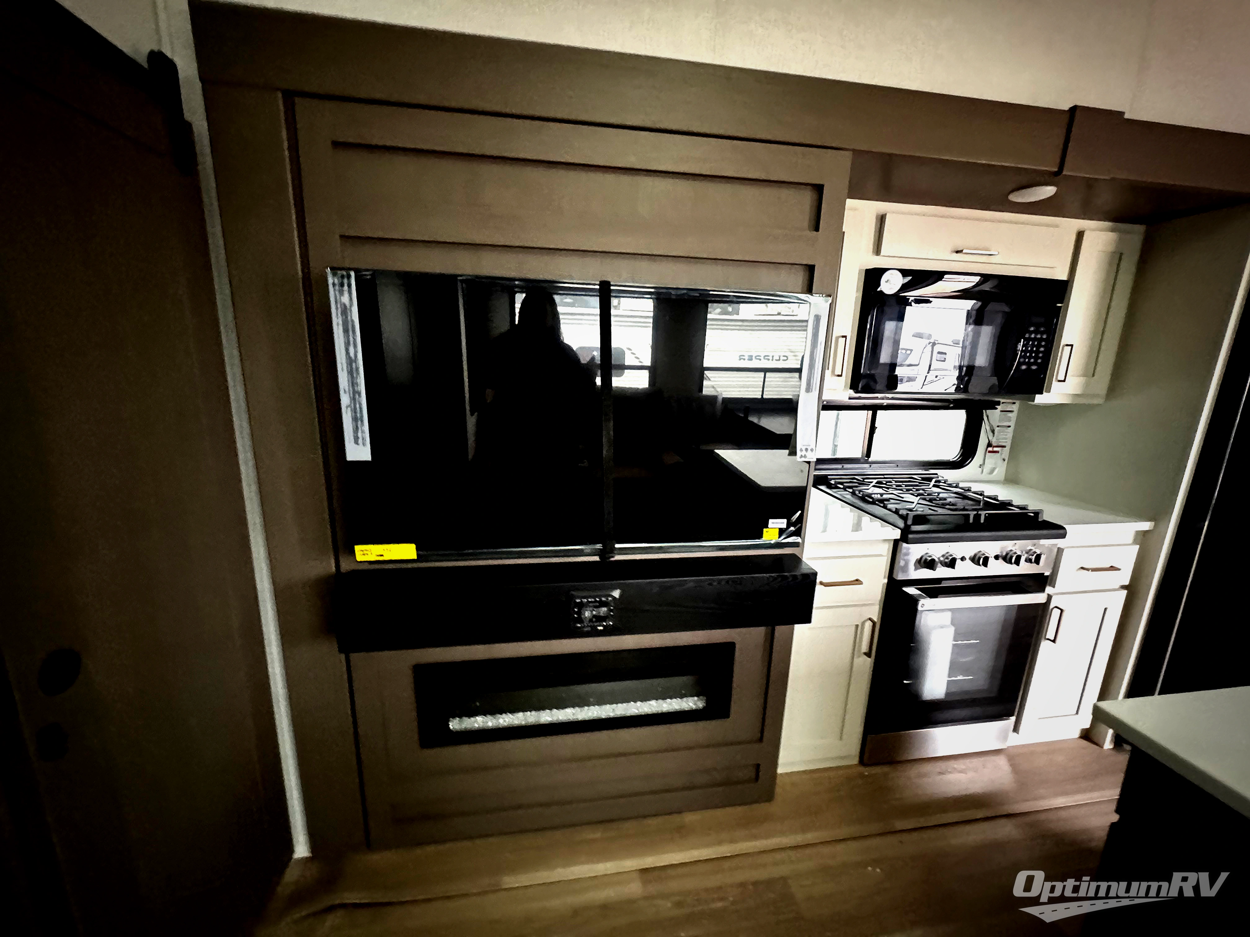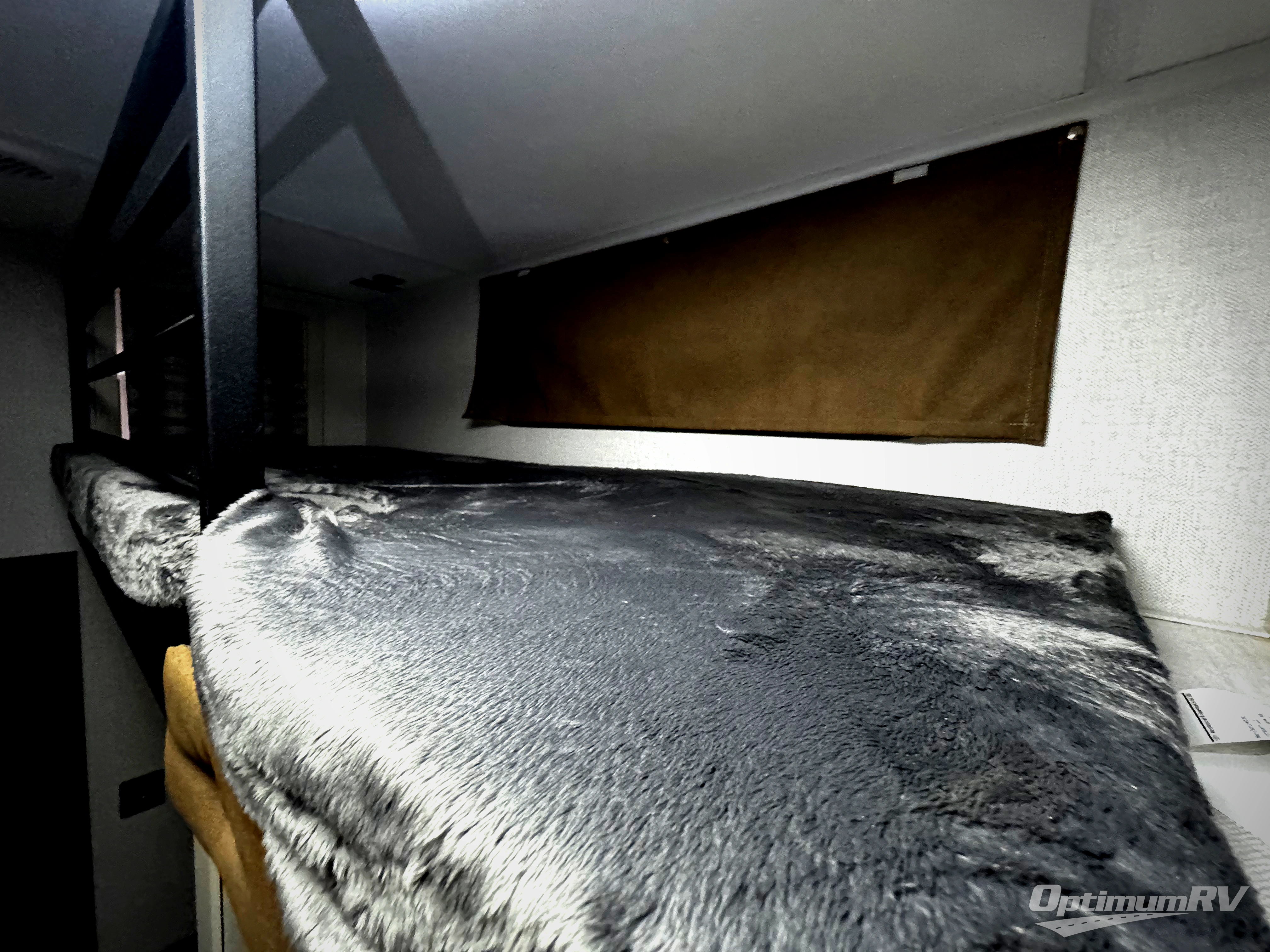 This is the perfect fifth wheel if you enjoy bringing along extra friends and family! You'll have the front private bedroom all to yourselves with a king bed slide out, a dresser with TV prep, plus a large front wardrobe and stackable washer/dryer prep. And a full bath is right next door for easy use. Your guests will love the rear bunkhouse suite with a hide-a-bed sofa and fold-down bunk and a desk with a chair. There is also a full rear bath with its own exterior entry door and a loft area for even more sleeping or storage space. In the morning, you can all meet in the combined kitchen and living area that includes dual opposing slides for more space, a kitchen island, and a hutch for additional storage. There is also theater seating in direct view of the 50" TV and fireplace, along with a dinette with four chairs where you can dine together.