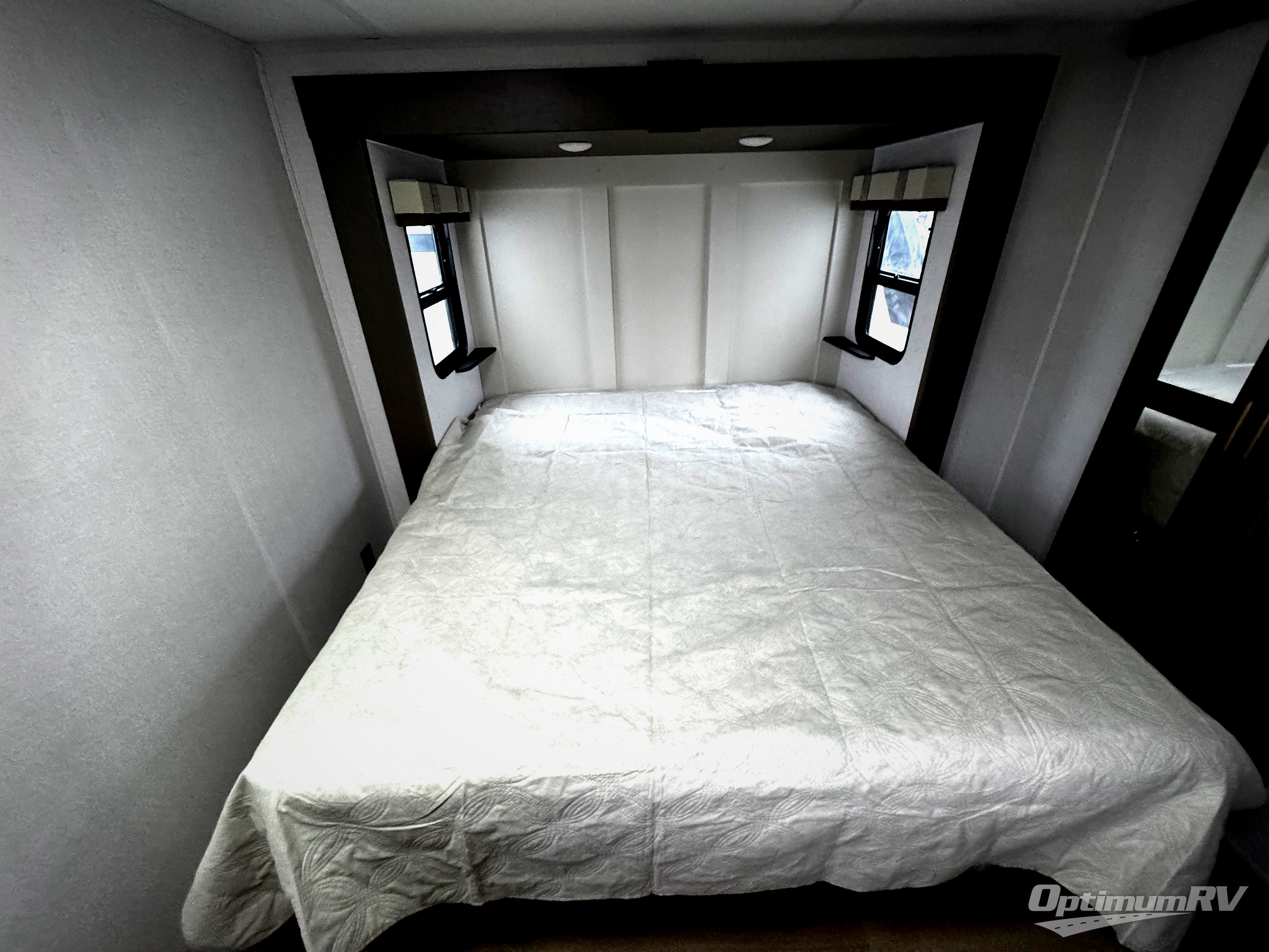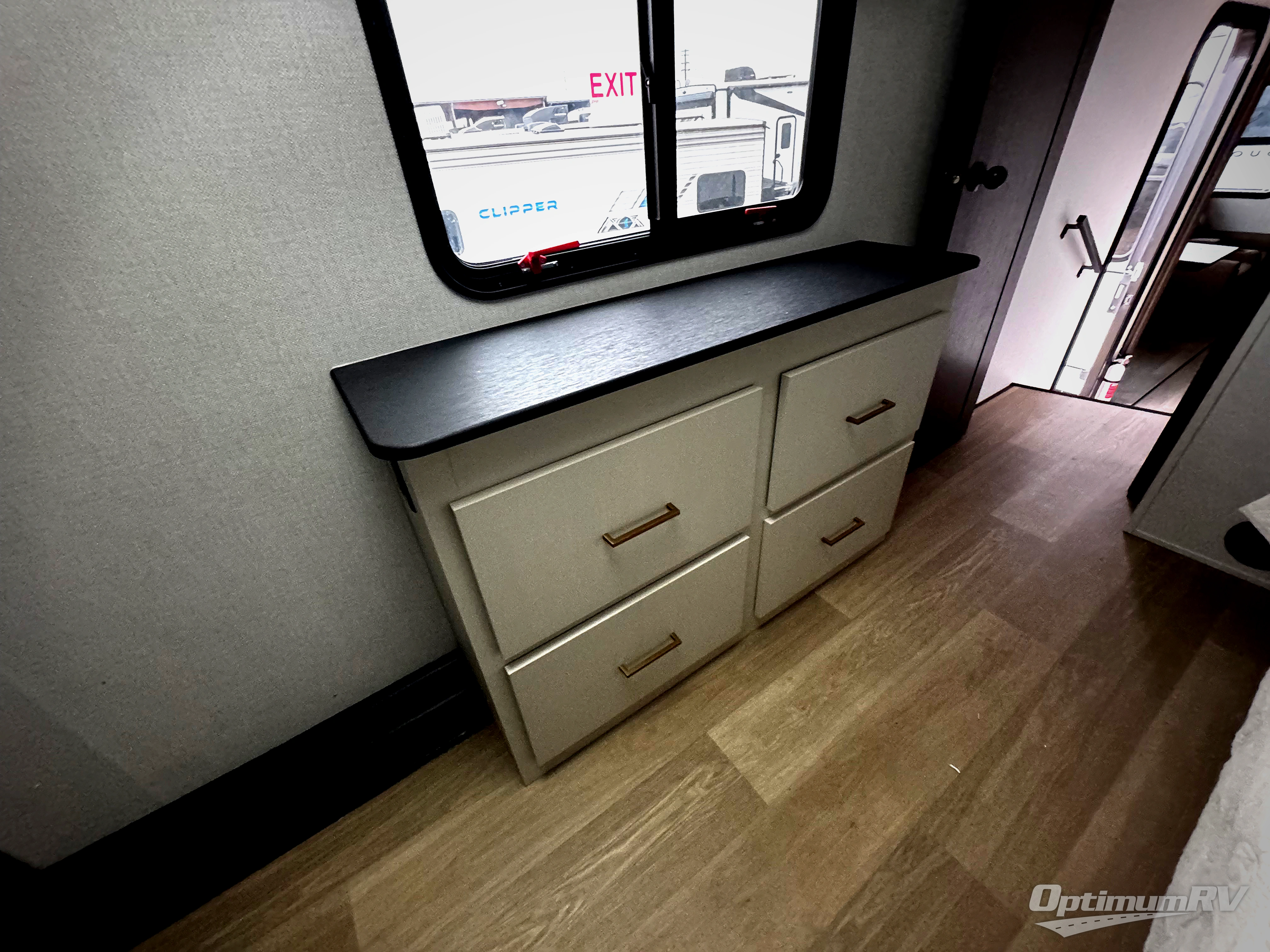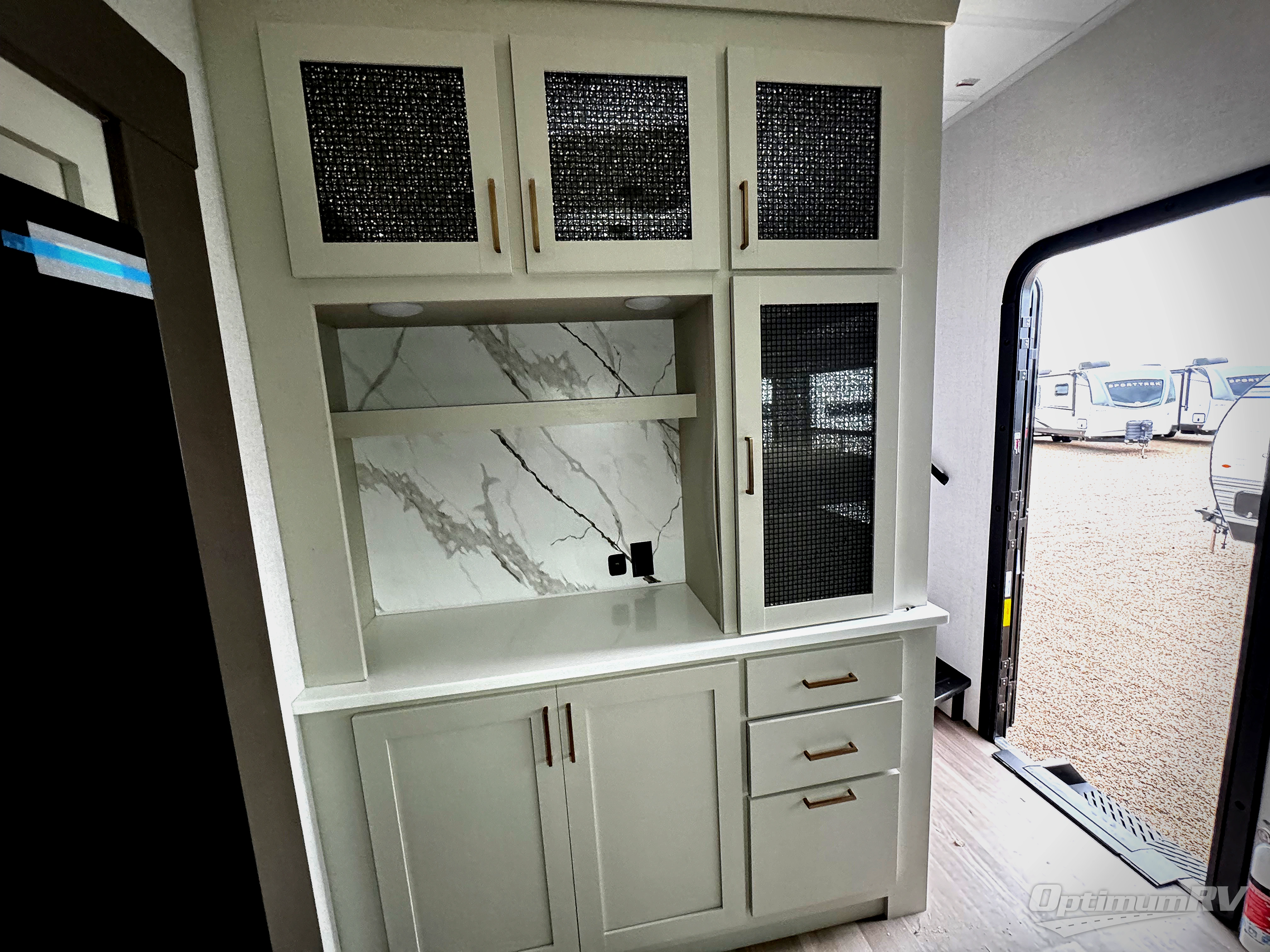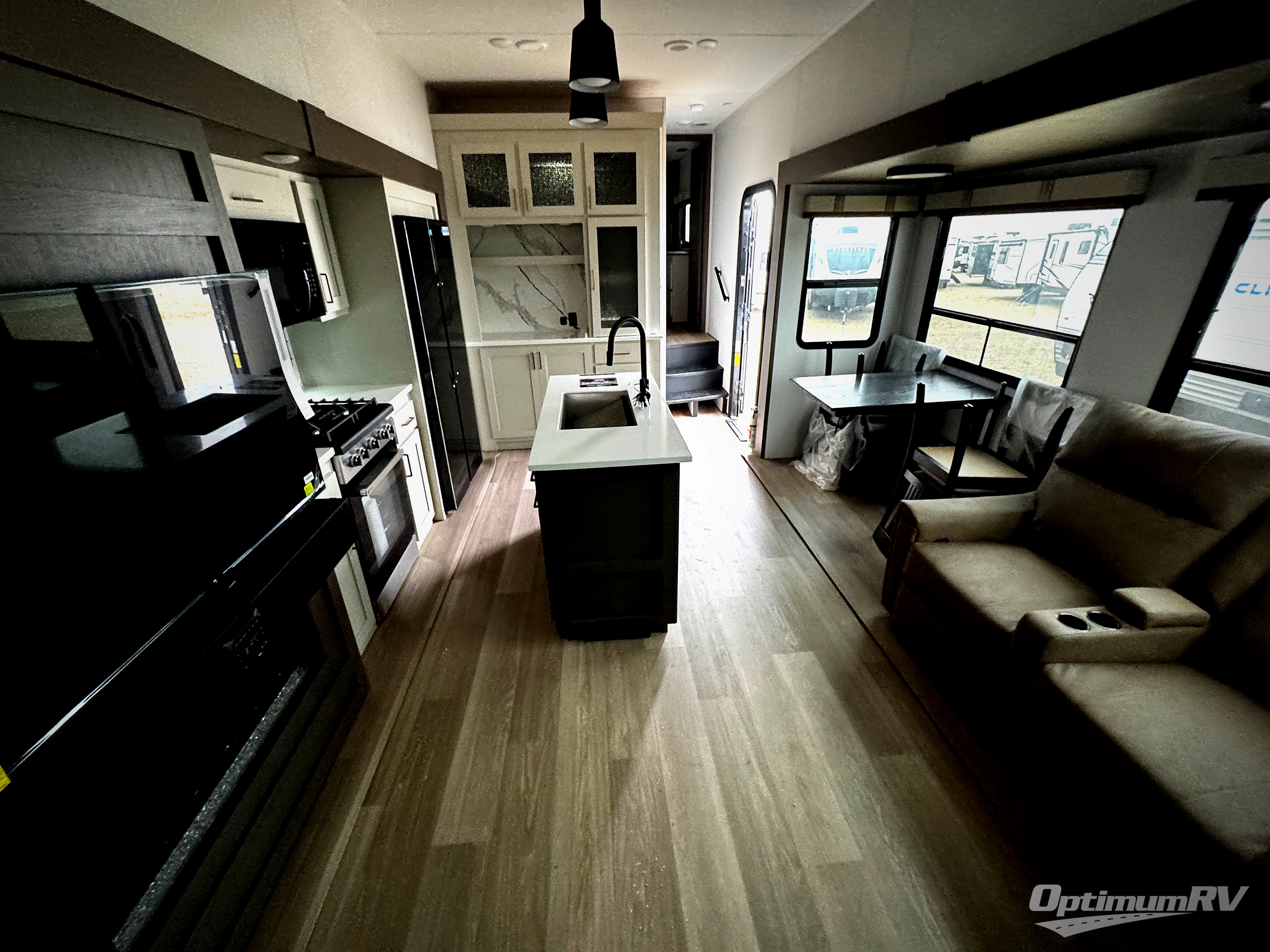 This is the perfect fifth wheel if you enjoy bringing along extra friends and family! You'll have the front private bedroom all to yourselves with a king bed slide out, a dresser with TV prep, plus a large front wardrobe and stackable washer/dryer prep. And a full bath is right next door for easy use. Your guests will love the rear bunkhouse suite with a hide-a-bed sofa and fold-down bunk and a desk with a chair. There is also a full rear bath with its own exterior entry door and a loft area for even more sleeping or storage space. In the morning, you can all meet in the combined kitchen and living area that includes dual opposing slides for more space, a kitchen island, and a hutch for additional storage. There is also theater seating in direct view of the 50" TV and fireplace, along with a dinette with four chairs where you can dine together.