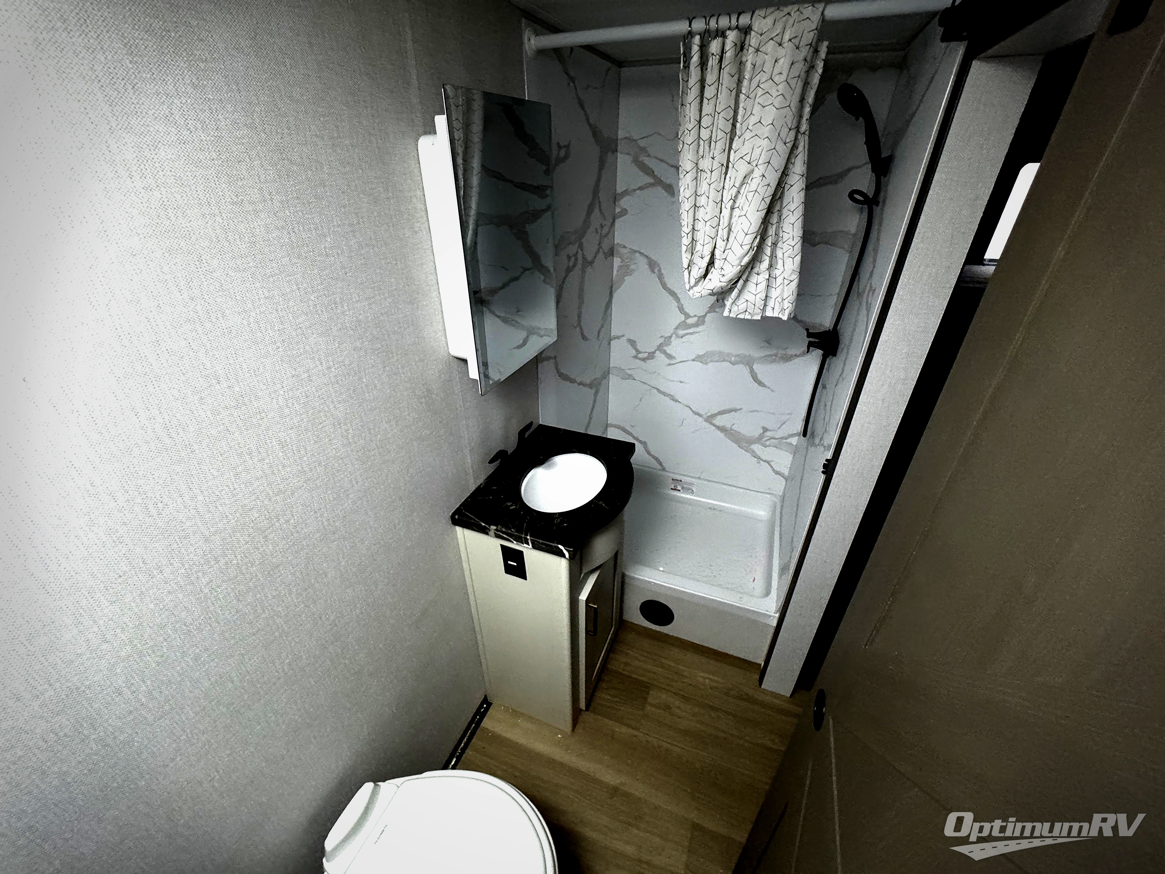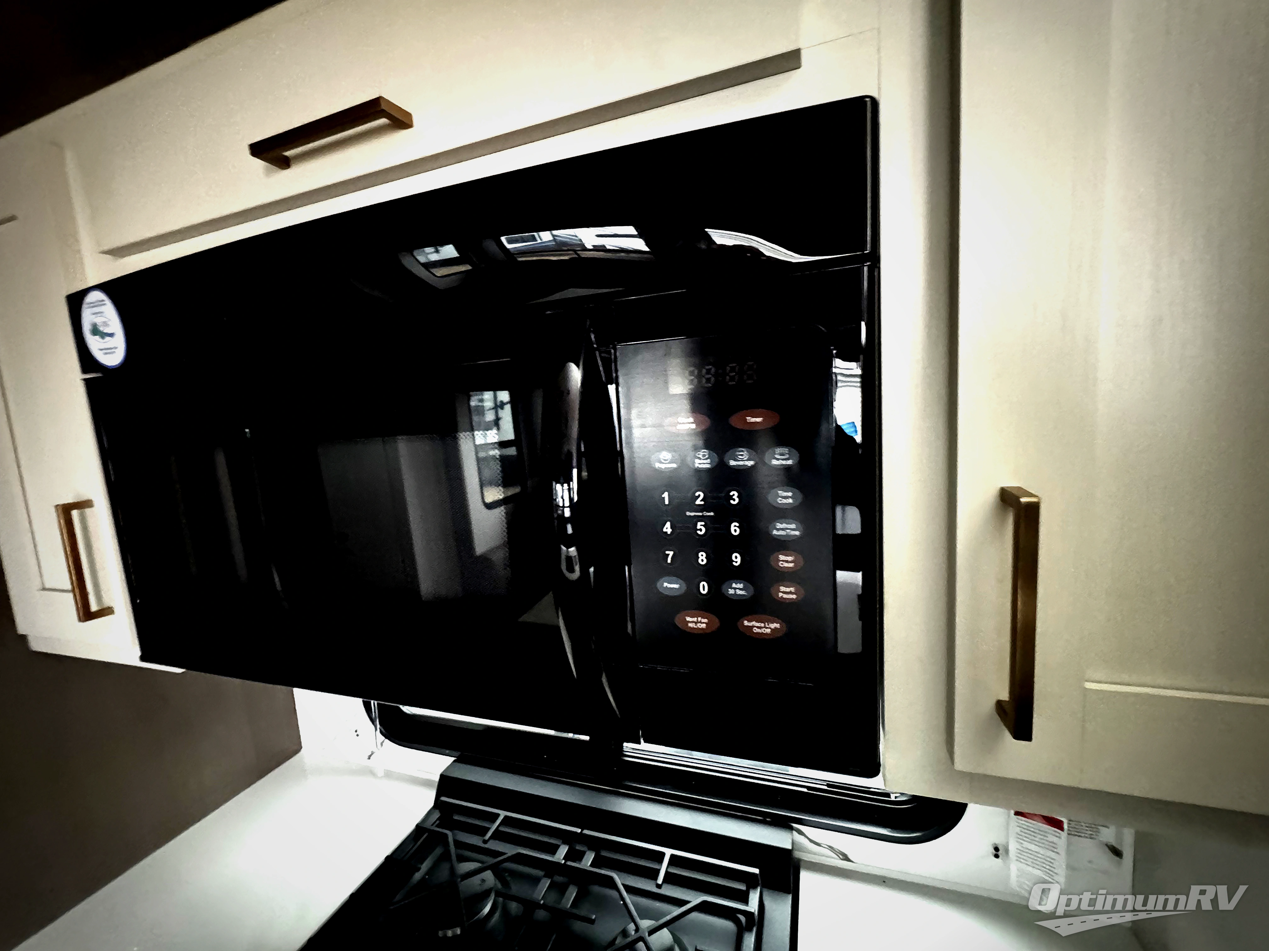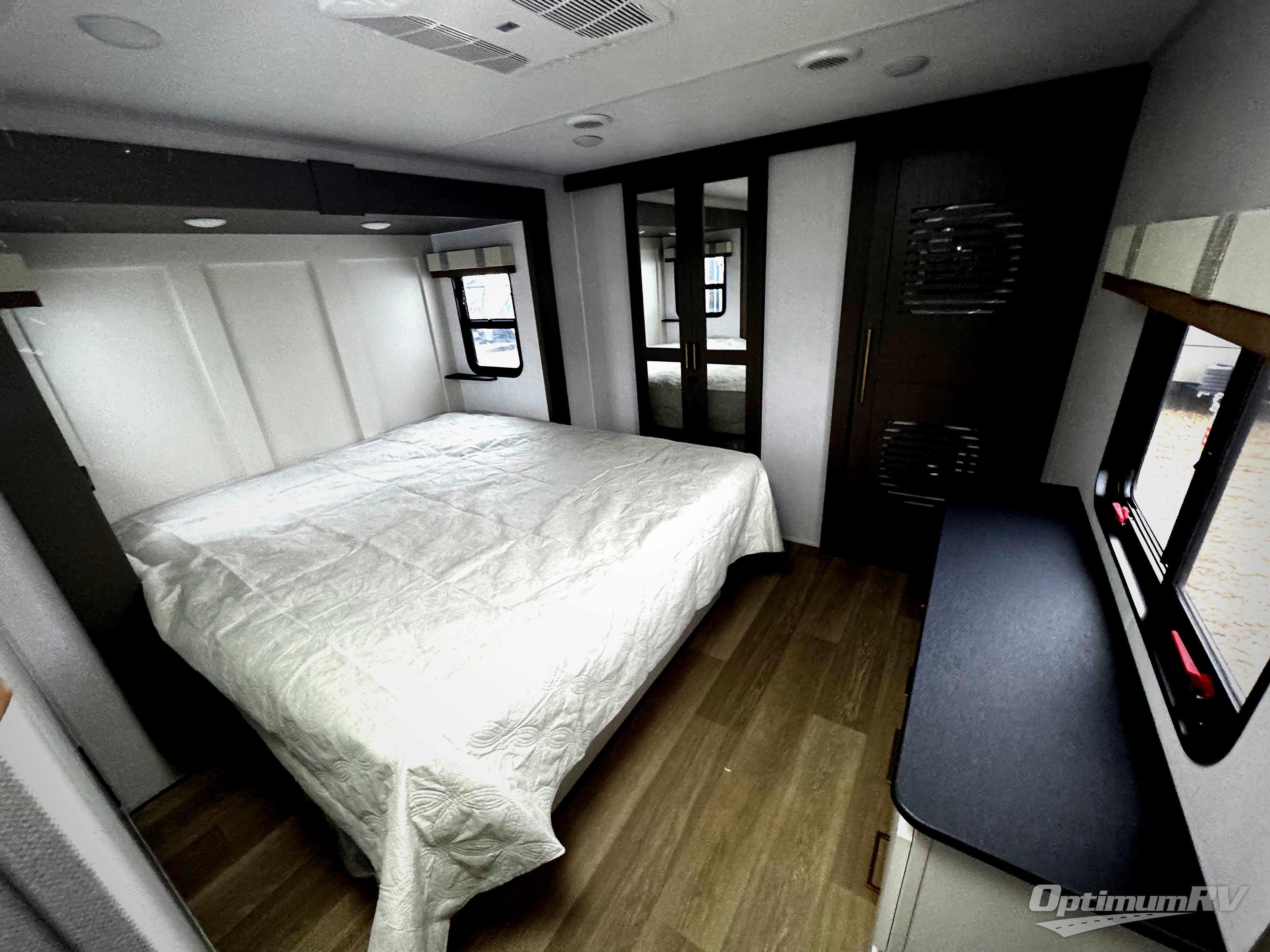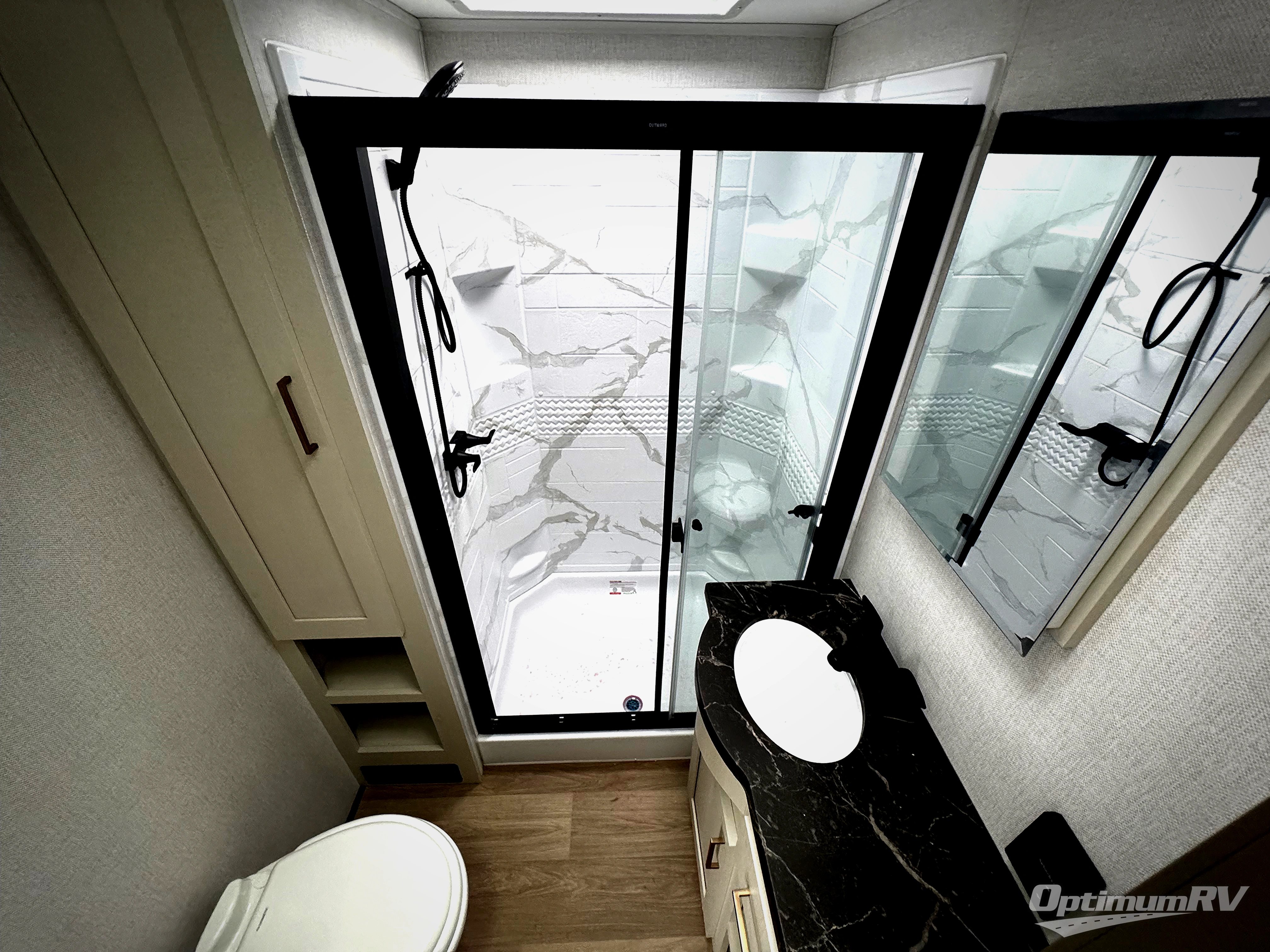 This is the perfect fifth wheel if you enjoy bringing along extra friends and family! You'll have the front private bedroom all to yourselves with a king bed slide out, a dresser with TV prep, plus a large front wardrobe and stackable washer/dryer prep. And a full bath is right next door for easy use. Your guests will love the rear bunkhouse suite with a hide-a-bed sofa and fold-down bunk and a desk with a chair. There is also a full rear bath with its own exterior entry door and a loft area for even more sleeping or storage space. In the morning, you can all meet in the combined kitchen and living area that includes dual opposing slides for more space, a kitchen island, and a hutch for additional storage. There is also theater seating in direct view of the 50" TV and fireplace, along with a dinette with four chairs where you can dine together.