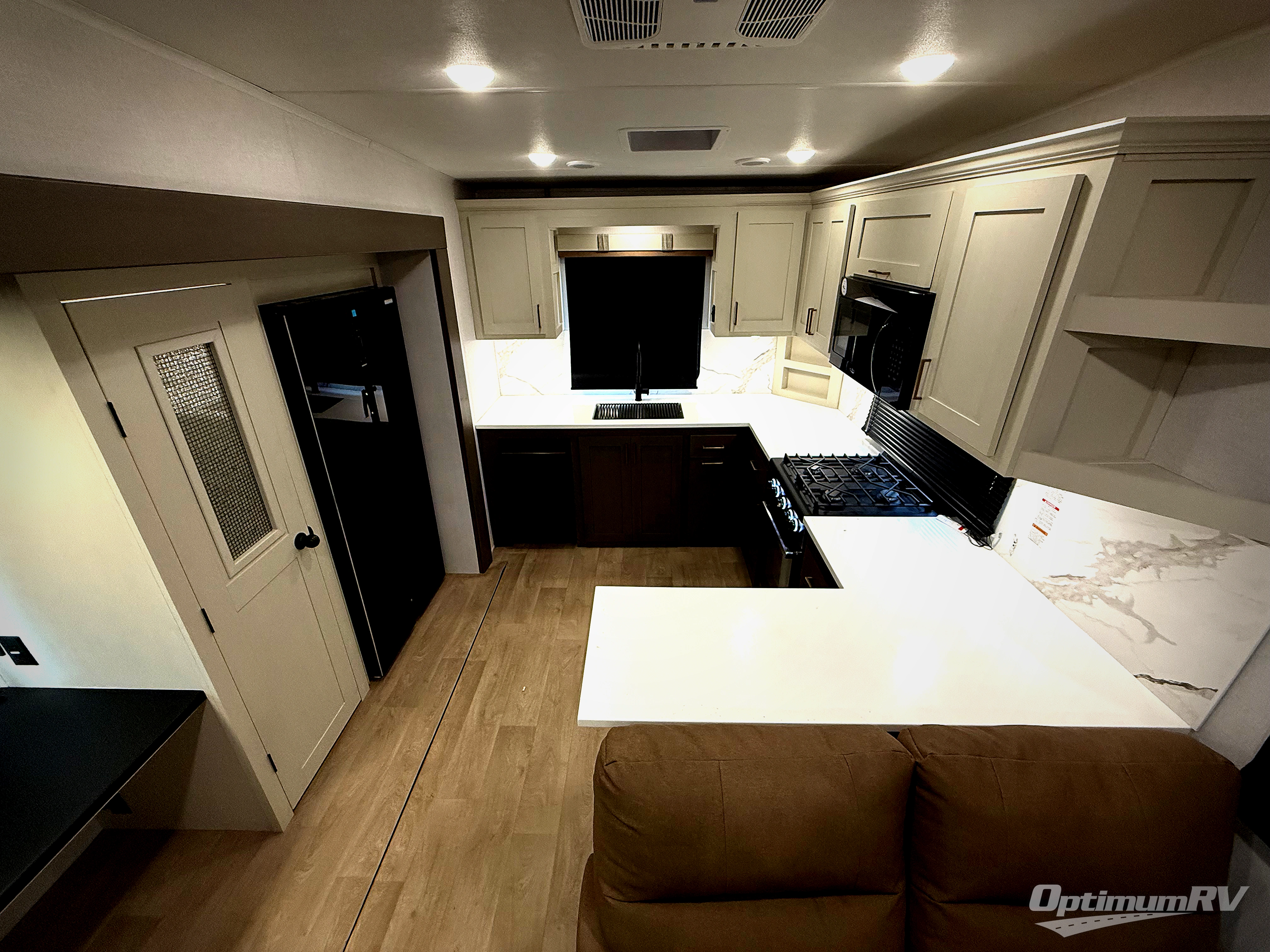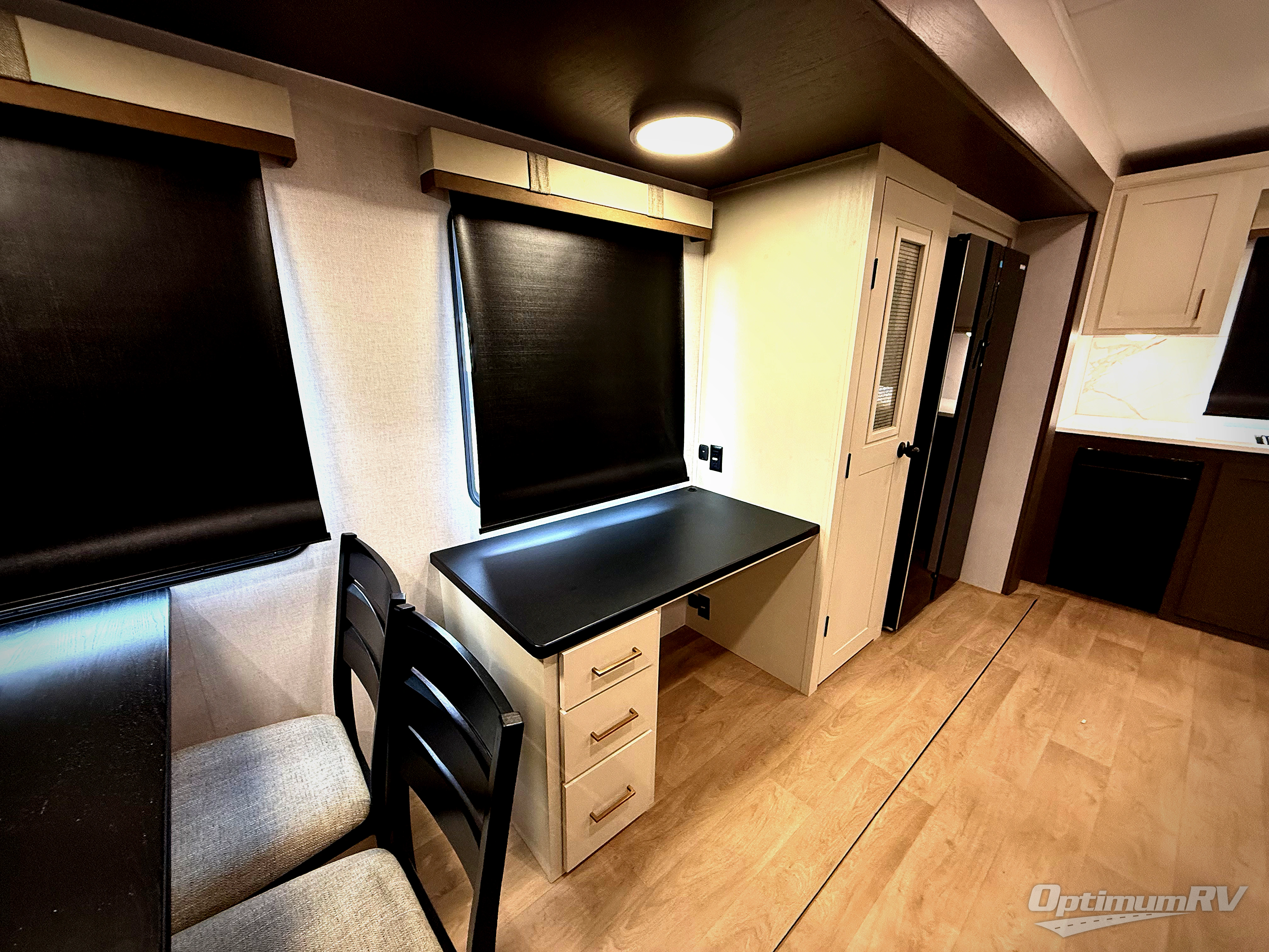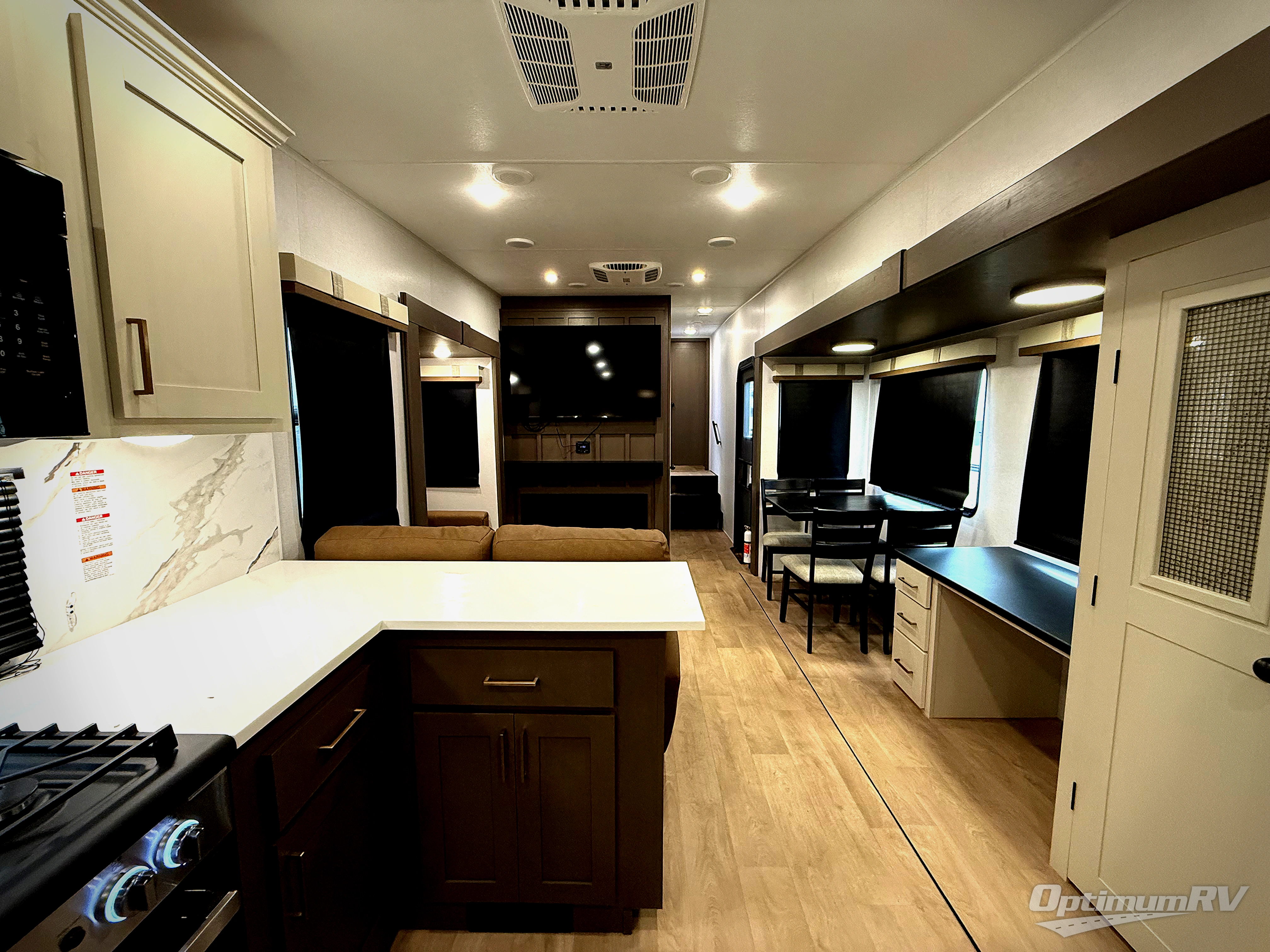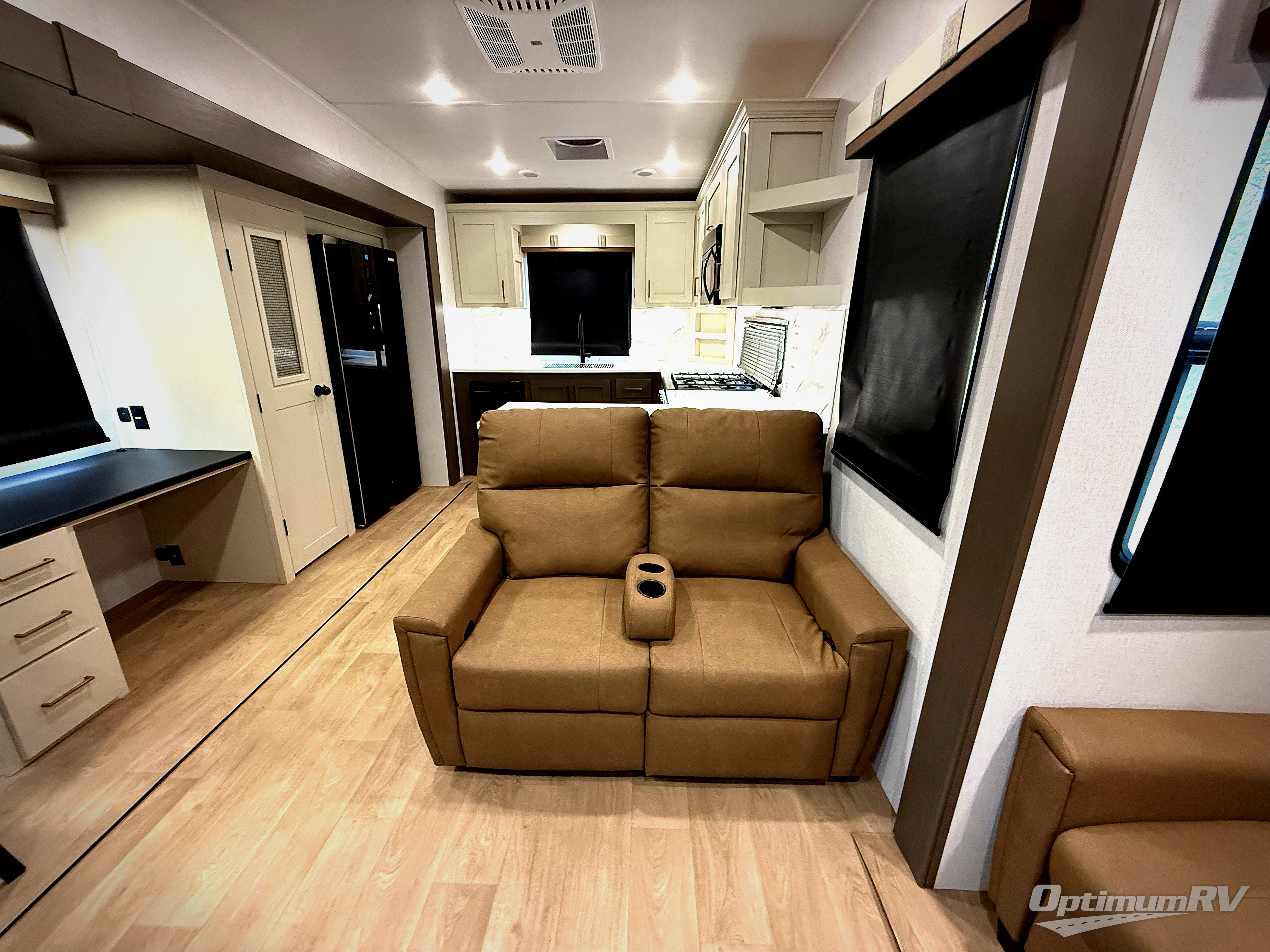 It won't be hard to find comfort and convenience in this spacious fifth wheel! The rear kitchen features ample counter space, a four burner 24" range, plus a 16 cu. ft. 12V refrigerator and pantry for food storage. There is also a desk here if you plan to work while you're away from home, and the coffee station by the pantry will be the perfect place to set up your own Keurig machine. The middle living area includes theater seating across from the 65" TV and fireplace, and there is a hide-a-bed sofa for guests to sleep on. A convenient utility room includes a sink with counter space plus stackable washer/dryer prep to make this an optional laundry room! A full bath will let you freshen up each day, and the front private bedroom will feel just like home with its king bed slide out, dresser and full-width wardrobe!