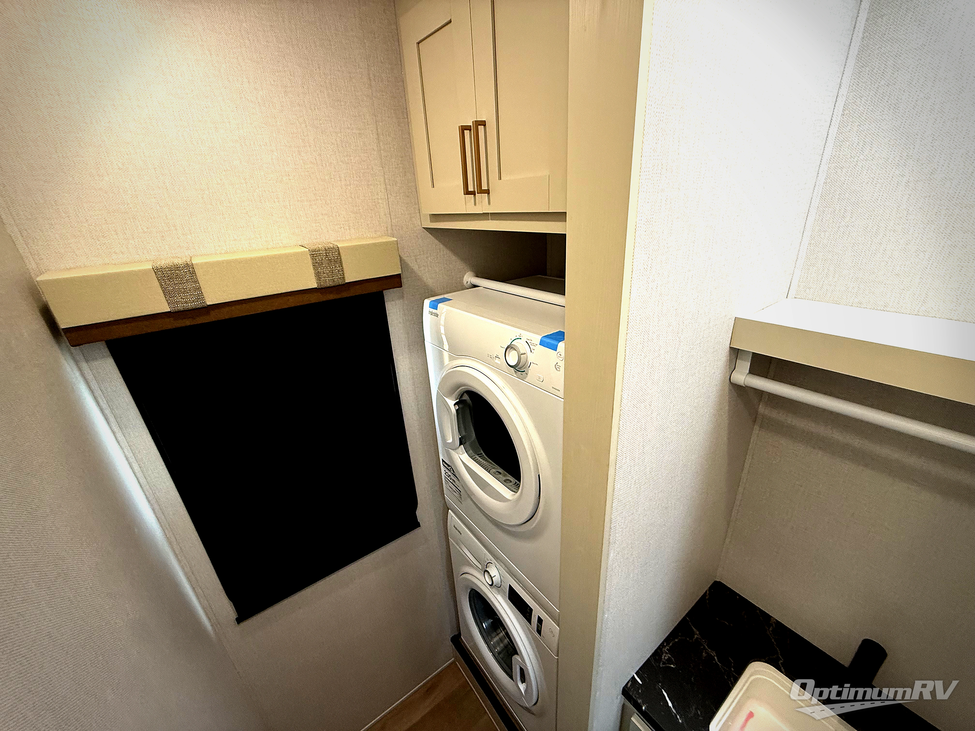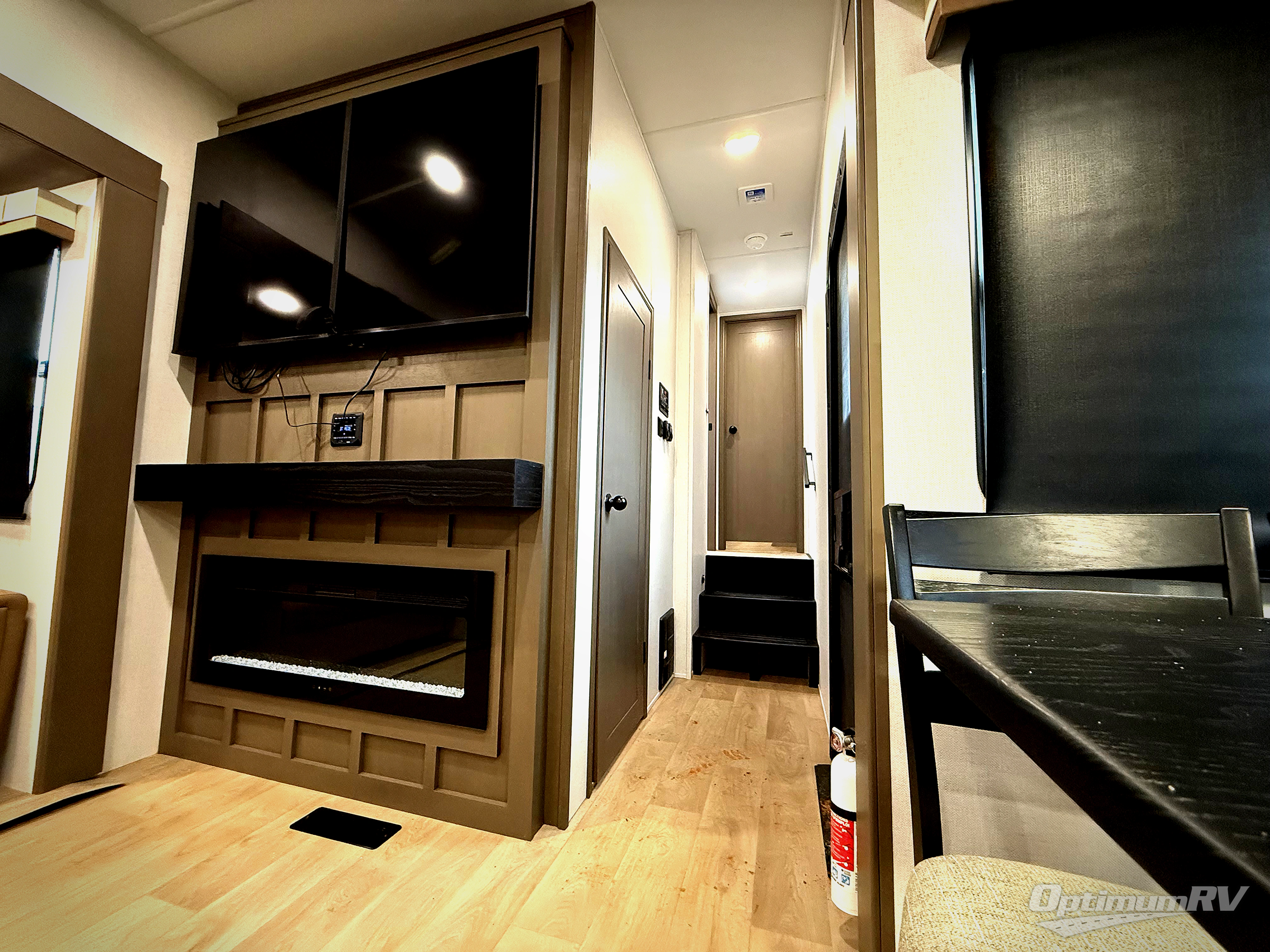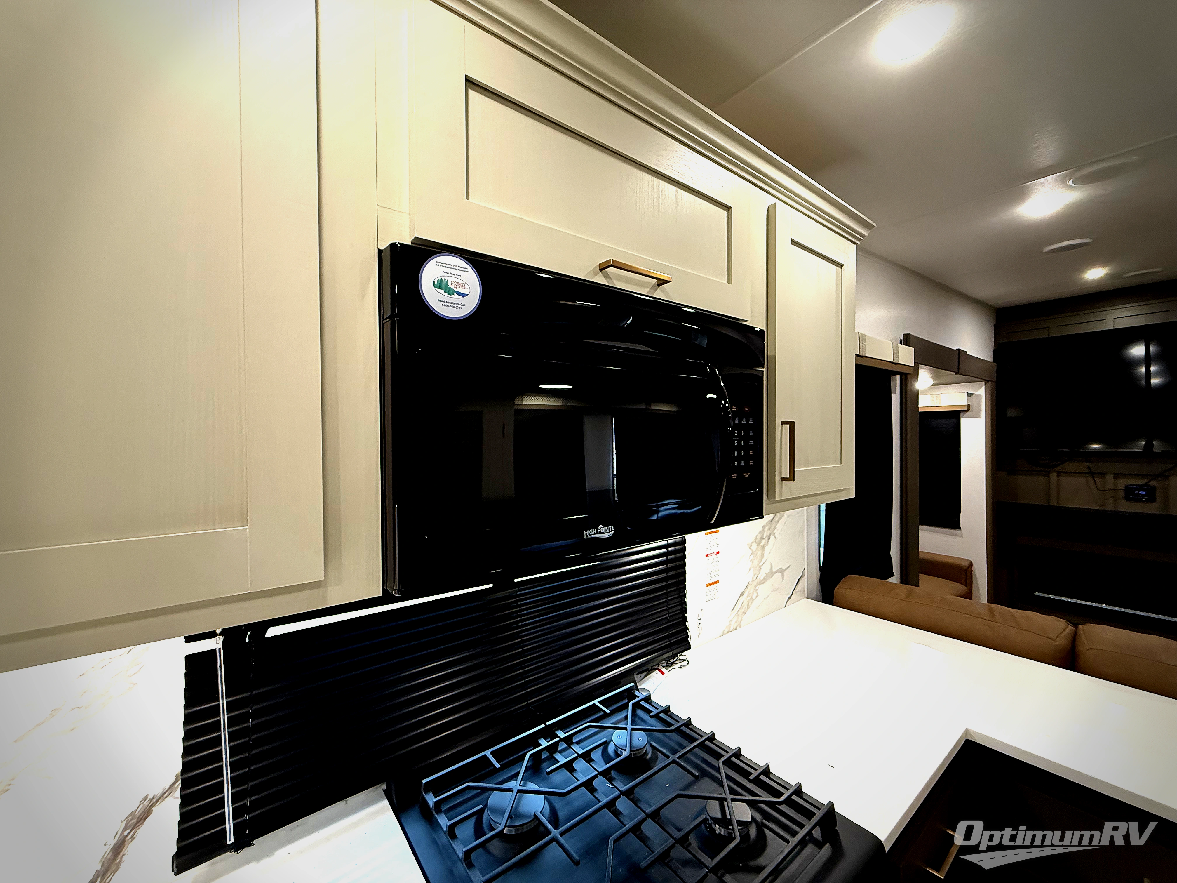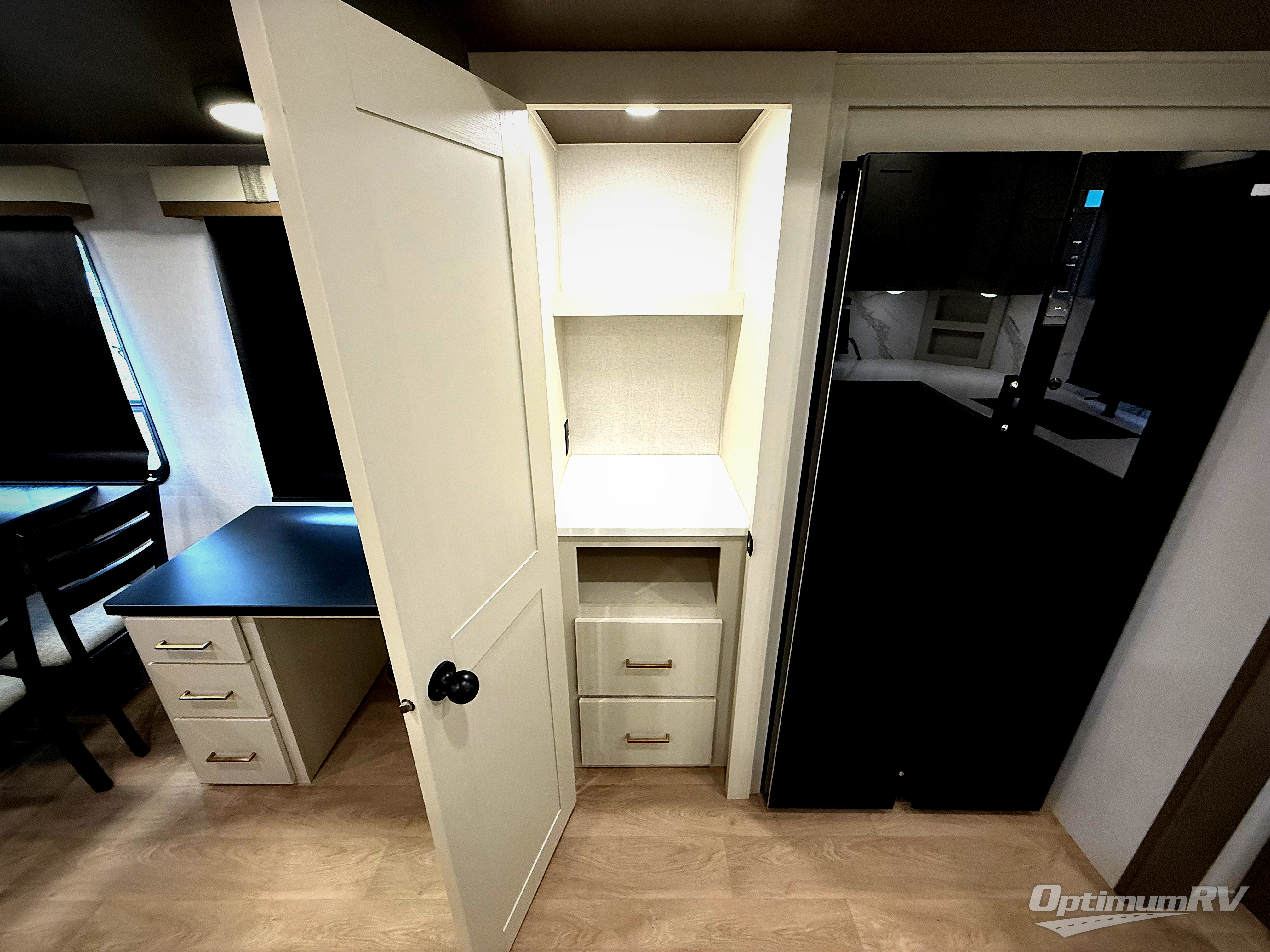 It won't be hard to find comfort and convenience in this spacious fifth wheel! The rear kitchen features ample counter space, a four burner 24" range, plus a 16 cu. ft. 12V refrigerator and pantry for food storage. There is also a desk here if you plan to work while you're away from home, and the coffee station by the pantry will be the perfect place to set up your own Keurig machine. The middle living area includes theater seating across from the 65" TV and fireplace, and there is a hide-a-bed sofa for guests to sleep on. A convenient utility room includes a sink with counter space plus stackable washer/dryer prep to make this an optional laundry room! A full bath will let you freshen up each day, and the front private bedroom will feel just like home with its king bed slide out, dresser and full-width wardrobe!
