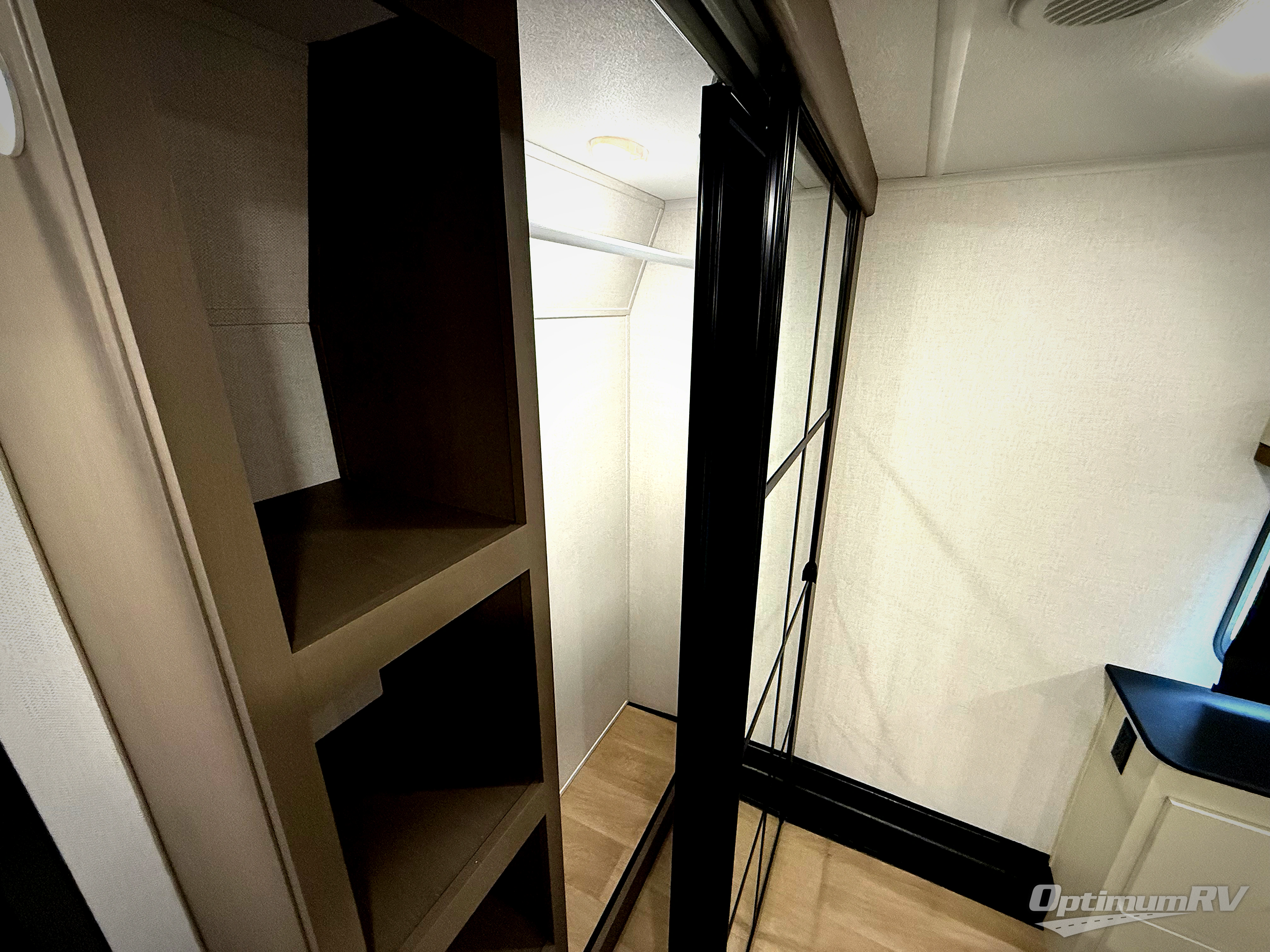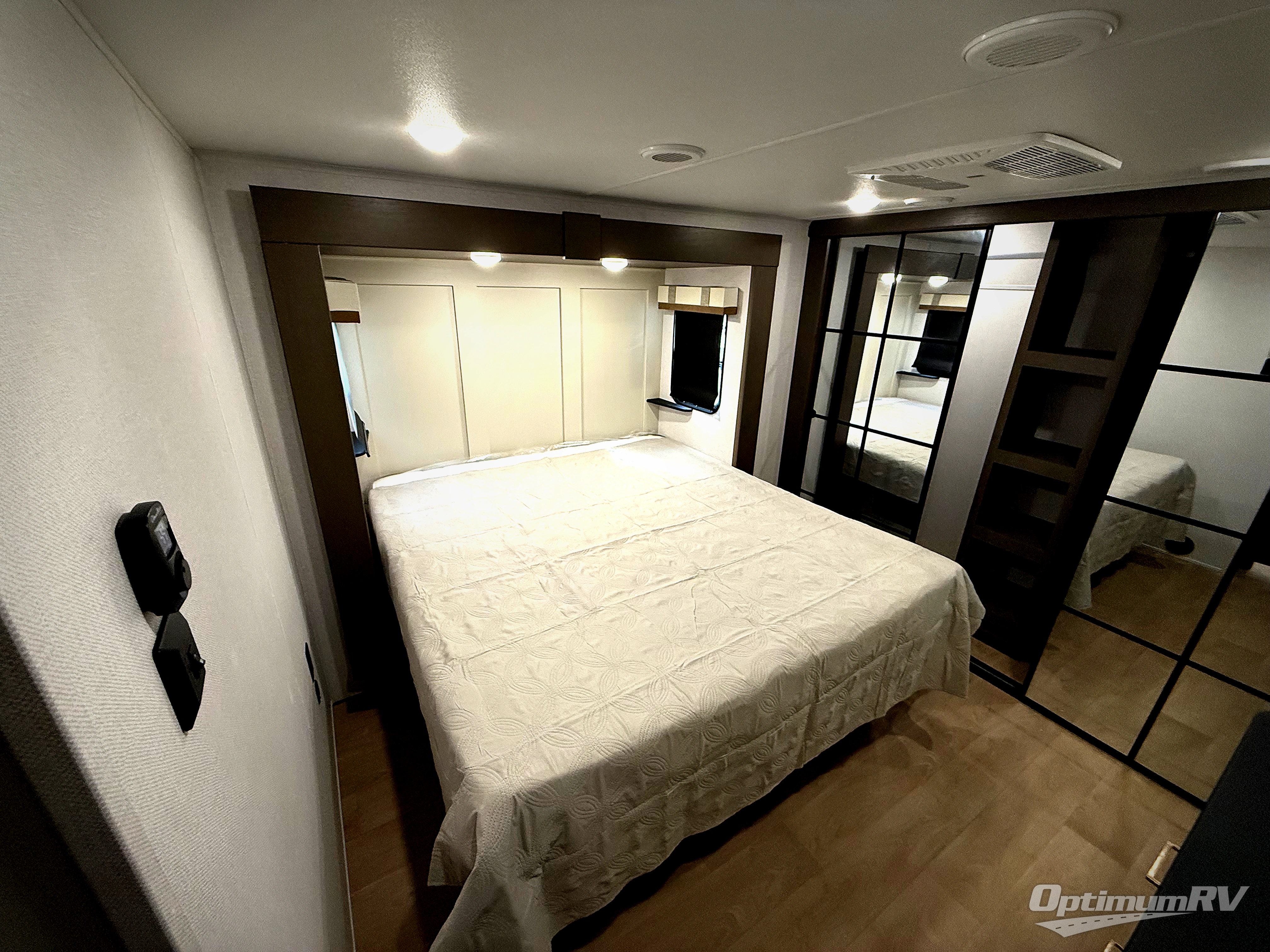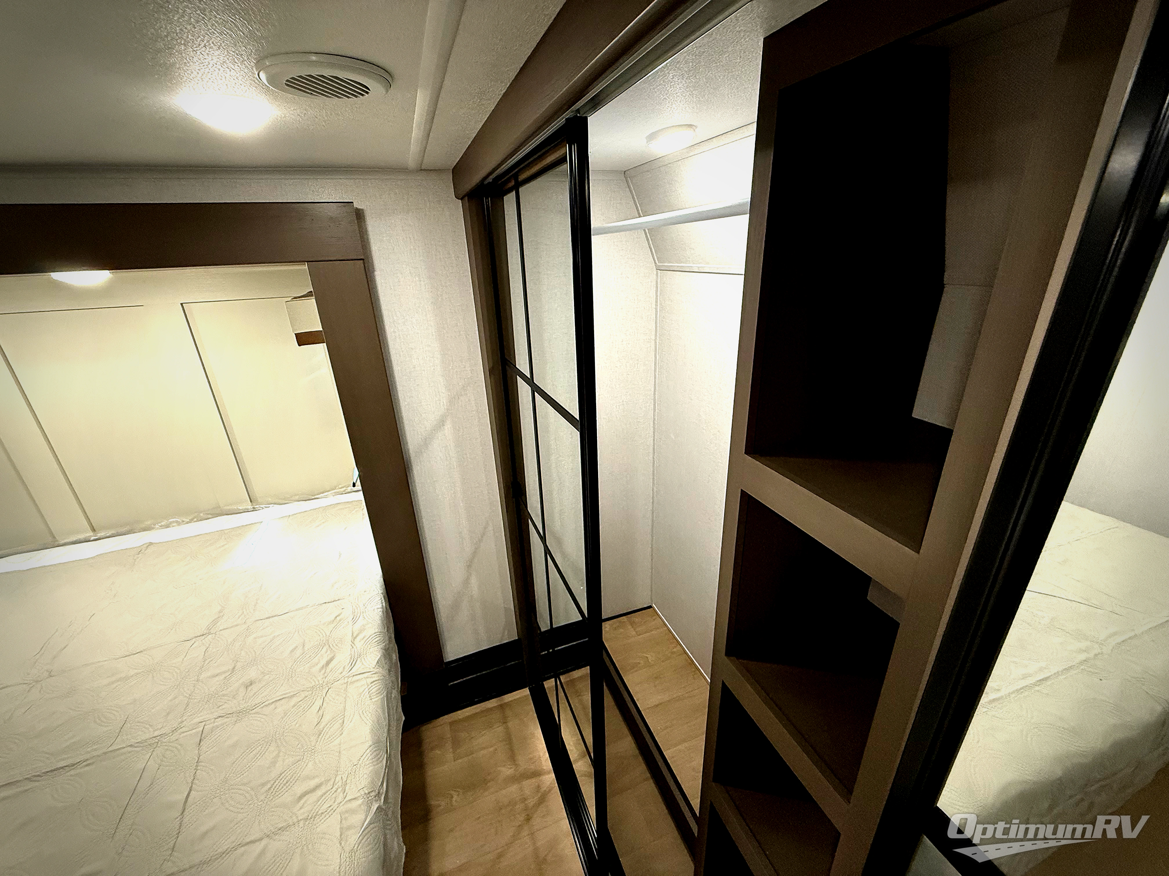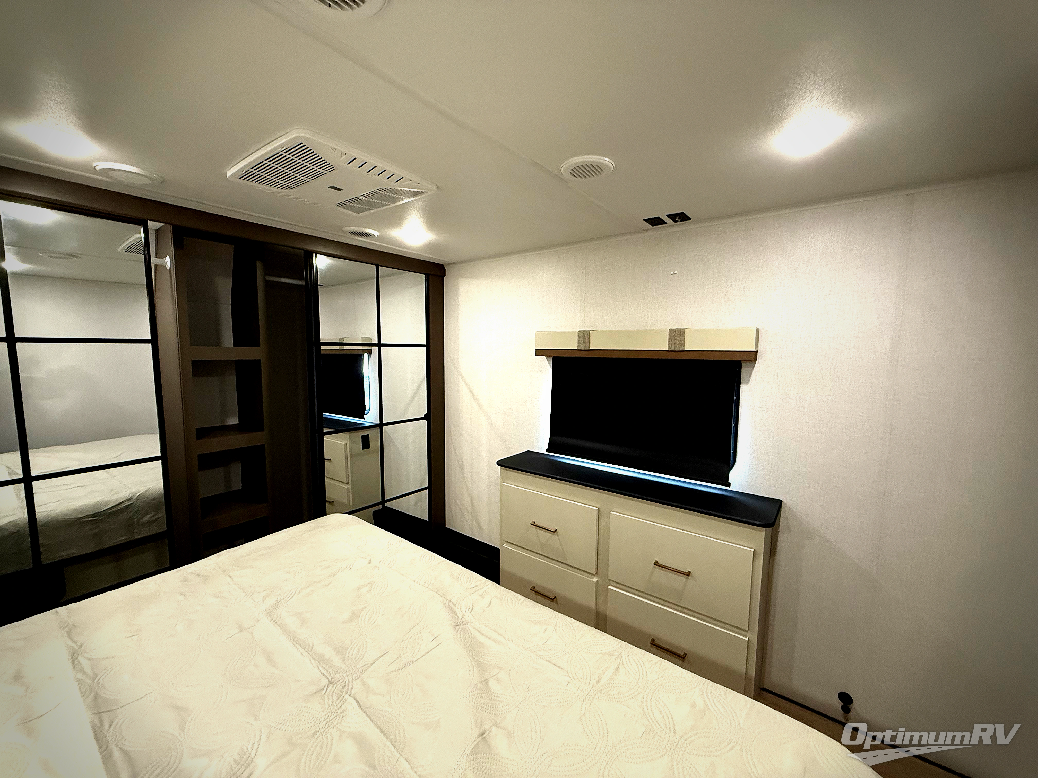 It won't be hard to find comfort and convenience in this spacious fifth wheel! The rear kitchen features ample counter space, a four burner 24" range, plus a 16 cu. ft. 12V refrigerator and pantry for food storage. There is also a desk here if you plan to work while you're away from home, and the coffee station by the pantry will be the perfect place to set up your own Keurig machine. The middle living area includes theater seating across from the 65" TV and fireplace, and there is a hide-a-bed sofa for guests to sleep on. A convenient utility room includes a sink with counter space plus stackable washer/dryer prep to make this an optional laundry room! A full bath will let you freshen up each day, and the front private bedroom will feel just like home with its king bed slide out, dresser and full-width wardrobe!