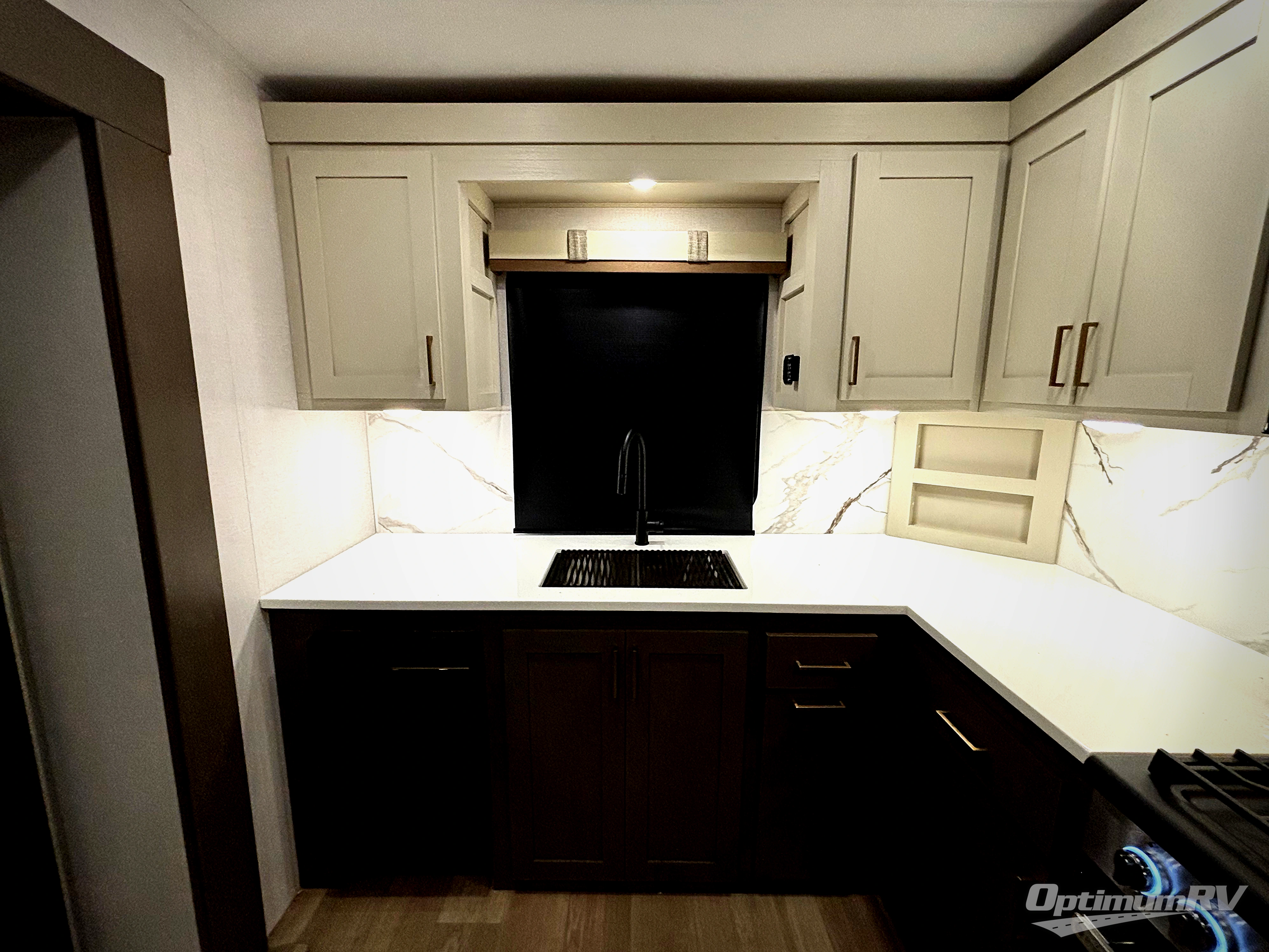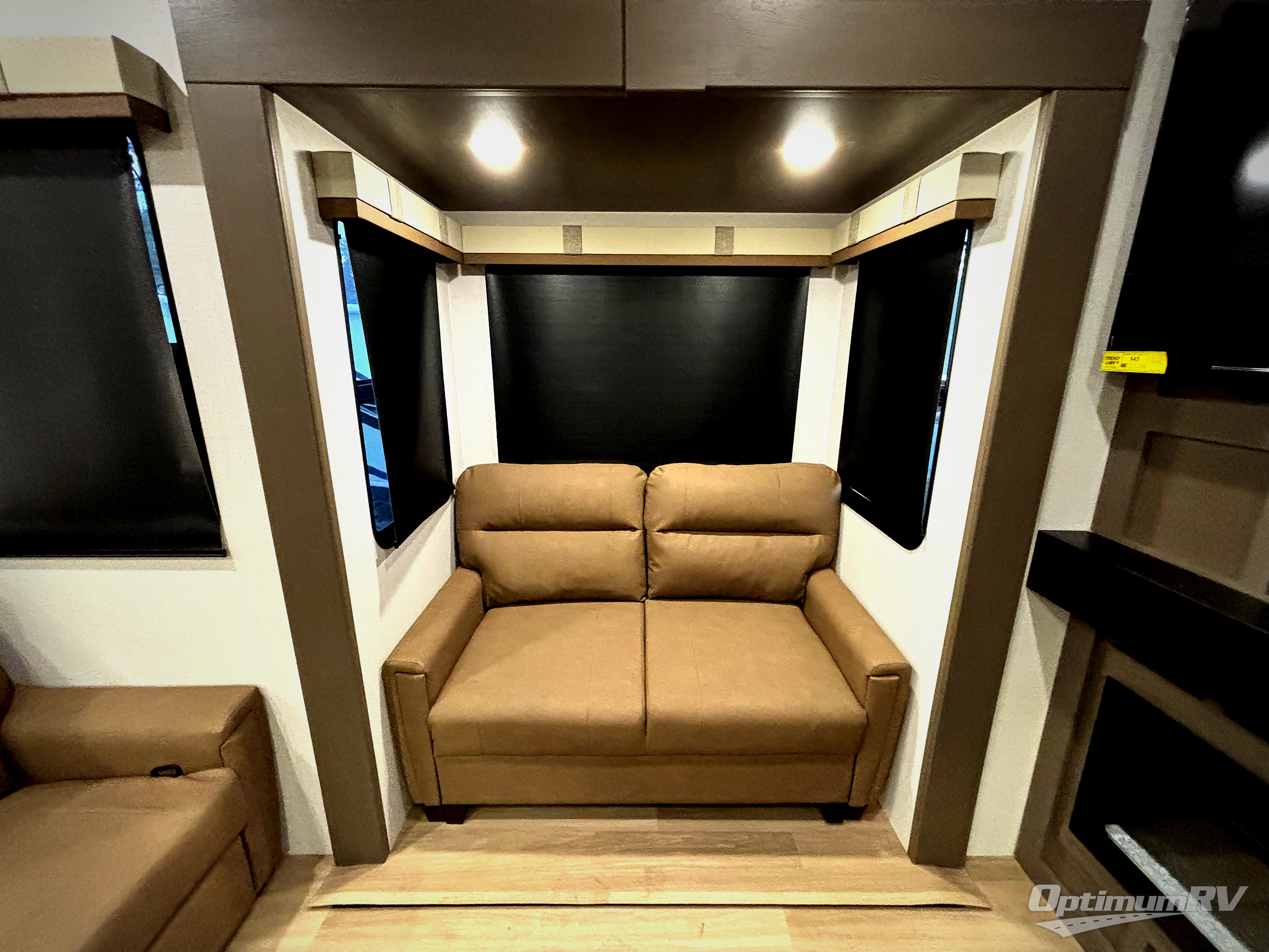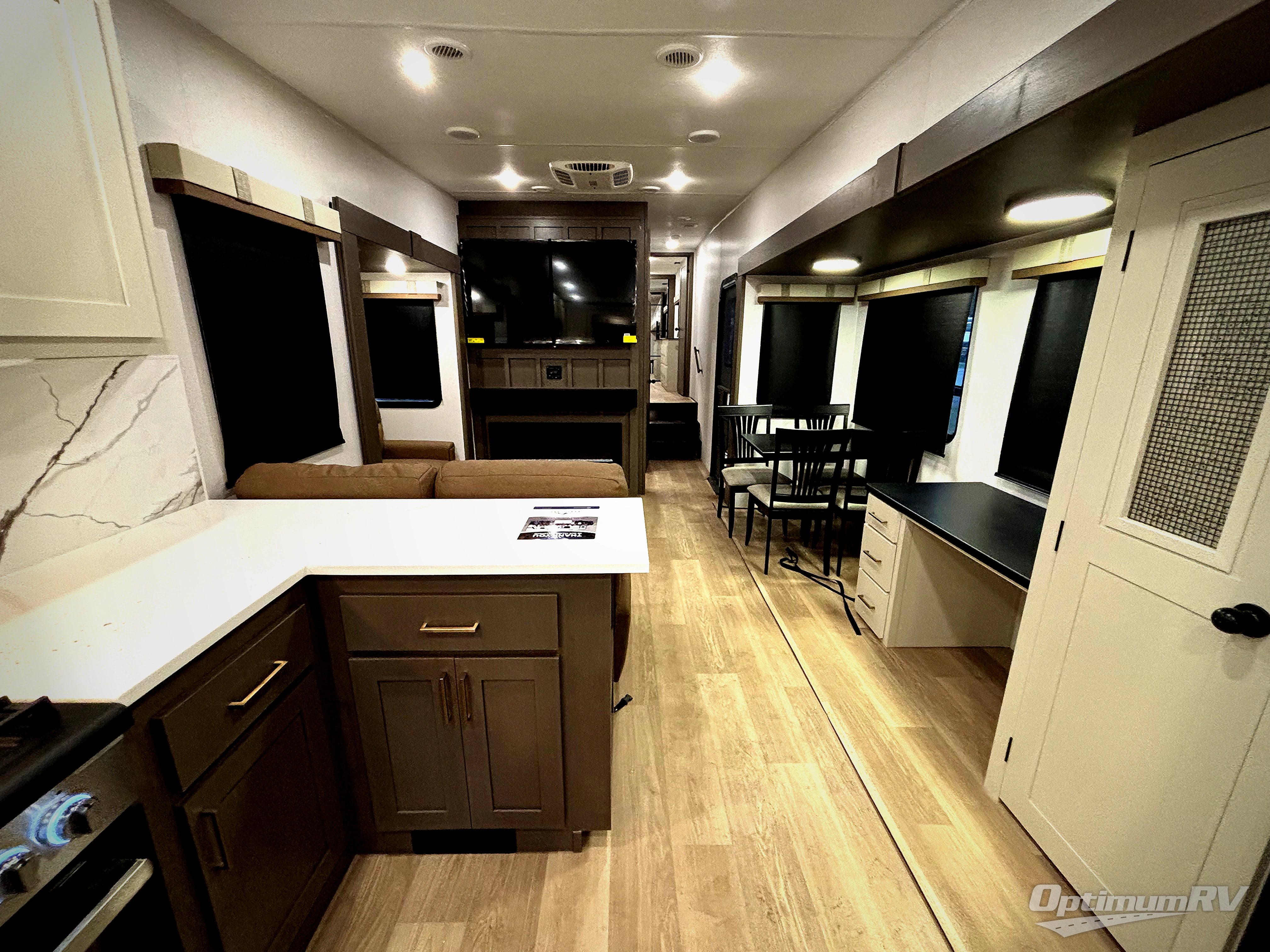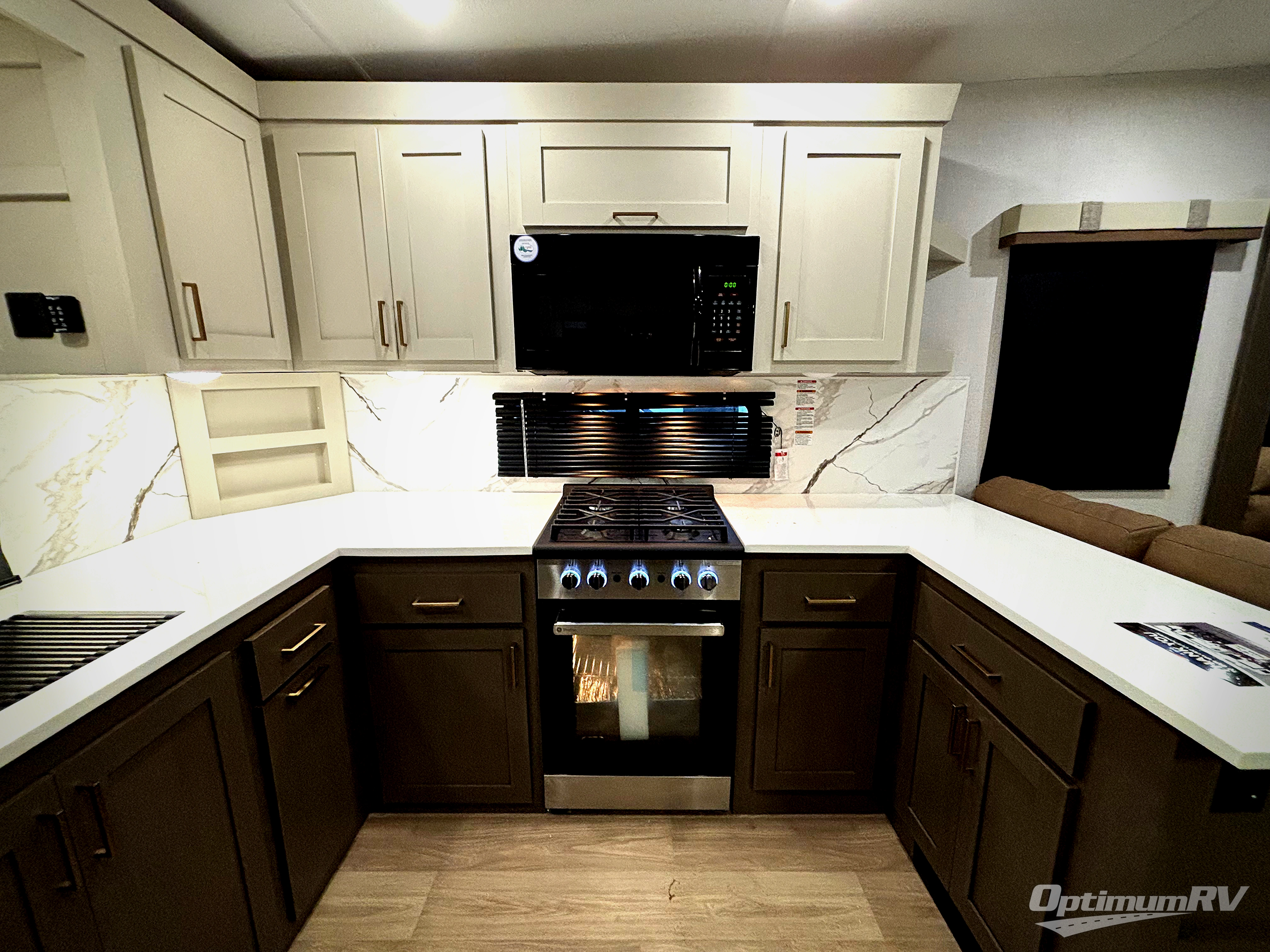 It won't be hard to find comfort and convenience in this spacious fifth wheel! The rear kitchen features ample counter space, a four burner 24" range, plus a 16 cu. ft. 12V refrigerator and pantry for food storage. There is also a desk here if you plan to work while you're away from home, and the coffee station by the pantry will be the perfect place to set up your own Keurig machine. The middle living area includes theater seating across from the 65" TV and fireplace, and there is a hide-a-bed sofa for guests to sleep on. A convenient utility room includes a sink with counter space plus stackable washer/dryer prep to make this an optional laundry room! A full bath will let you freshen up each day, and the front private bedroom will feel just like home with its king bed slide out, dresser and full-width wardrobe!