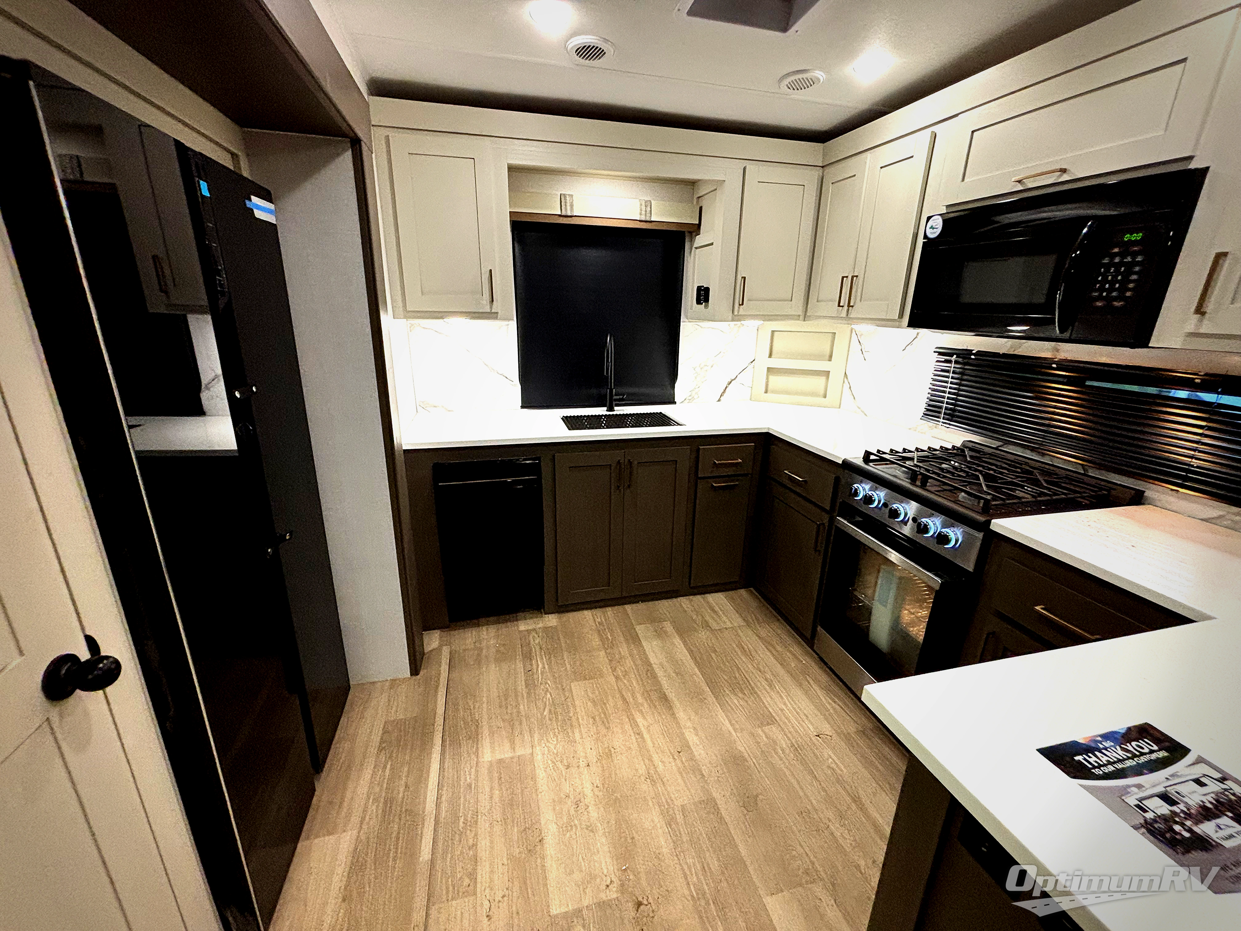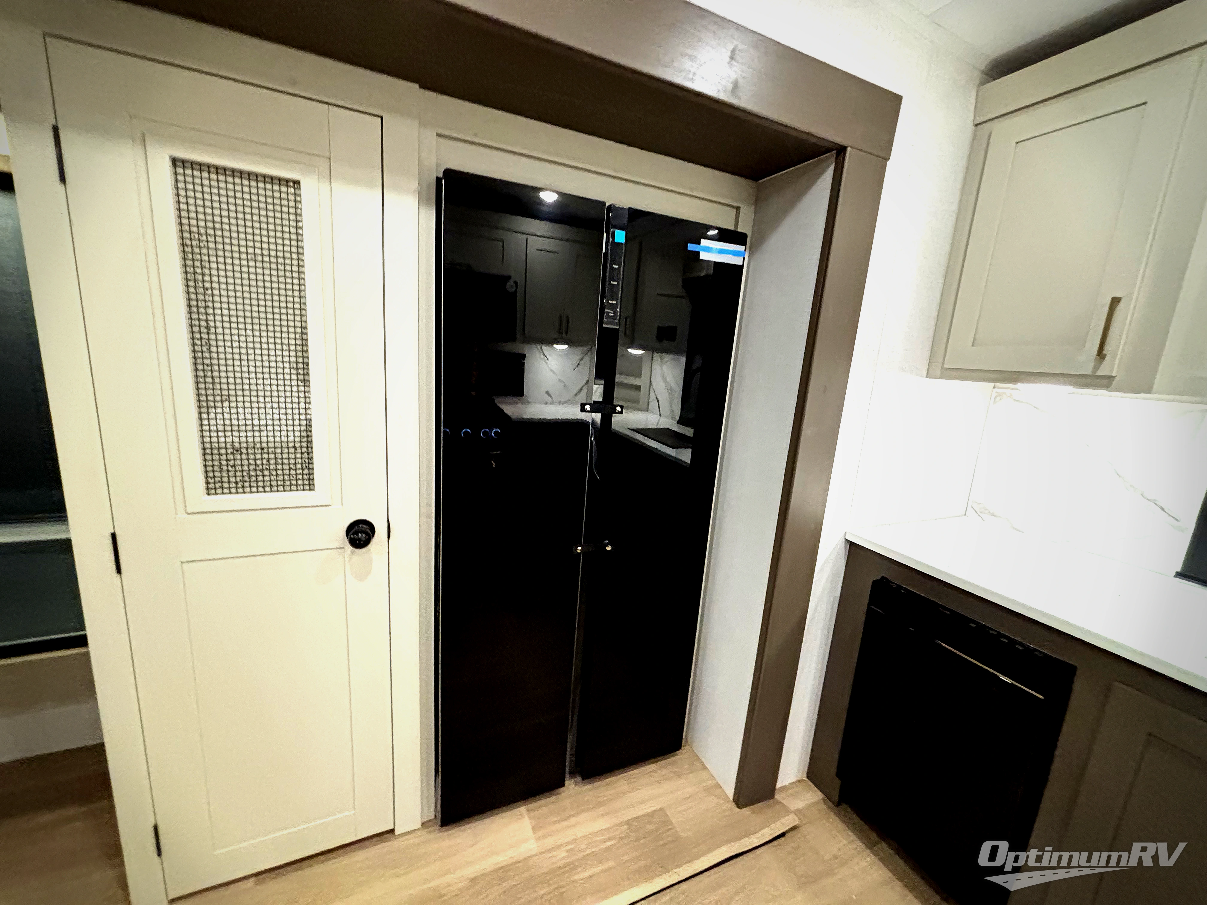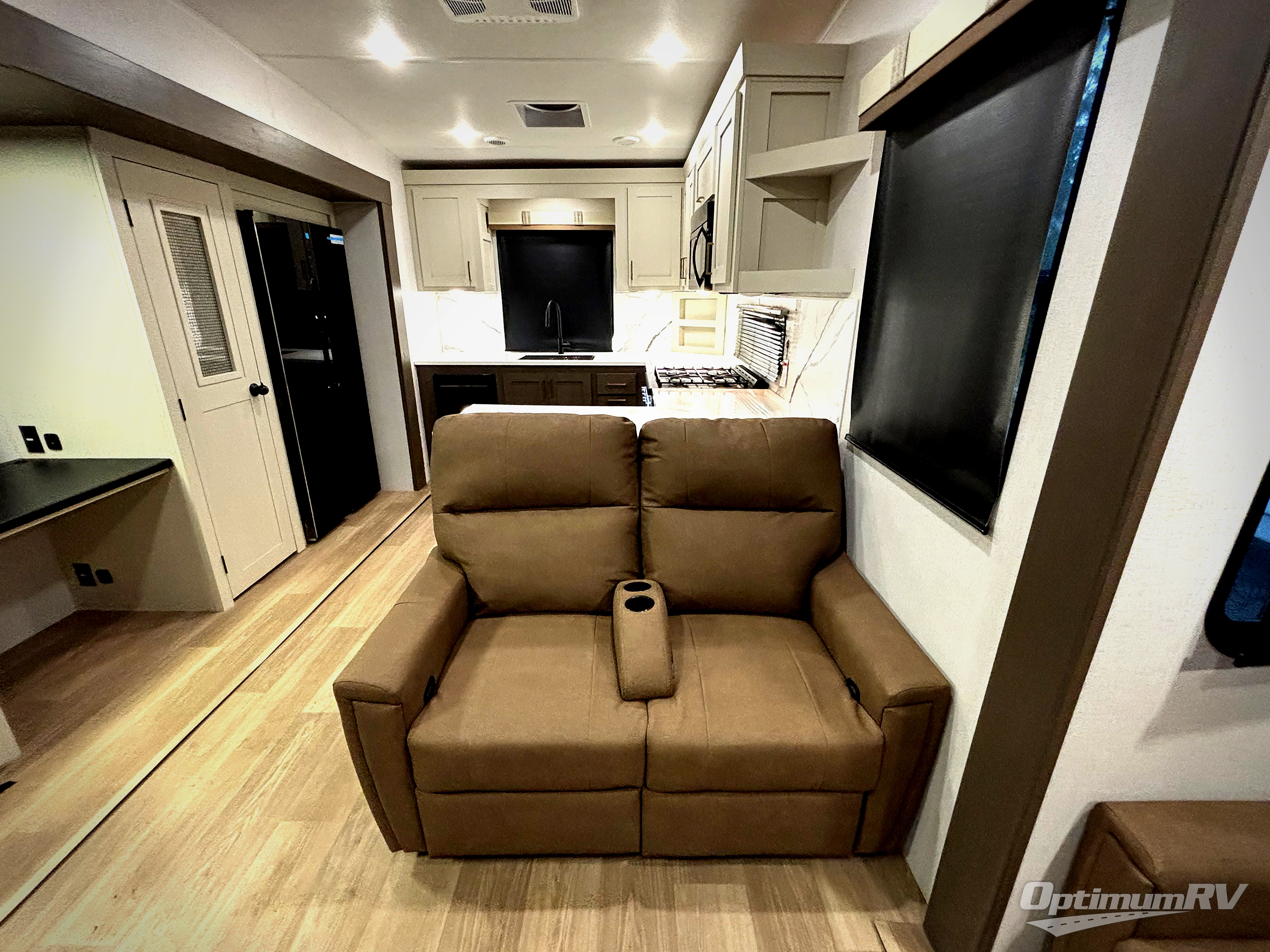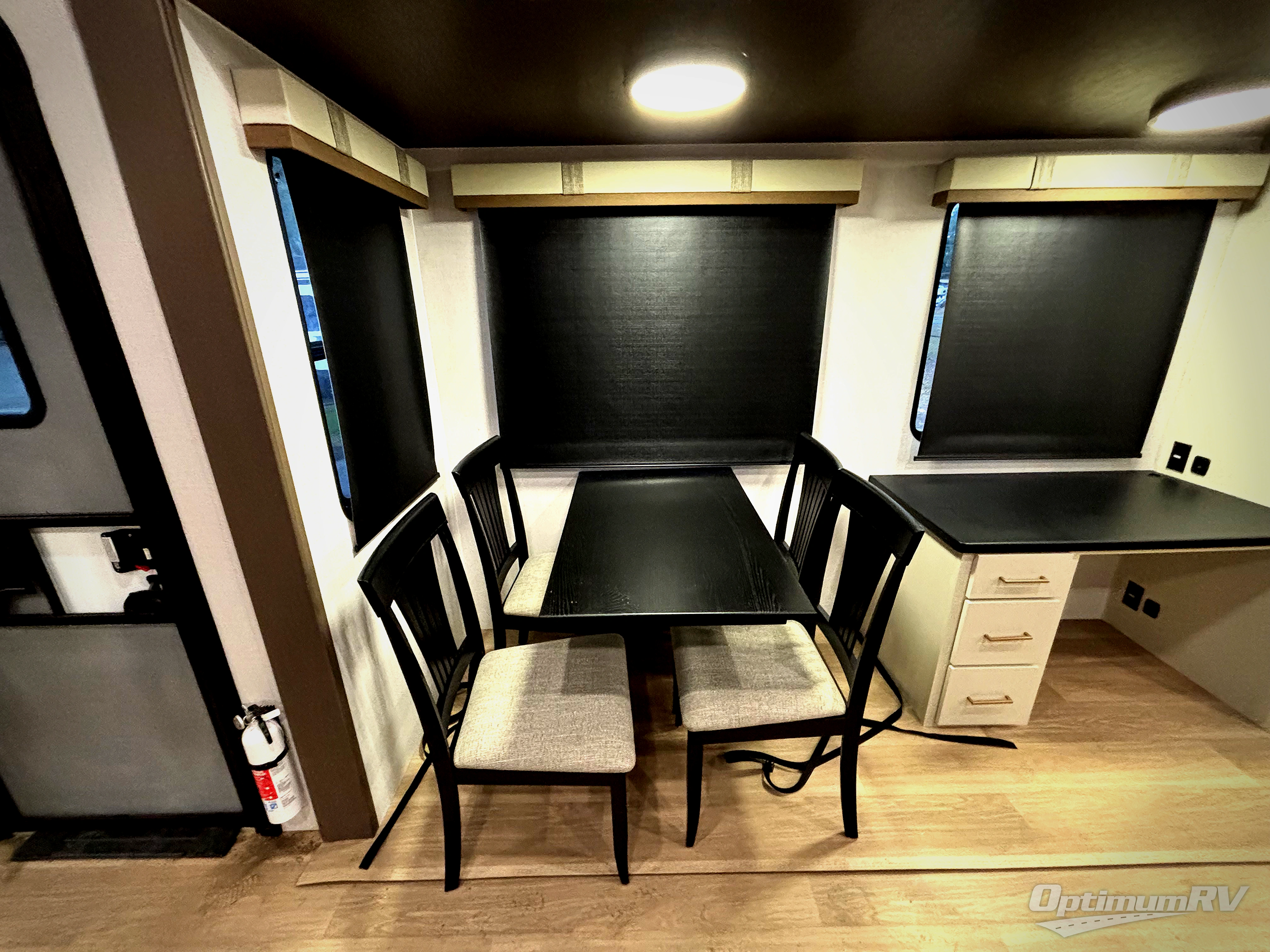 It won't be hard to find comfort and convenience in this spacious fifth wheel! The rear kitchen features ample counter space, a four burner 24" range, plus a 16 cu. ft. 12V refrigerator and pantry for food storage. There is also a desk here if you plan to work while you're away from home, and the coffee station by the pantry will be the perfect place to set up your own Keurig machine. The middle living area includes theater seating across from the 65" TV and fireplace, and there is a hide-a-bed sofa for guests to sleep on. A convenient utility room includes a sink with counter space plus stackable washer/dryer prep to make this an optional laundry room! A full bath will let you freshen up each day, and the front private bedroom will feel just like home with its king bed slide out, dresser and full-width wardrobe!