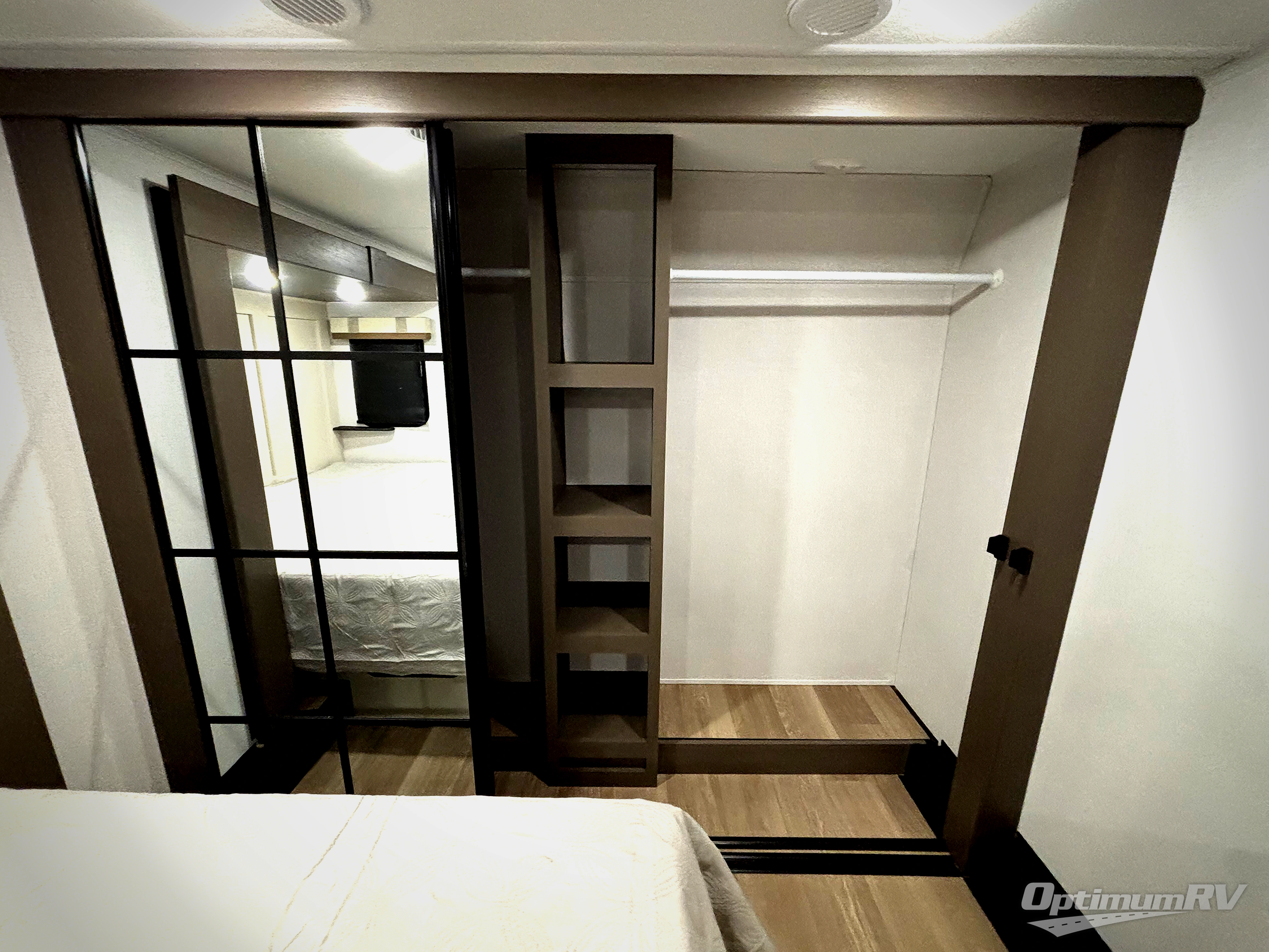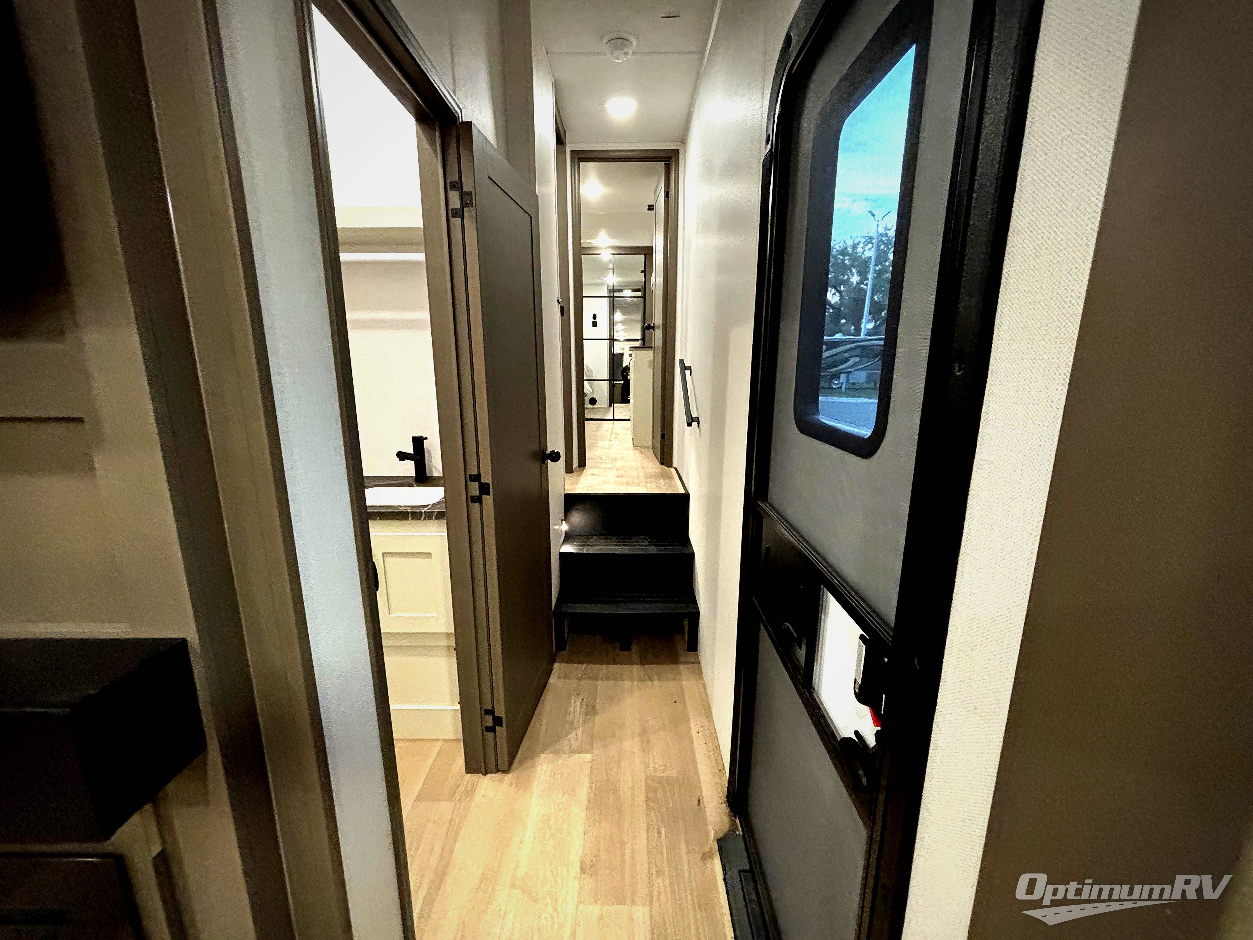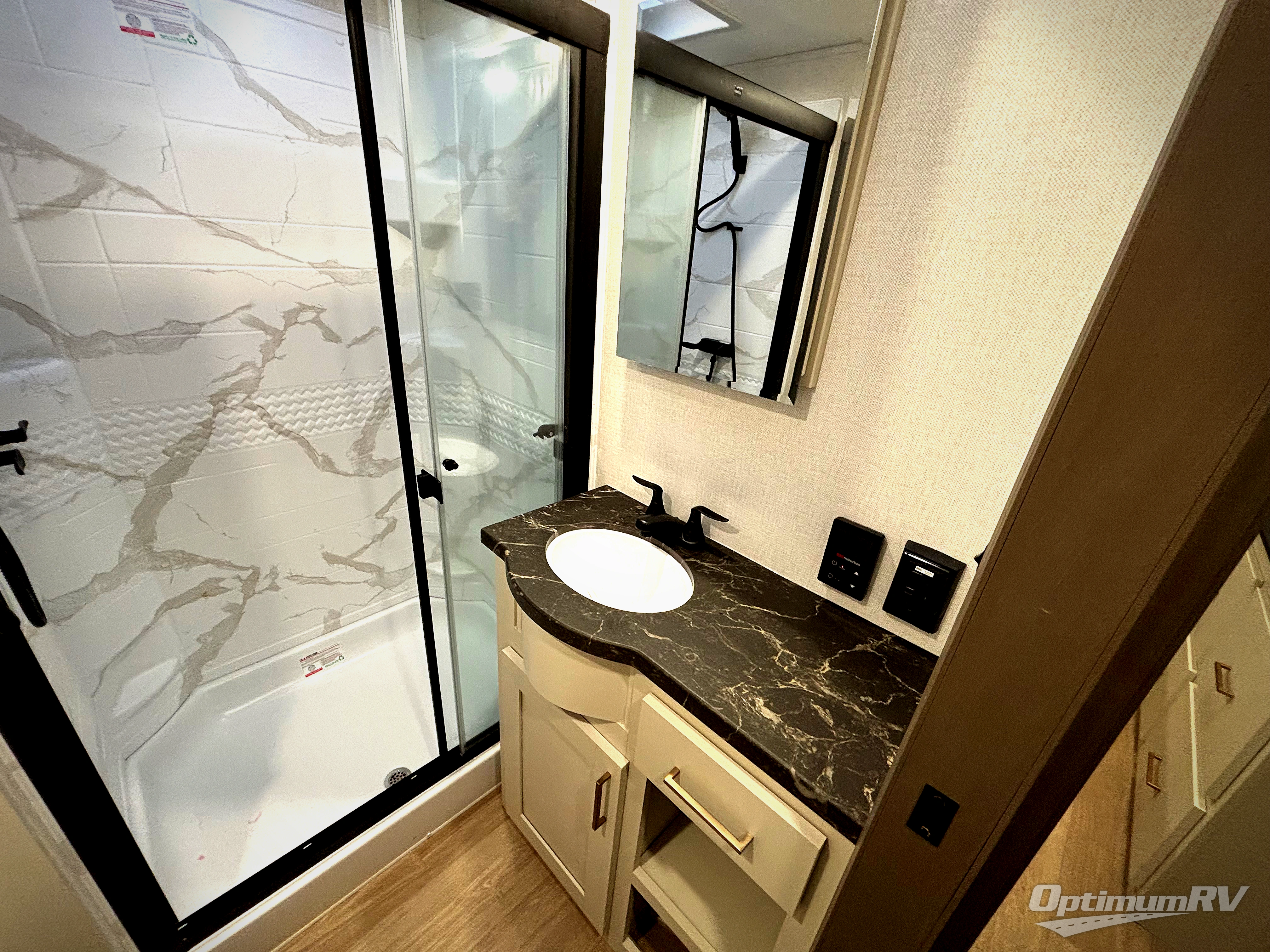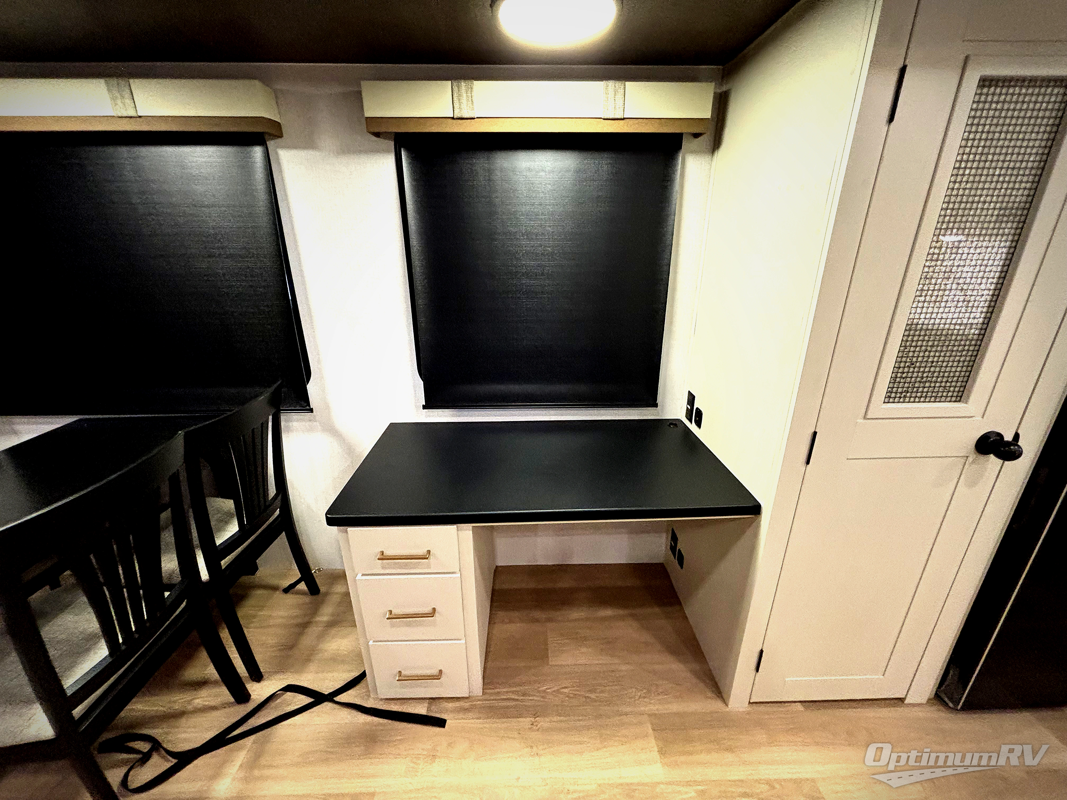 It won't be hard to find comfort and convenience in this spacious fifth wheel! The rear kitchen features ample counter space, a four burner 24" range, plus a 16 cu. ft. 12V refrigerator and pantry for food storage. There is also a desk here if you plan to work while you're away from home, and the coffee station by the pantry will be the perfect place to set up your own Keurig machine. The middle living area includes theater seating across from the 65" TV and fireplace, and there is a hide-a-bed sofa for guests to sleep on. A convenient utility room includes a sink with counter space plus stackable washer/dryer prep to make this an optional laundry room! A full bath will let you freshen up each day, and the front private bedroom will feel just like home with its king bed slide out, dresser and full-width wardrobe!