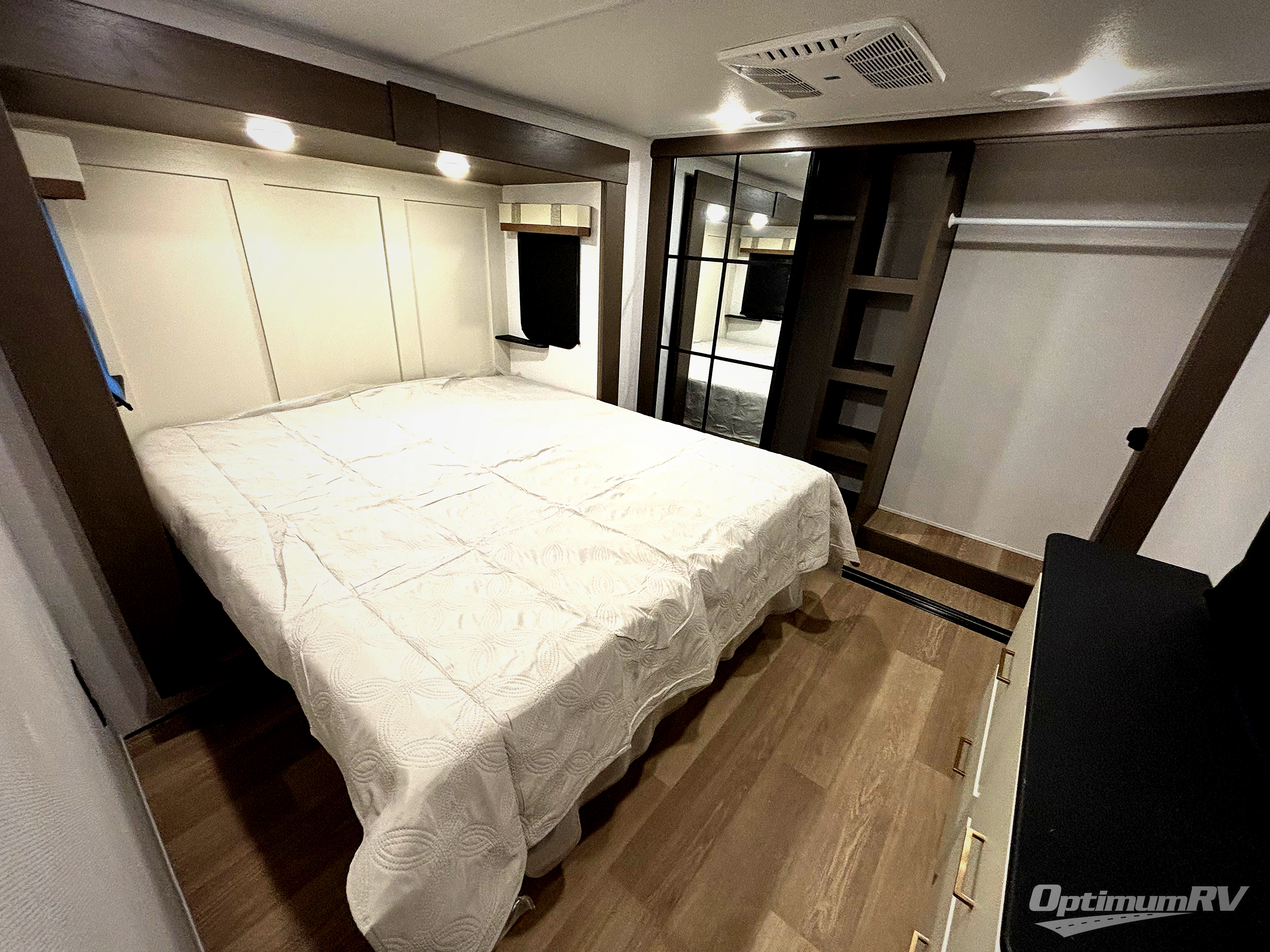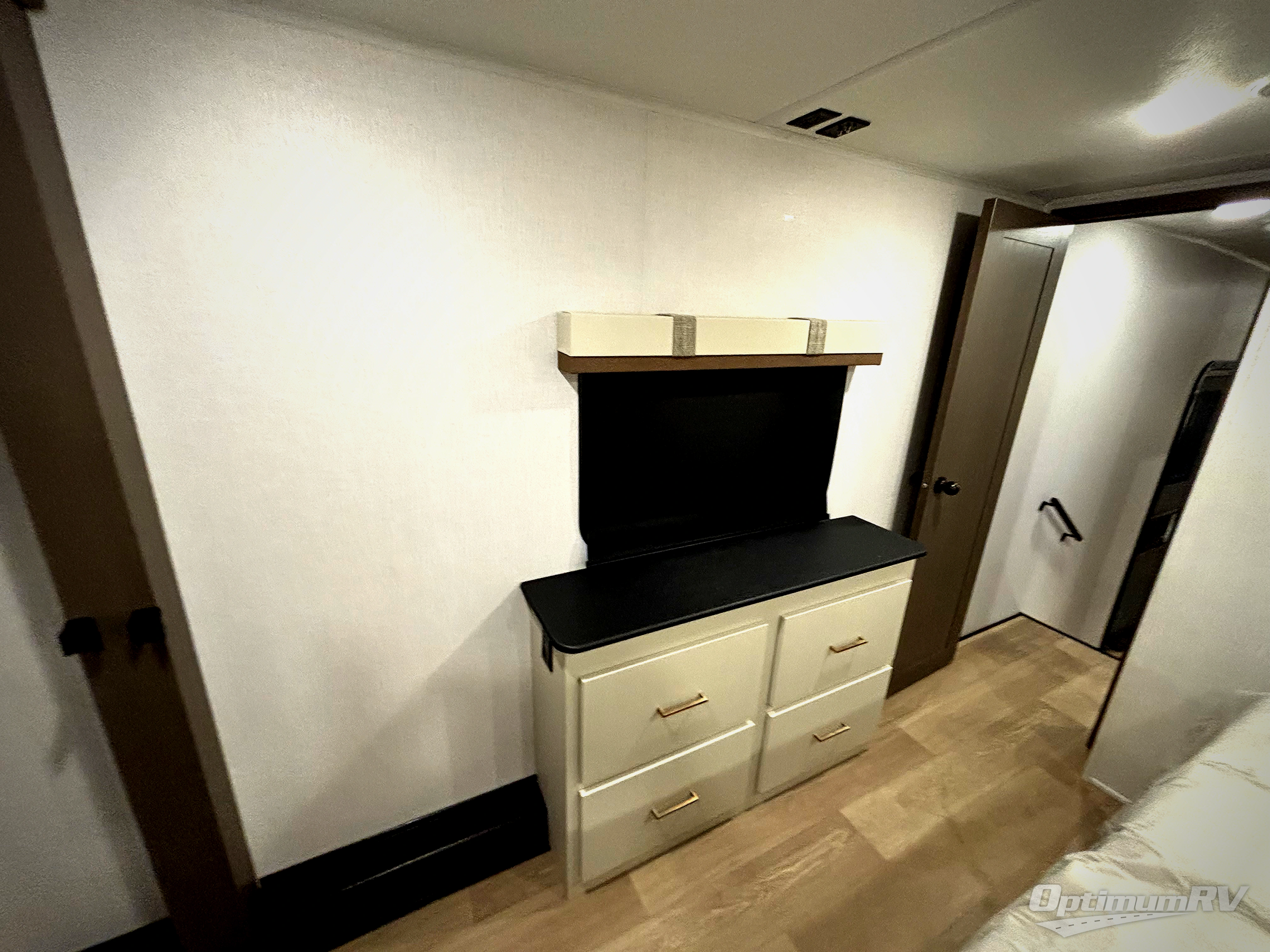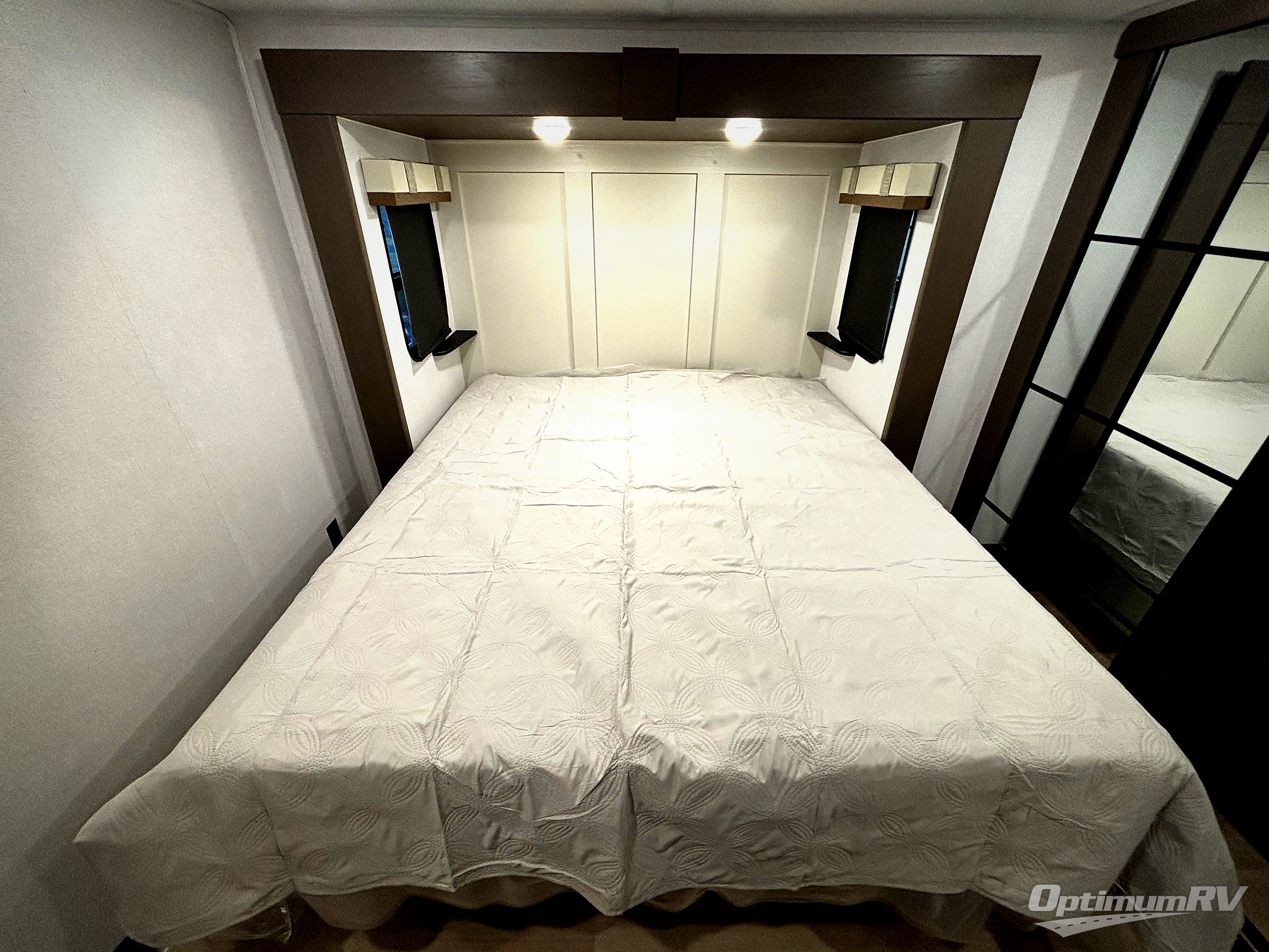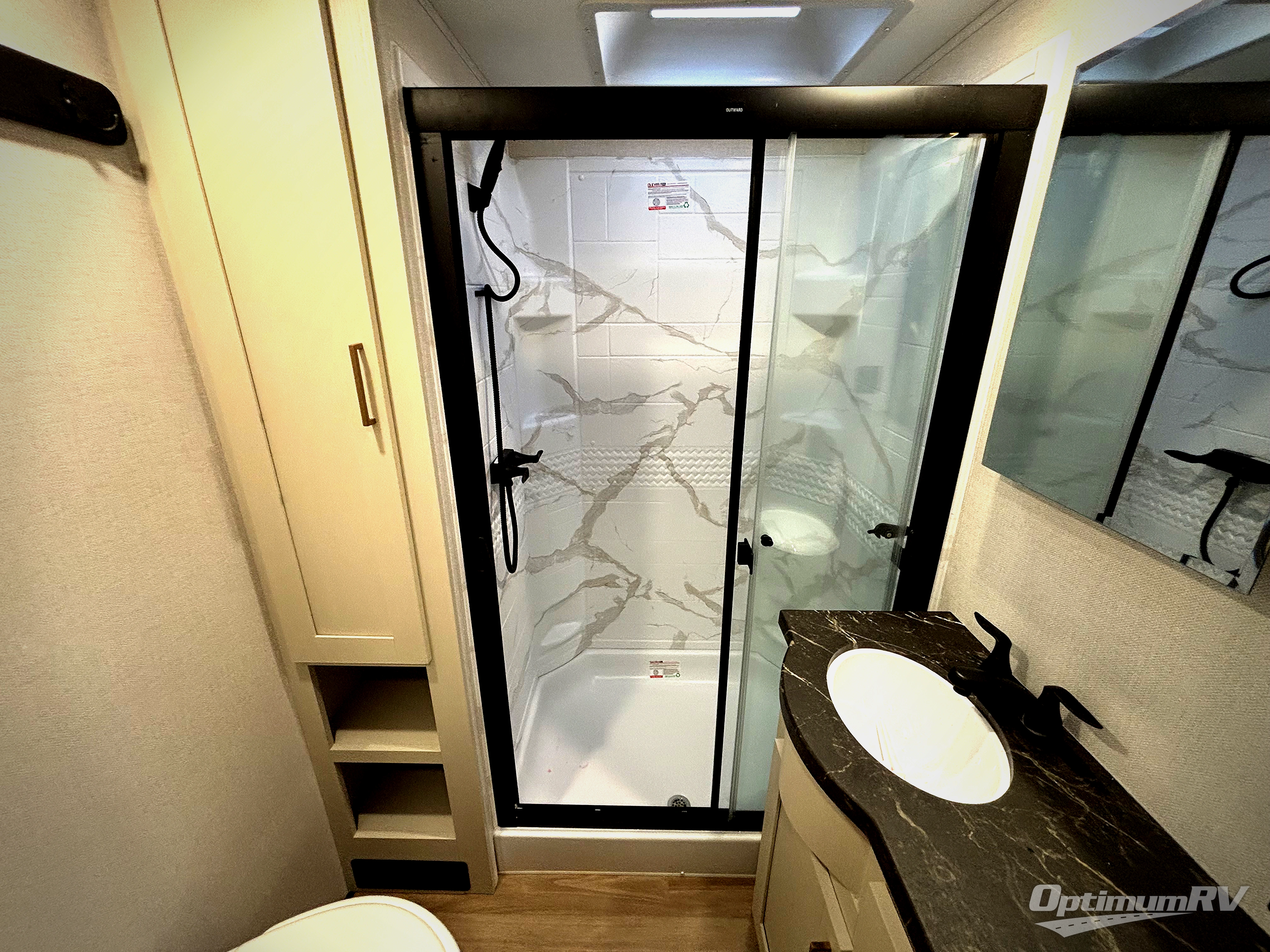 It won't be hard to find comfort and convenience in this spacious fifth wheel! The rear kitchen features ample counter space, a four burner 24" range, plus a 16 cu. ft. 12V refrigerator and pantry for food storage. There is also a desk here if you plan to work while you're away from home, and the coffee station by the pantry will be the perfect place to set up your own Keurig machine. The middle living area includes theater seating across from the 65" TV and fireplace, and there is a hide-a-bed sofa for guests to sleep on. A convenient utility room includes a sink with counter space plus stackable washer/dryer prep to make this an optional laundry room! A full bath will let you freshen up each day, and the front private bedroom will feel just like home with its king bed slide out, dresser and full-width wardrobe!