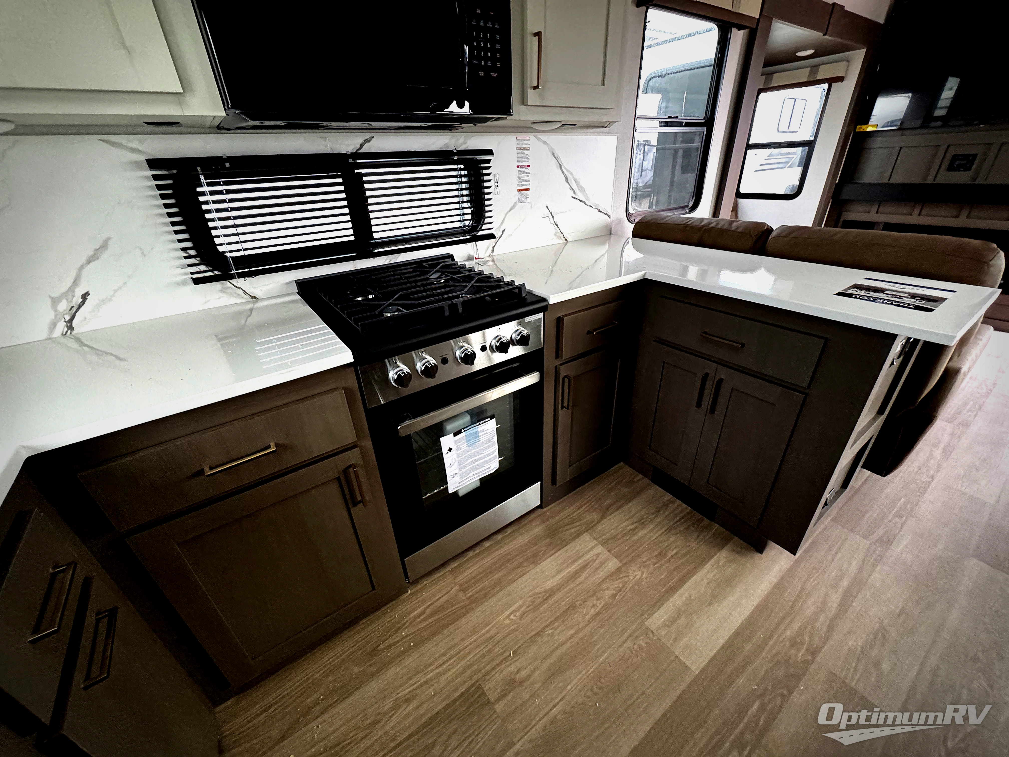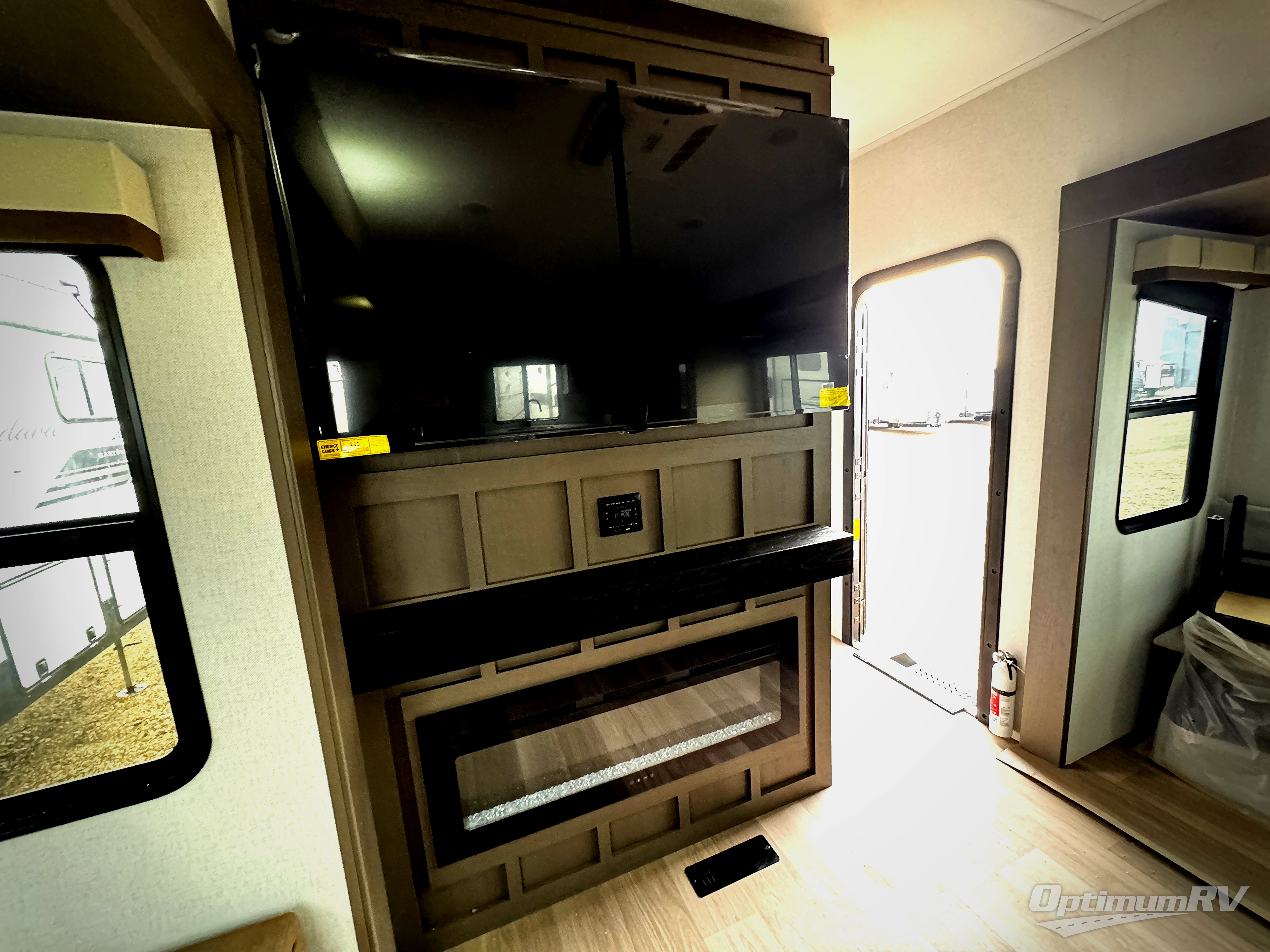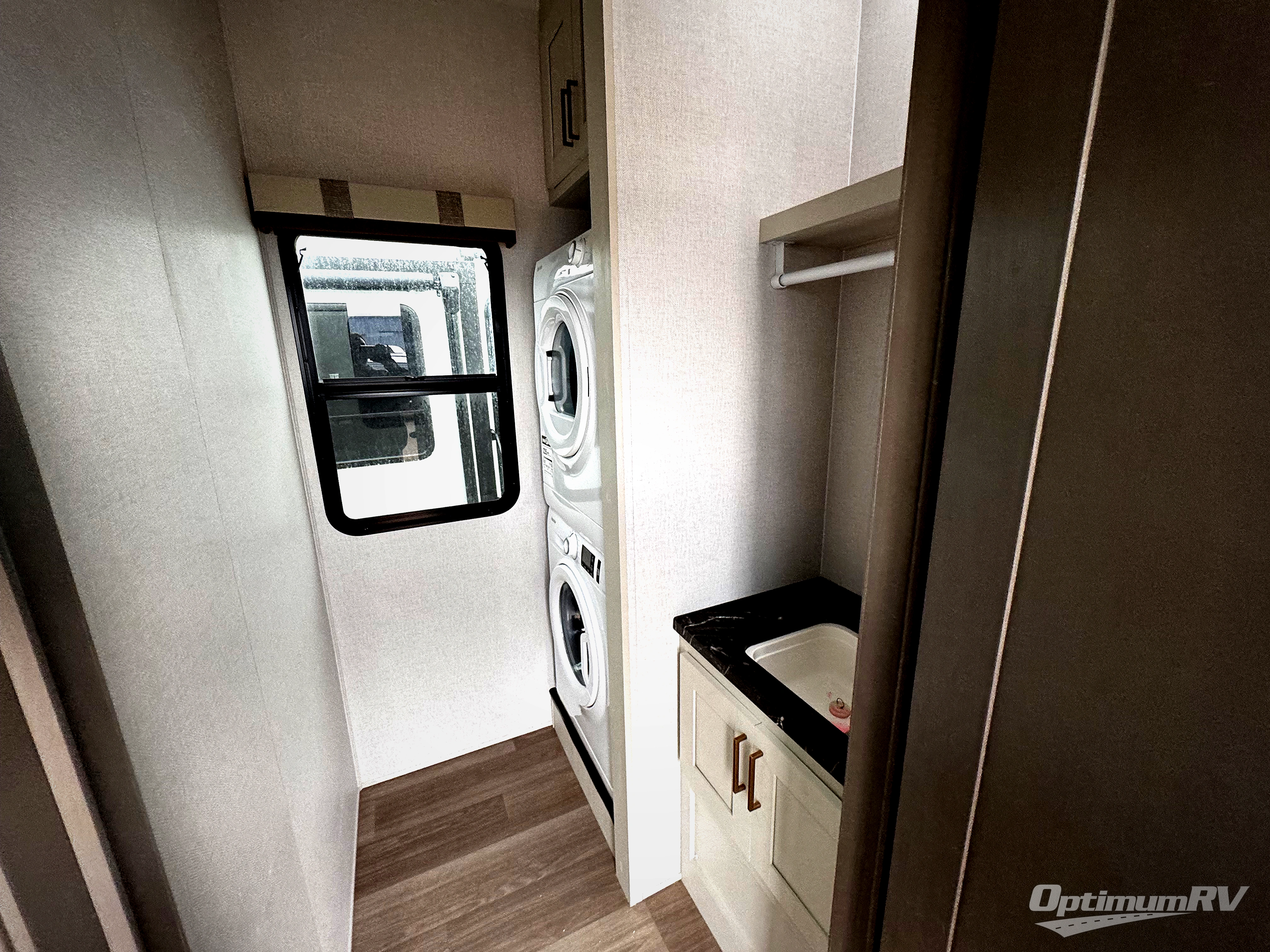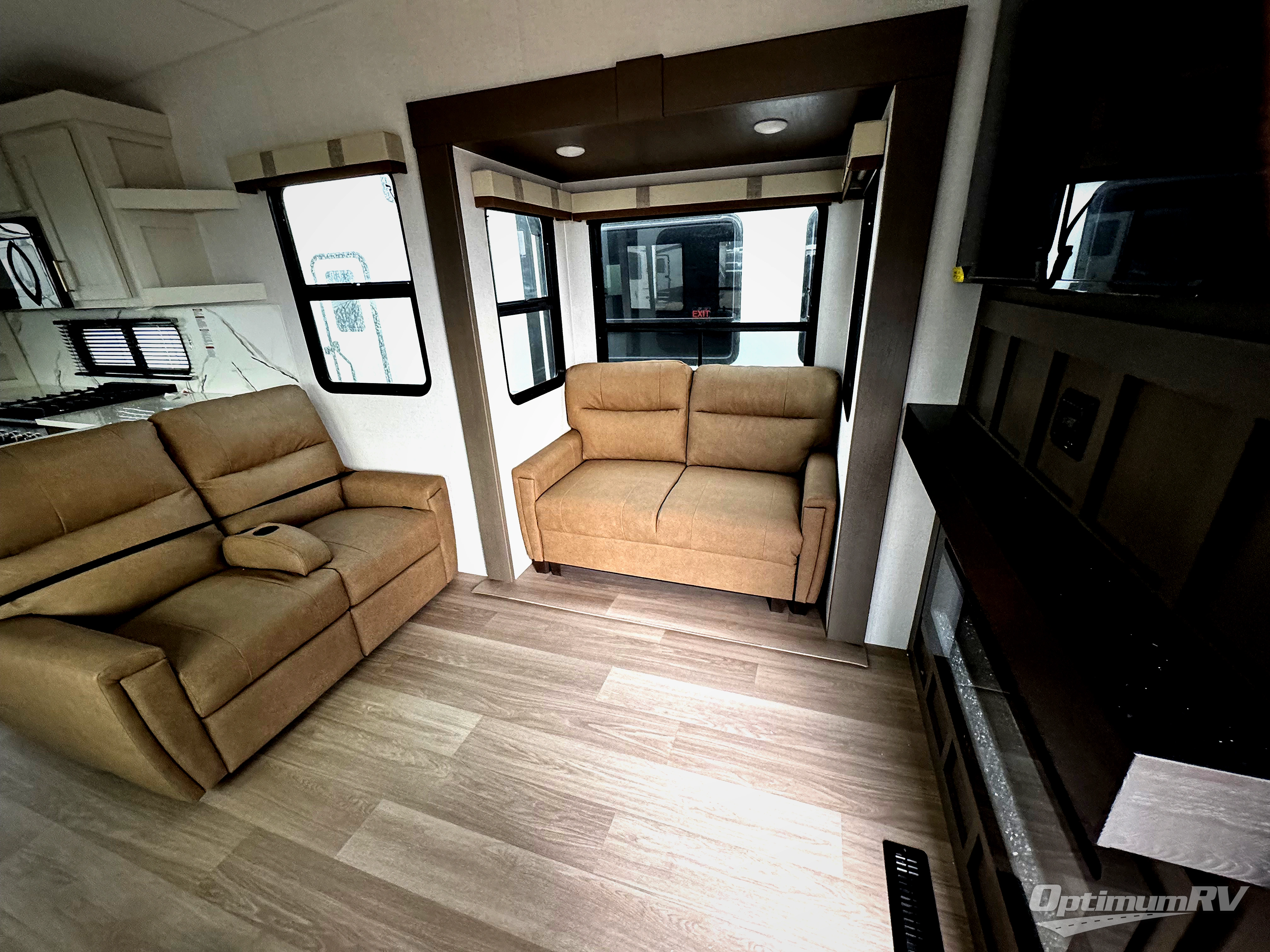 It won't be hard to find comfort and convenience in this spacious fifth wheel! The rear kitchen features ample counter space, a four burner 24" range, plus a 16 cu. ft. 12V refrigerator and pantry for food storage. There is also a desk here if you plan to work while you're away from home, and the coffee station by the pantry will be the perfect place to set up your own Keurig machine. The middle living area includes theater seating across from the 65" TV and fireplace, and there is a hide-a-bed sofa for guests to sleep on. A convenient utility room includes a sink with counter space plus stackable washer/dryer prep to make this an optional laundry room! A full bath will let you freshen up each day, and the front private bedroom will feel just like home with its king bed slide out, dresser and full-width wardrobe!