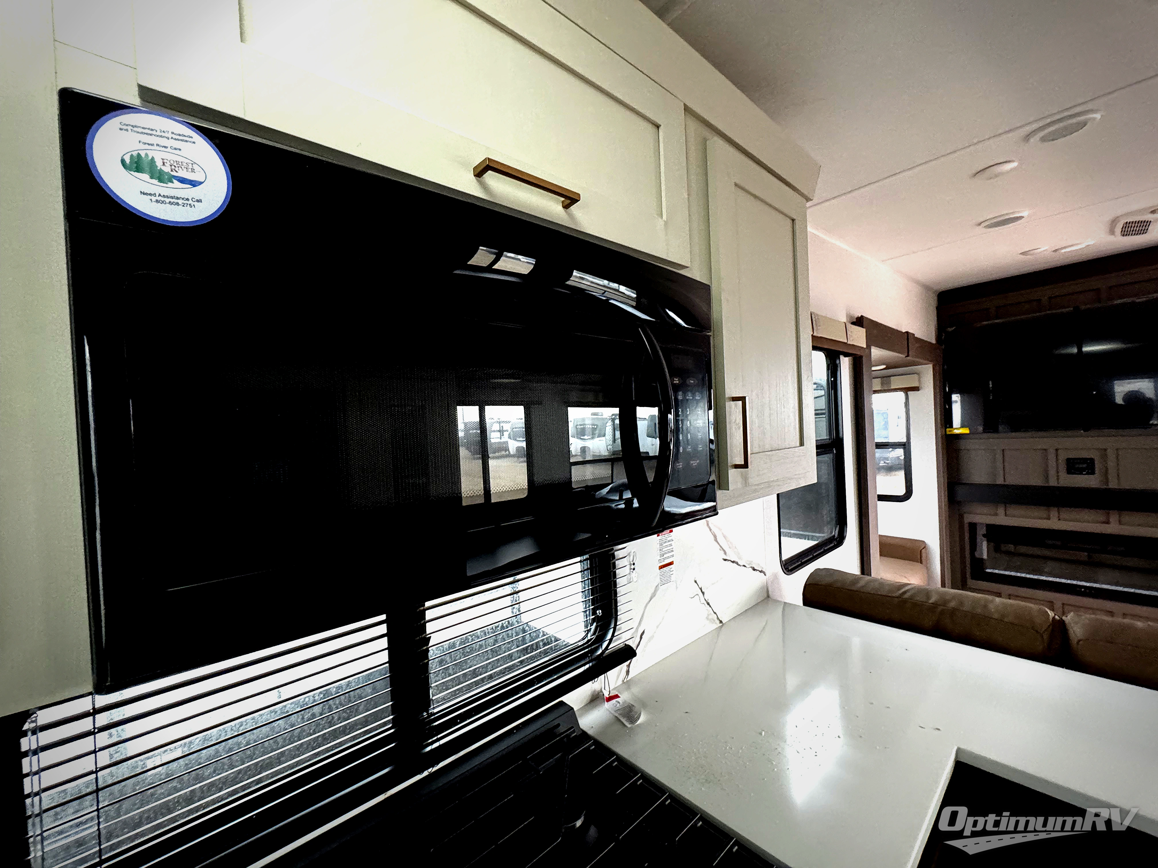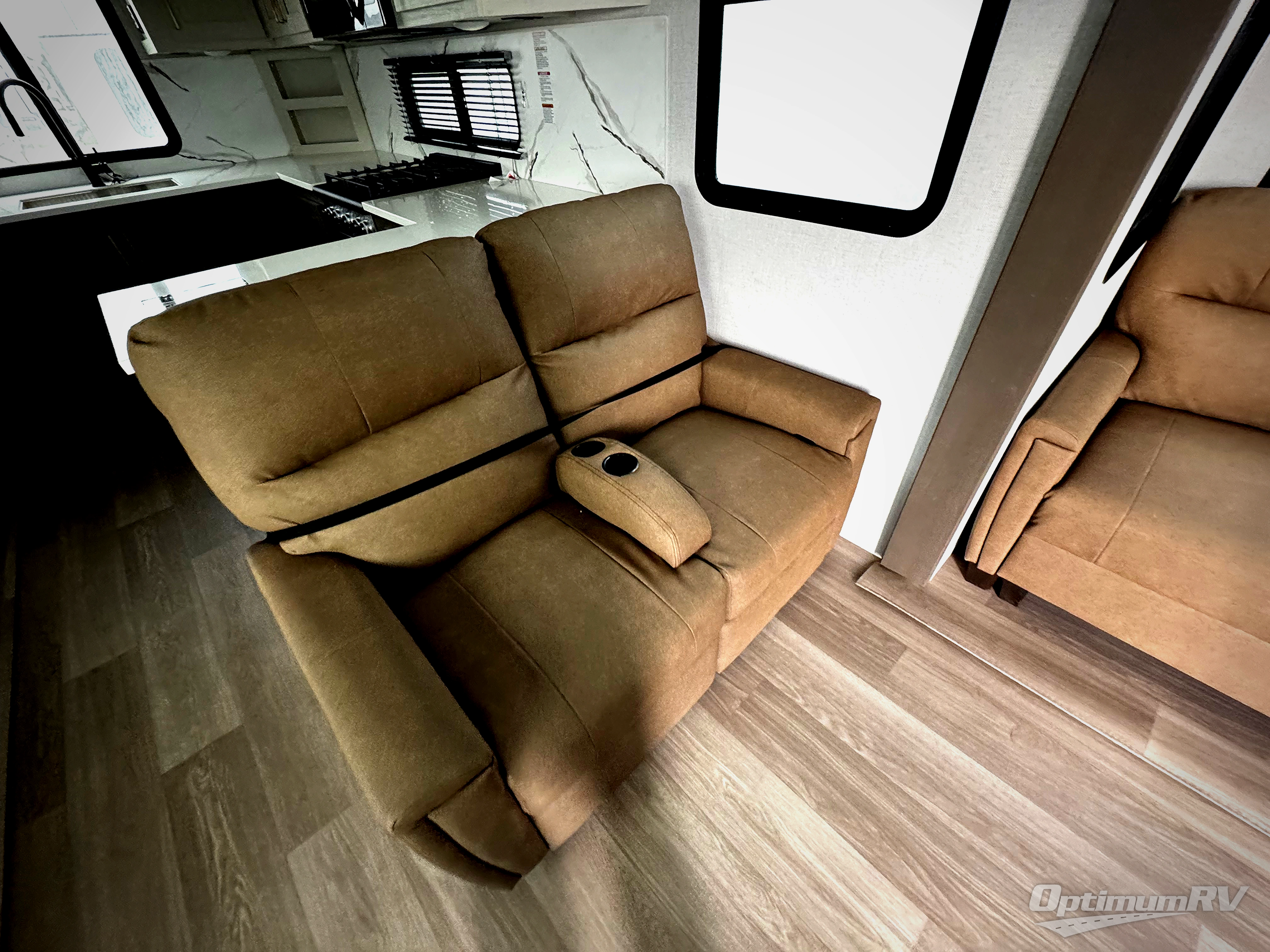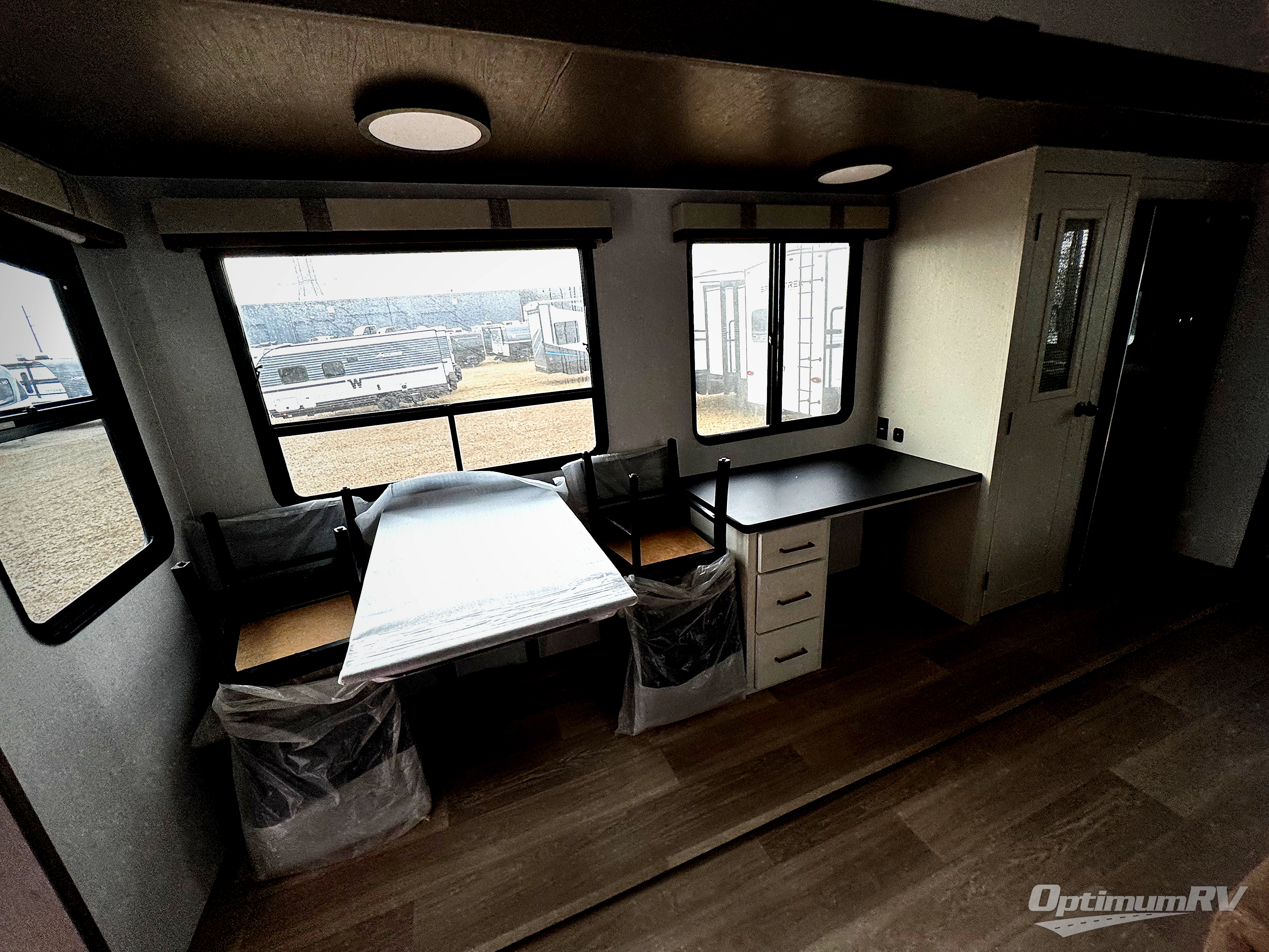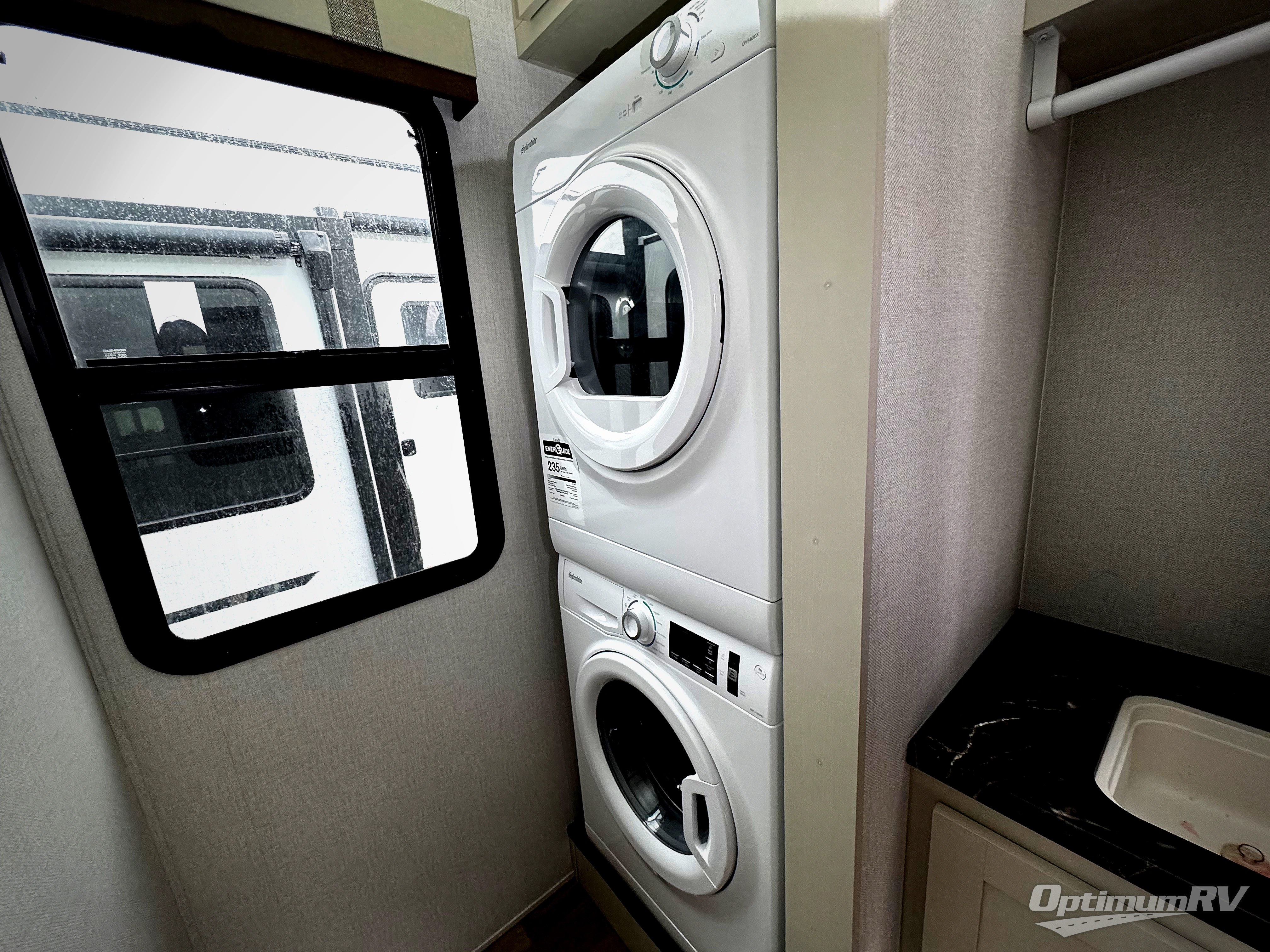It won't be hard to find comfort and convenience in this spacious fifth wheel! The rear kitchen features ample counter space, a four burner 24" range, plus a 16 cu. ft. 12V refrigerator and pantry for food storage. There is also a desk here if you plan to work while you're away from home, and the coffee station by the pantry will be the perfect place to set up your own Keurig machine. The middle living area includes theater seating across from the 65" TV and fireplace, and there is a hide-a-bed sofa for guests to sleep on. A convenient utility room includes a sink with counter space plus stackable washer/dryer prep to make this an optional laundry room! A full bath will let you freshen up each day, and the front private bedroom will feel just like home with its king bed slide out, dresser and full-width wardrobe!