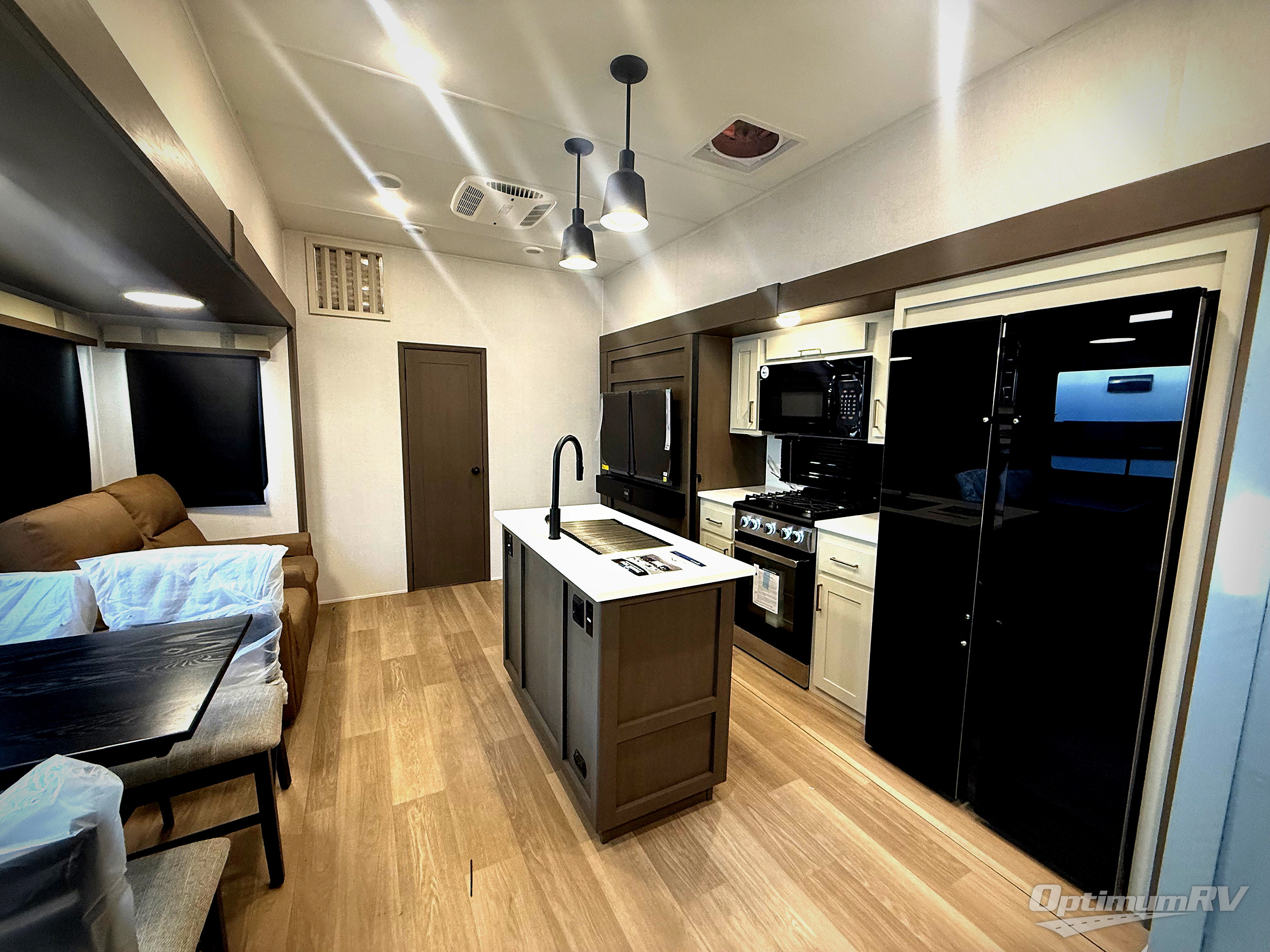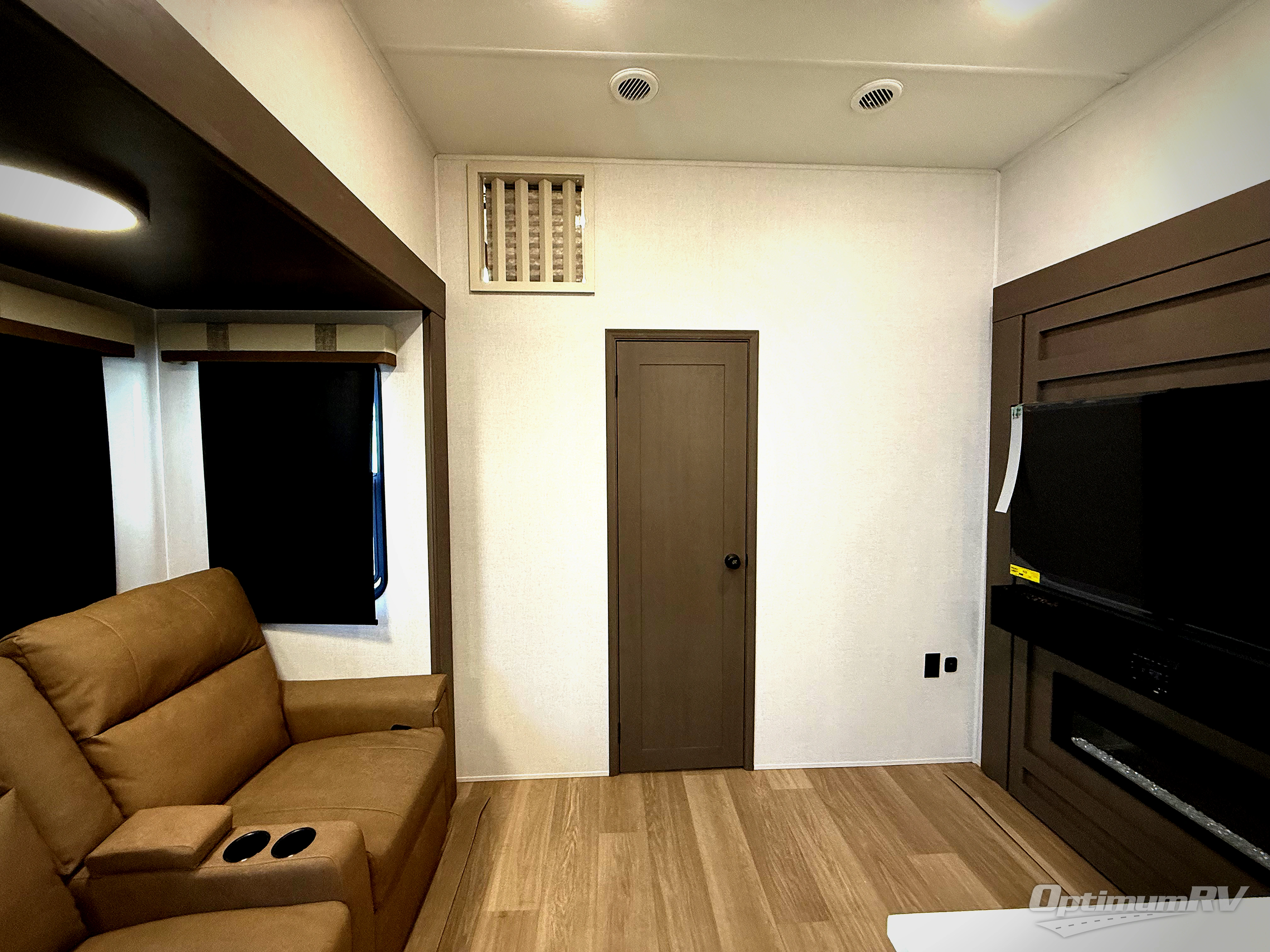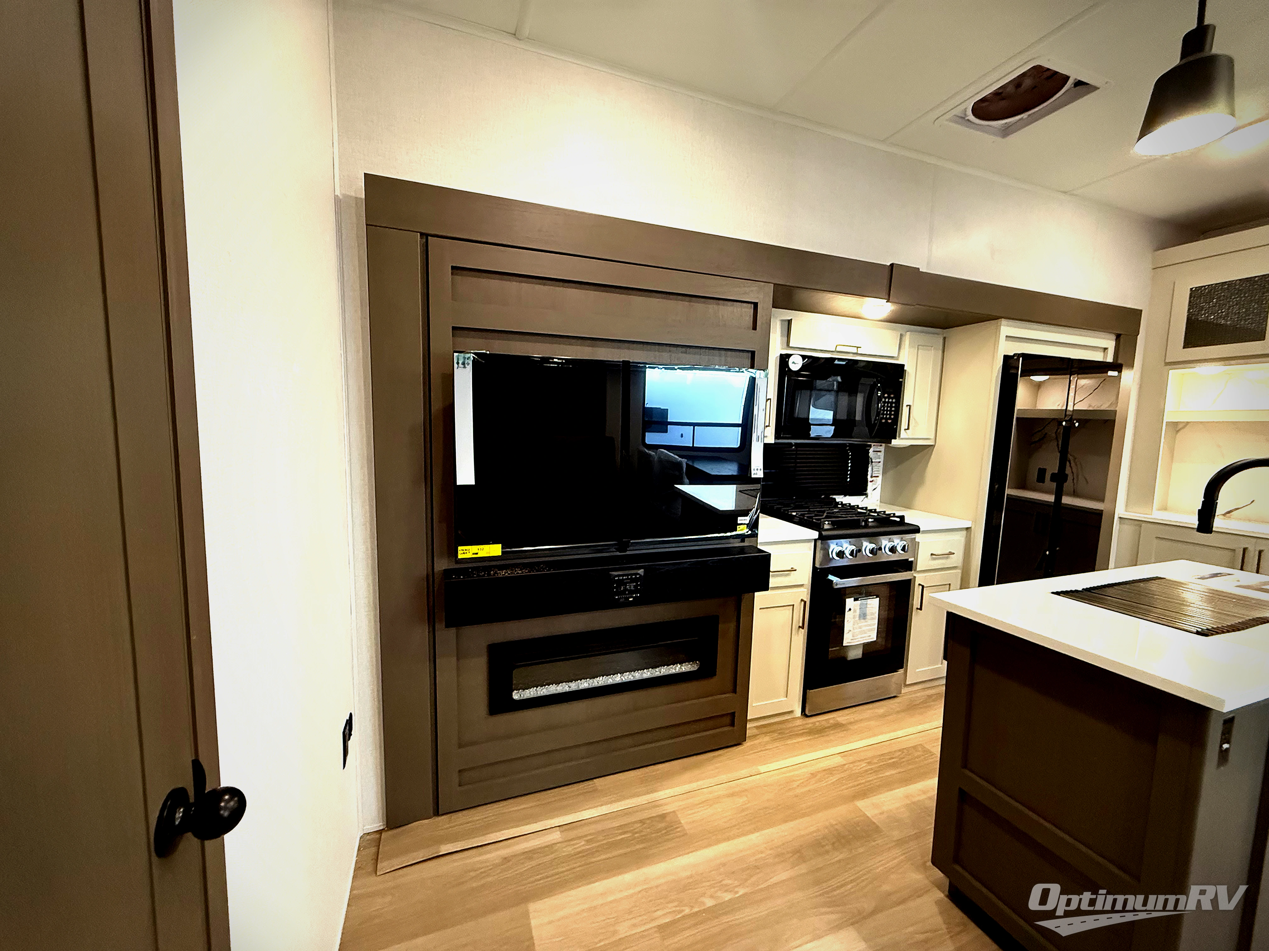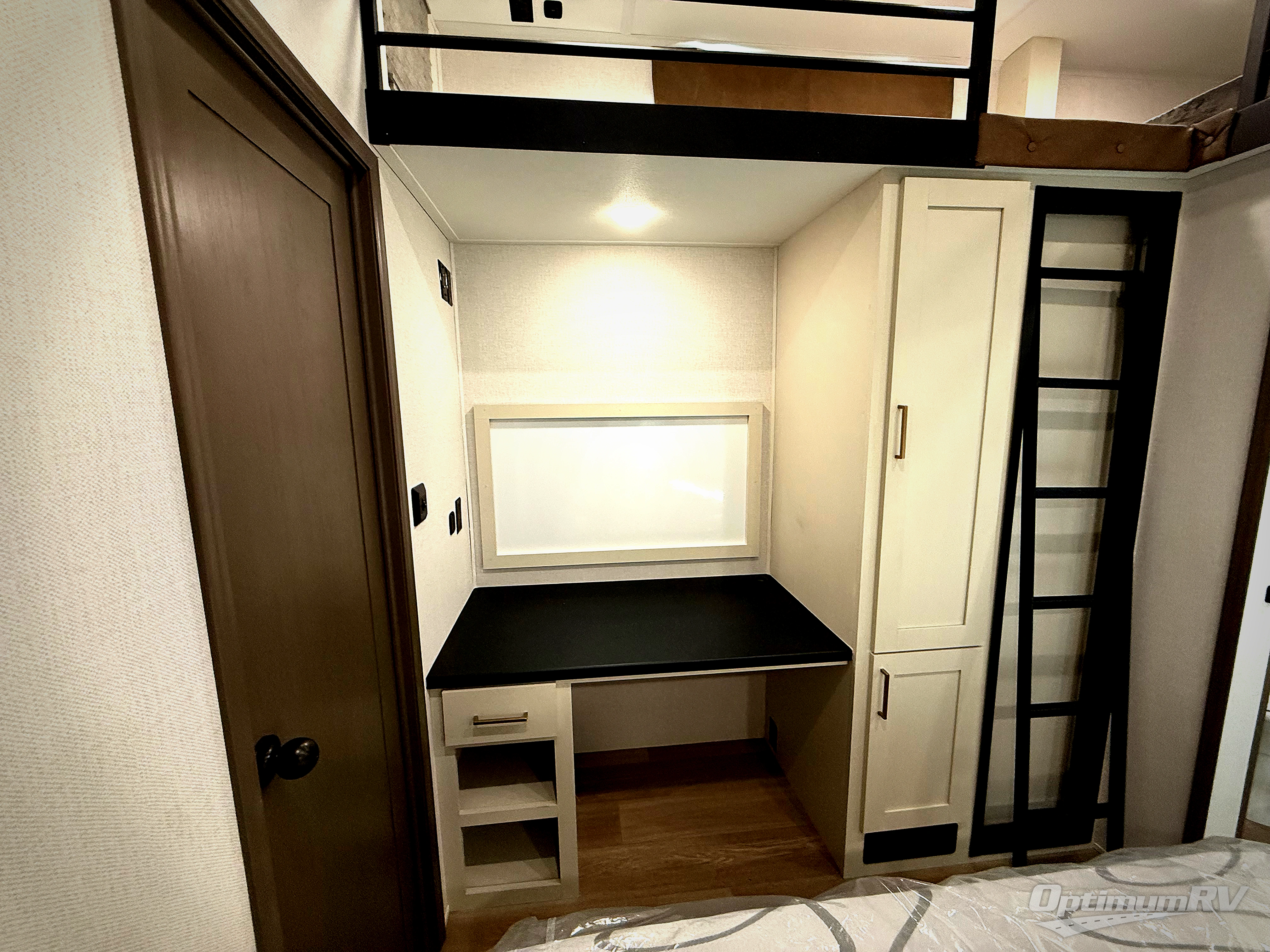 This is the perfect fifth wheel if you enjoy bringing along extra friends and family! You'll have the front private bedroom all to yourselves with a king bed slide out, a dresser with TV prep, plus a large front wardrobe and stackable washer/dryer prep. And a full bath is right next door for easy use. Your guests will love the rear den suite with a power tilt queen bed slide and a desk with a chair. There is also a full rear bath with its own exterior entry door and a loft area for even more sleeping or storage space. In the morning, you can all meet in the combined kitchen and living area that includes dual opposing slides for more space, a kitchen island, and a hutch for additional storage. There is also theater seating in direct view of the 50" TV and fireplace, along with a dinette with four chairs where you can dine together.