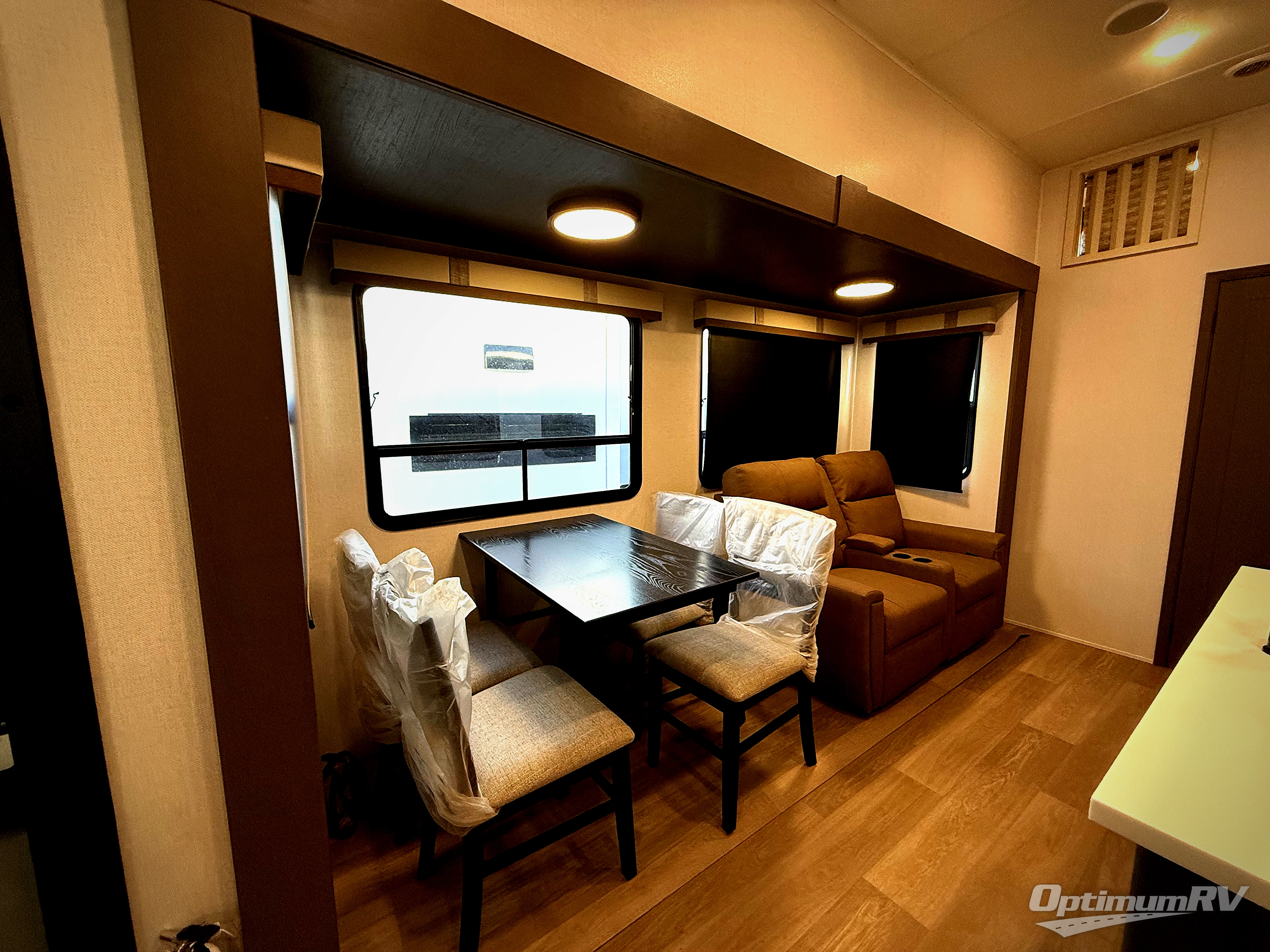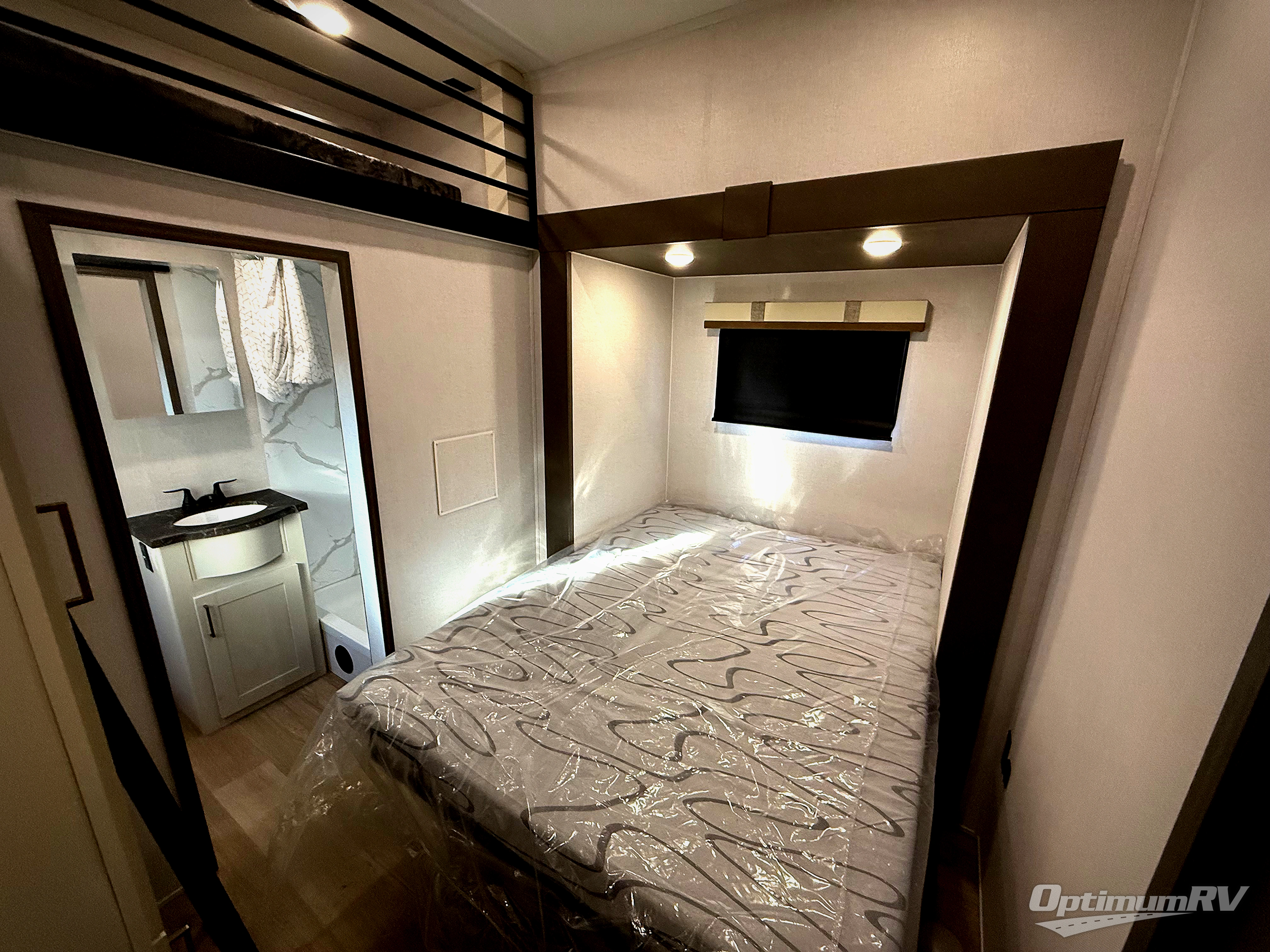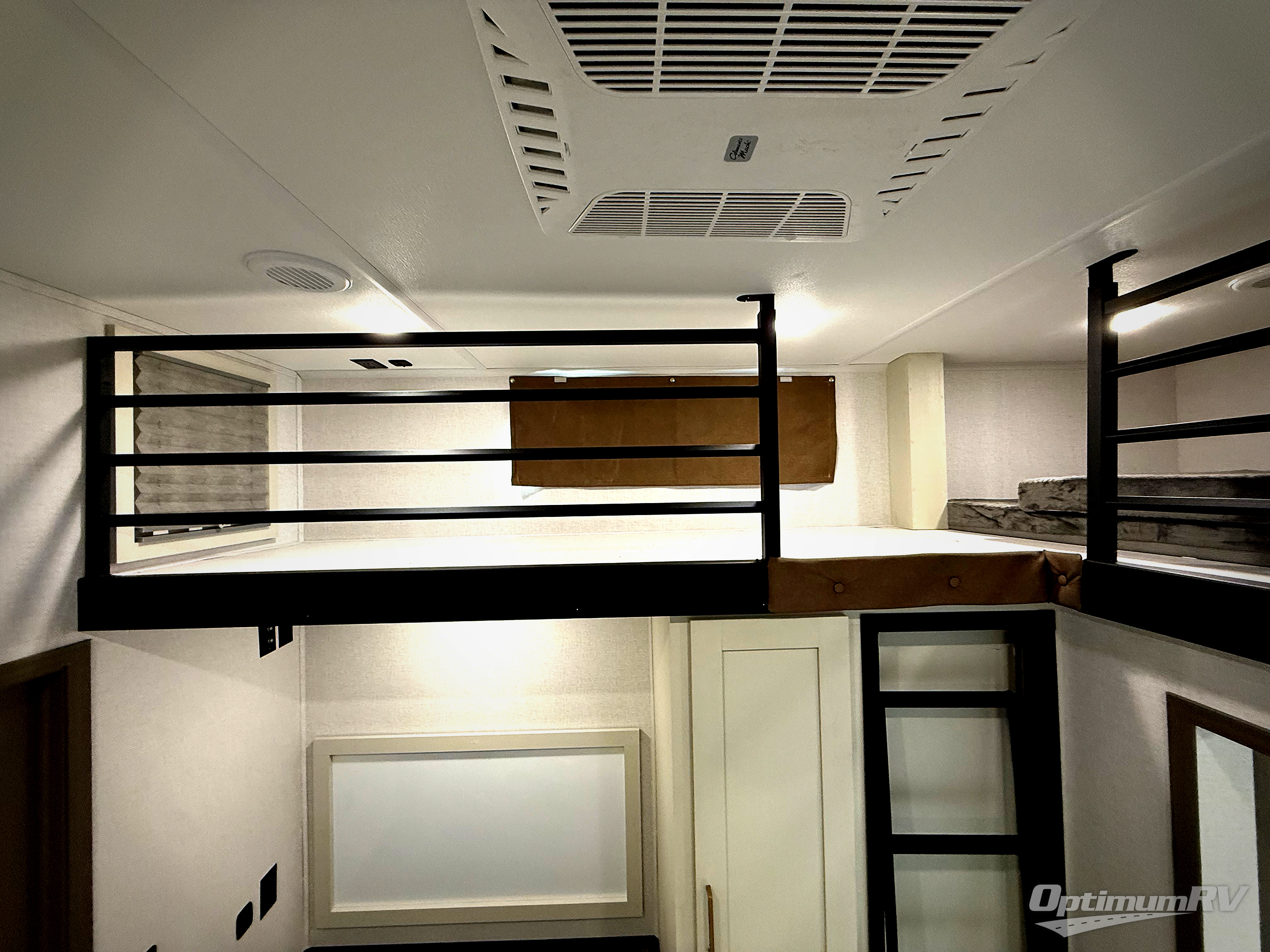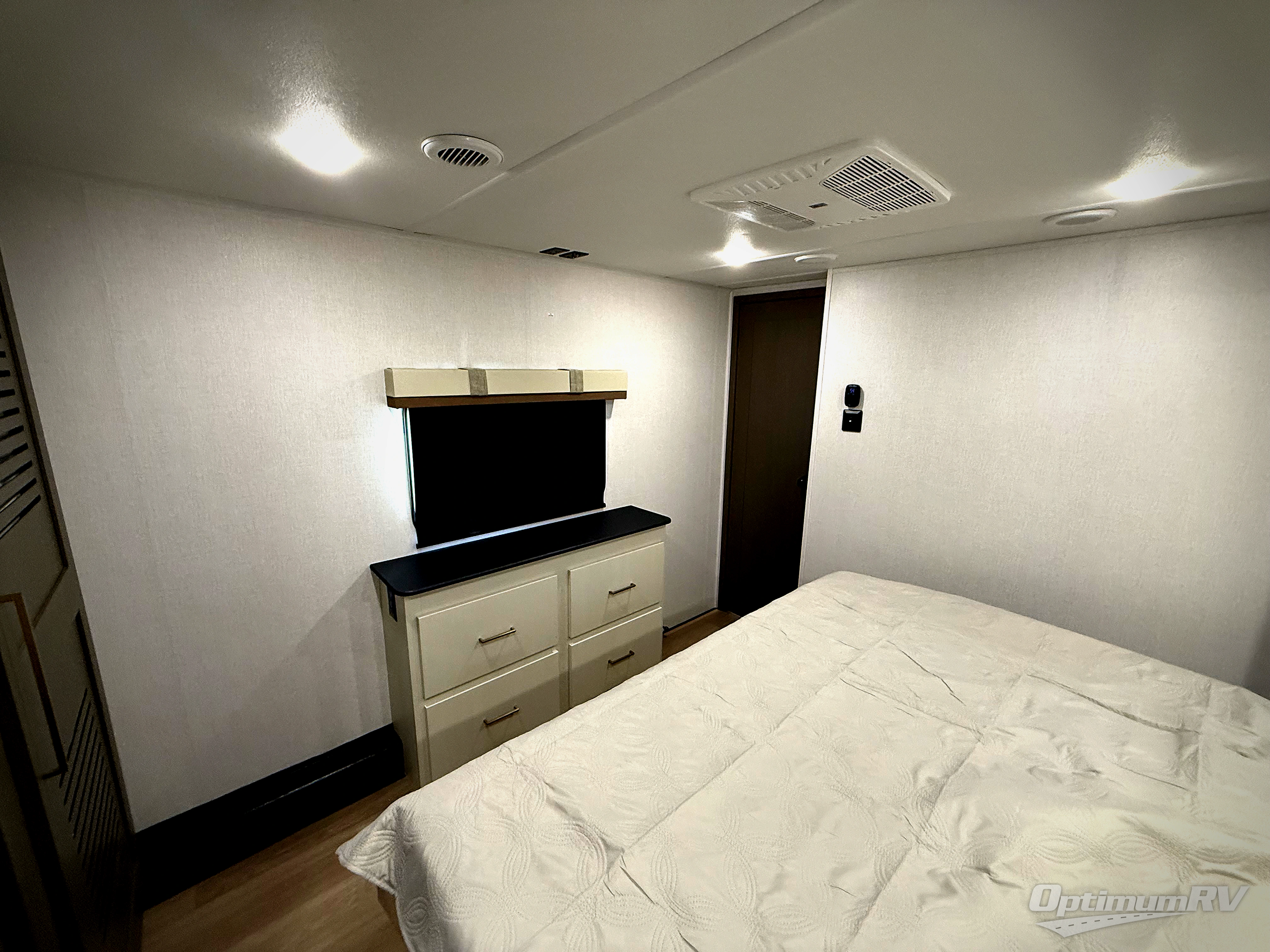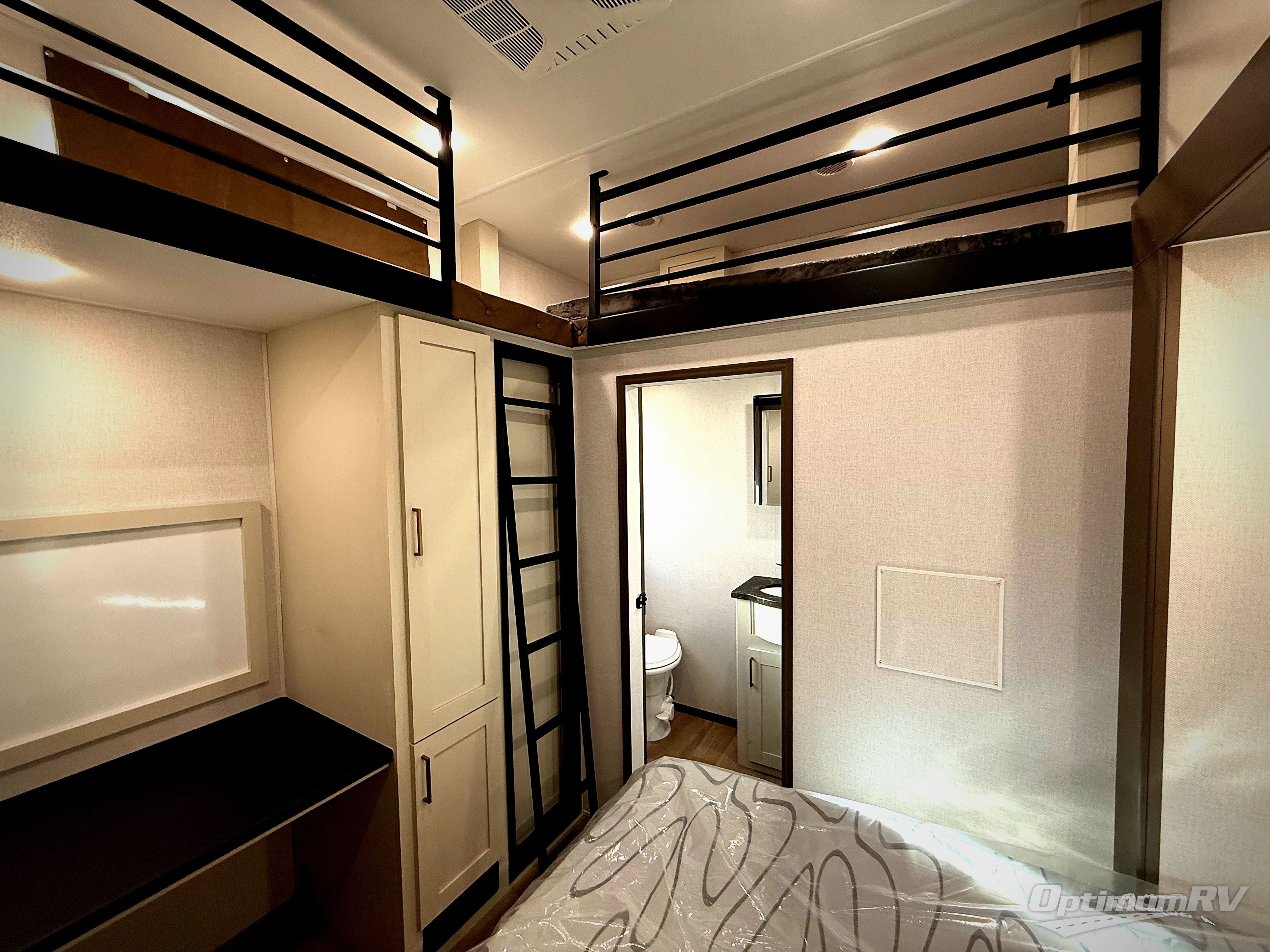 This is the perfect fifth wheel if you enjoy bringing along extra friends and family! You'll have the front private bedroom all to yourselves with a king bed slide out, a dresser with TV prep, plus a large front wardrobe and stackable washer/dryer prep. And a full bath is right next door for easy use. Your guests will love the rear den suite with a power tilt queen bed slide and a desk with a chair. There is also a full rear bath with its own exterior entry door and a loft area for even more sleeping or storage space. In the morning, you can all meet in the combined kitchen and living area that includes dual opposing slides for more space, a kitchen island, and a hutch for additional storage. There is also theater seating in direct view of the 50" TV and fireplace, along with a dinette with four chairs where you can dine together.