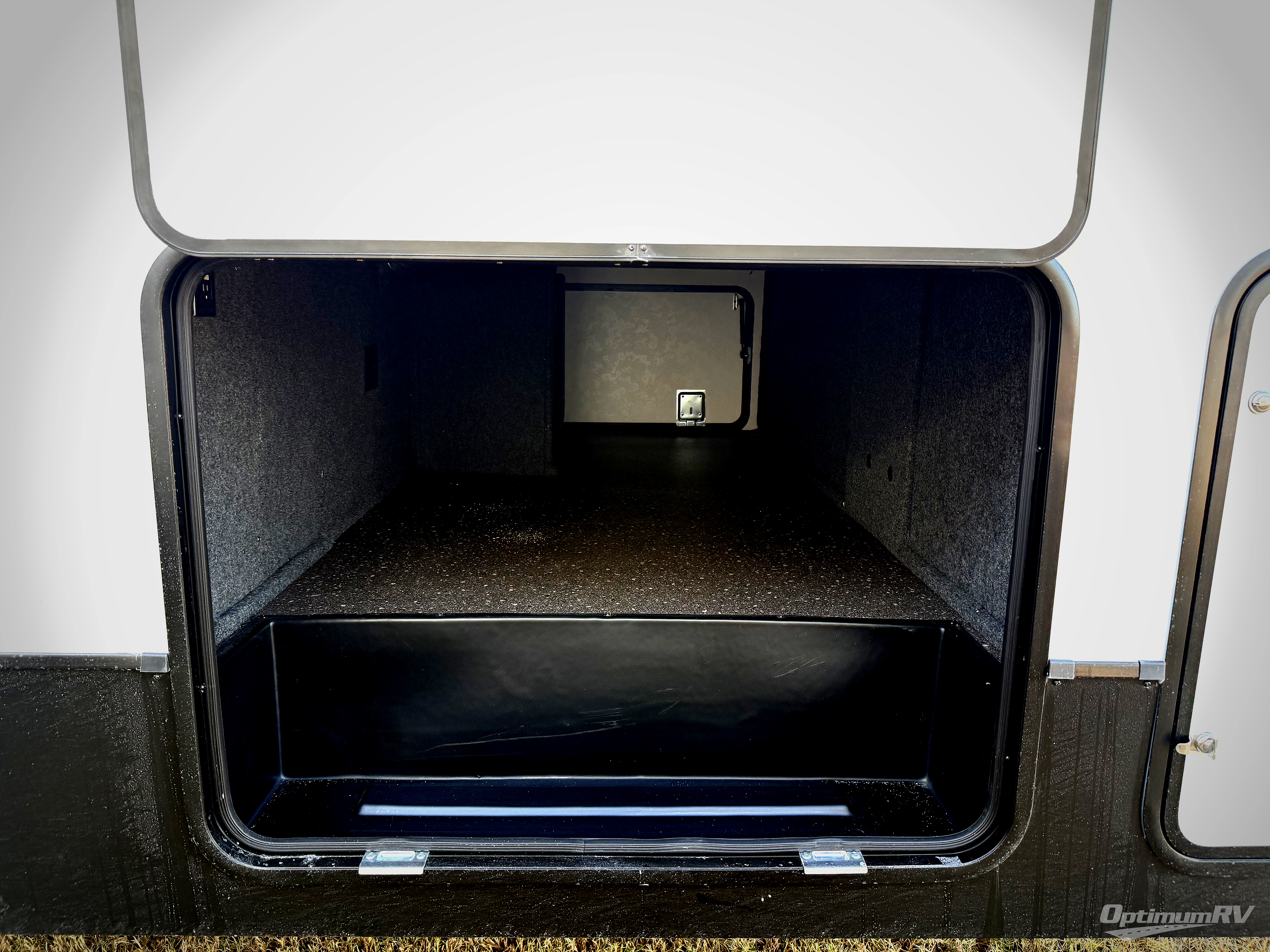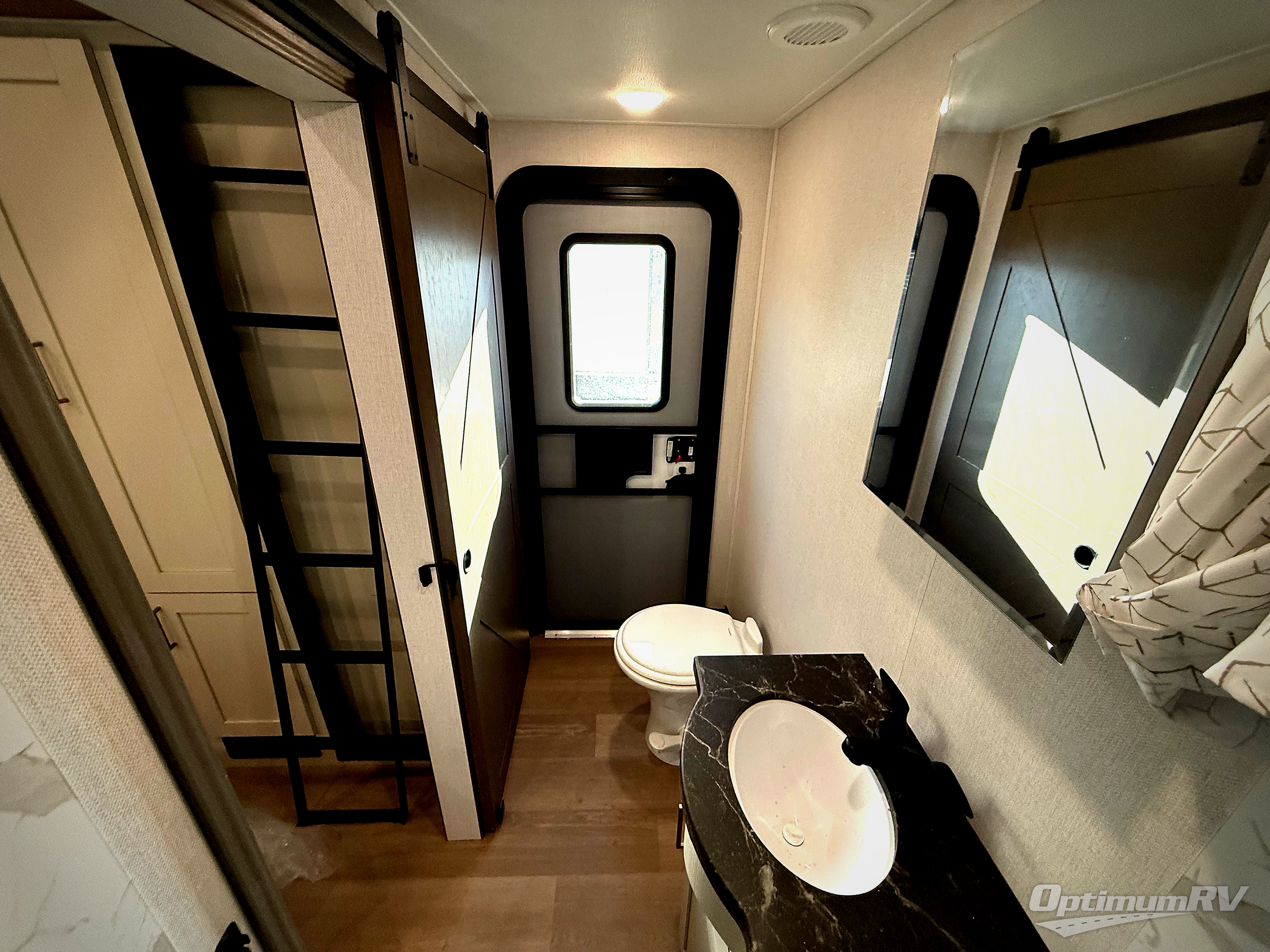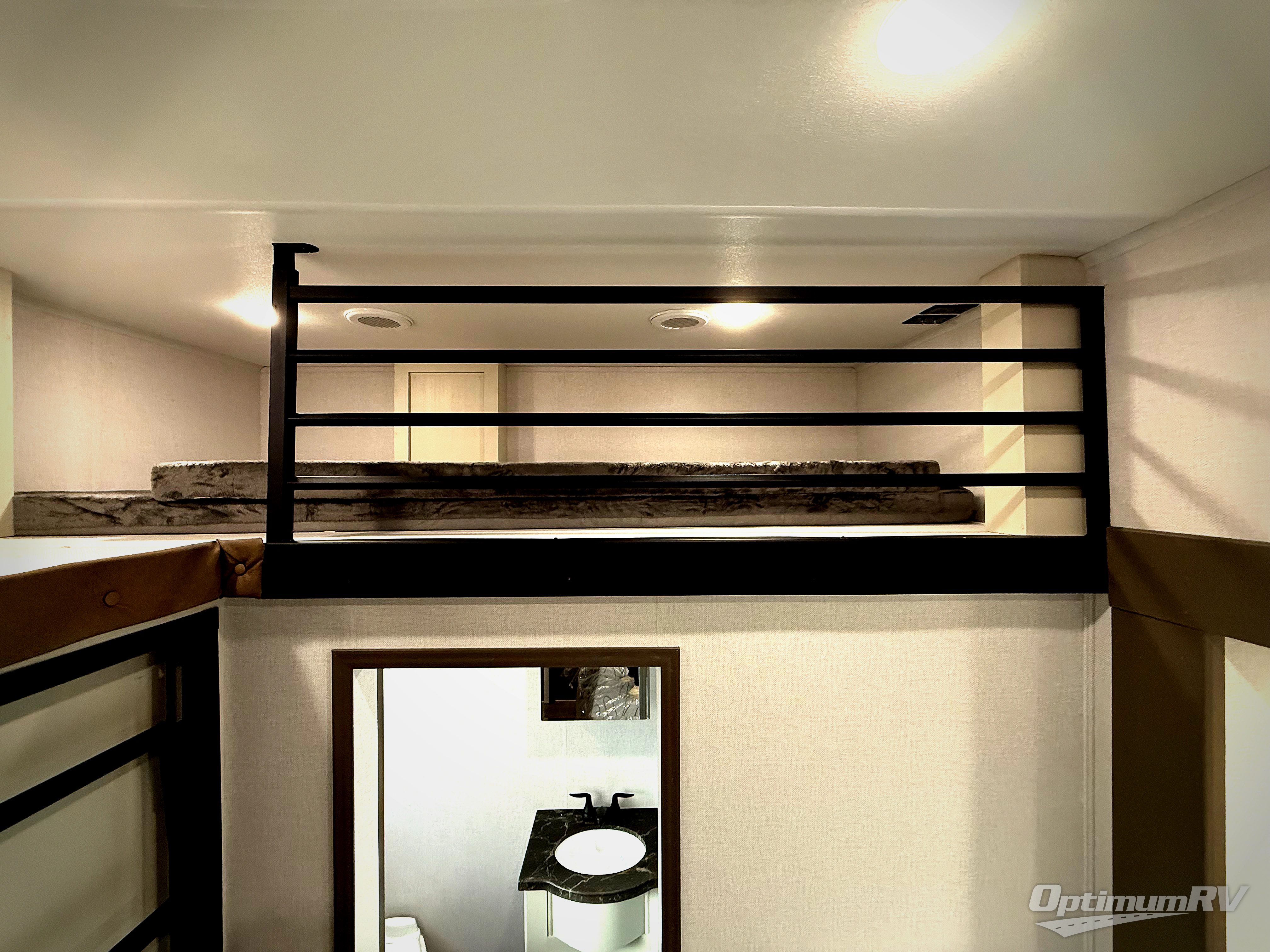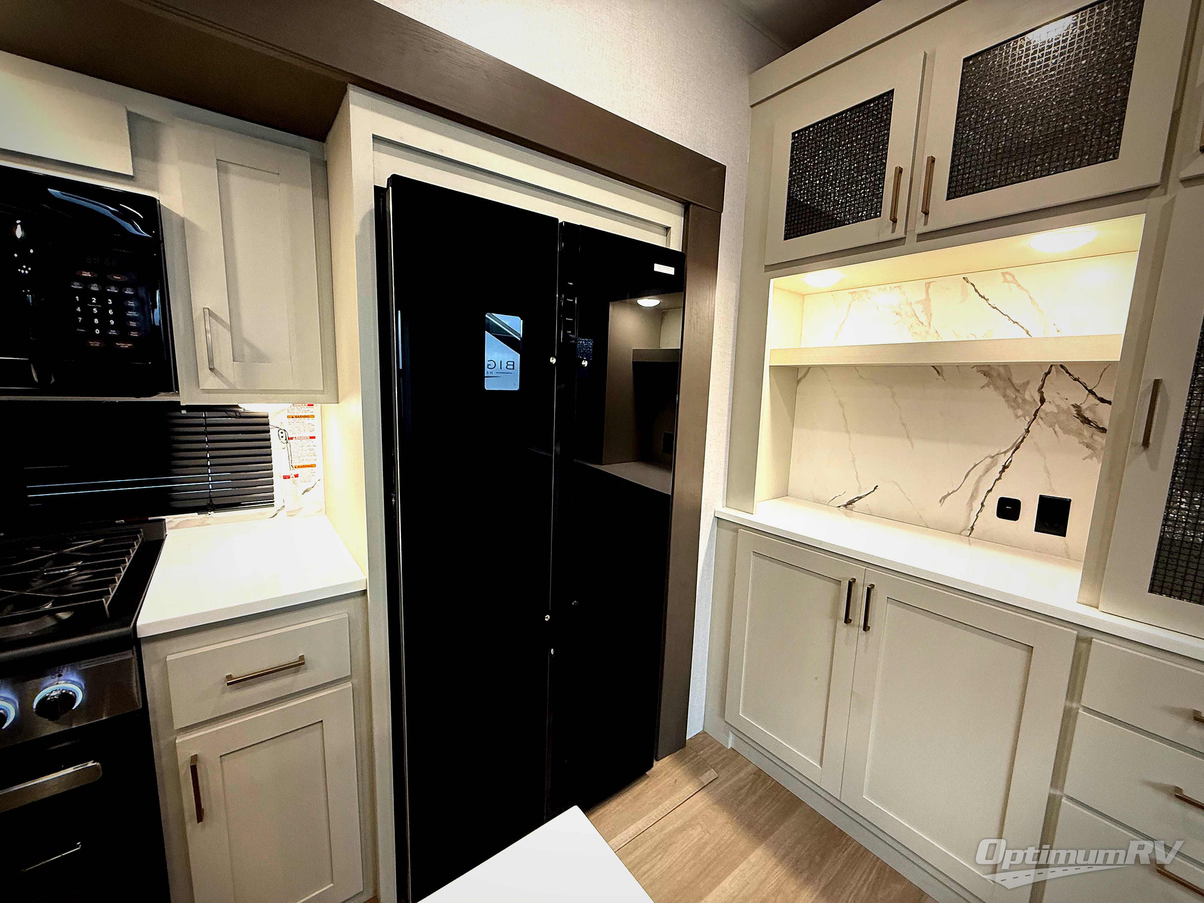 This is the perfect fifth wheel if you enjoy bringing along extra friends and family! You'll have the front private bedroom all to yourselves with a king bed slide out, a dresser with TV prep, plus a large front wardrobe and stackable washer/dryer prep. And a full bath is right next door for easy use. Your guests will love the rear den suite with a power tilt queen bed slide and a desk with a chair. There is also a full rear bath with its own exterior entry door and a loft area for even more sleeping or storage space. In the morning, you can all meet in the combined kitchen and living area that includes dual opposing slides for more space, a kitchen island, and a hutch for additional storage. There is also theater seating in direct view of the 50" TV and fireplace, along with a dinette with four chairs where you can dine together.