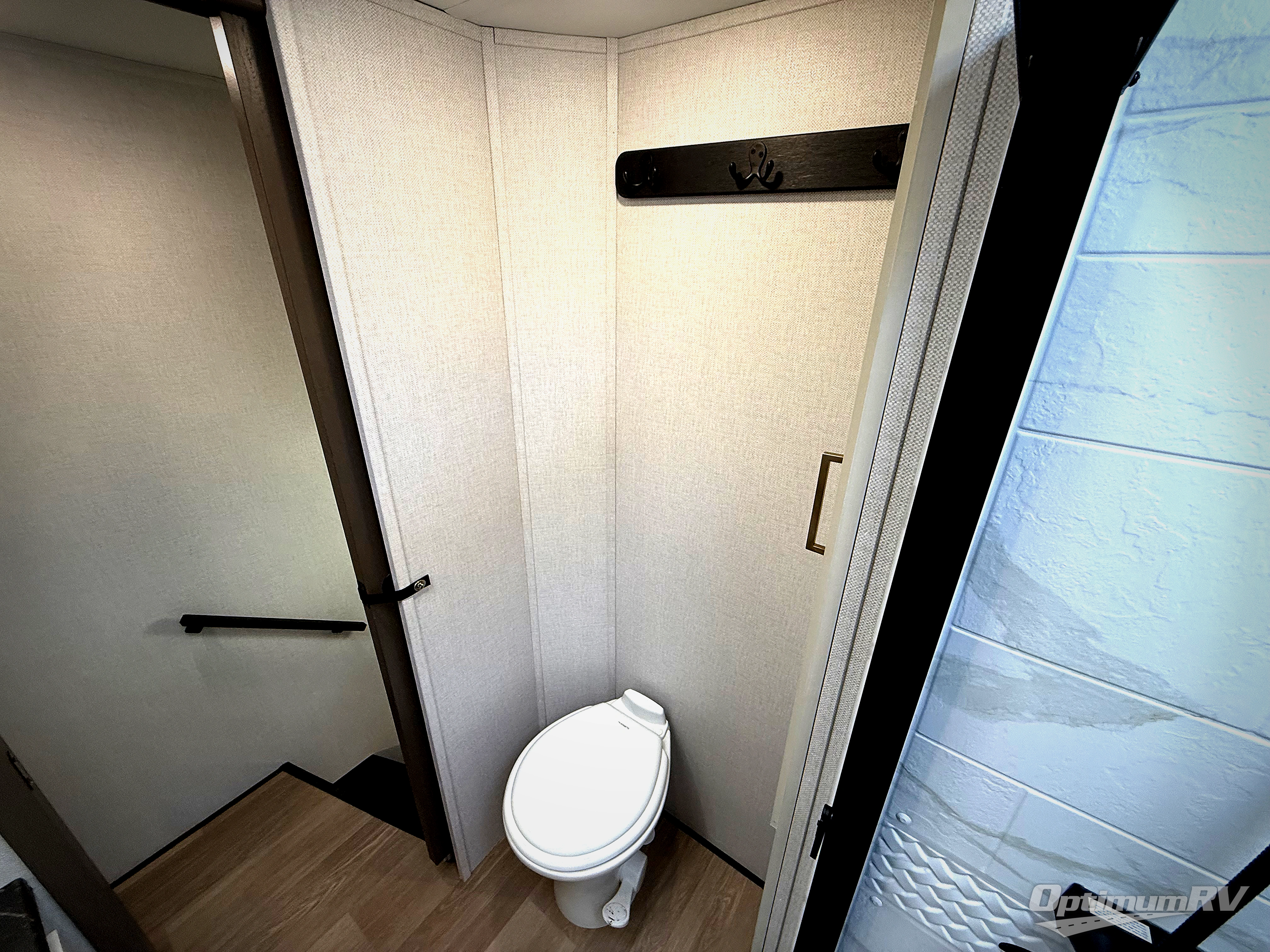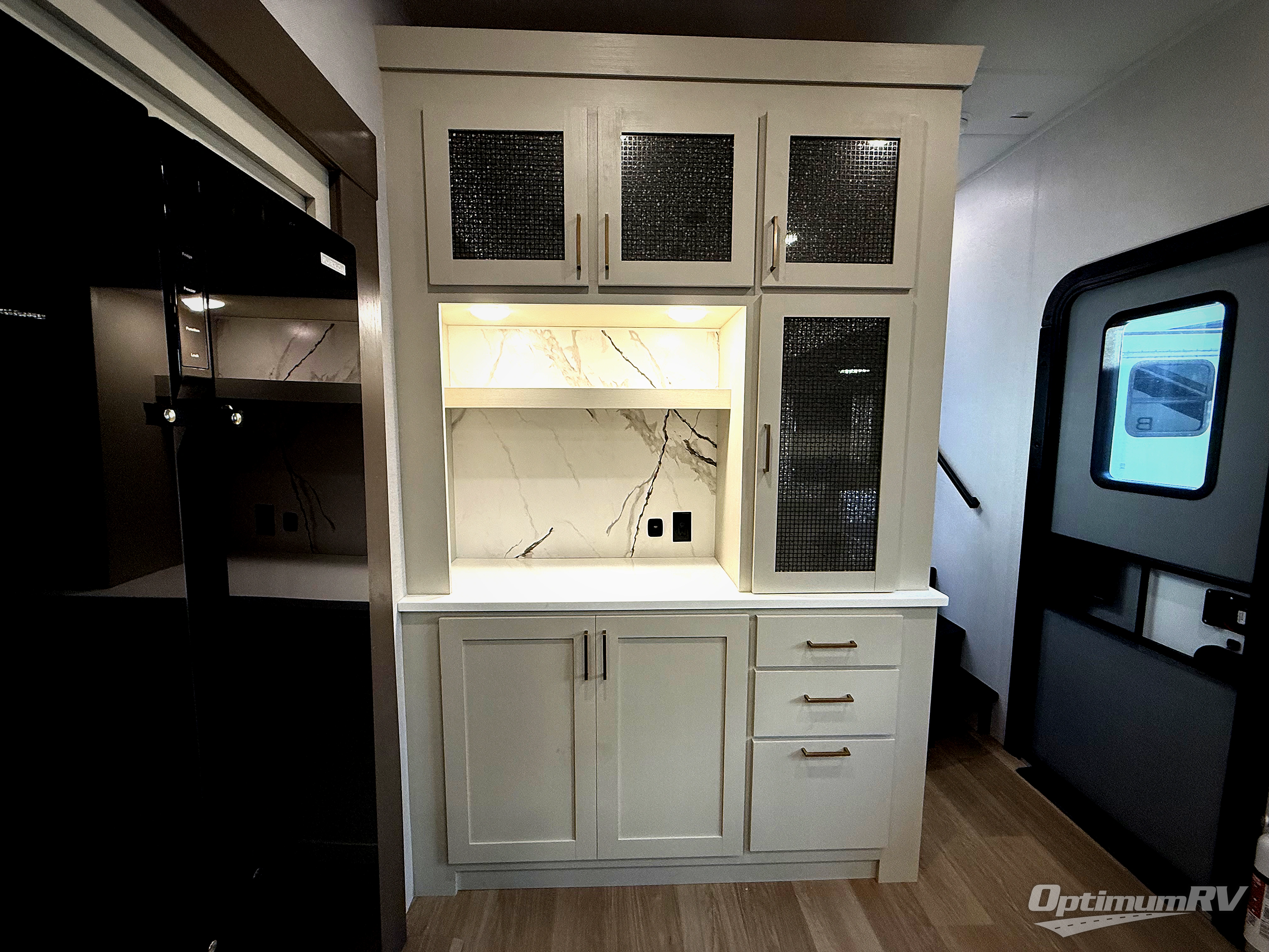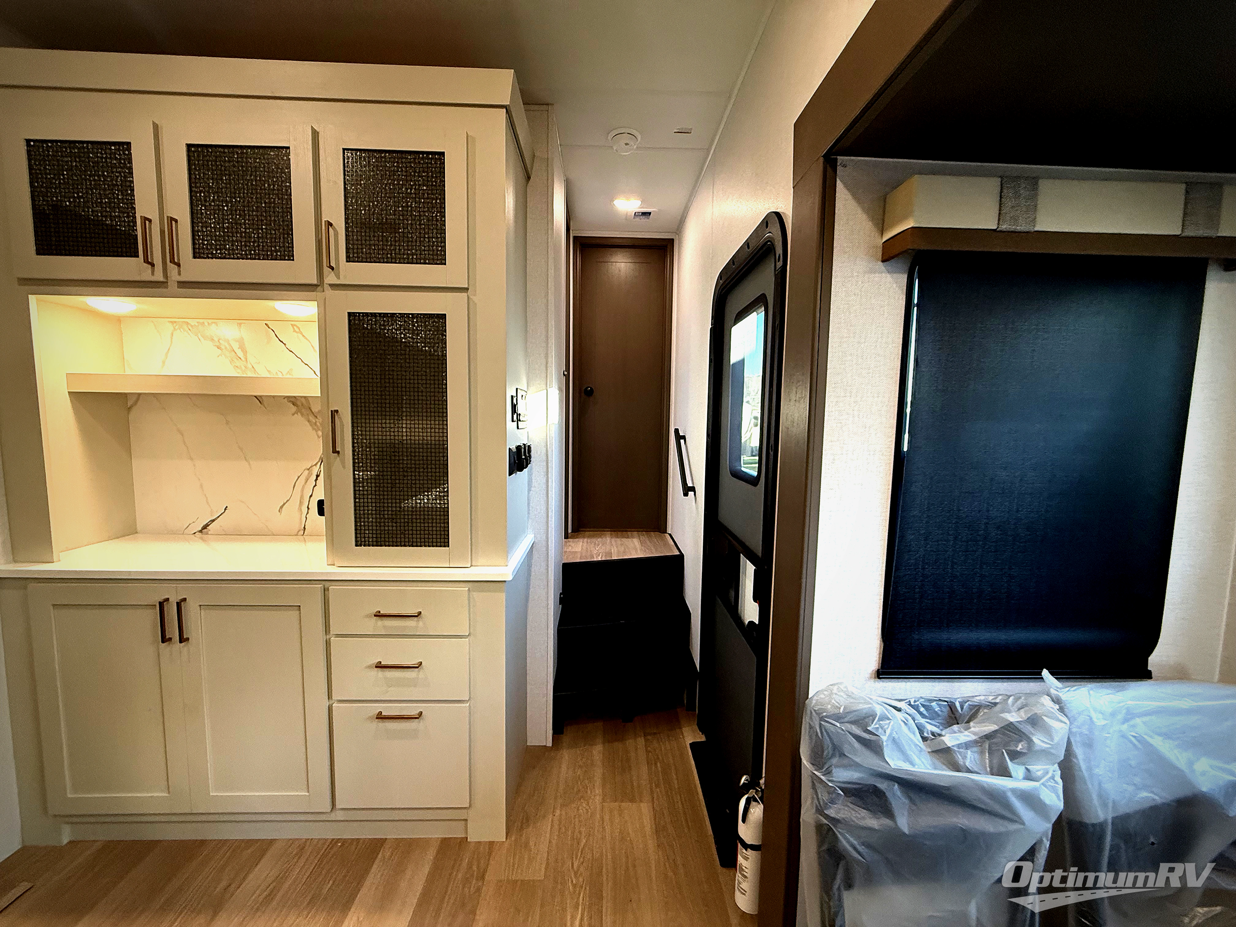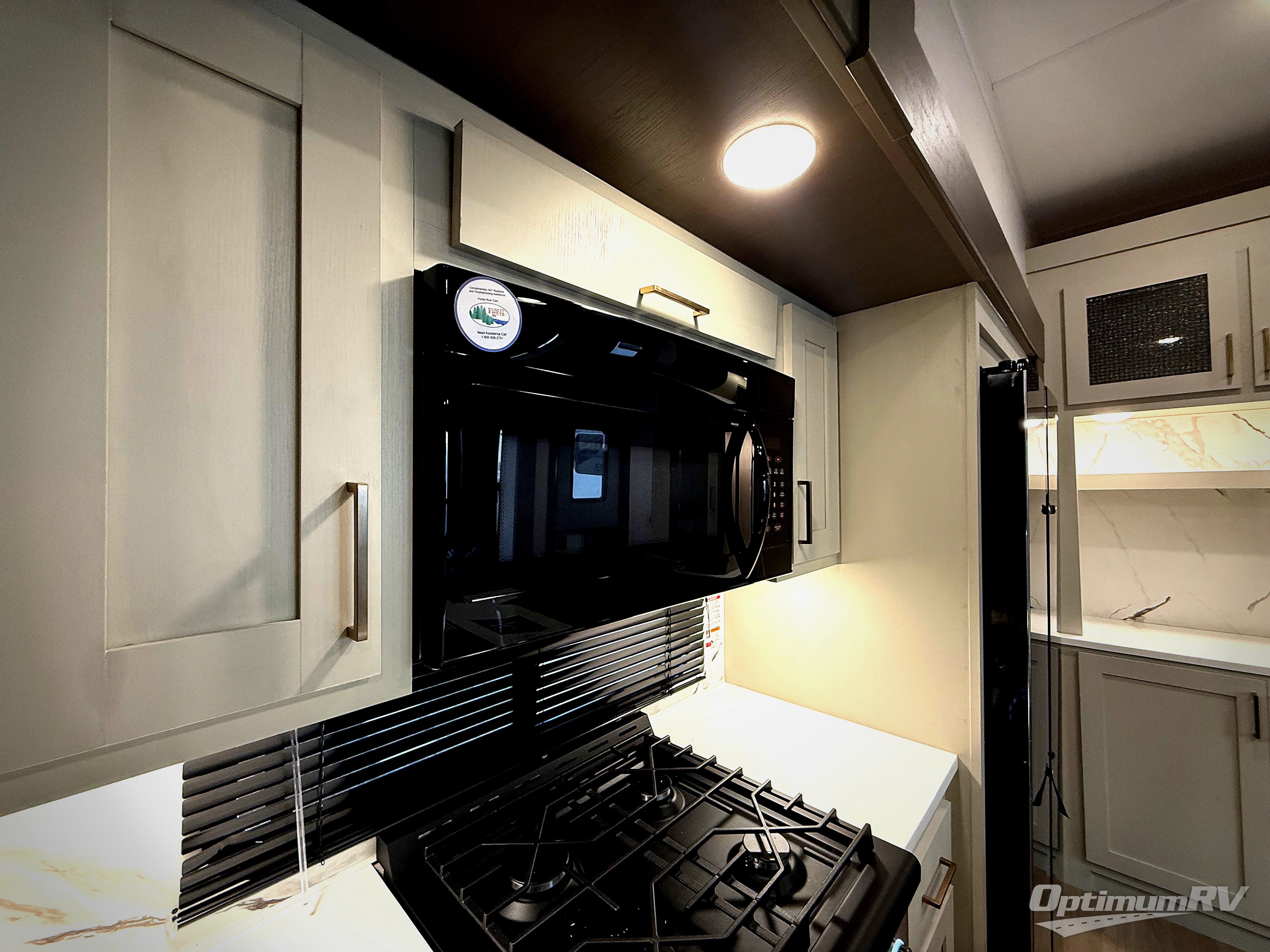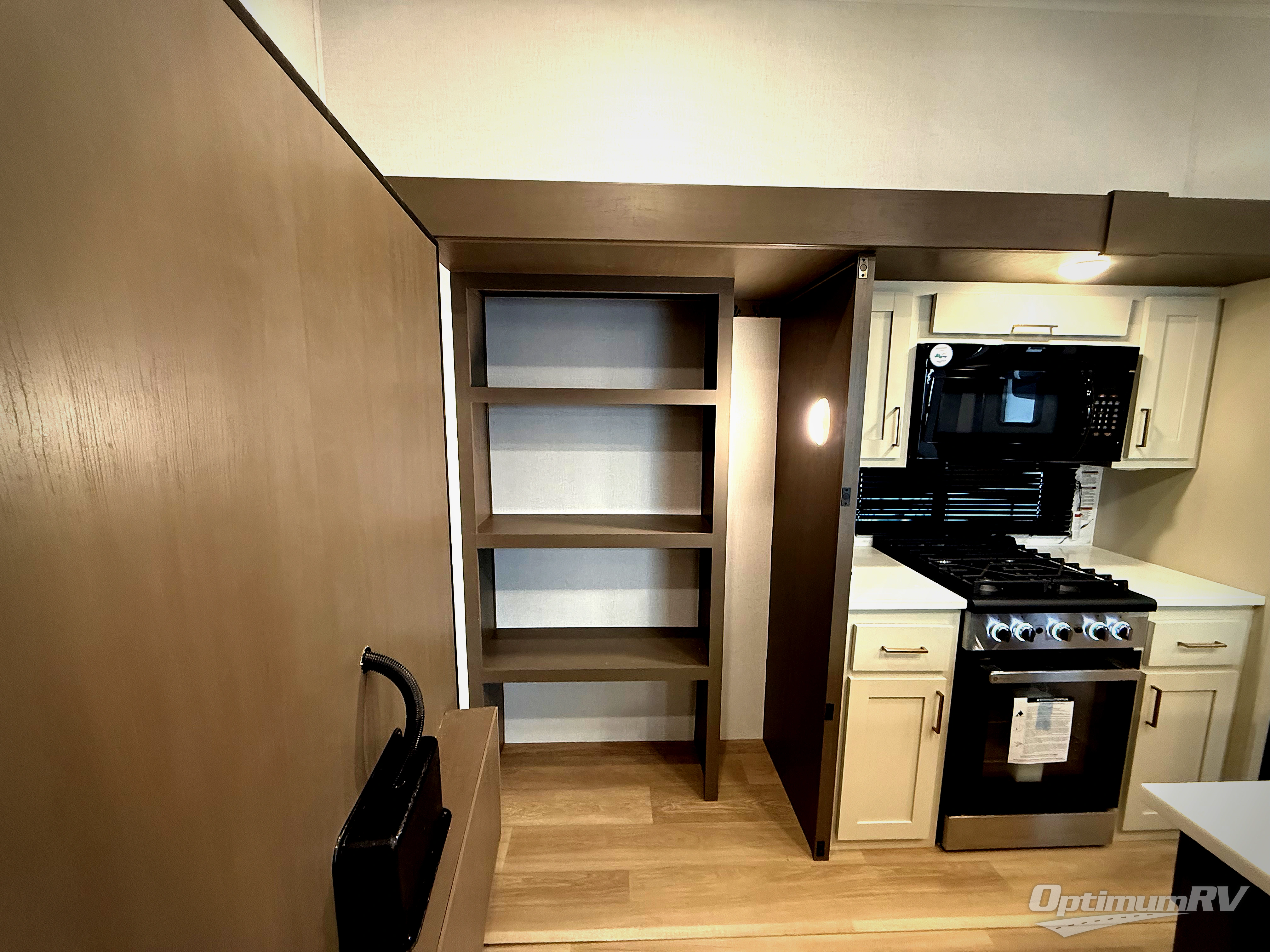 This is the perfect fifth wheel if you enjoy bringing along extra friends and family! You'll have the front private bedroom all to yourselves with a king bed slide out, a dresser with TV prep, plus a large front wardrobe and stackable washer/dryer prep. And a full bath is right next door for easy use. Your guests will love the rear den suite with a power tilt queen bed slide and a desk with a chair. There is also a full rear bath with its own exterior entry door and a loft area for even more sleeping or storage space. In the morning, you can all meet in the combined kitchen and living area that includes dual opposing slides for more space, a kitchen island, and a hutch for additional storage. There is also theater seating in direct view of the 50" TV and fireplace, along with a dinette with four chairs where you can dine together.