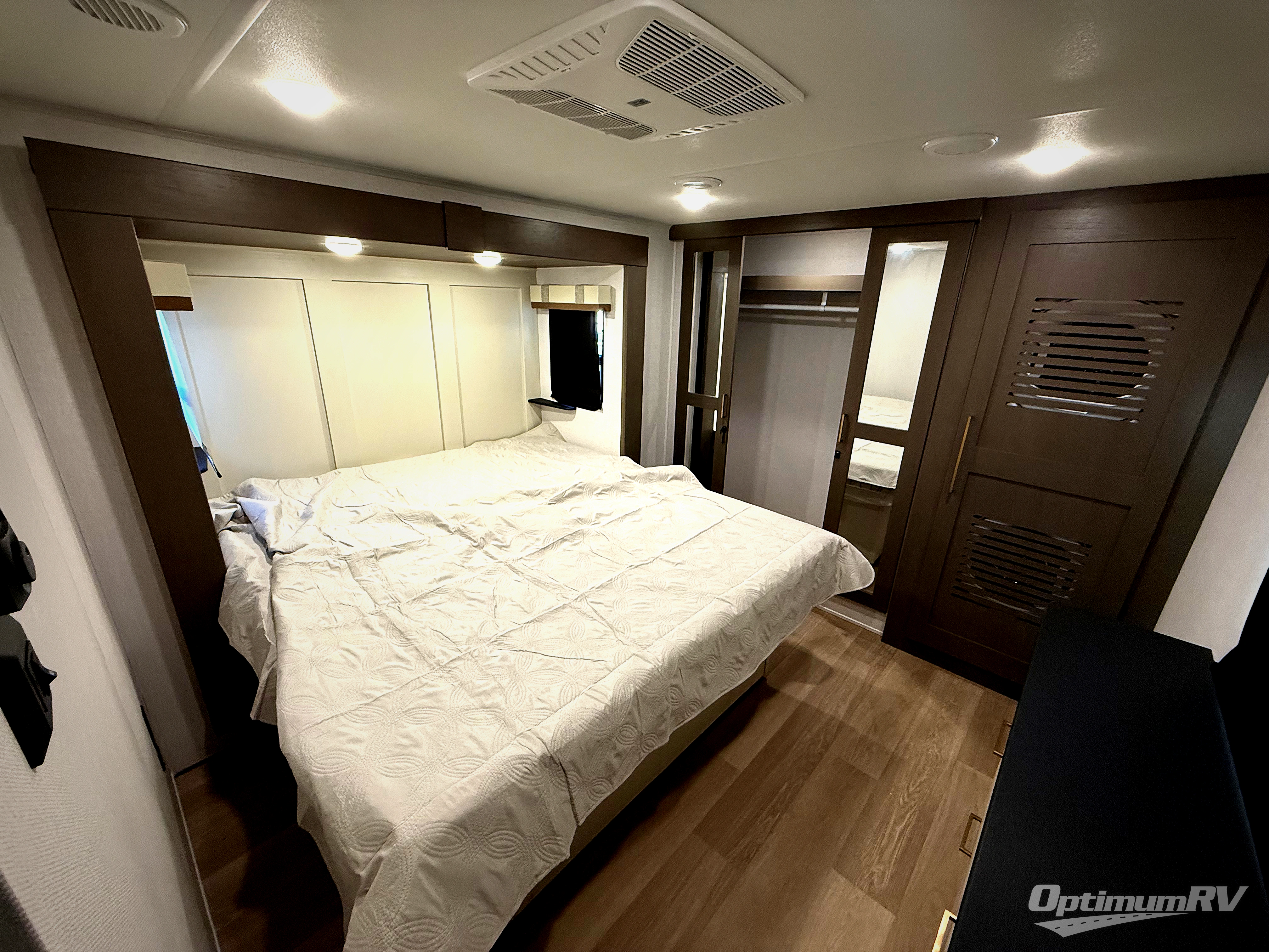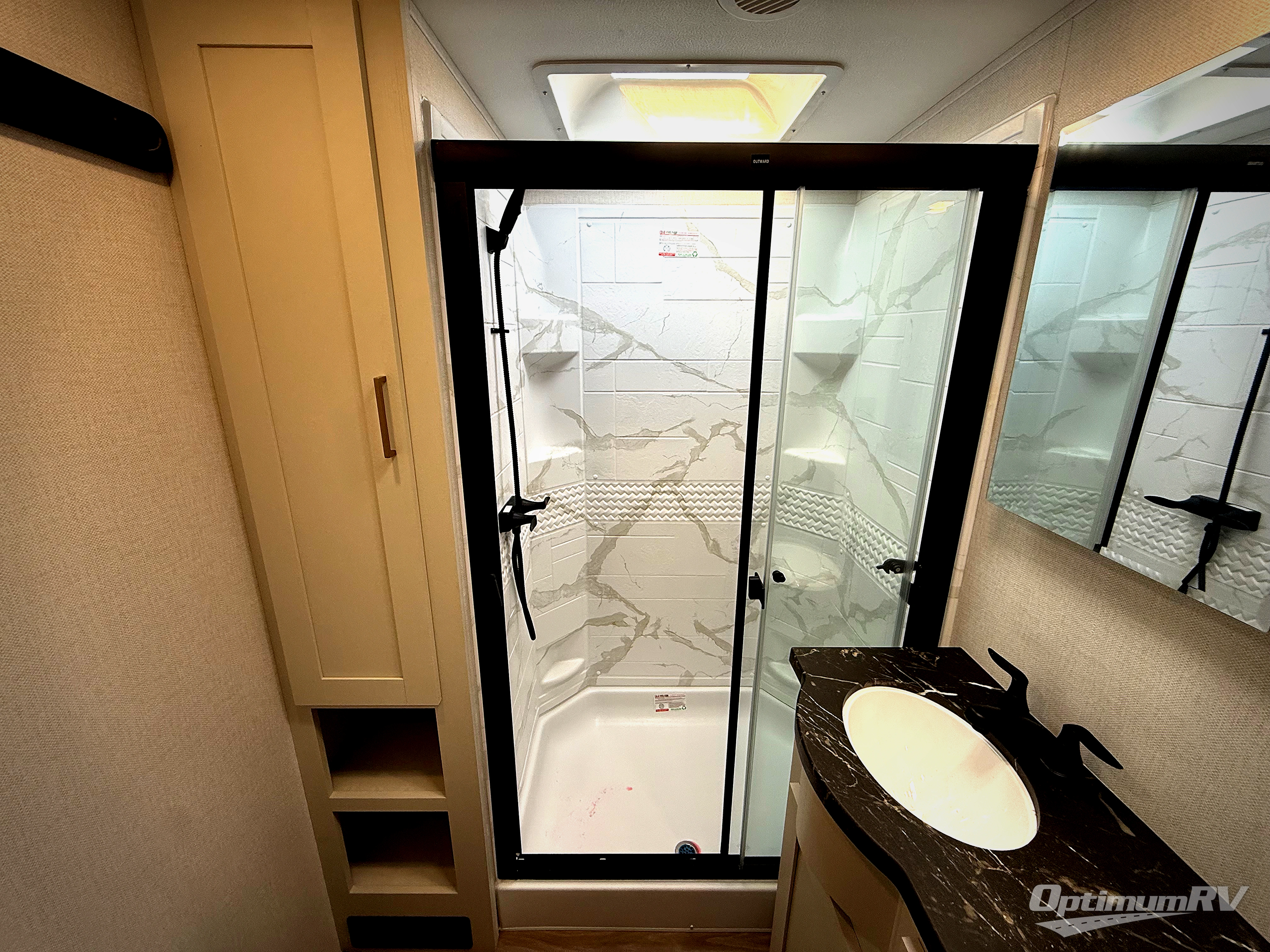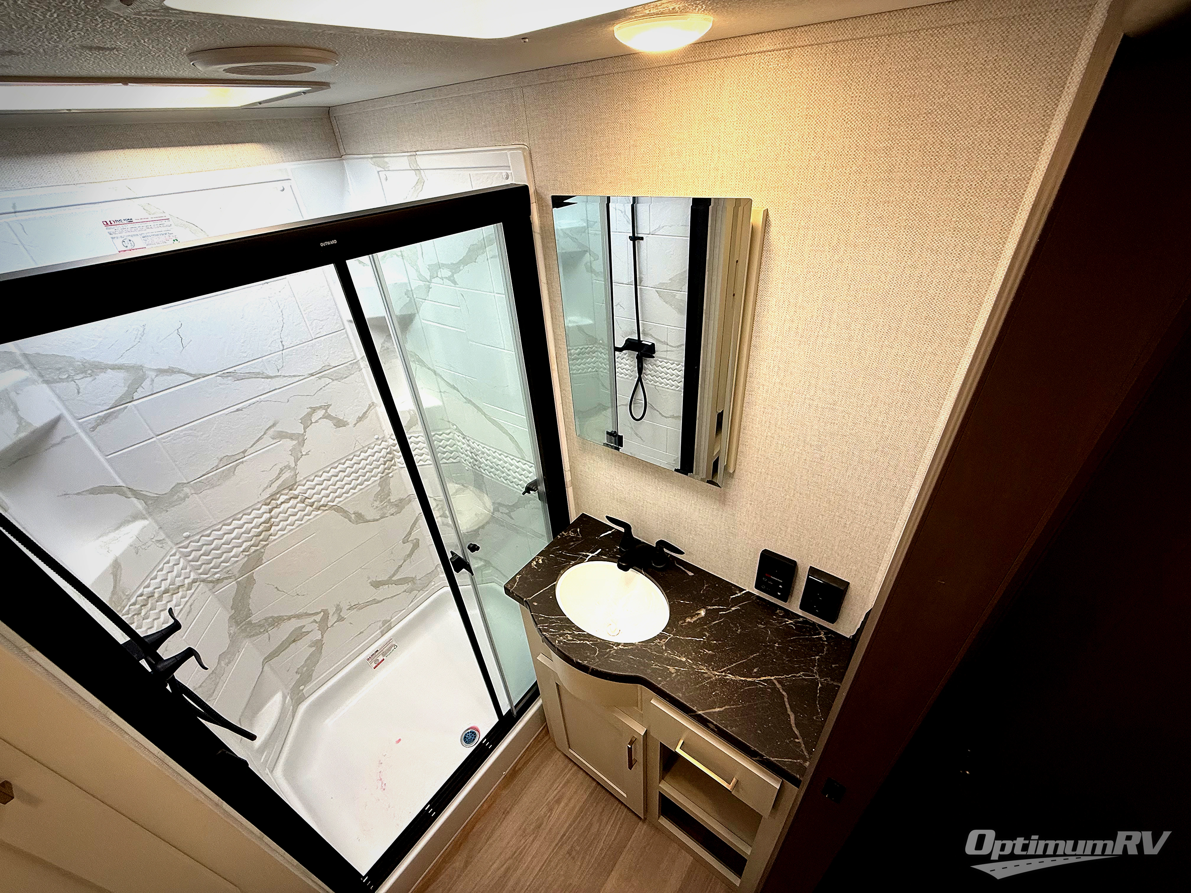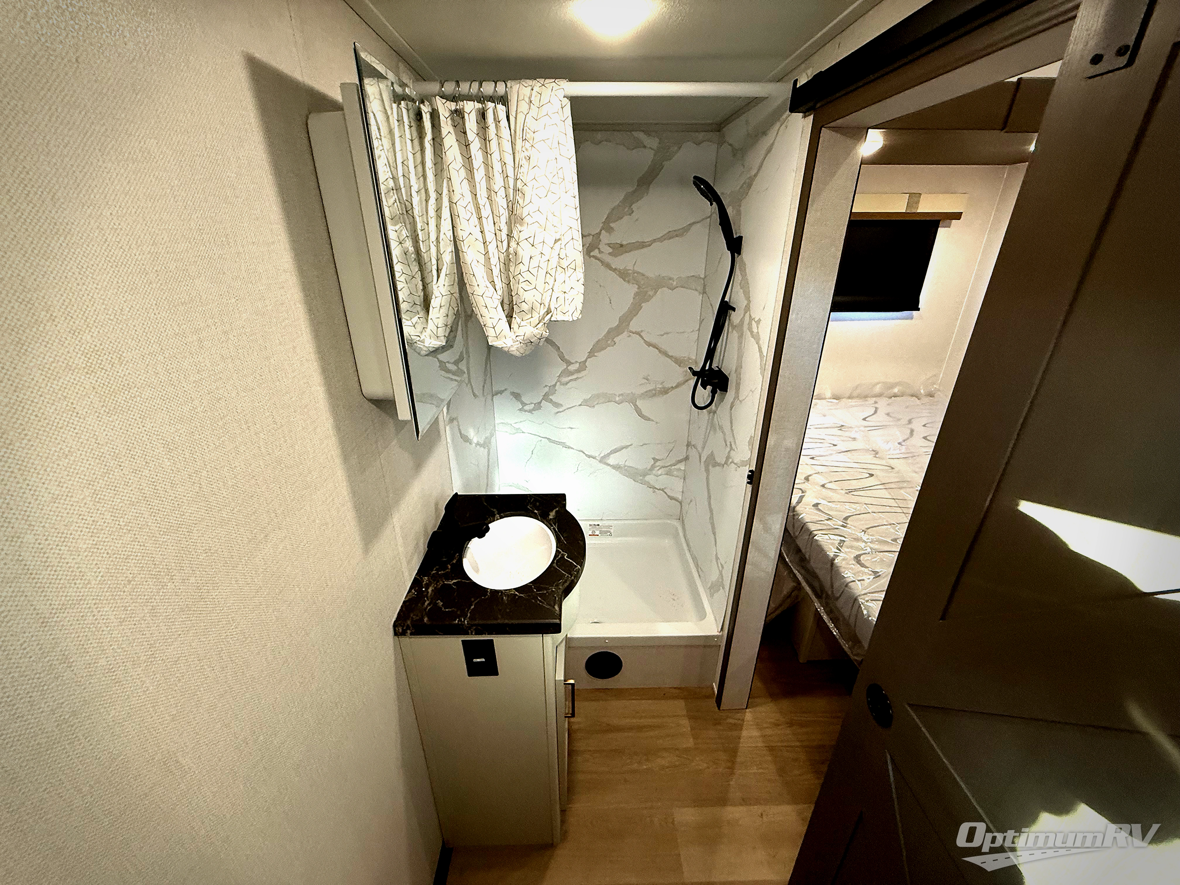 This is the perfect fifth wheel if you enjoy bringing along extra friends and family! You'll have the front private bedroom all to yourselves with a king bed slide out, a dresser with TV prep, plus a large front wardrobe and stackable washer/dryer prep. And a full bath is right next door for easy use. Your guests will love the rear den suite with a power tilt queen bed slide and a desk with a chair. There is also a full rear bath with its own exterior entry door and a loft area for even more sleeping or storage space. In the morning, you can all meet in the combined kitchen and living area that includes dual opposing slides for more space, a kitchen island, and a hutch for additional storage. There is also theater seating in direct view of the 50" TV and fireplace, along with a dinette with four chairs where you can dine together.