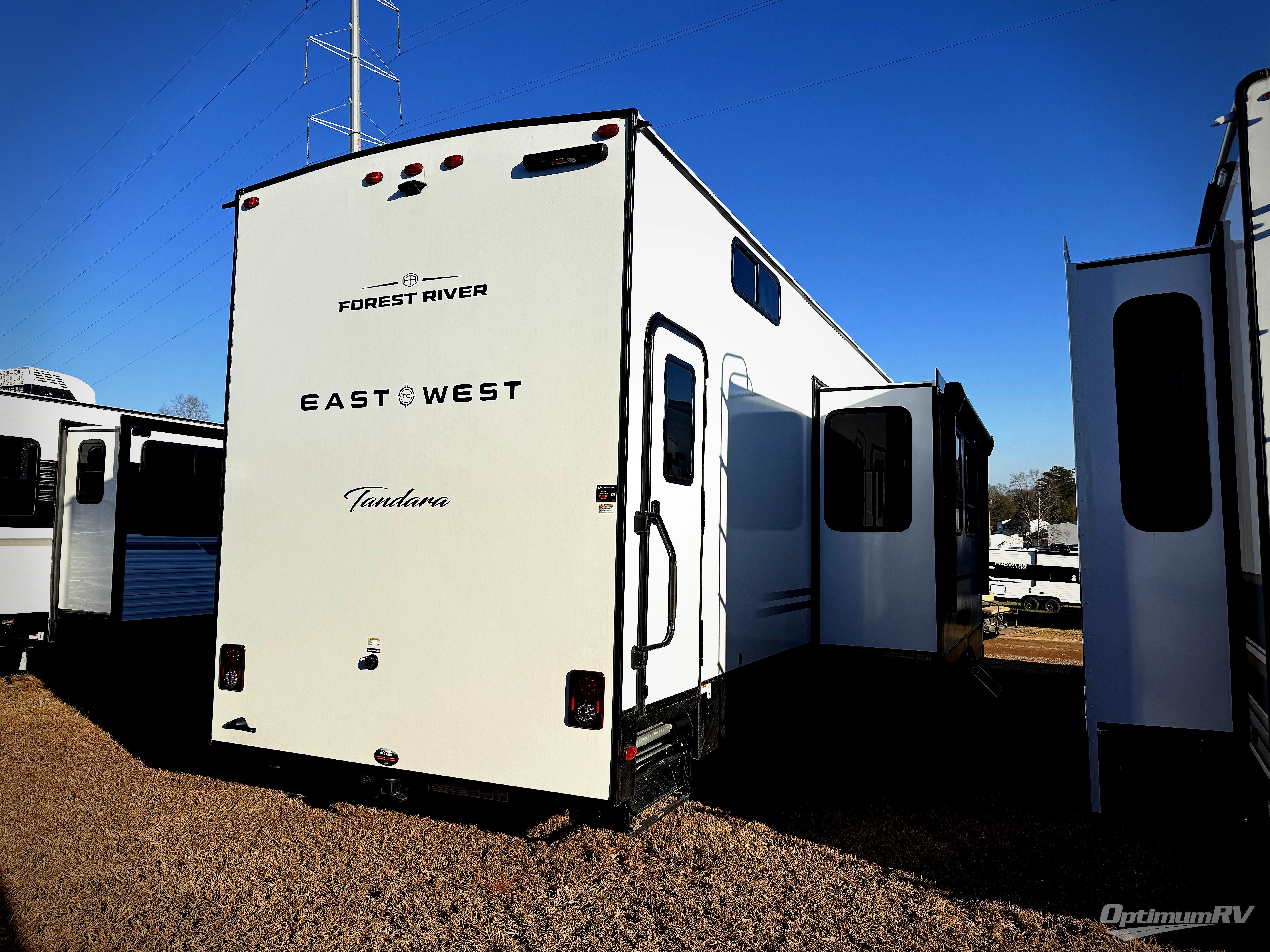 With any Tandara fifth wheel by EAST TO WEST, you will enjoy many standard features to make each trip enjoyable. The Tandara Exterior Luxury Package includes a universal all-in-one docking station, an automatic leveling system, metal slam latch cargo doors, and a 200W solar panel for off-grid capabilities. You will also appreciate the Tandara Climate Package with ductless flooring, dual attic vents, plus a heated and enclosed underbelly for added protection. Inside, you'll find a flush floor kitchen slide, Slow Rise roller shades, solid surface kitchen countertops, and more stand-out features included in the Tandara Interior Luxury Package.