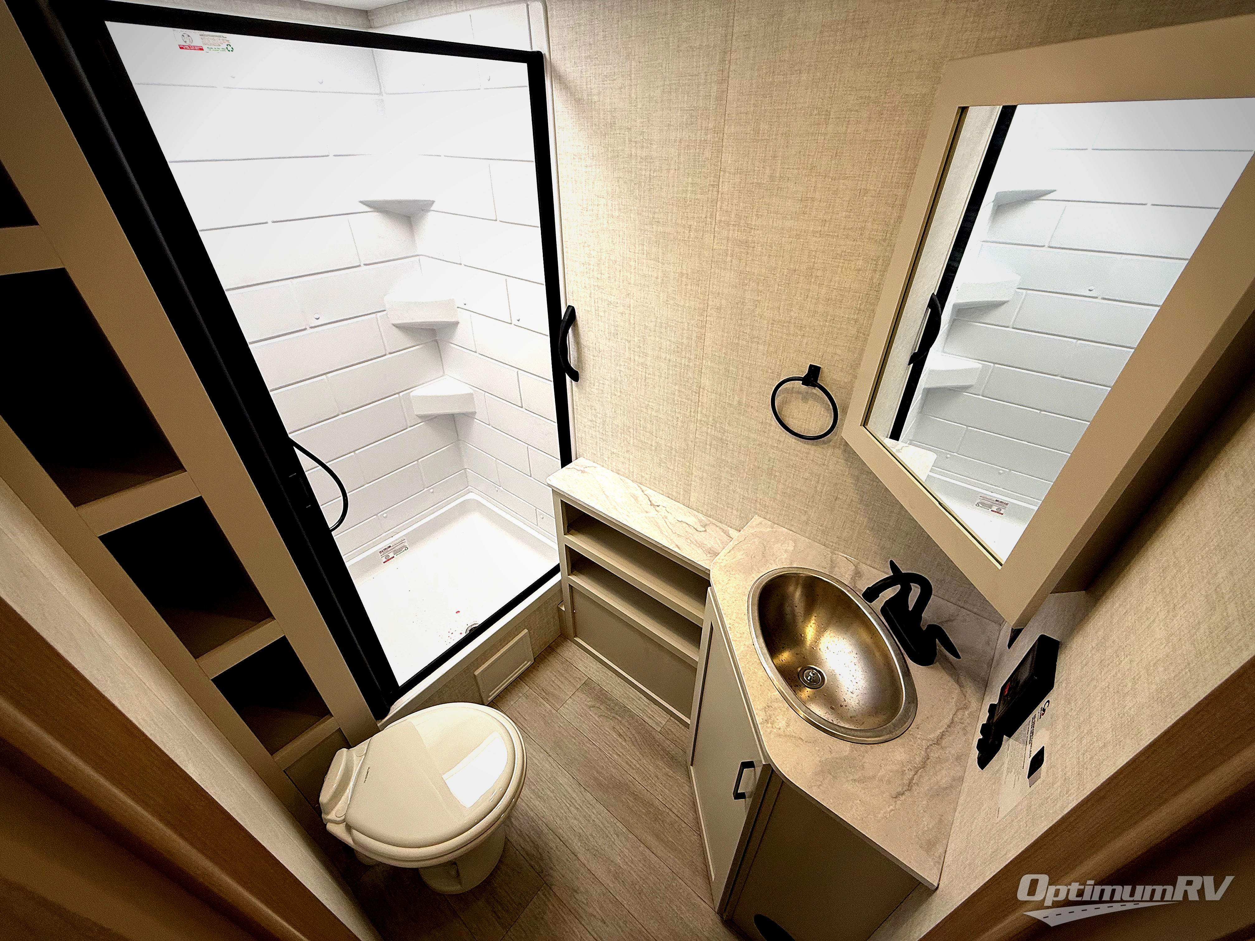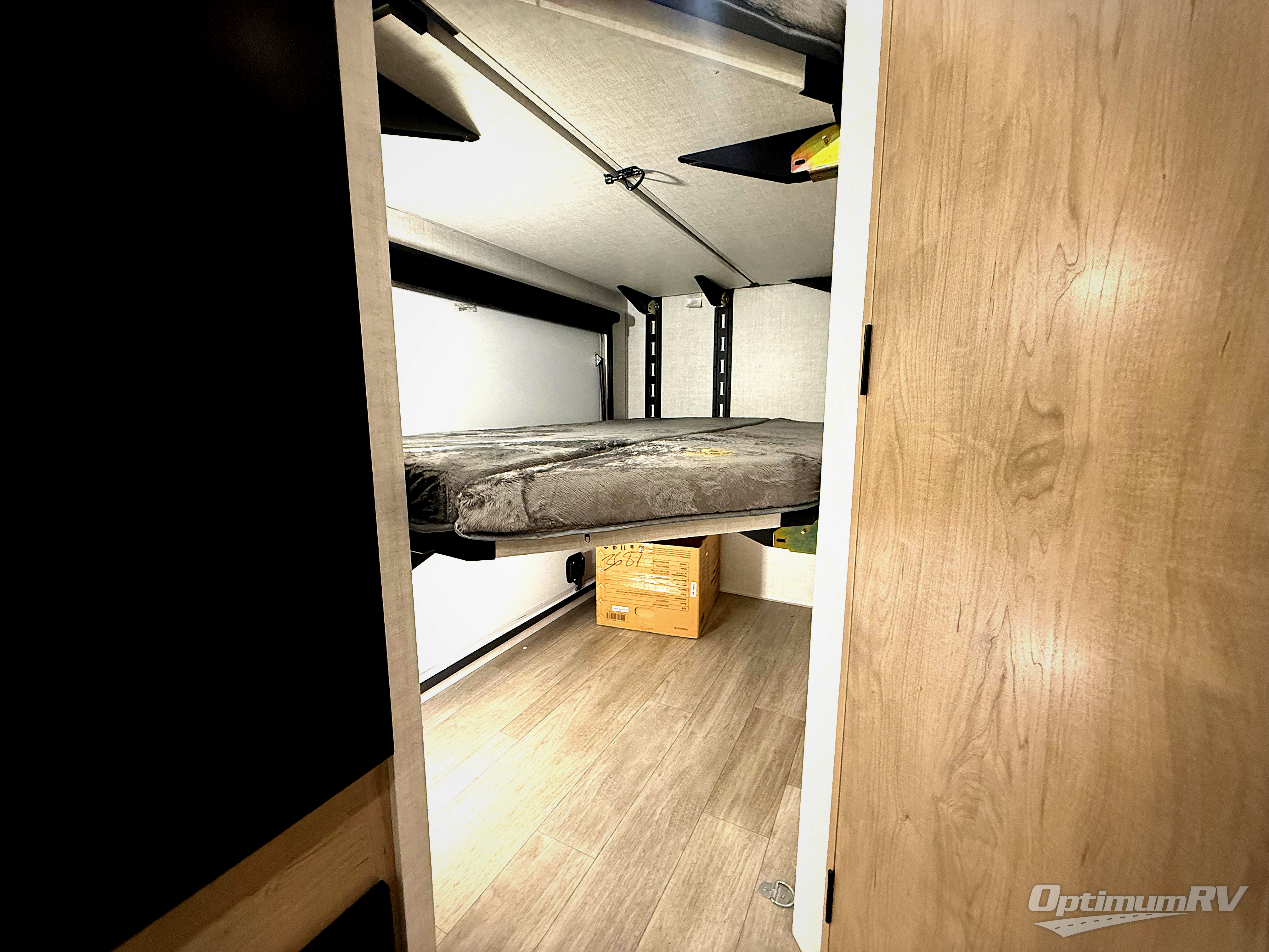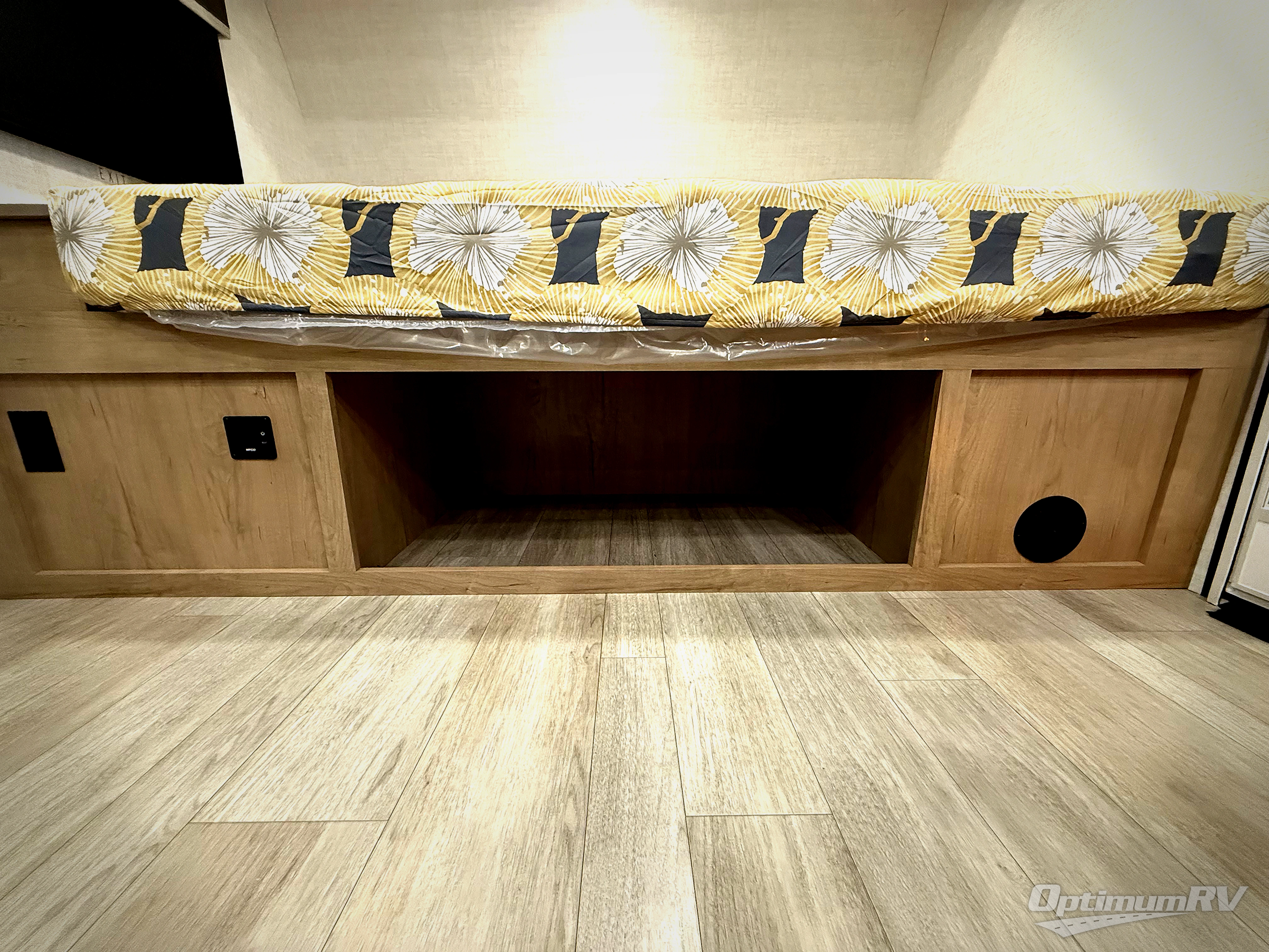 Time at the campground in this travel trailer will be time well spent. Once you arrive at your destination, you can put out the 16' electric awning, unpack the pass-through storage, then head inside for lunch. There is an air fryer convection microwave plus a dual burner cooktop to make meals each day, and the 10 cu. ft. 12V refrigerator will keep your food fresh. A legless dinette slide provides a place to dine together and even let a guest sleep over. If you're not needing the extra sleeping space, just choose the optional theater seating! You'll find the front queen bed will give you a great night's rest, and there is a full bath on board that will allow you to freshen up each morning. This unit includes the patent-pending repositionable EmberTrack E-Track bunk/storage system that allows for multiple single/double bunk configurations, depending on your needs.