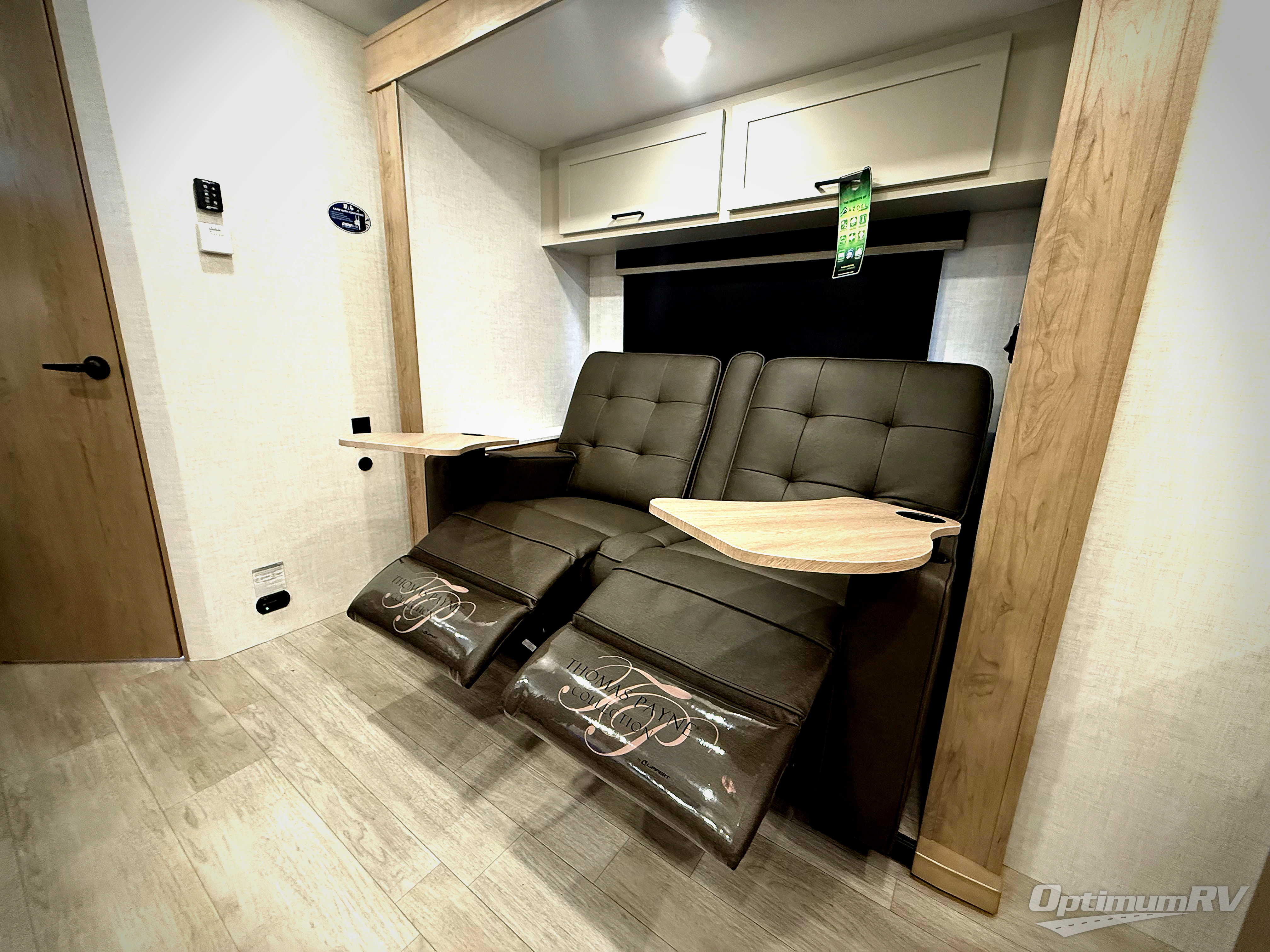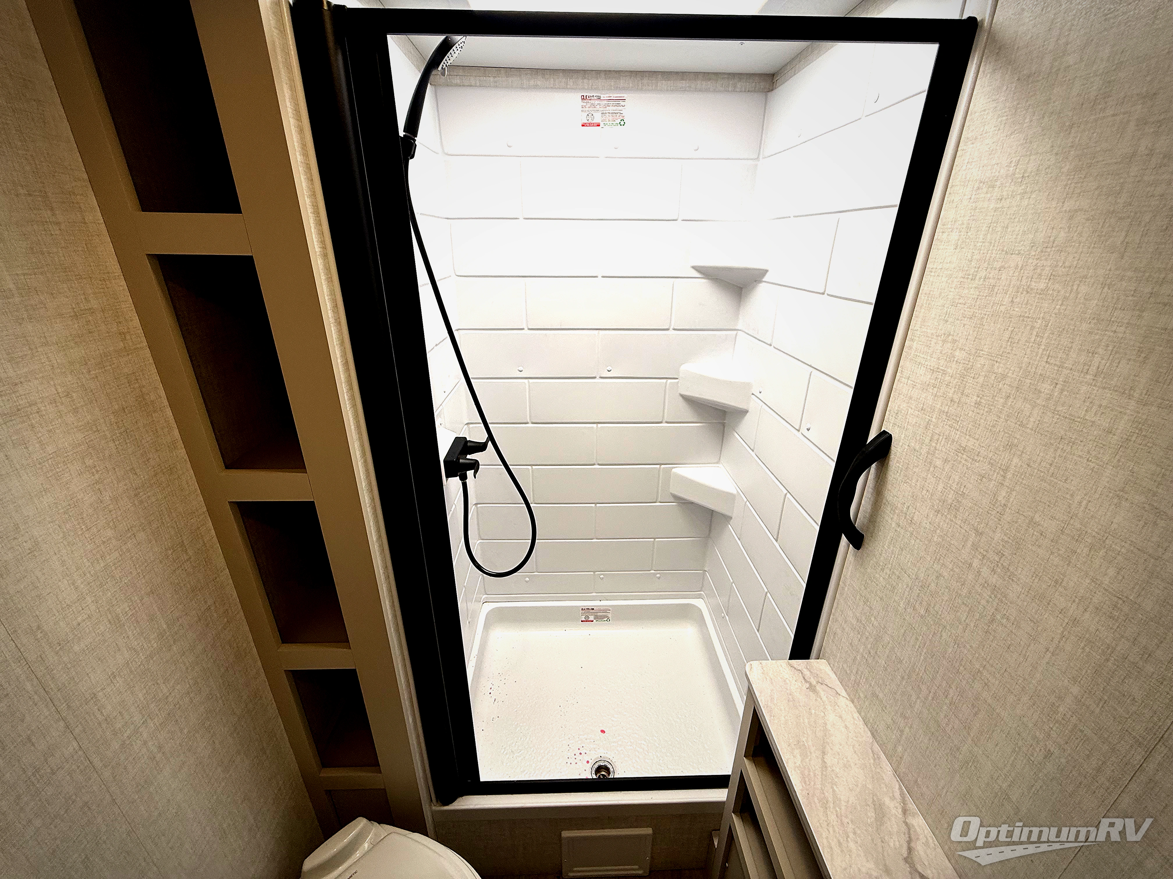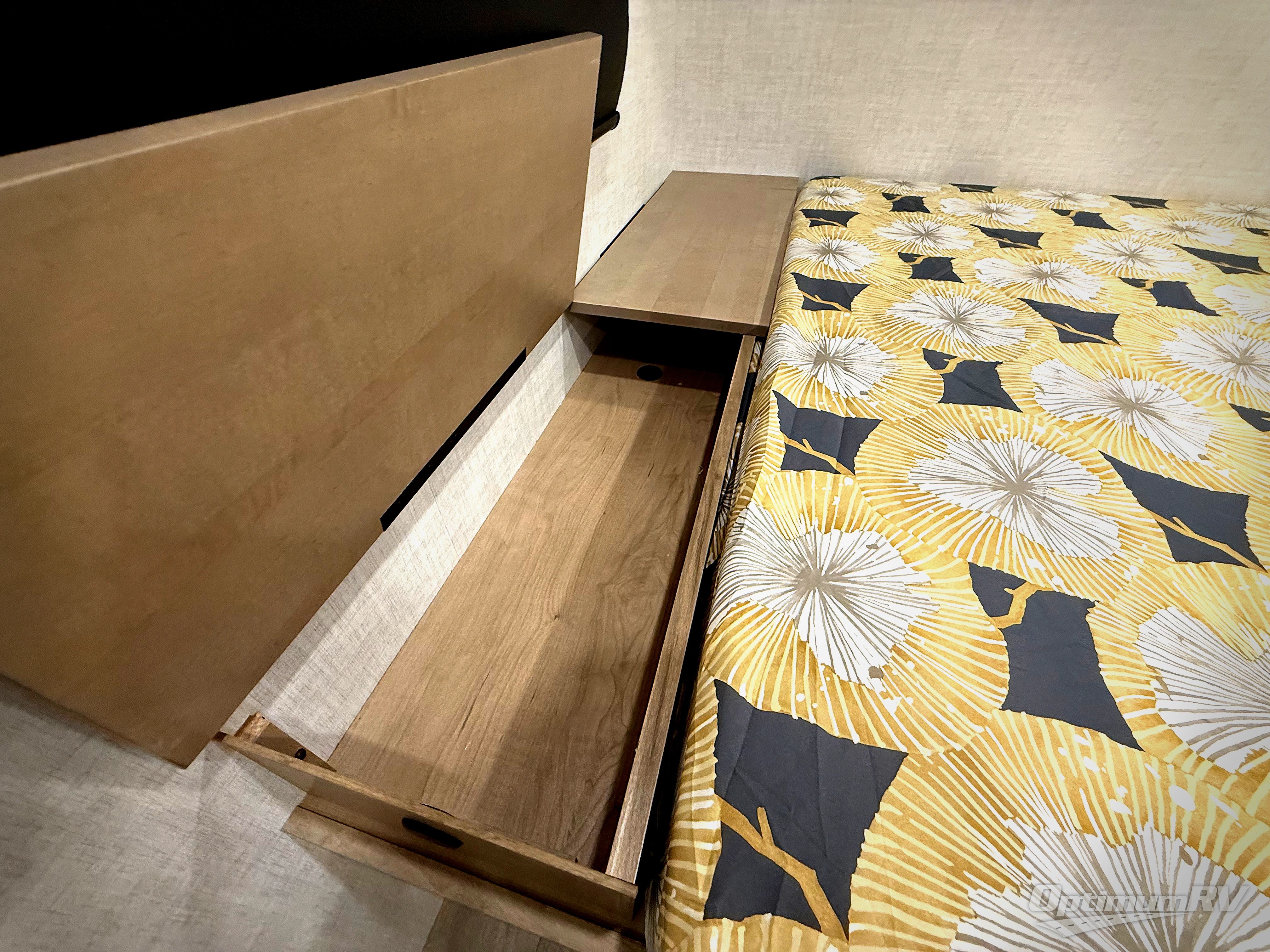Time at the campground in this travel trailer will be time well spent. Once you arrive at your destination, you can put out the 16' electric awning, unpack the pass-through storage, then head inside for lunch. There is an air fryer convection microwave plus a dual burner cooktop to make meals each day, and the 10 cu. ft. 12V refrigerator will keep your food fresh. A legless dinette slide provides a place to dine together and even let a guest sleep over. If you're not needing the extra sleeping space, just choose the optional theater seating! You'll find the front queen bed will give you a great night's rest, and there is a full bath on board that will allow you to freshen up each morning. This unit includes the patent-pending repositionable EmberTrack E-Track bunk/storage system that allows for multiple single/double bunk configurations, depending on your needs.