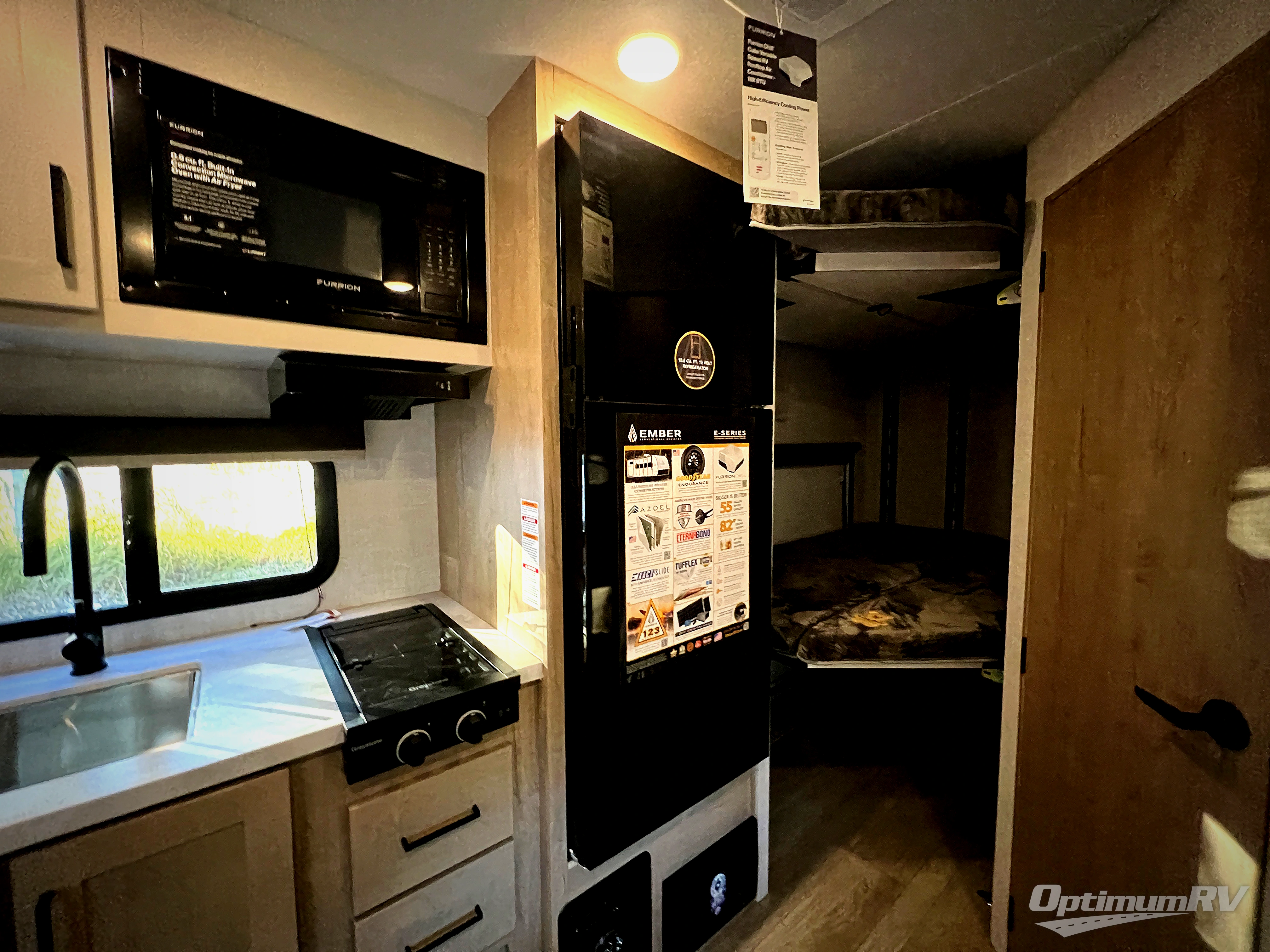 Time at the campground in this travel trailer will be time well spent. Once you arrive at your destination, you can put out the 16' electric awning, unpack the pass-through storage, then head inside for lunch. There is an air fryer convection microwave plus a dual burner cooktop to make meals each day, and the 10 cu. ft. 12V refrigerator will keep your food fresh. A legless dinette slide provides a place to dine together and even let a guest sleep over. If you're not needing the extra sleeping space, just choose the optional theater seating! You'll find the front queen bed will give you a great night's rest, and there is a full bath on board that will allow you to freshen up each morning. This unit includes the patent-pending repositionable EmberTrack E-Track bunk/storage system that allows for multiple single/double bunk configurations, depending on your needs.