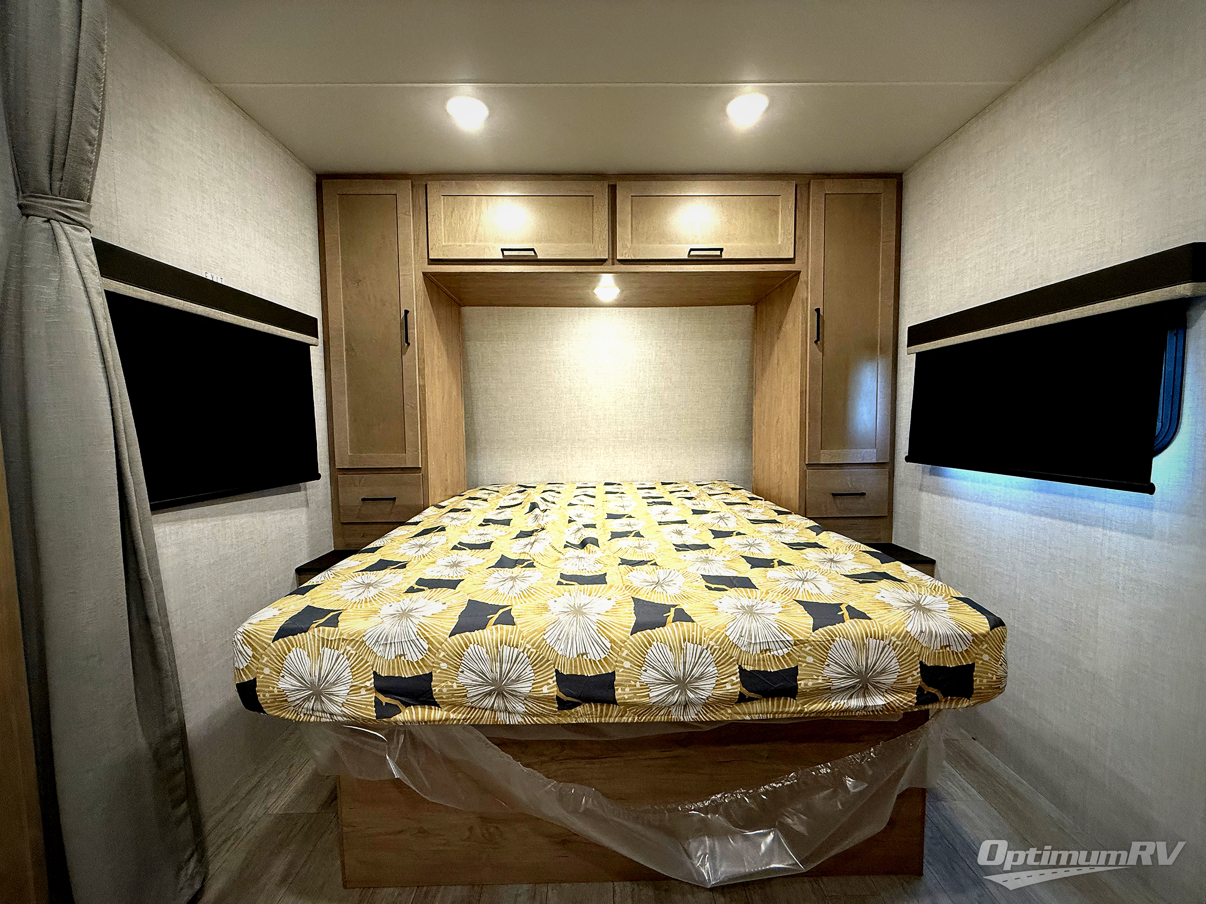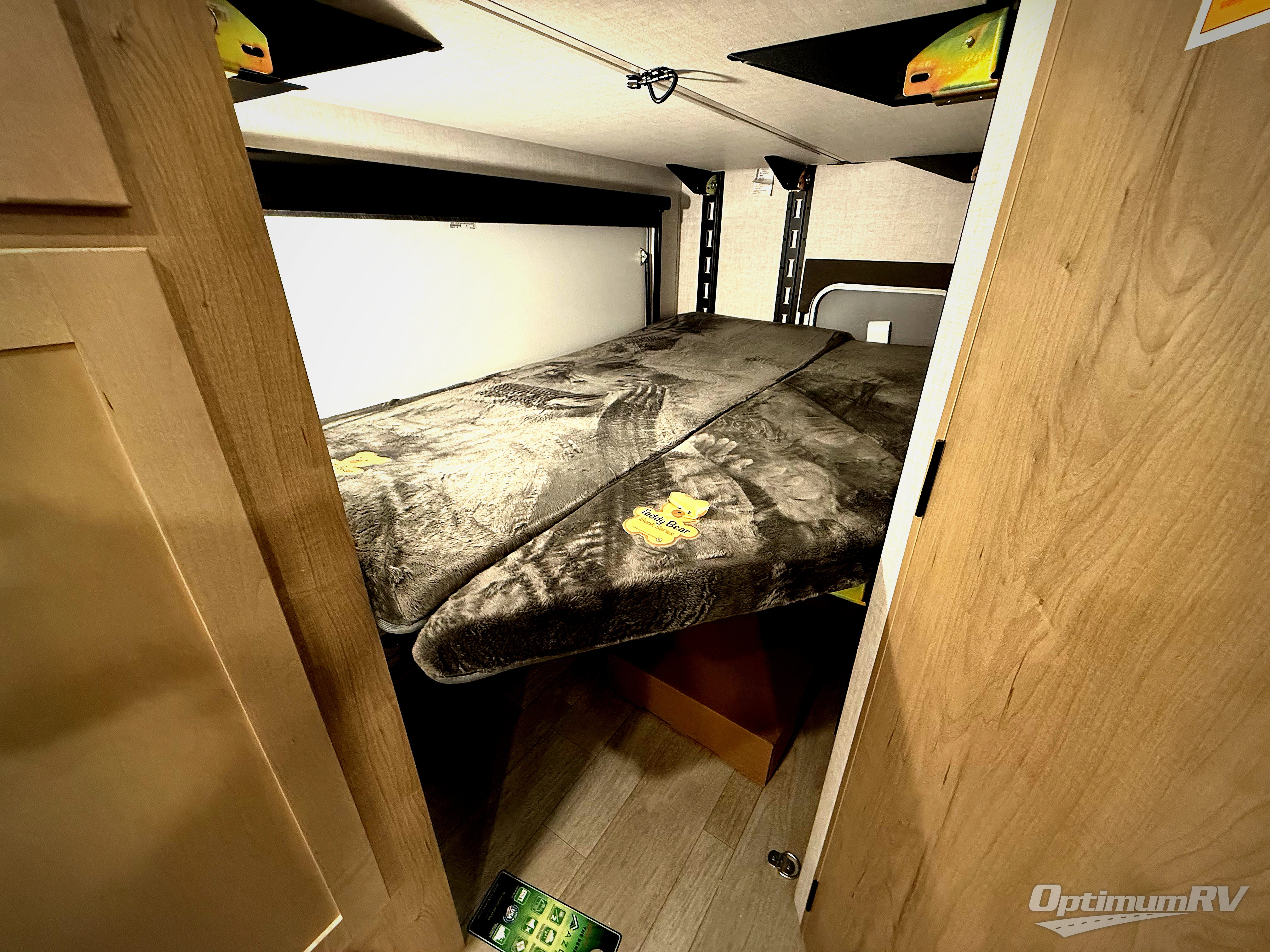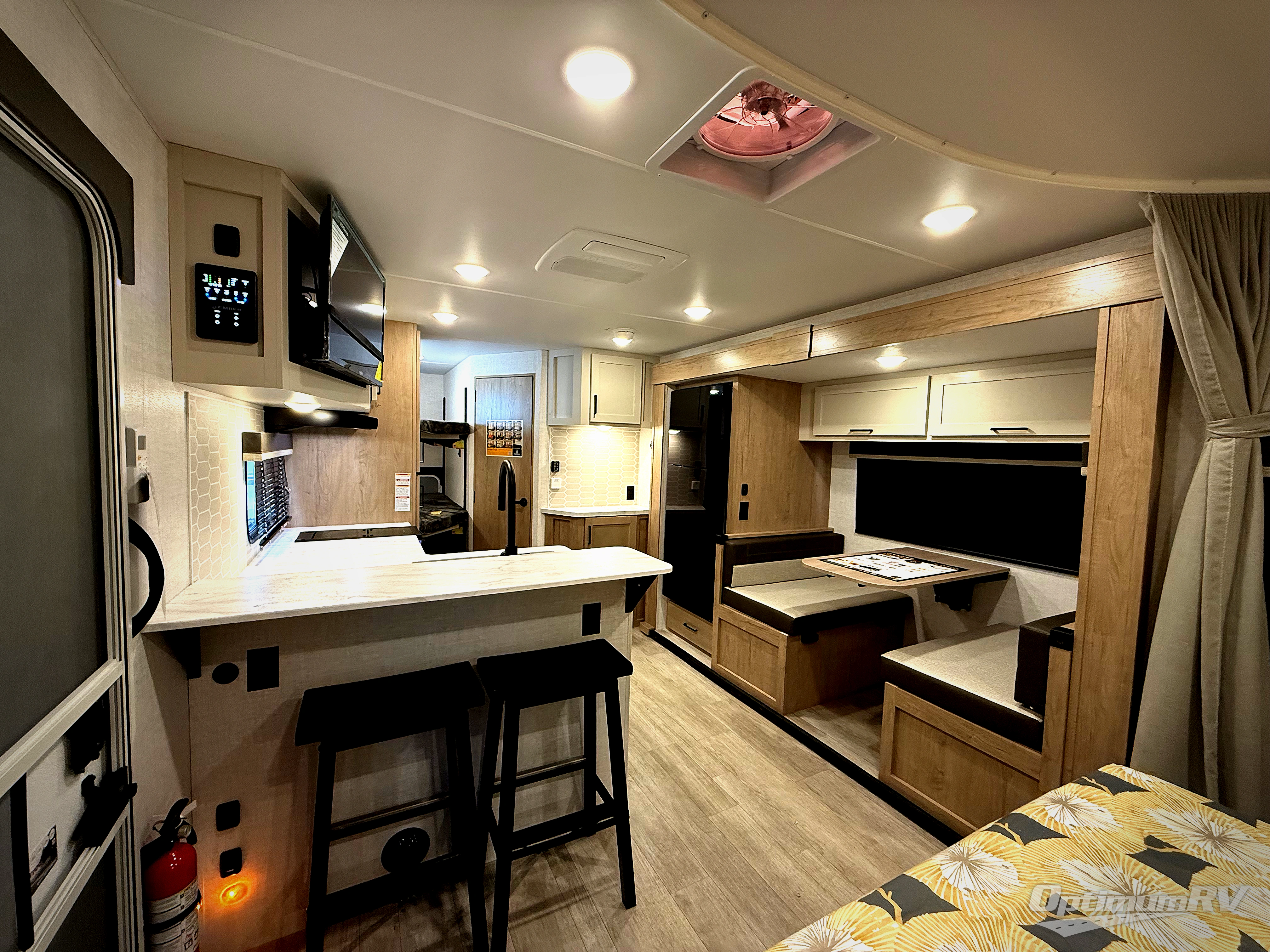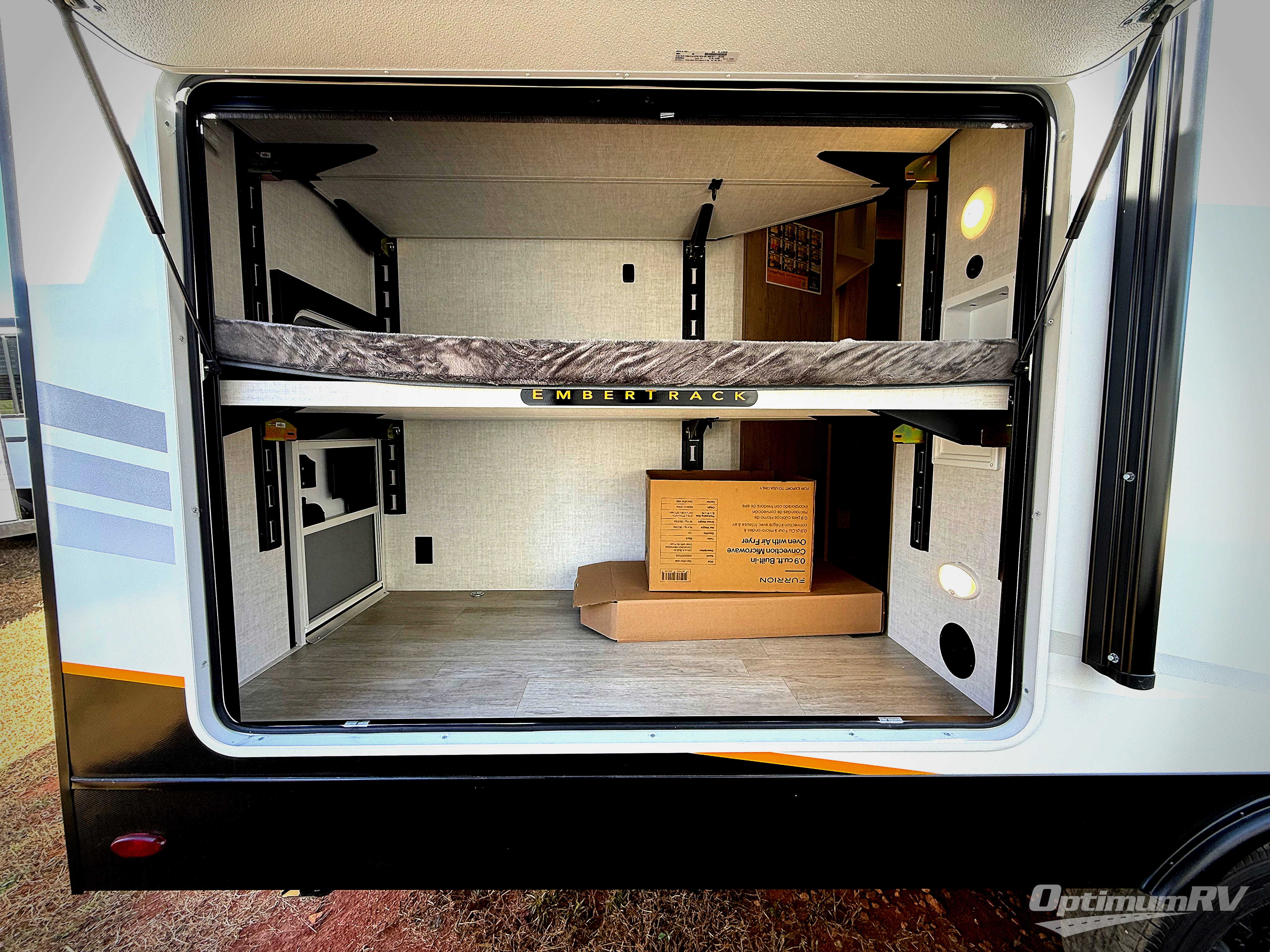 You'll love every minute spent in this spacious travel trailer that can sleep up to six. The patent-pending repositionable EmberTrack E-Track bunk/storage system includes 74" x 45" cargo space, and there are multiple single/double bunk configurations to fit your needs. The front walk-around true residential queen bed includes dual nightstands and dual wardrobes, plus a privacy curtain if you have guests staying over. This E-Series kitchen includes an air fryer convection microwave, a two burner cooktop, plus a breakfast bar with bar stools so you can visit with the chef as they cook meals. A legless dinette or optional theater seating will provide a place to dine, or you can take your plate outdoors to sit under the 14' power awning with a dimmable LED light. You'll also find a pass-through storage outside, along with a docking station and a kayak/bike storage door!