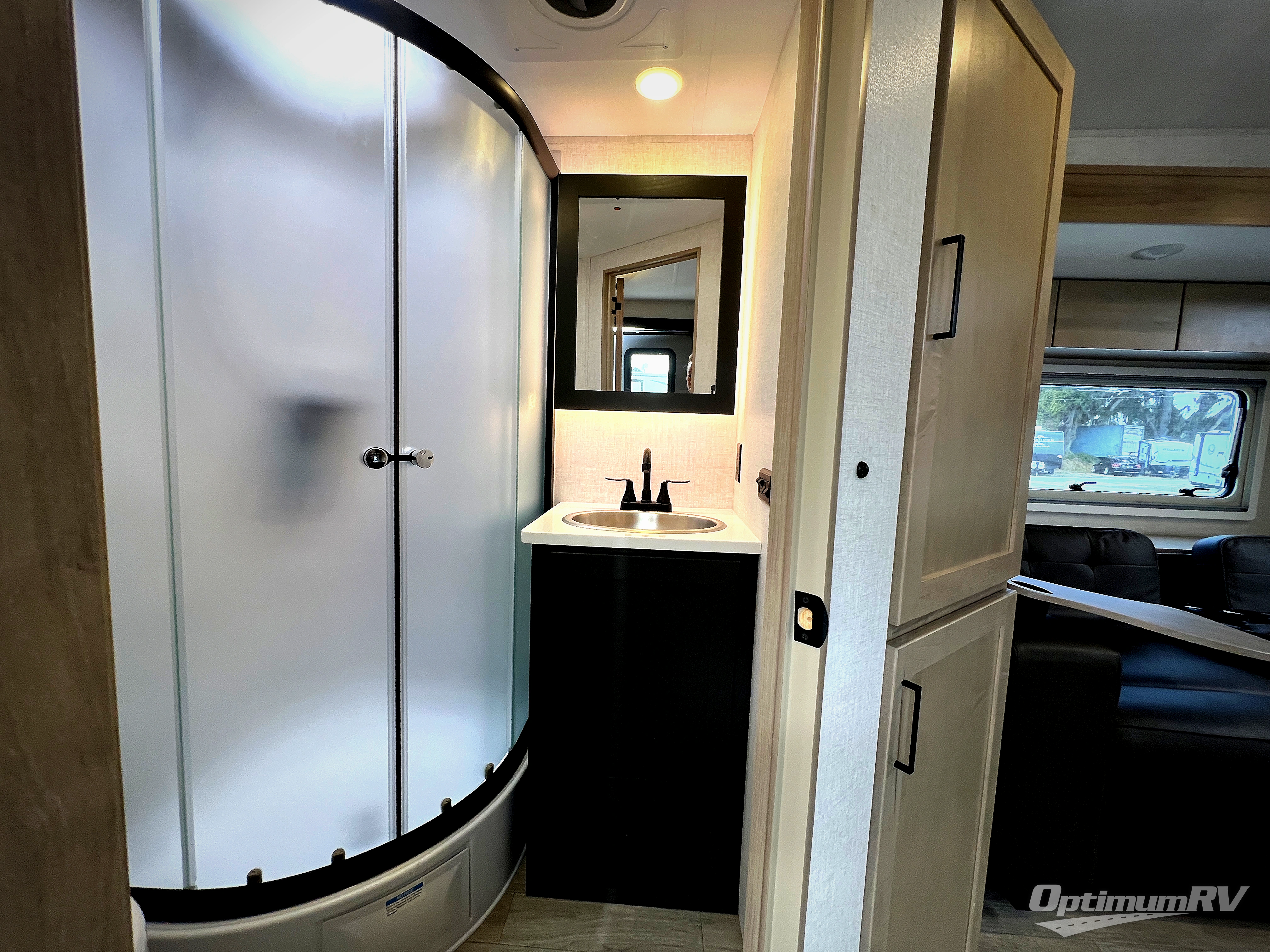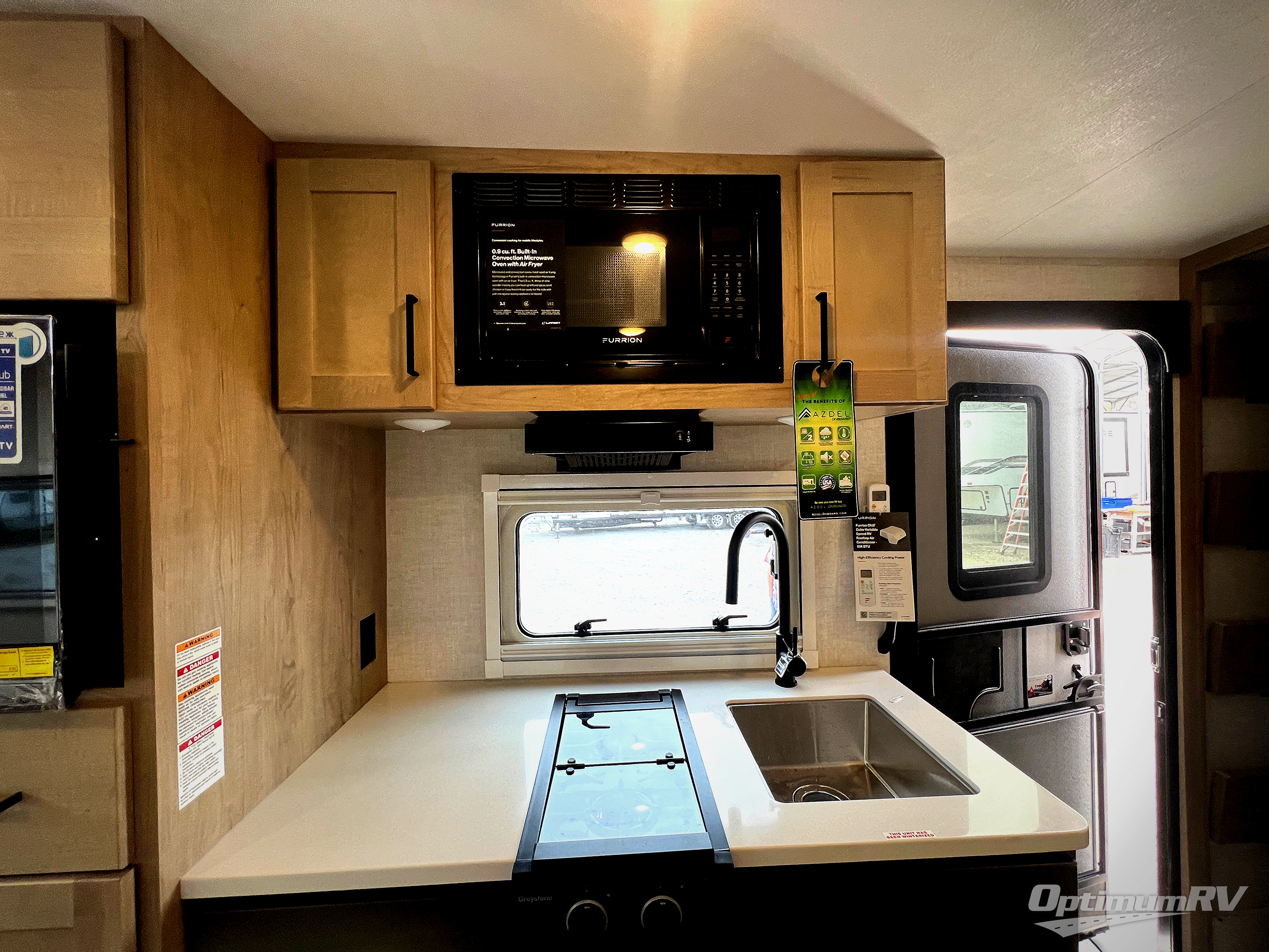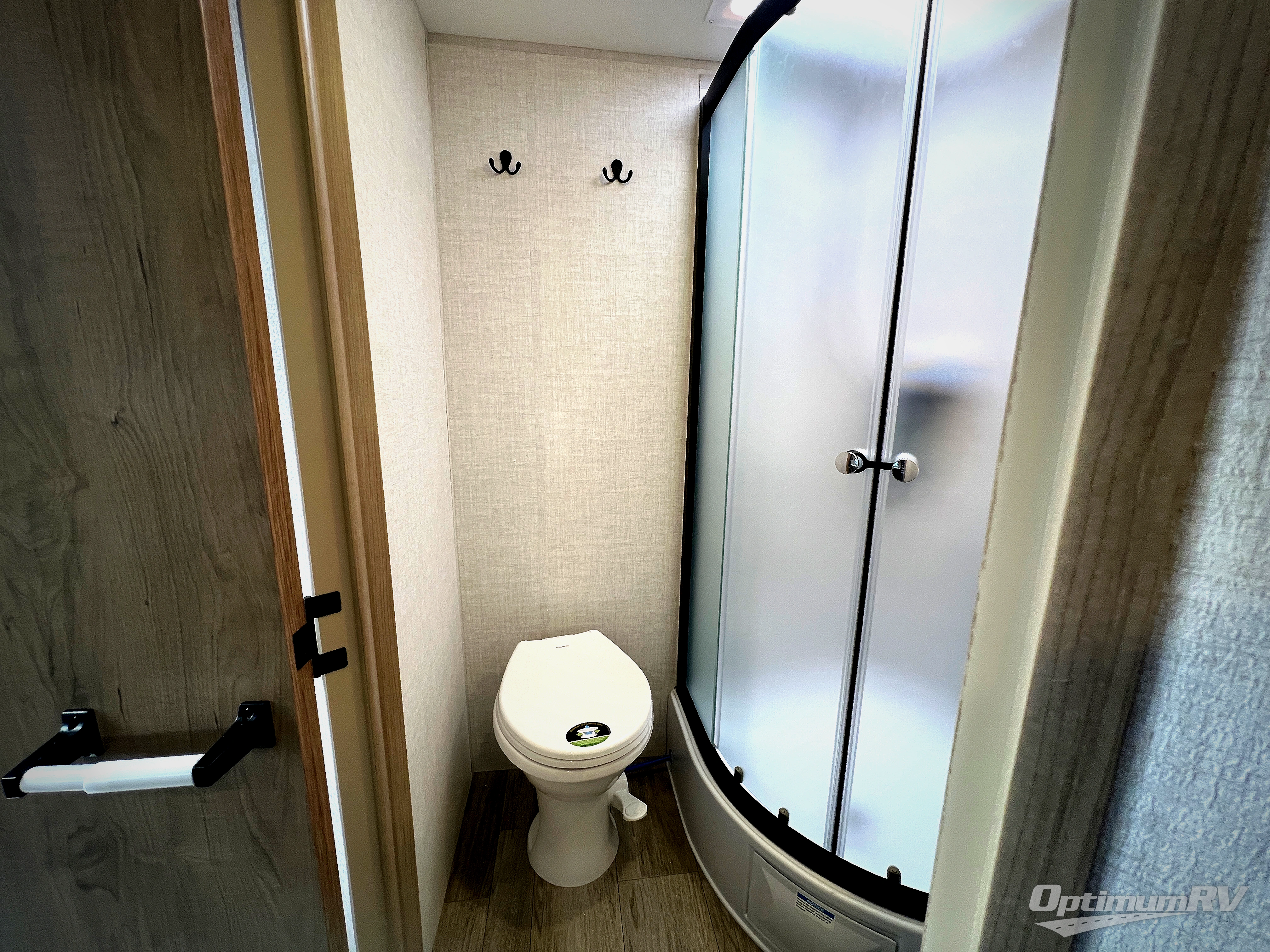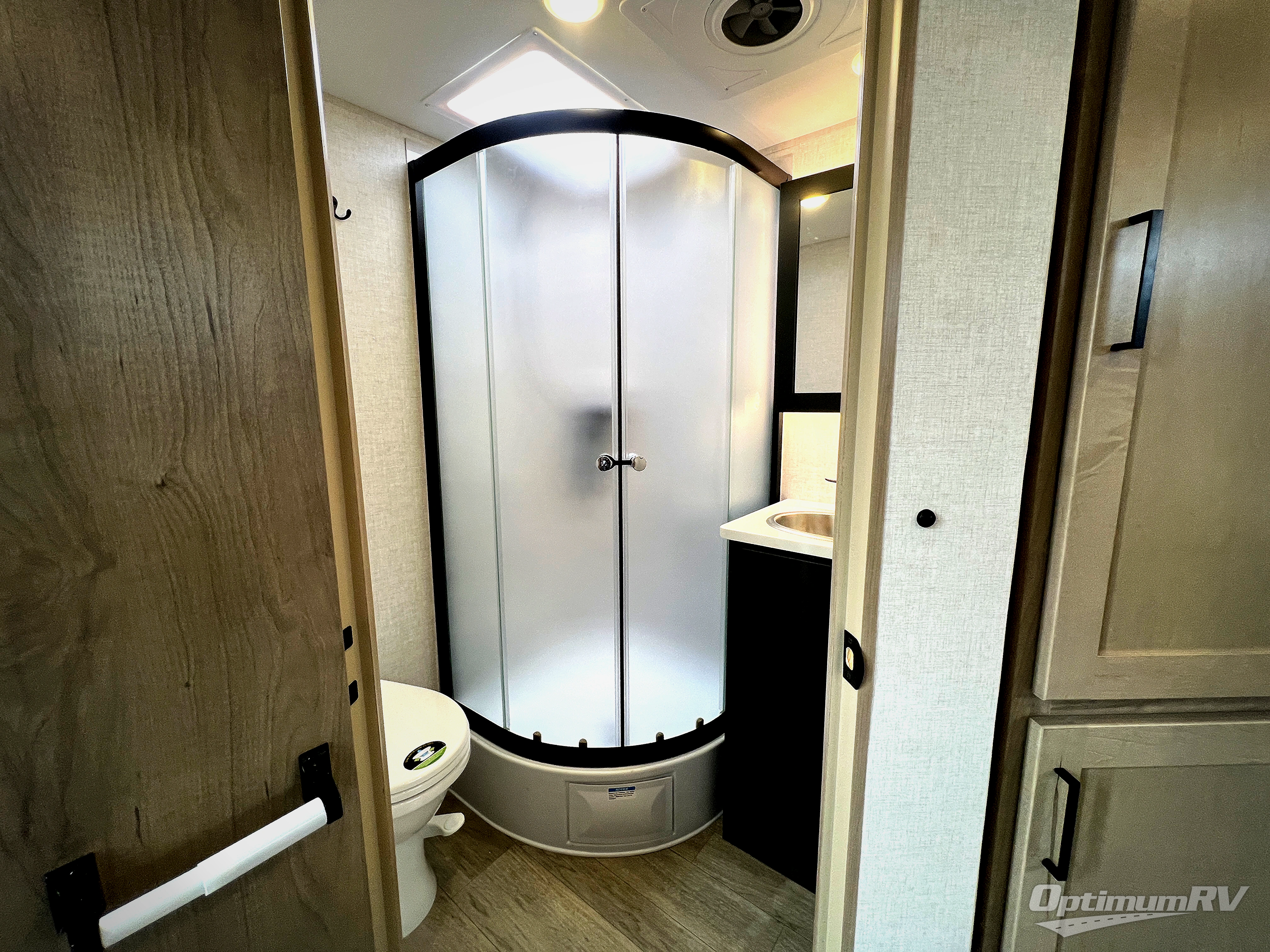 Head to your favorite campgrounds in this travel trailer! It features a front queen bed to lay your head on at night with nightstands and wardrobes on either side, plus an additional wardrobe and another hidden wardrobe behind the 12V HDTV/AV system on hinge. Prepare your best home cooked meals with the two burner cooktop and enjoy them at the jackknife sofa slide with a removable table. Behind the sofa are dual storage cubbies to keep your items out of the way too. With two pantries, you can bring all of your favorite snacks. You also have a rear corner bathroom with a 32" radius shower to rinse the sand out of your hair after a fun day at the beach!
