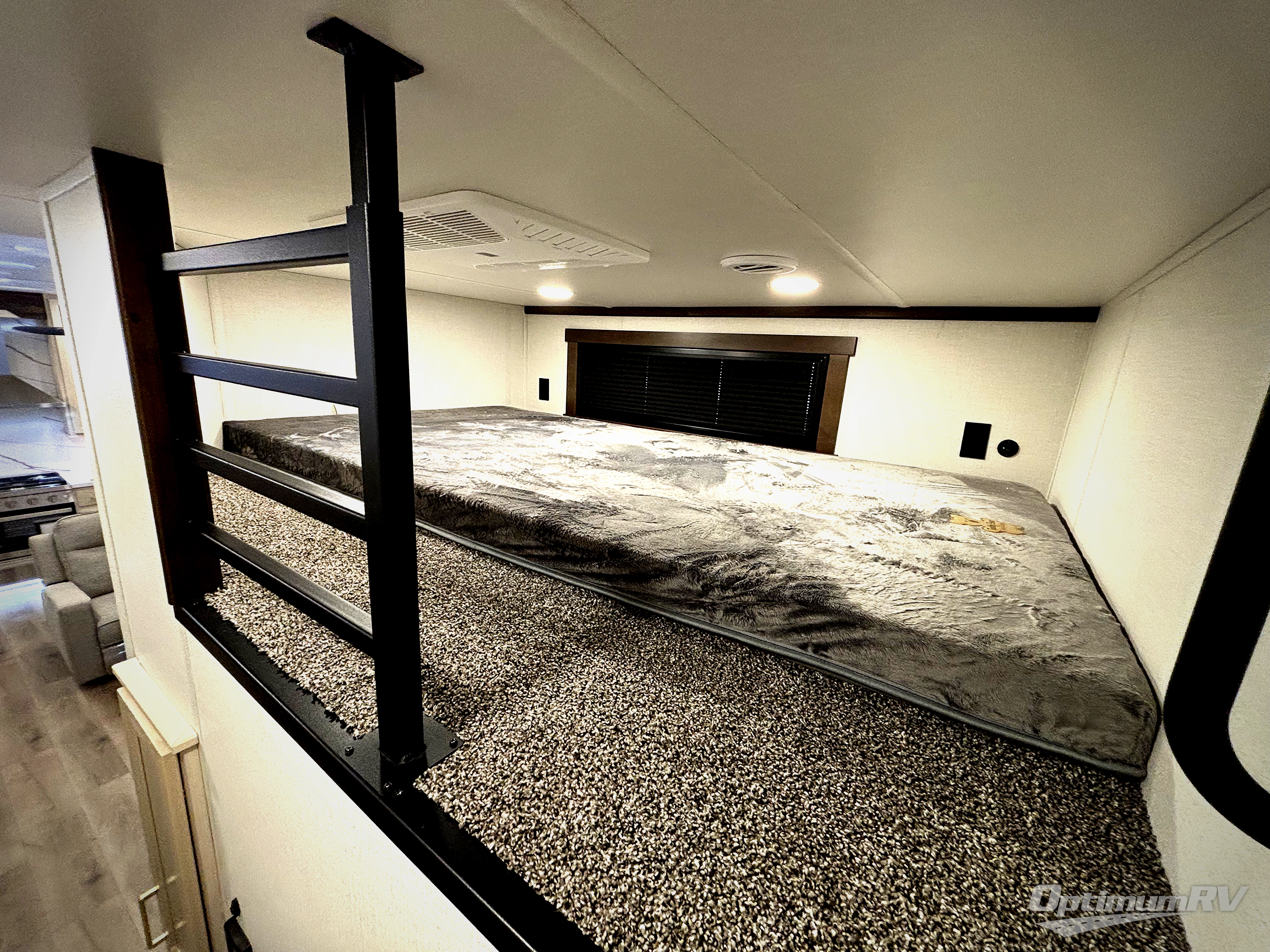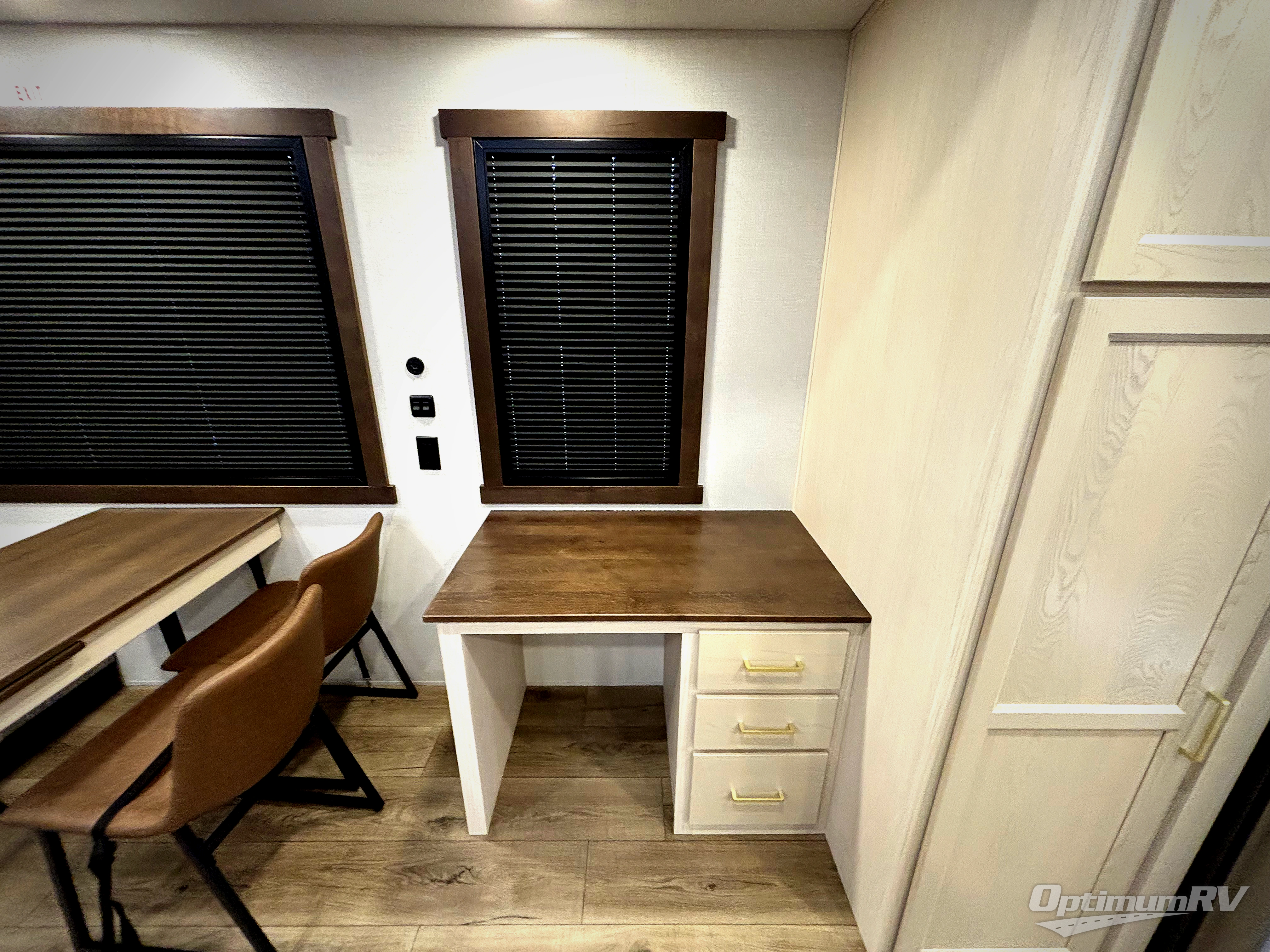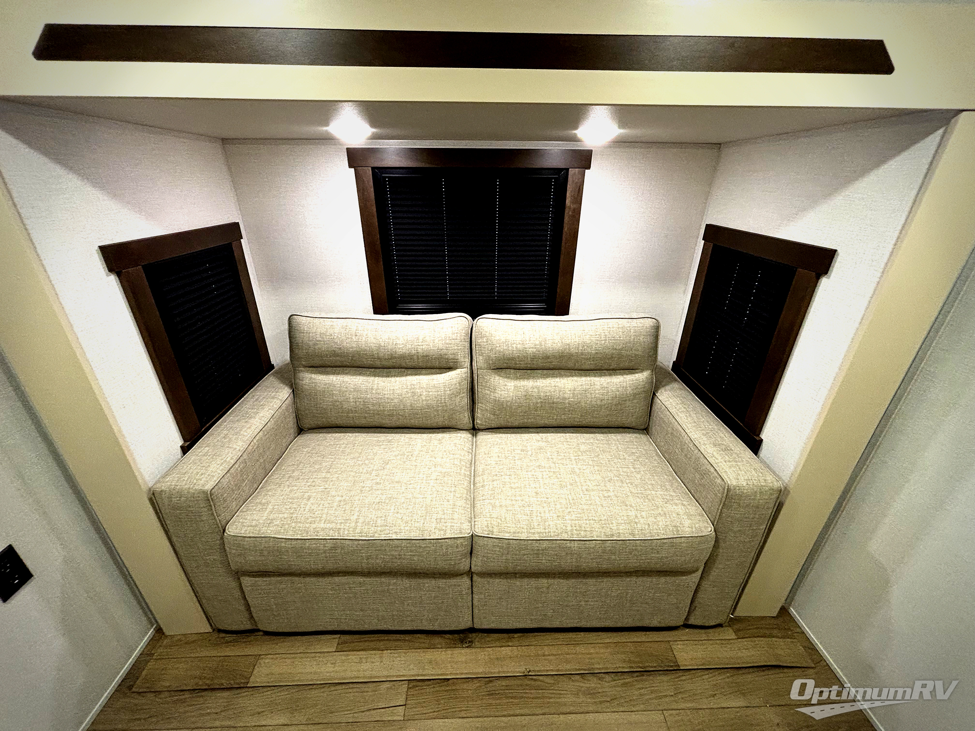 A front kitchen with ample counter space, a middle den, and a front bedroom make this fifth wheel one to remember! The living area will be a favorite spot to visit together since there is a hide-a-bed sofa and theater seating, plus an entertainment center with a fireplace. There is also a free-standing dining table and a desk with a chair if you need to telecommute. Your guests will love the middle den with a hide-a-bed sofa and a closet for their things, plus there is a loft above this room for added sleeping or storage space. A spacious full bath includes a shower with a seat, and the king bed slide out in the front private bedroom is sure to bring a great night's rest.