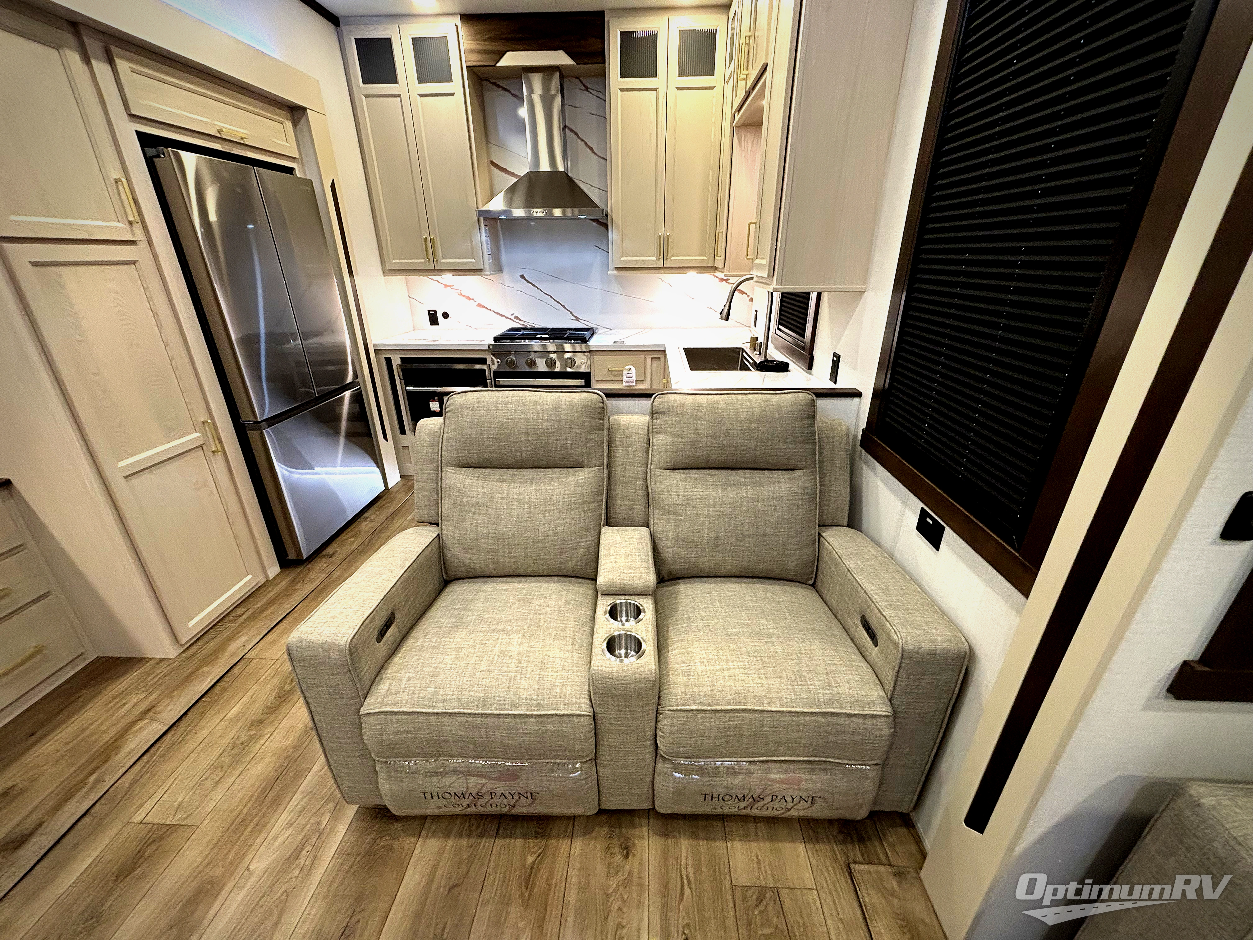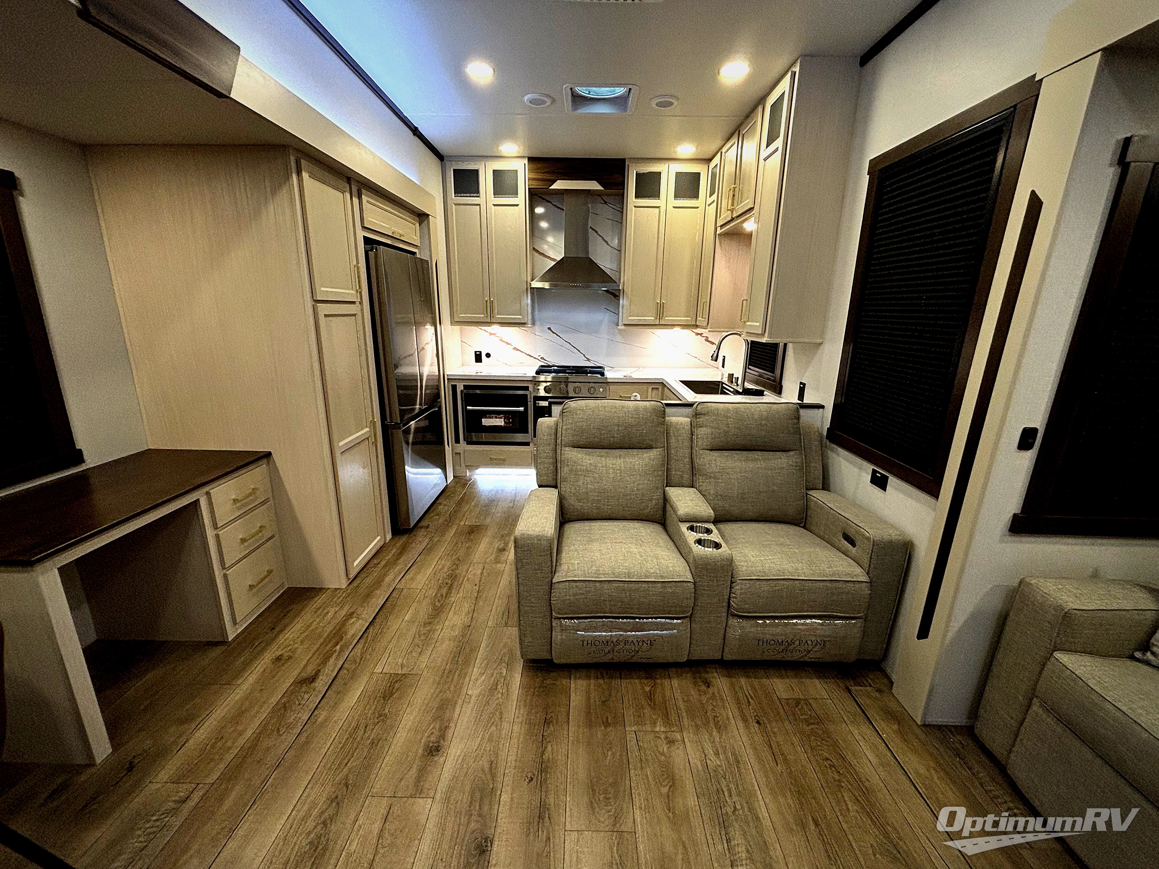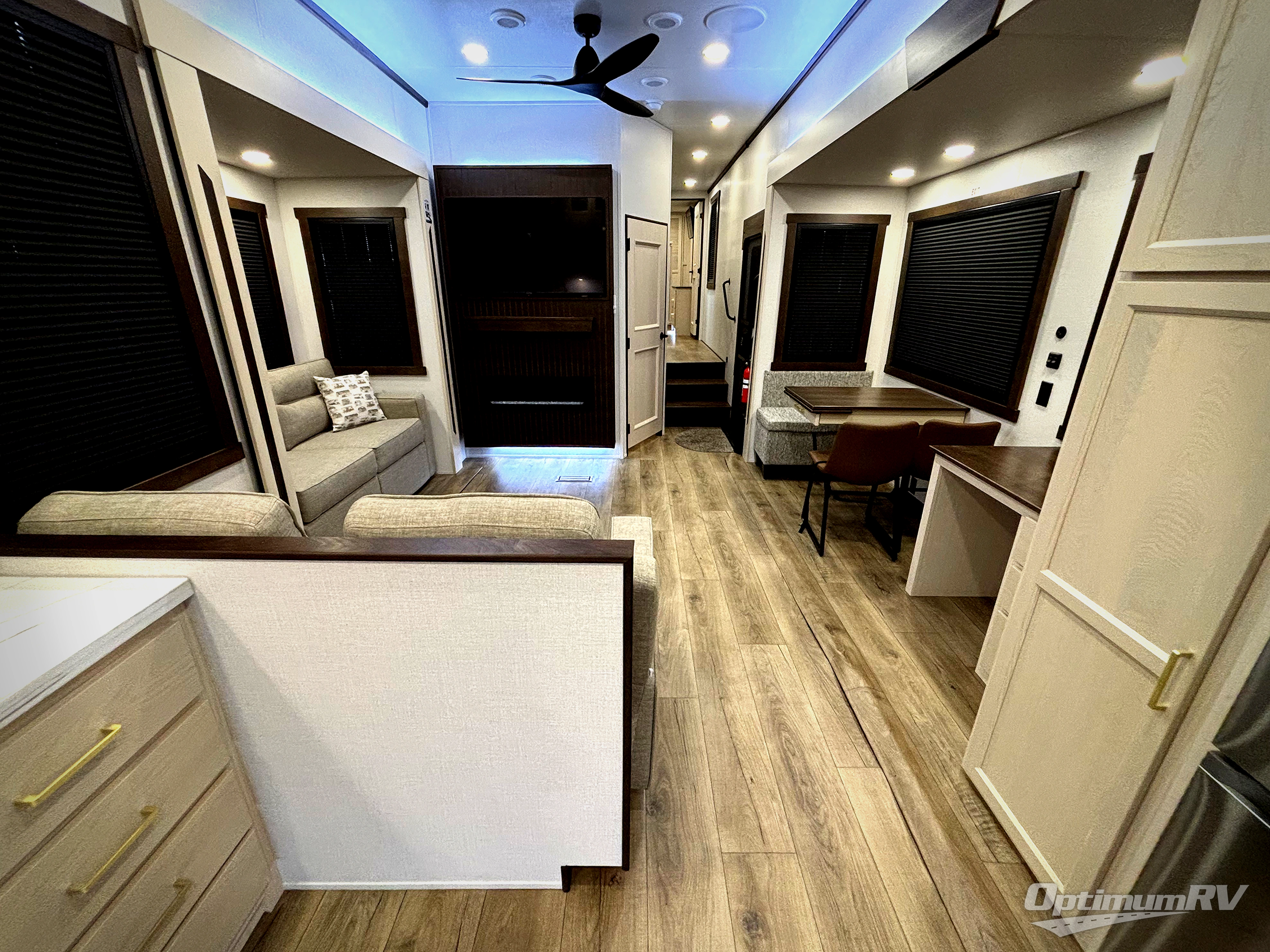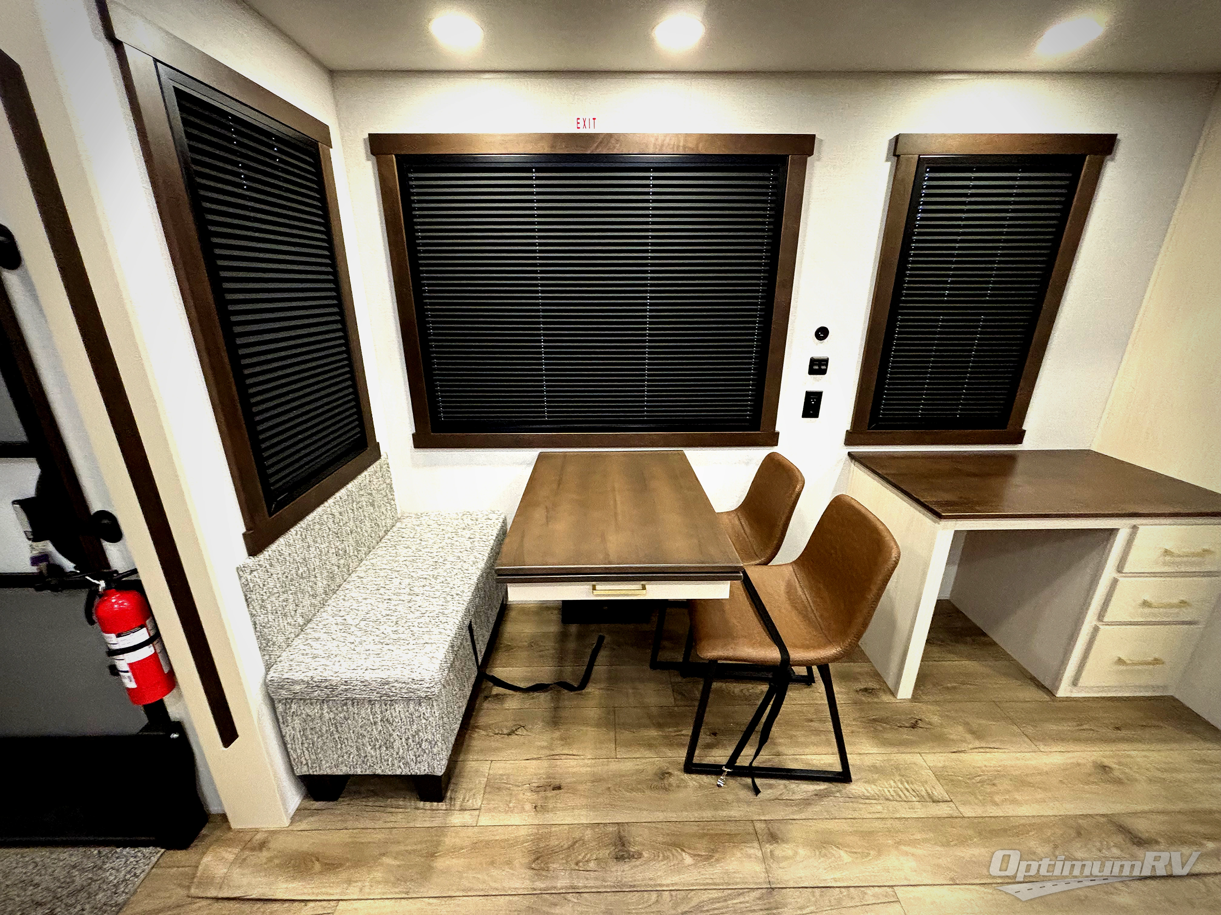 A front kitchen with ample counter space, a middle den, and a front bedroom make this fifth wheel one to remember! The living area will be a favorite spot to visit together since there is a hide-a-bed sofa and theater seating, plus an entertainment center with a fireplace. There is also a free-standing dining table and a desk with a chair if you need to telecommute. Your guests will love the middle den with a hide-a-bed sofa and a closet for their things, plus there is a loft above this room for added sleeping or storage space. A spacious full bath includes a shower with a seat, and the king bed slide out in the front private bedroom is sure to bring a great night's rest.