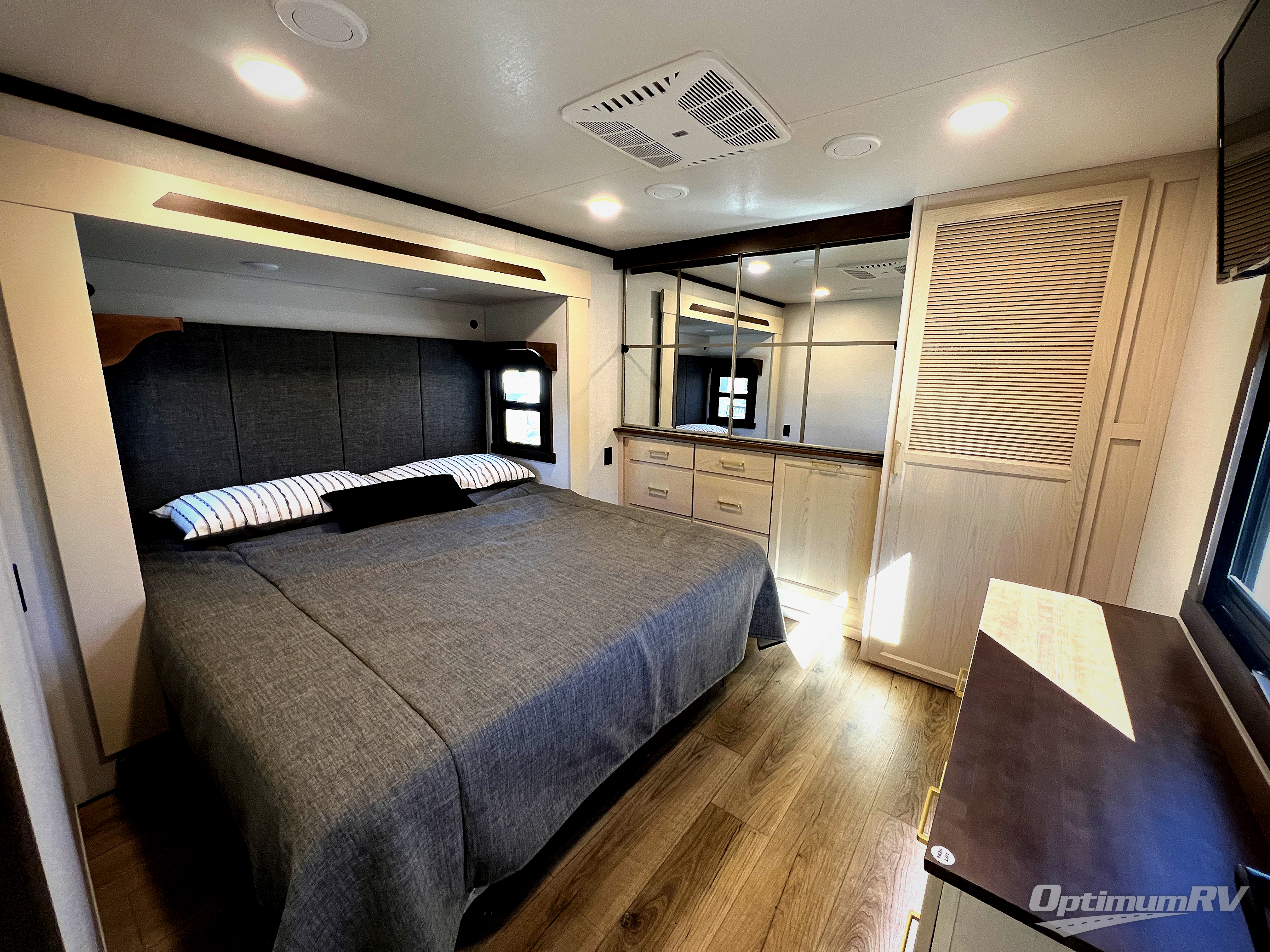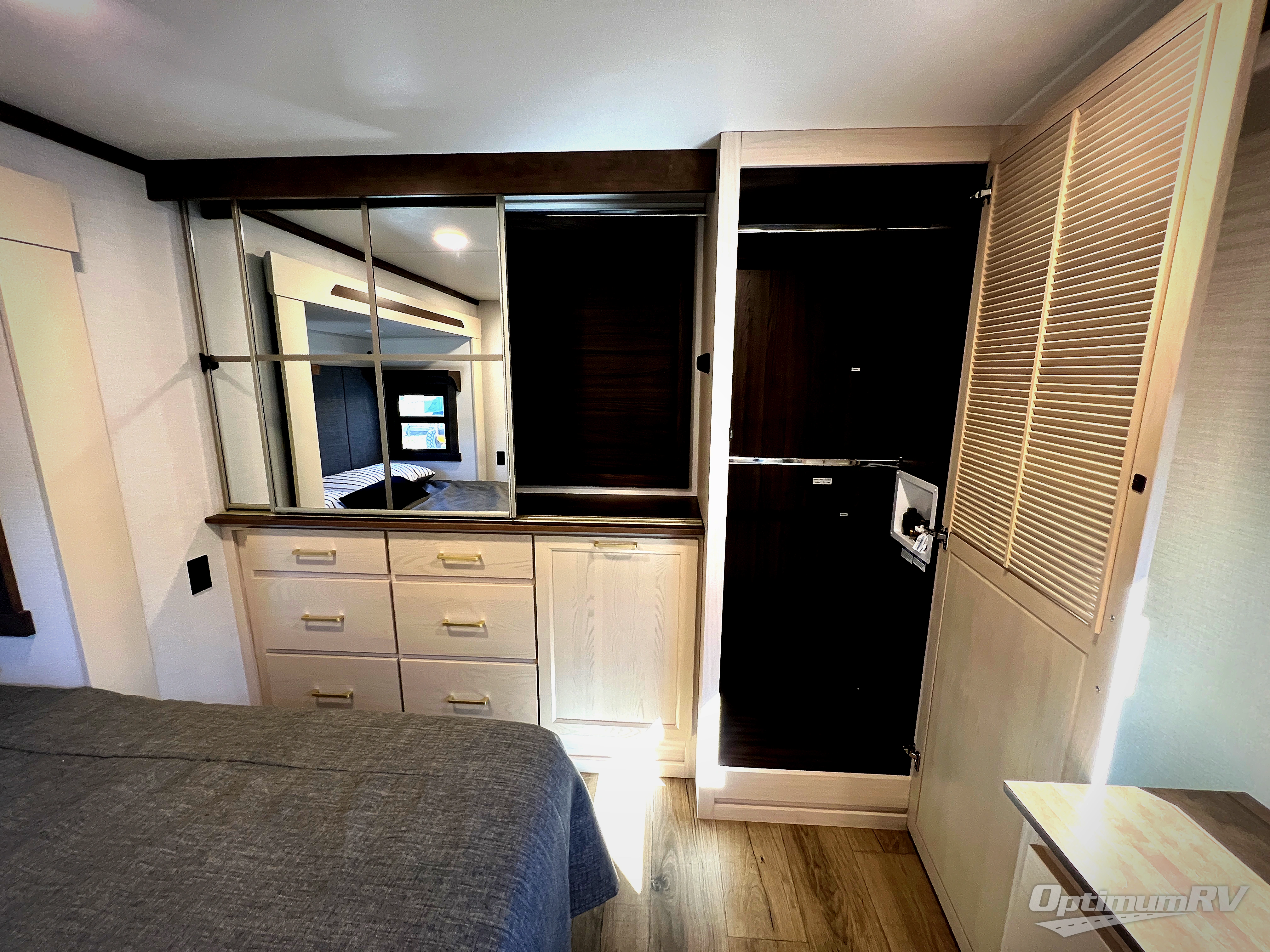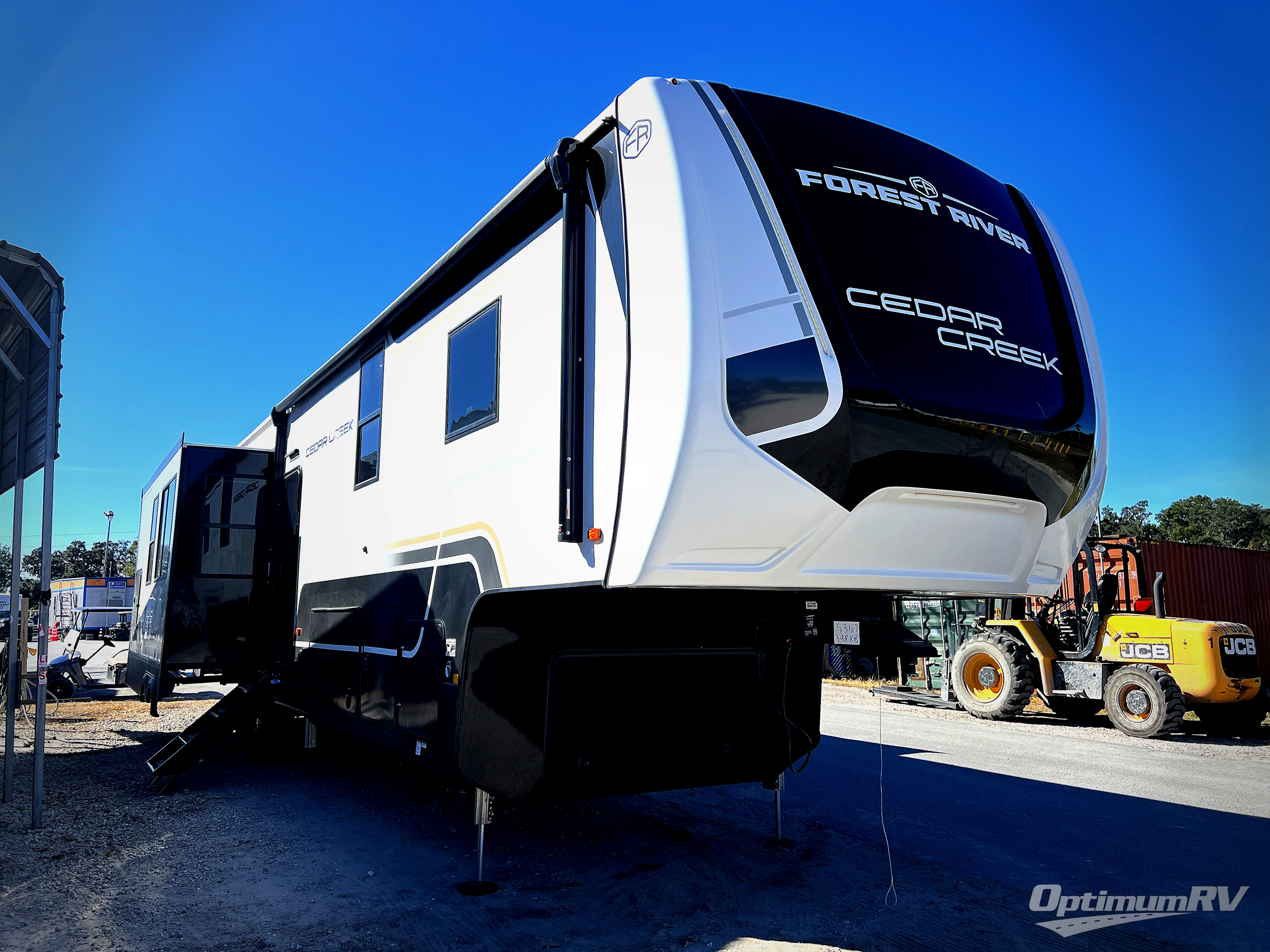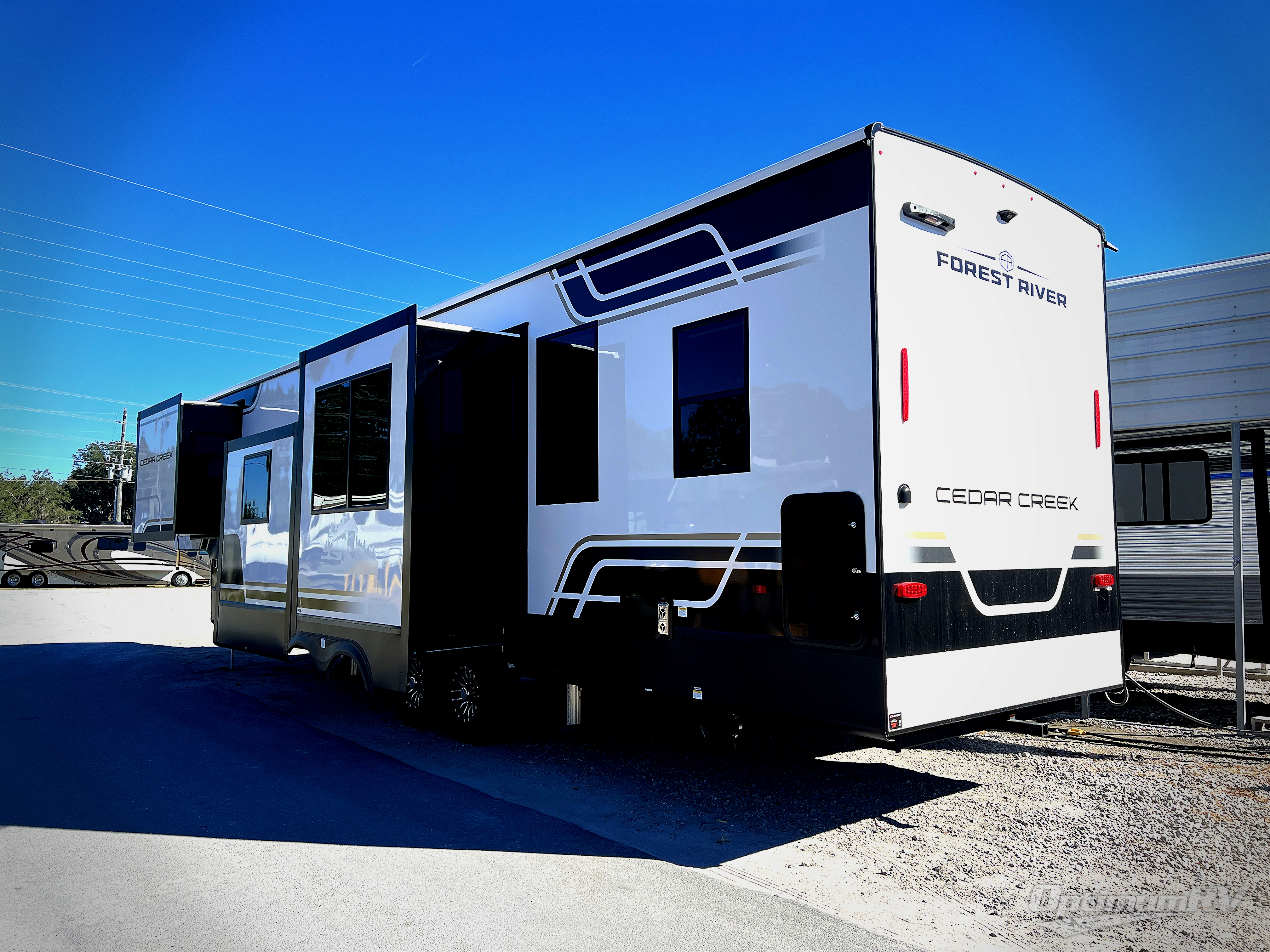 With any Cedar Creek Experience fifth wheel by Forest River, you will bet met with luxury features both inside and out! The True Gelcoat exterior is the best of the best in exteriors and the 3M bonded sidewalls will hold up over years of use. There is also a new 101'' wide-body frame, a Road Warrior suspension, plus a TST tire pressure monitoring system to make towing that much easier. You will find a hidden front storage compartment, along with a 4' x 6' ABS, ribbed, removable underbelly panels, and 6-point hydraulic leveling system, plus many more exterior conveniences. The interior will have you feeling like you haven't left home with vinyl floor coverings, power theater seating with USB ports, a cozy fireplace, vinyl floor covering and the list of comforts goes on! Each model is also pre-wired for satellite to the roof, and you're sure to never go bored with a Smart TV in the bedroom!