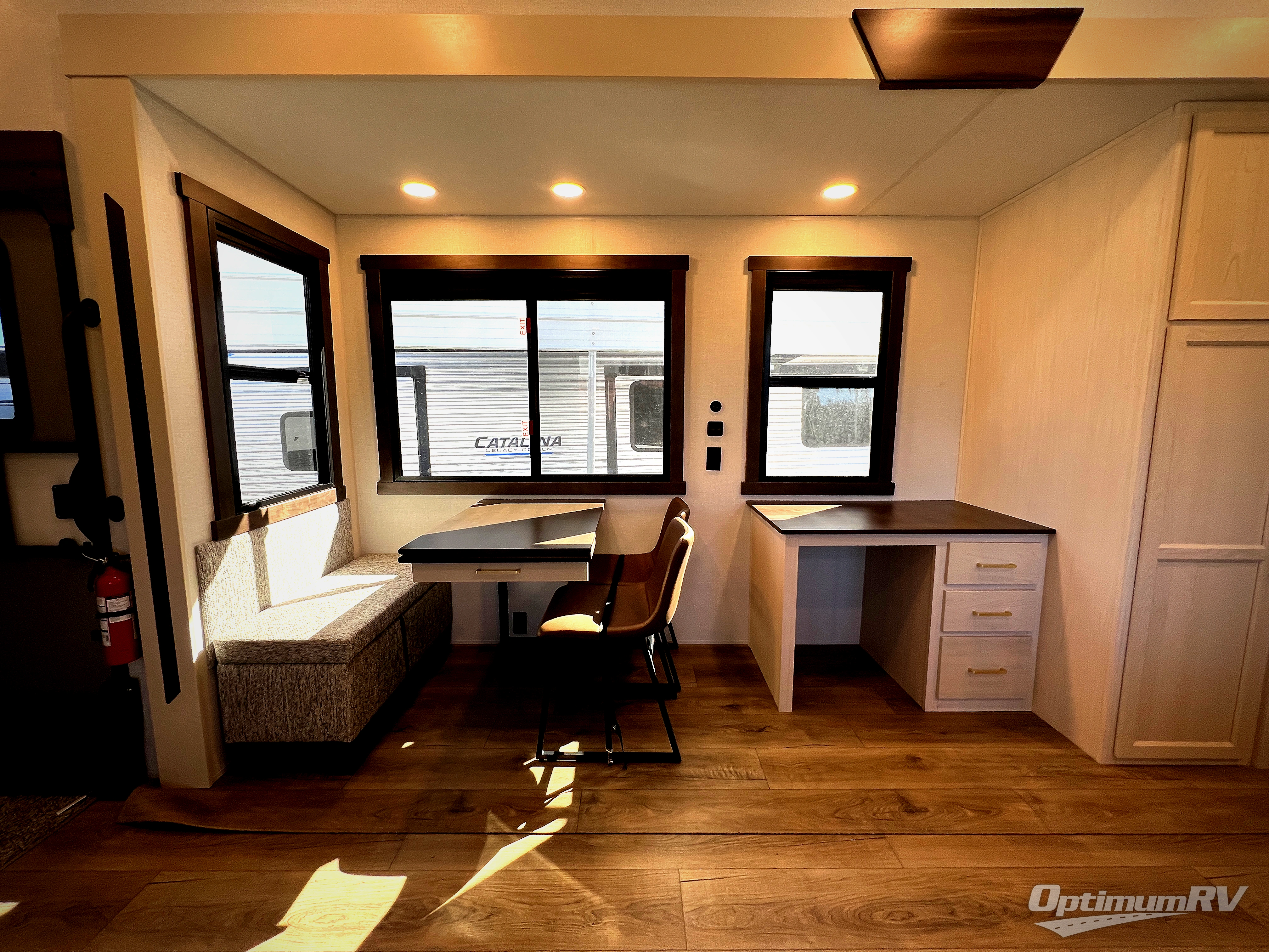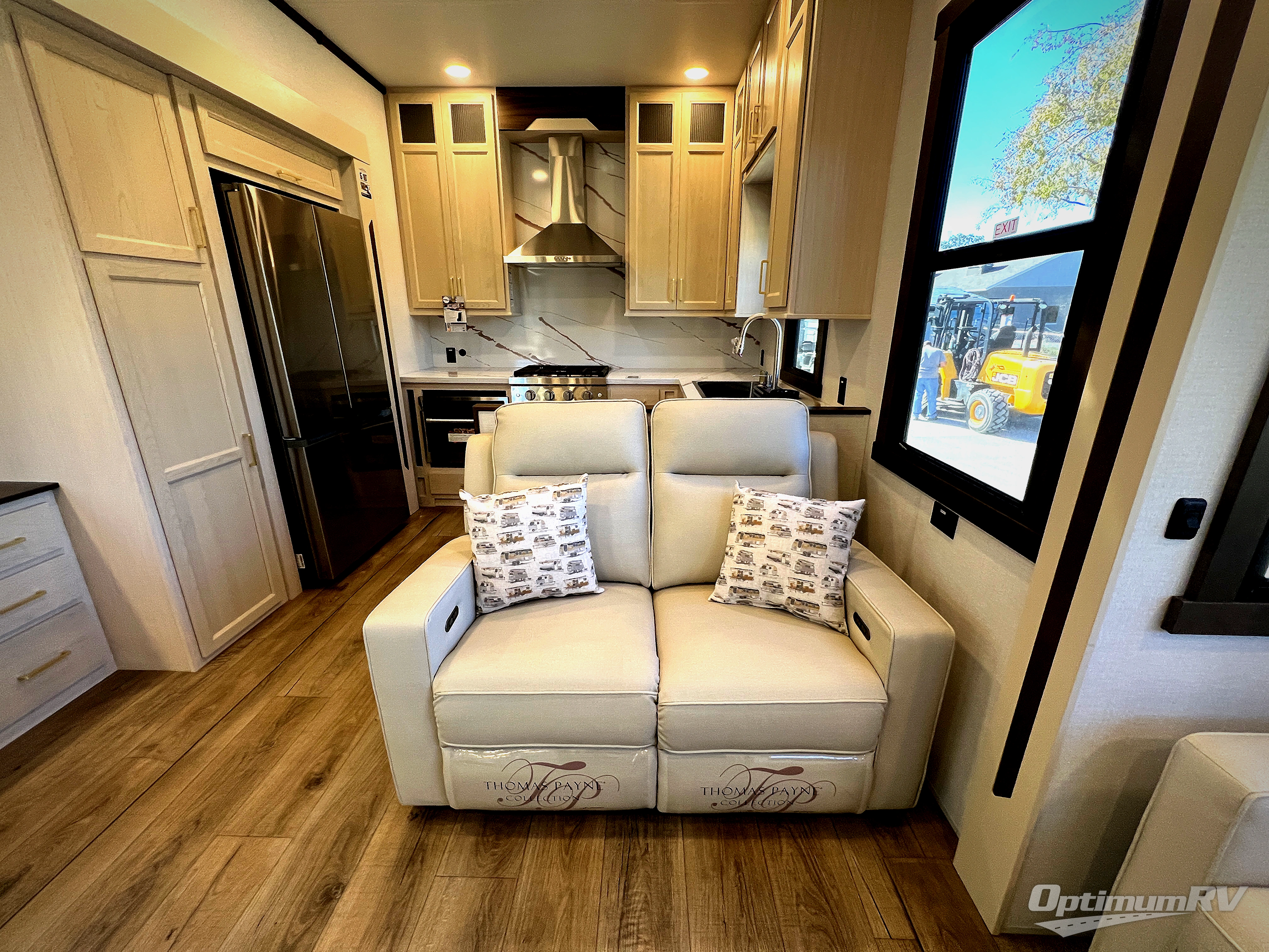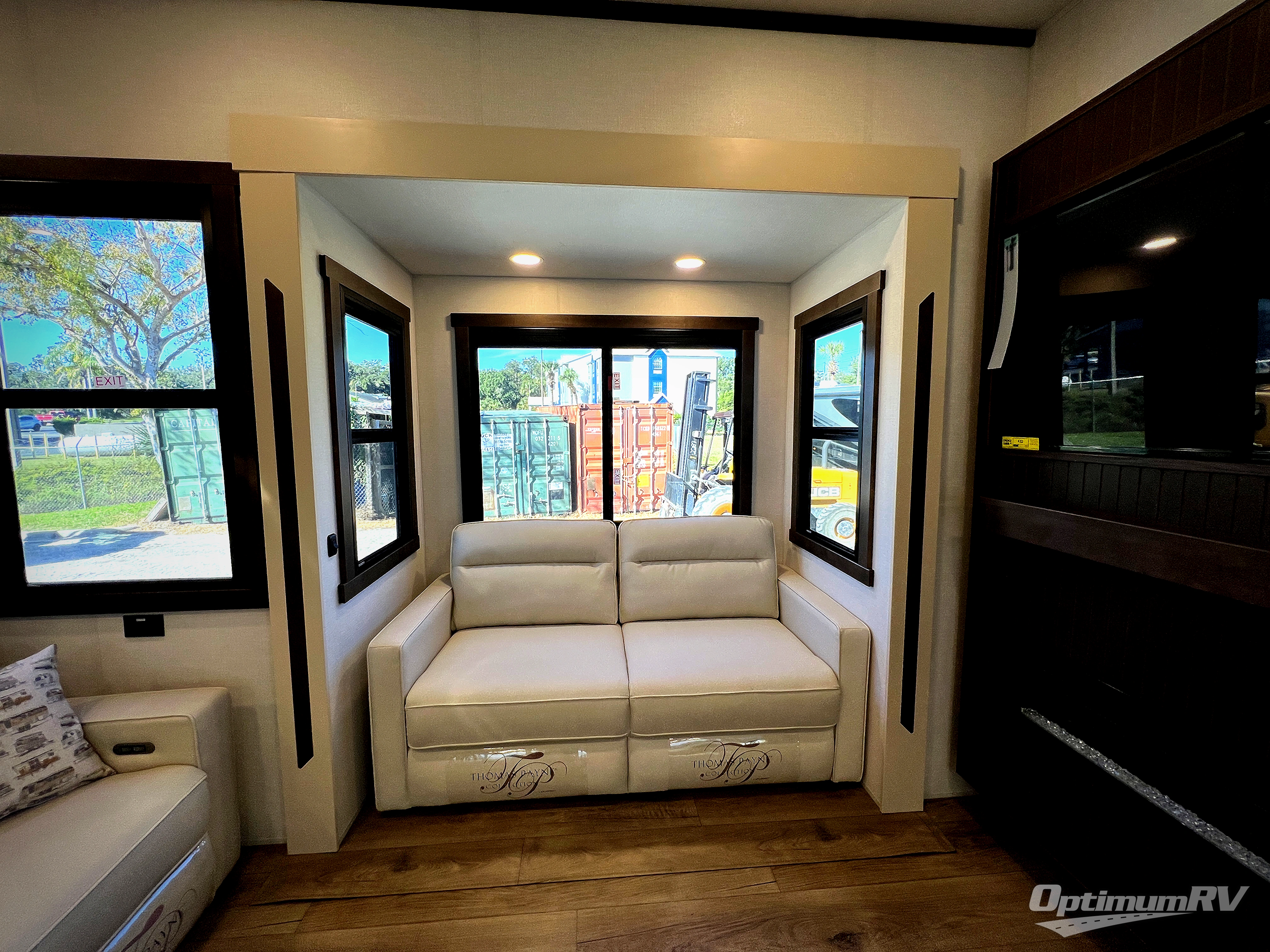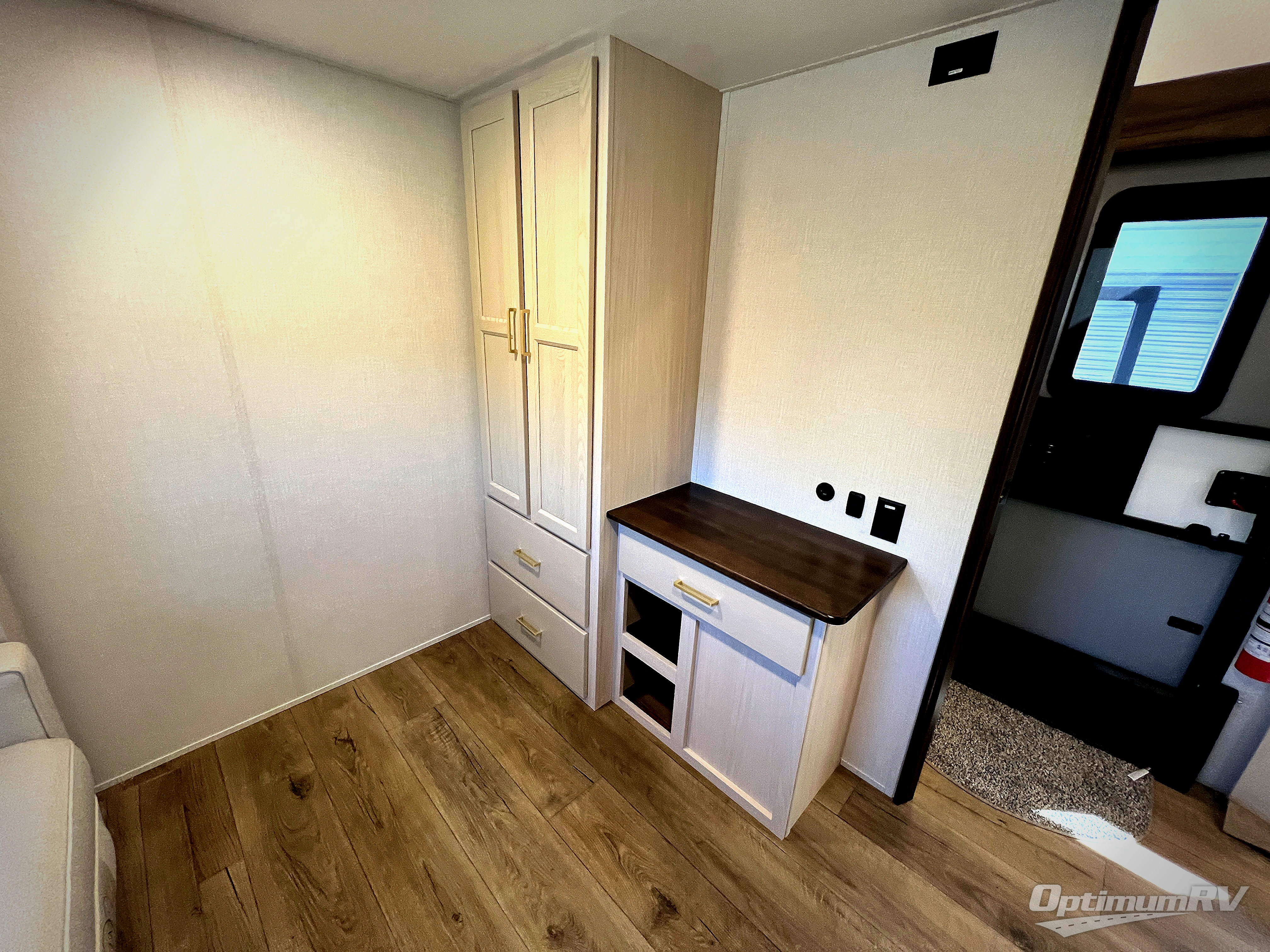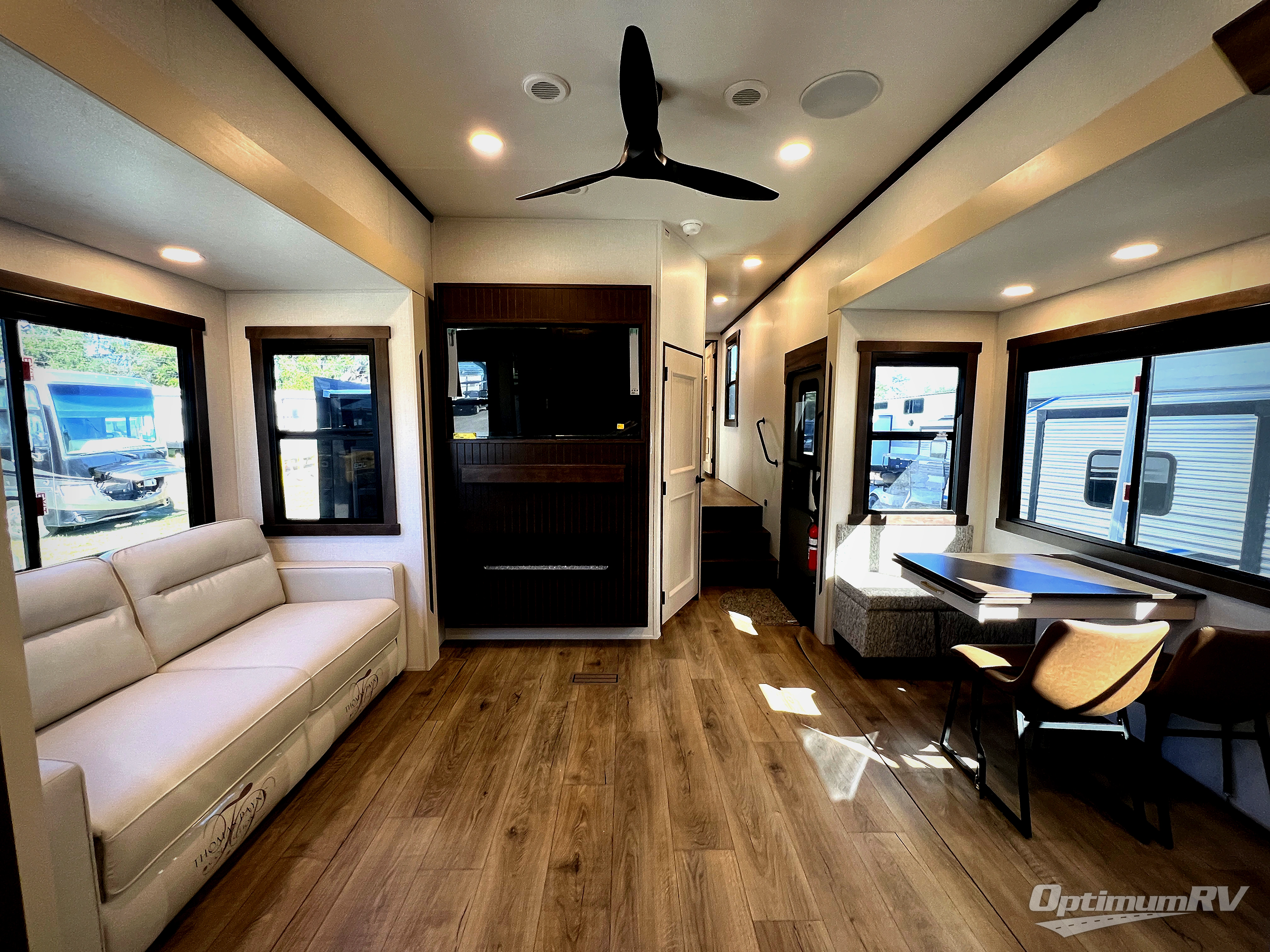 A front kitchen with ample counter space, a middle den, and a front bedroom make this fifth wheel one to remember! The living area will be a favorite spot to visit together since there is a hide-a-bed sofa and theater seating, plus an entertainment center with a fireplace. There is also a free-standing dining table and a desk with a chair if you need to telecommute. Your guests will love the middle den with a hide-a-bed sofa and a closet for their things, plus there is a loft above this room for added sleeping or storage space. A spacious full bath includes a shower with a seat, and the king bed slide out in the front private bedroom is sure to bring a great night's rest.