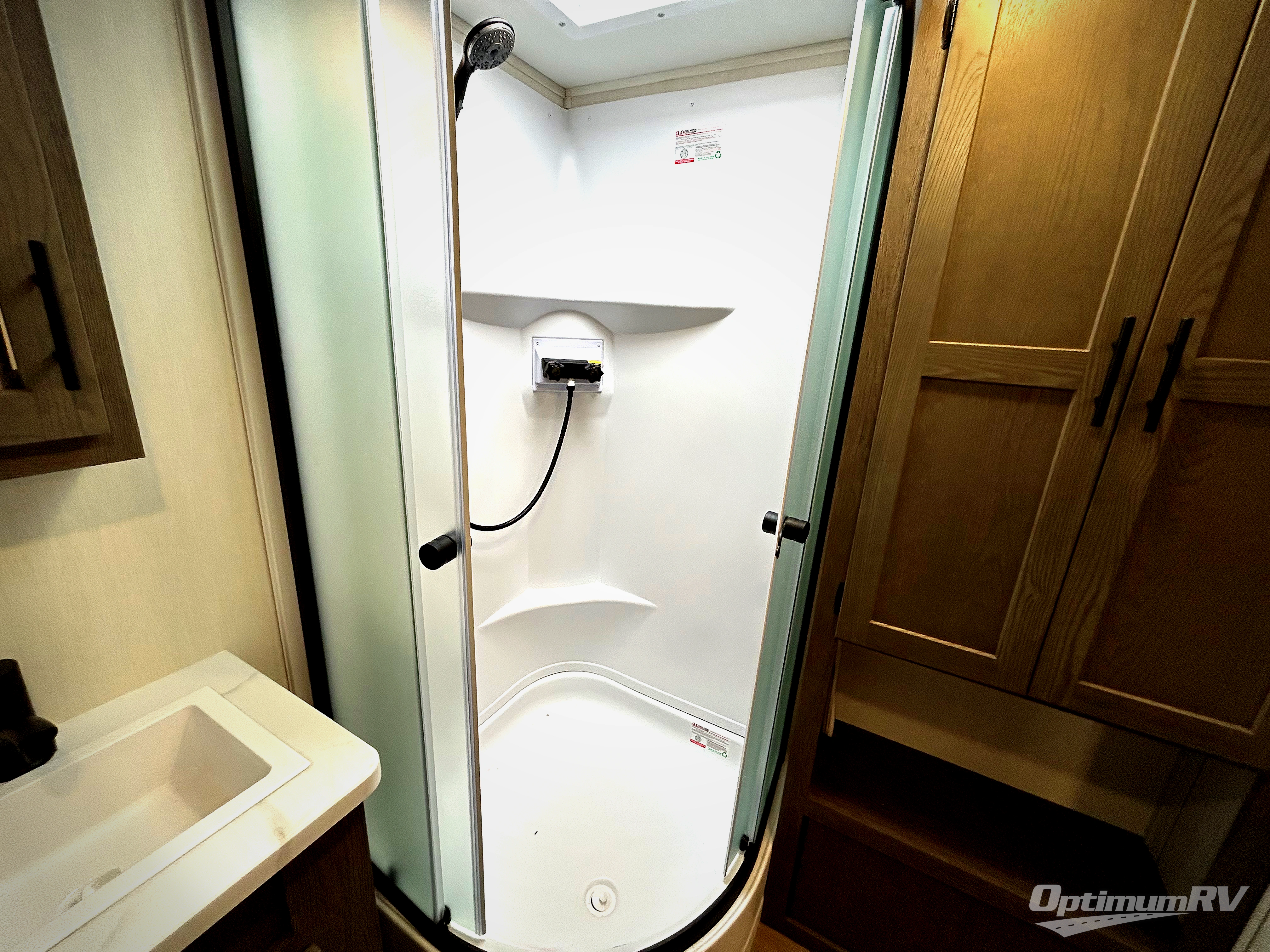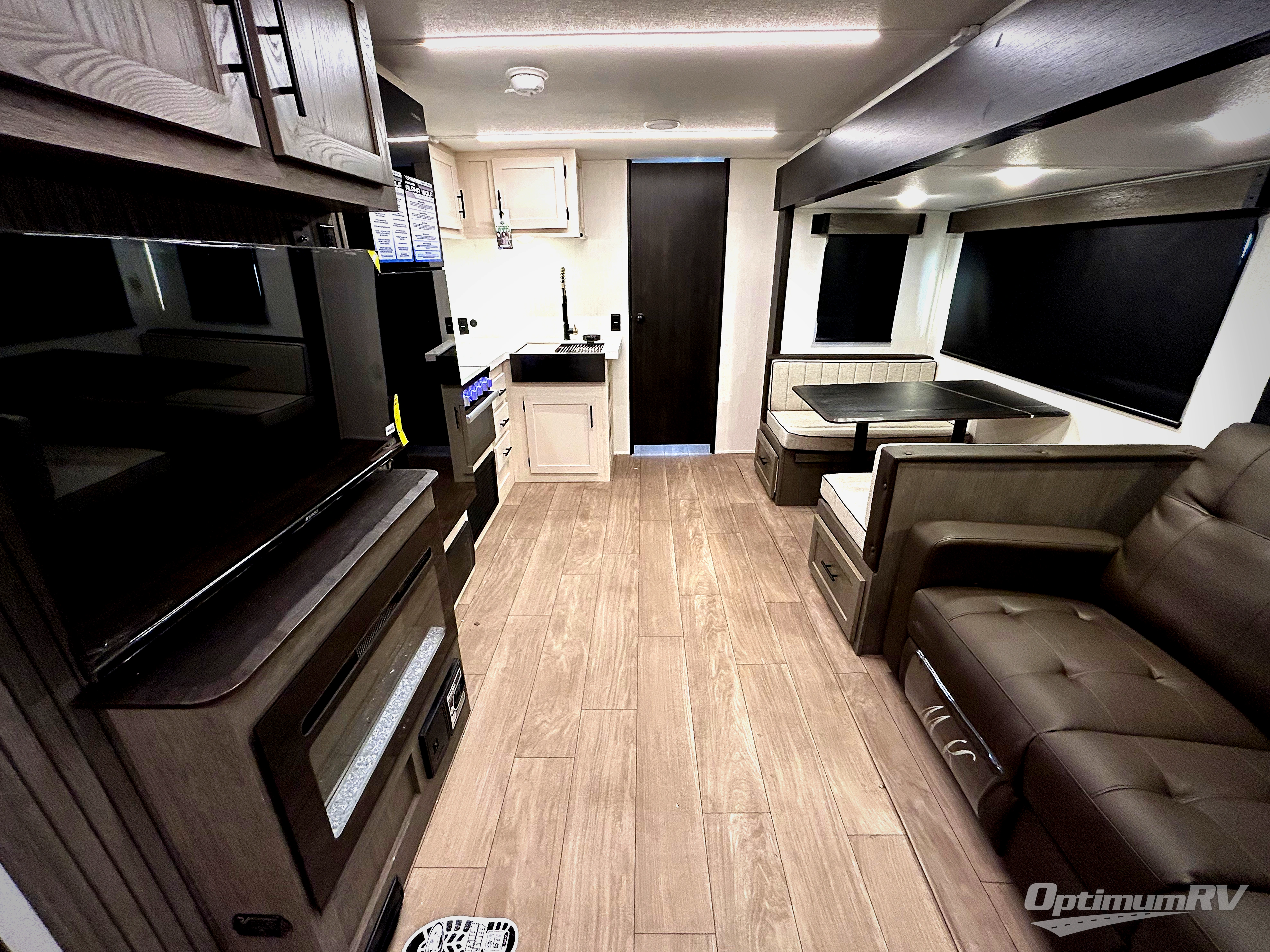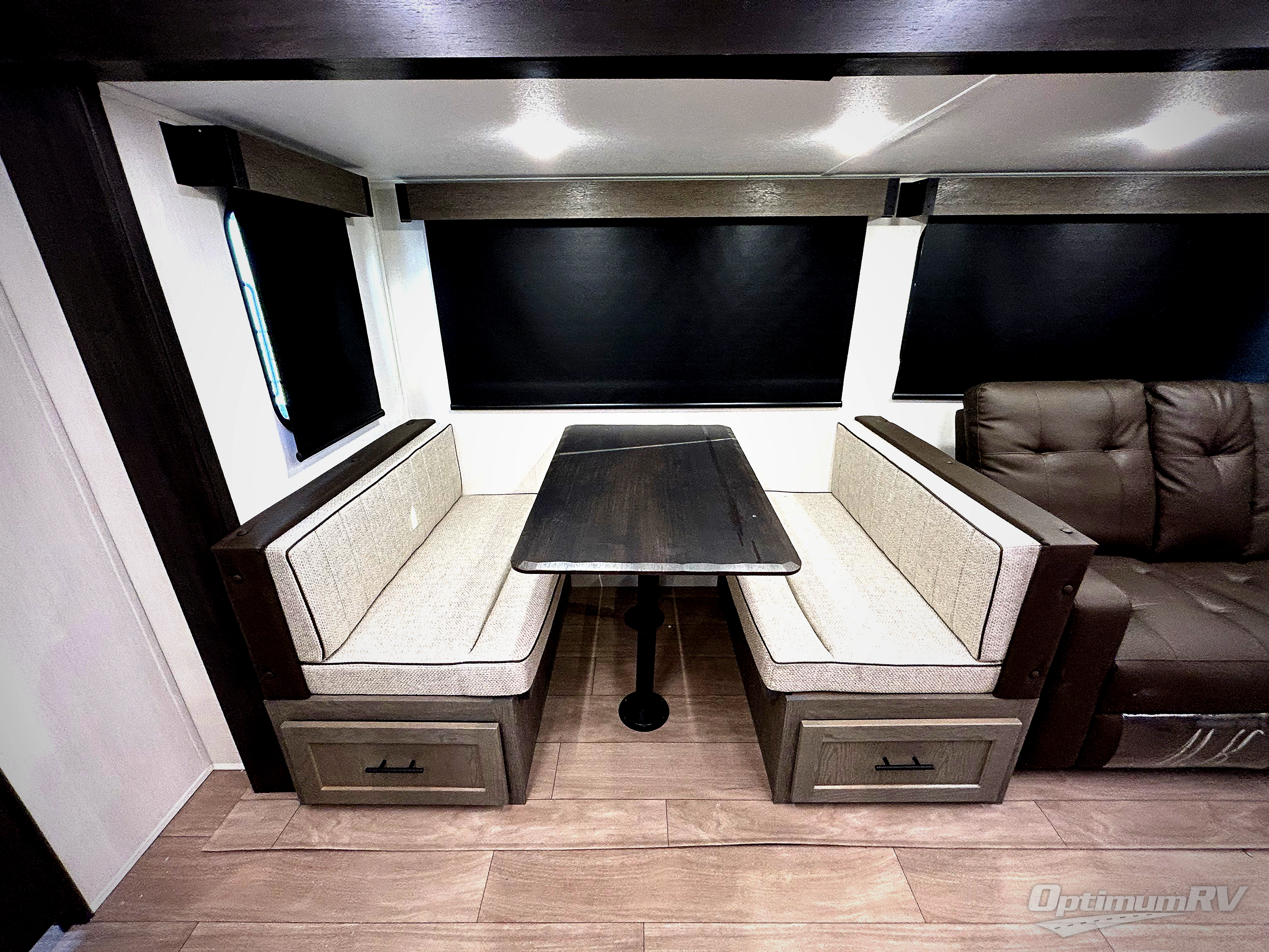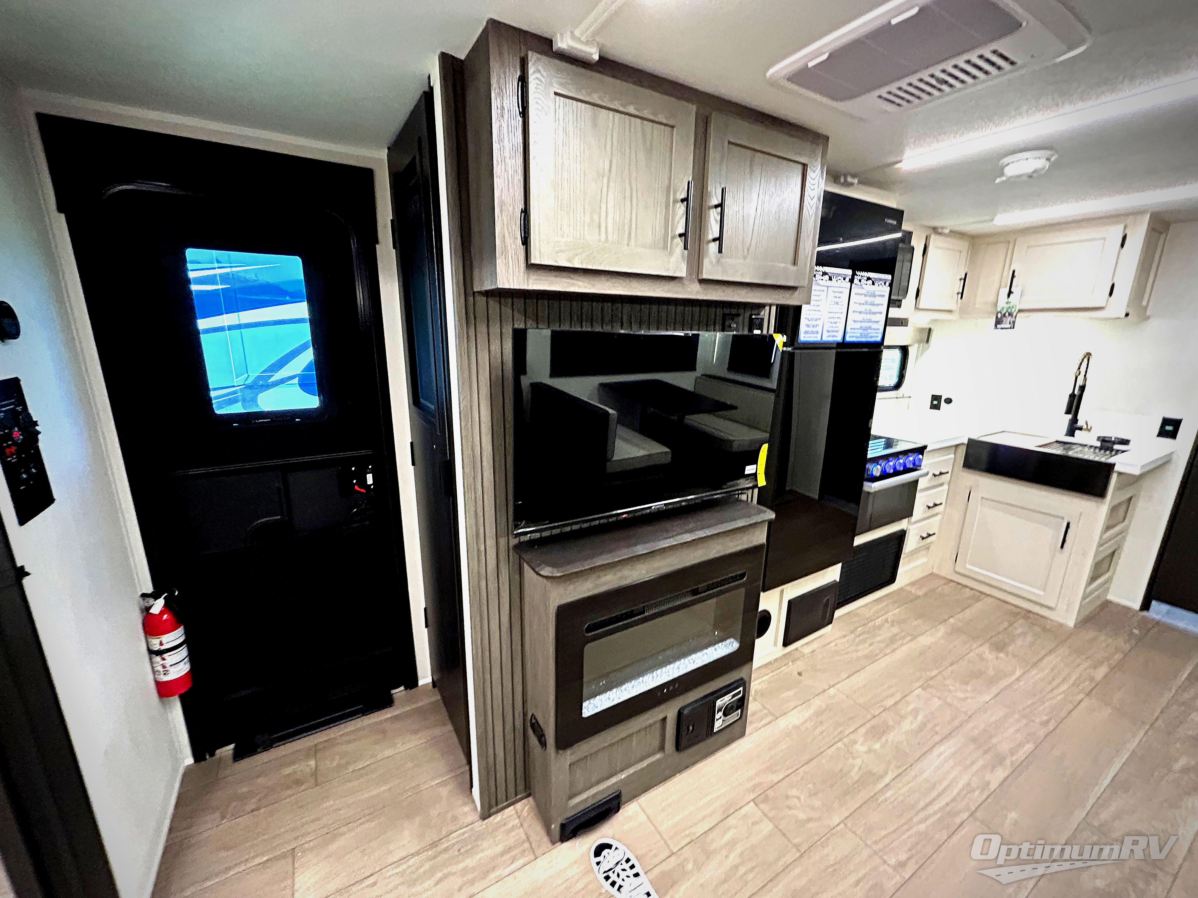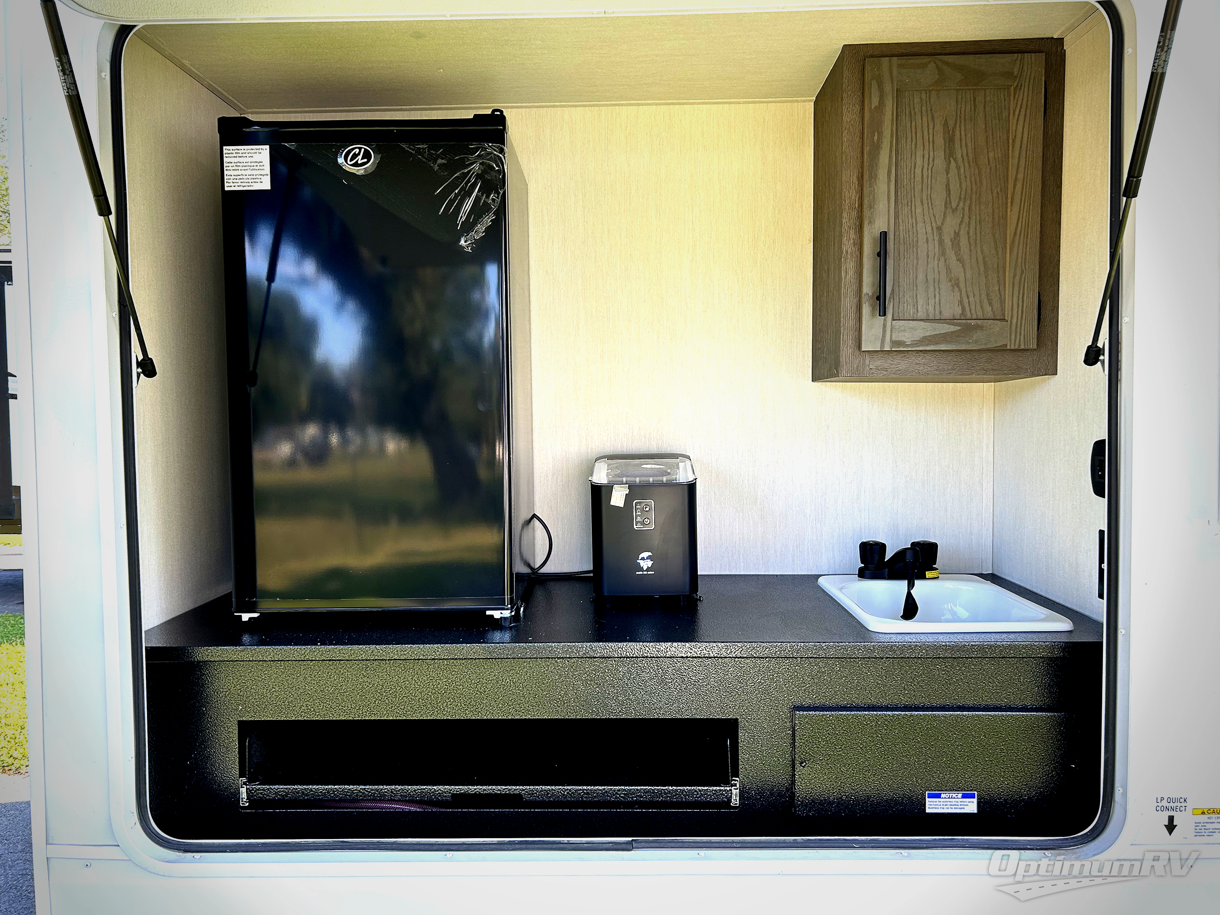 Head to your local state park in this travel trailer with a large slide out! You will love having more space to move about, and your crew can relax on the theater seating or play a game at the booth dinette. An optional TV can be added to the entertainment center, and the fireplace will make it feel a little more like home. There is a three burner cooktop and microwave oven in the kitchen, along with a 12V refrigerator and a walk-in pantry. If you enjoy cooking outdoors, then the outside kitchen will be waiting for you! The full rear bath will let you freshen up before bed, and the queen bed is sure to bring a great night's rest!