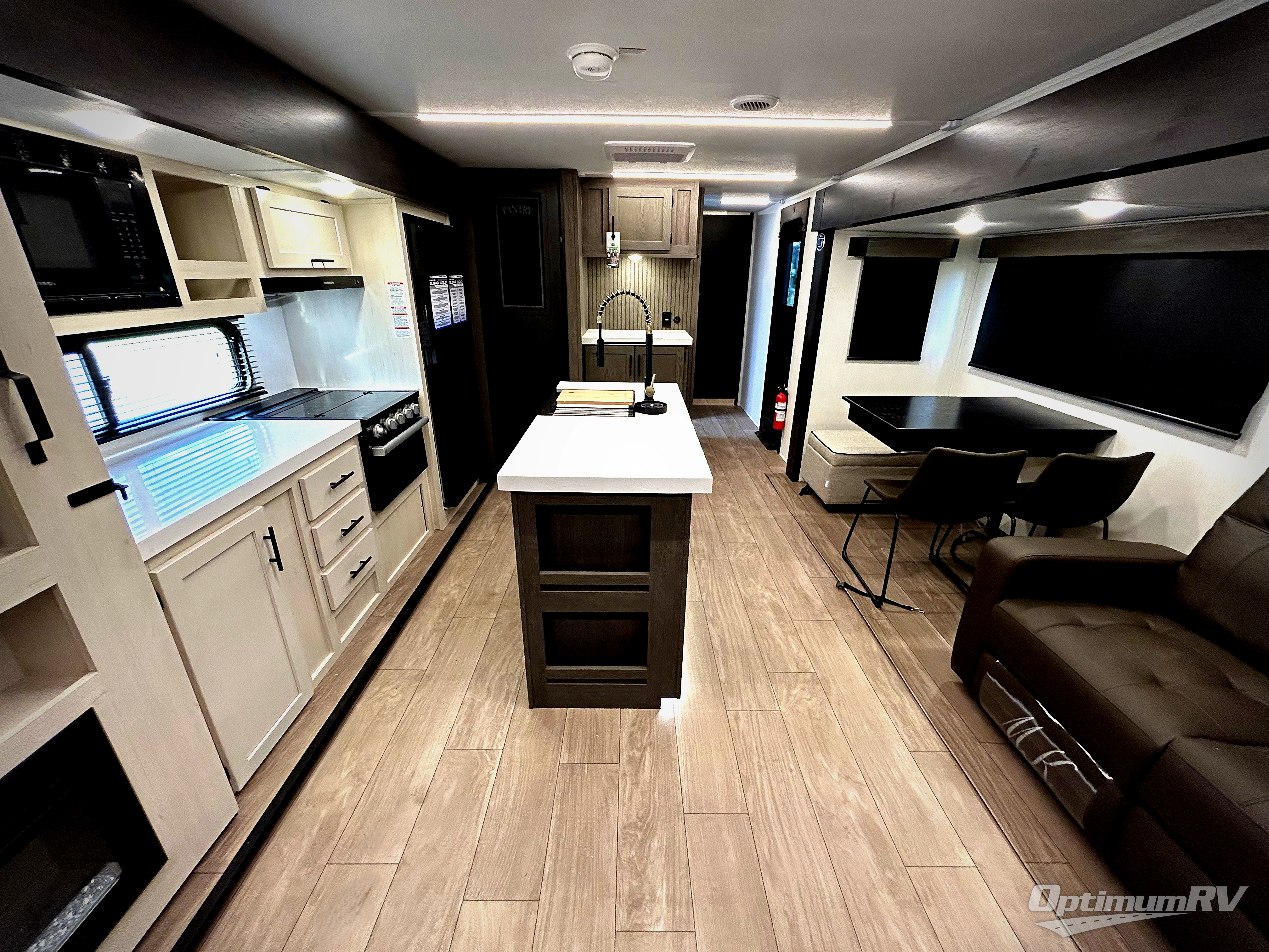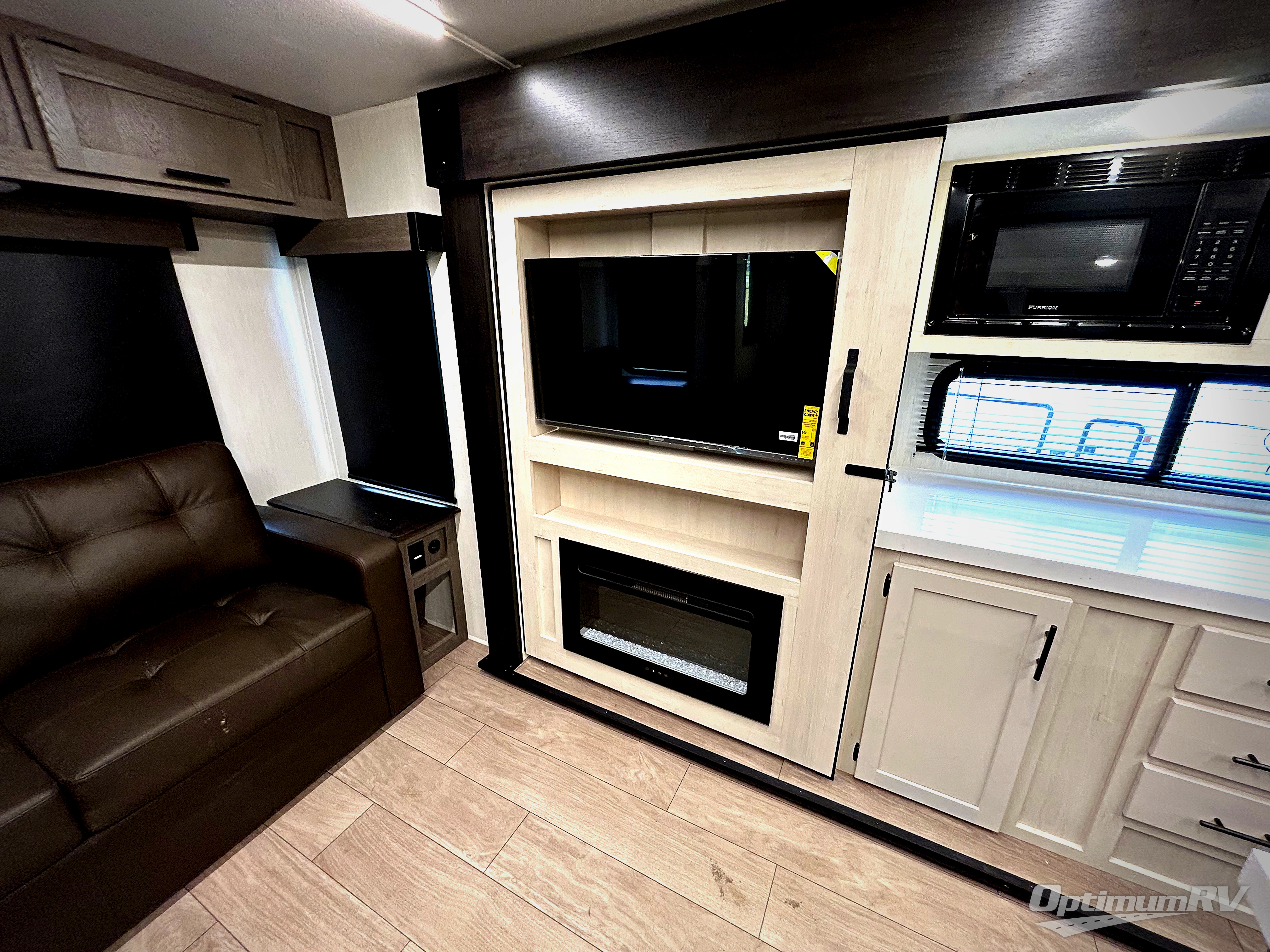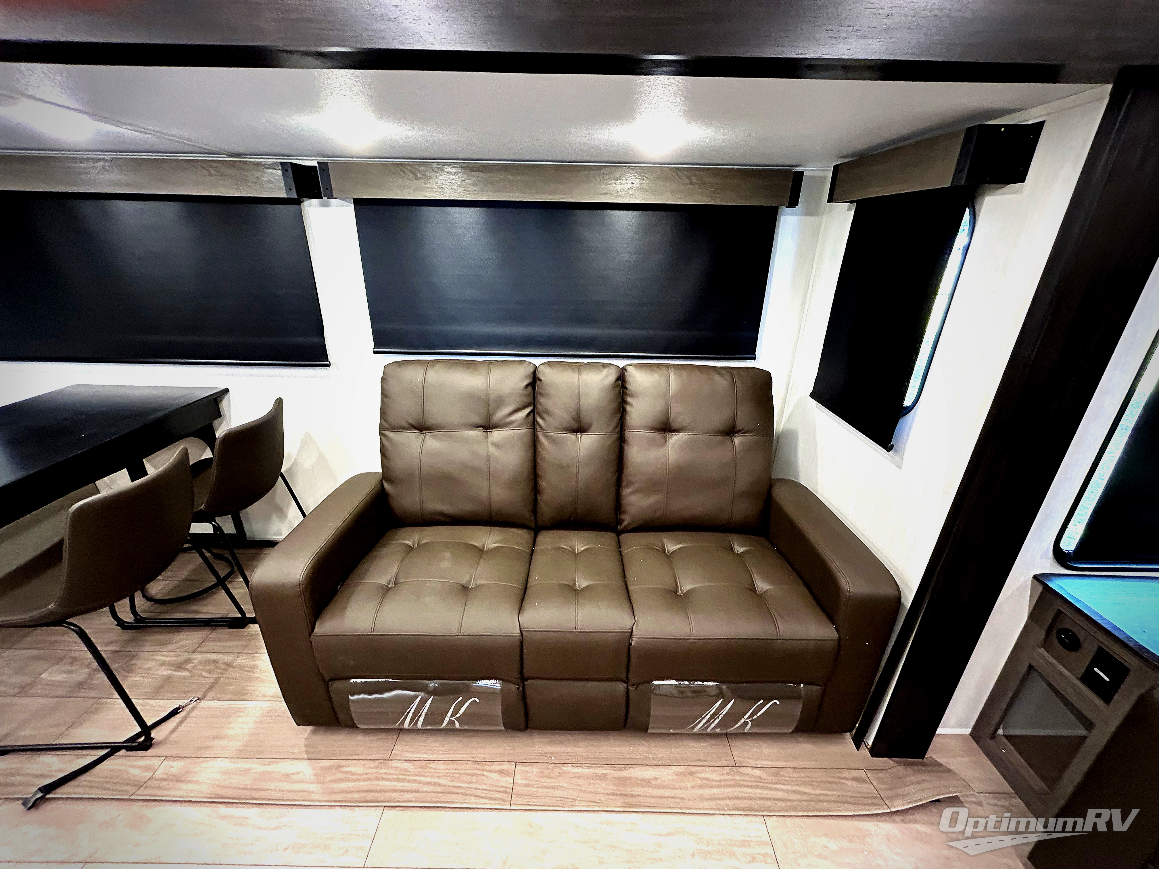 This trailer has it all for maximum comfort and convenience as well as entertainment! The rear living area includes a tri-fold sofa with a rear Pano-Vision window for great views of your campsite, and dual opposing slides widen this area so you can visit with friends. You'll also find theater seating, plus a free-standing table with two chairs and a storage ottoman seat. Enjoy the fireplace on a cool night or when you want a little ambiance while seated inside. Two patio awnings will provide an outdoor living area; just grab your camping chairs from the full pass-through storage. When you want to call it a night, fall quickly to sleep on the queen bed in the front bedroom with easy access to a dual entry bathroom!