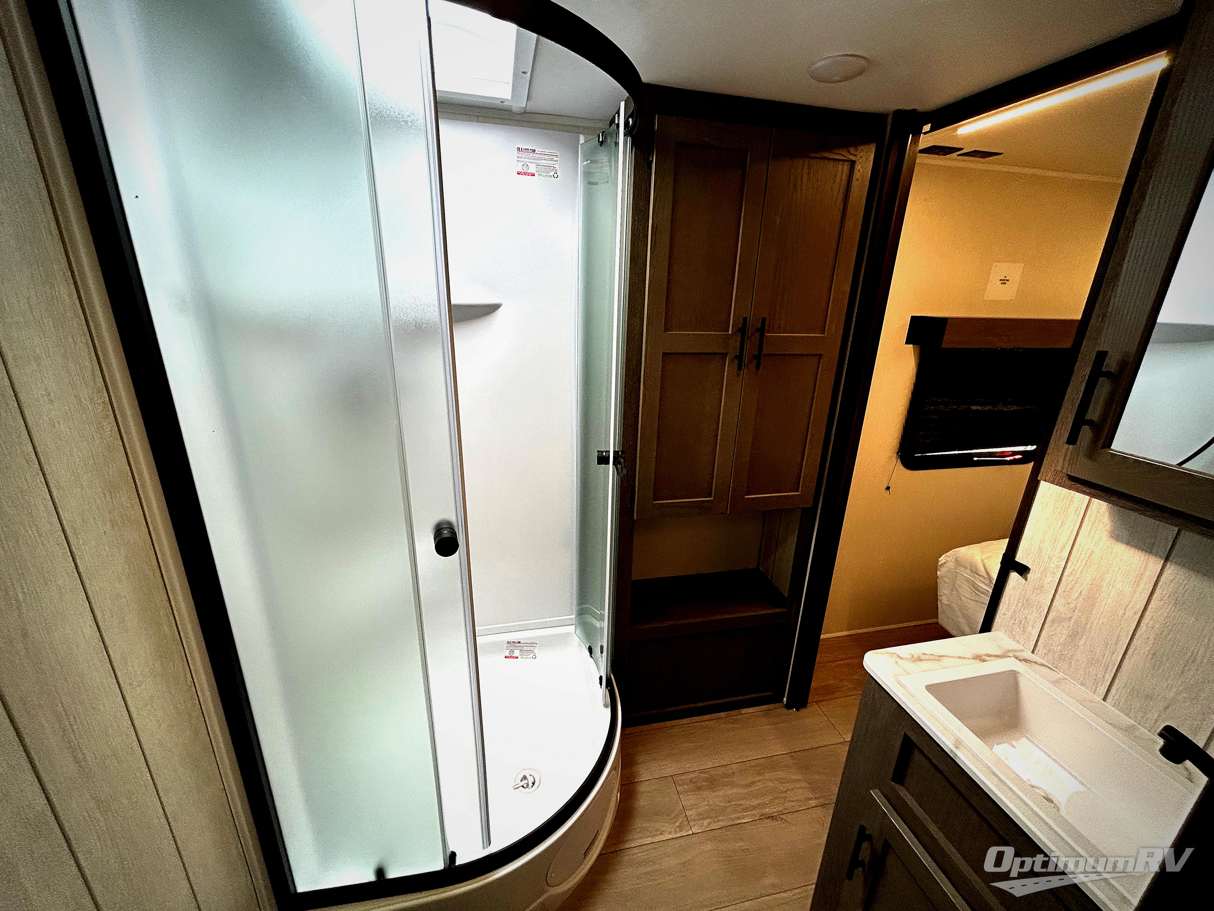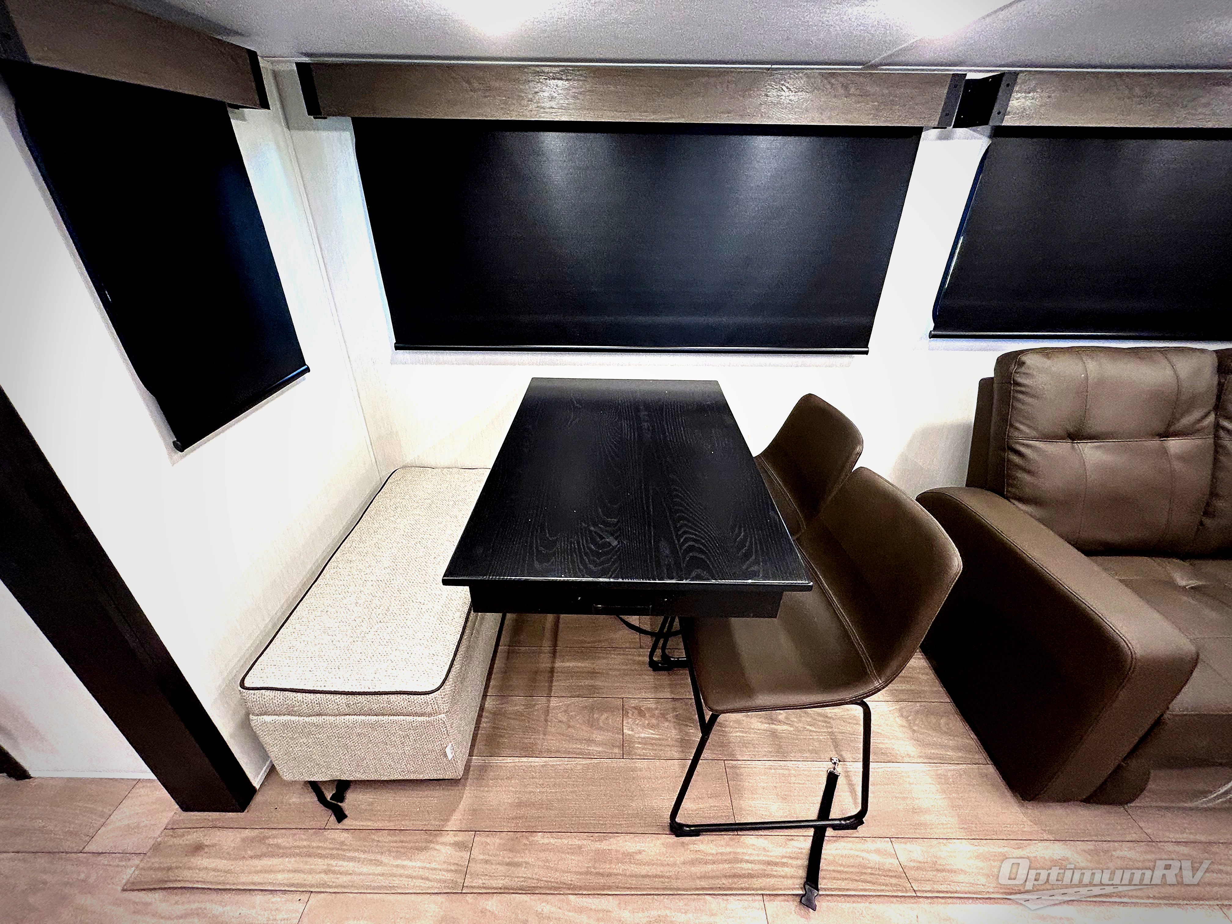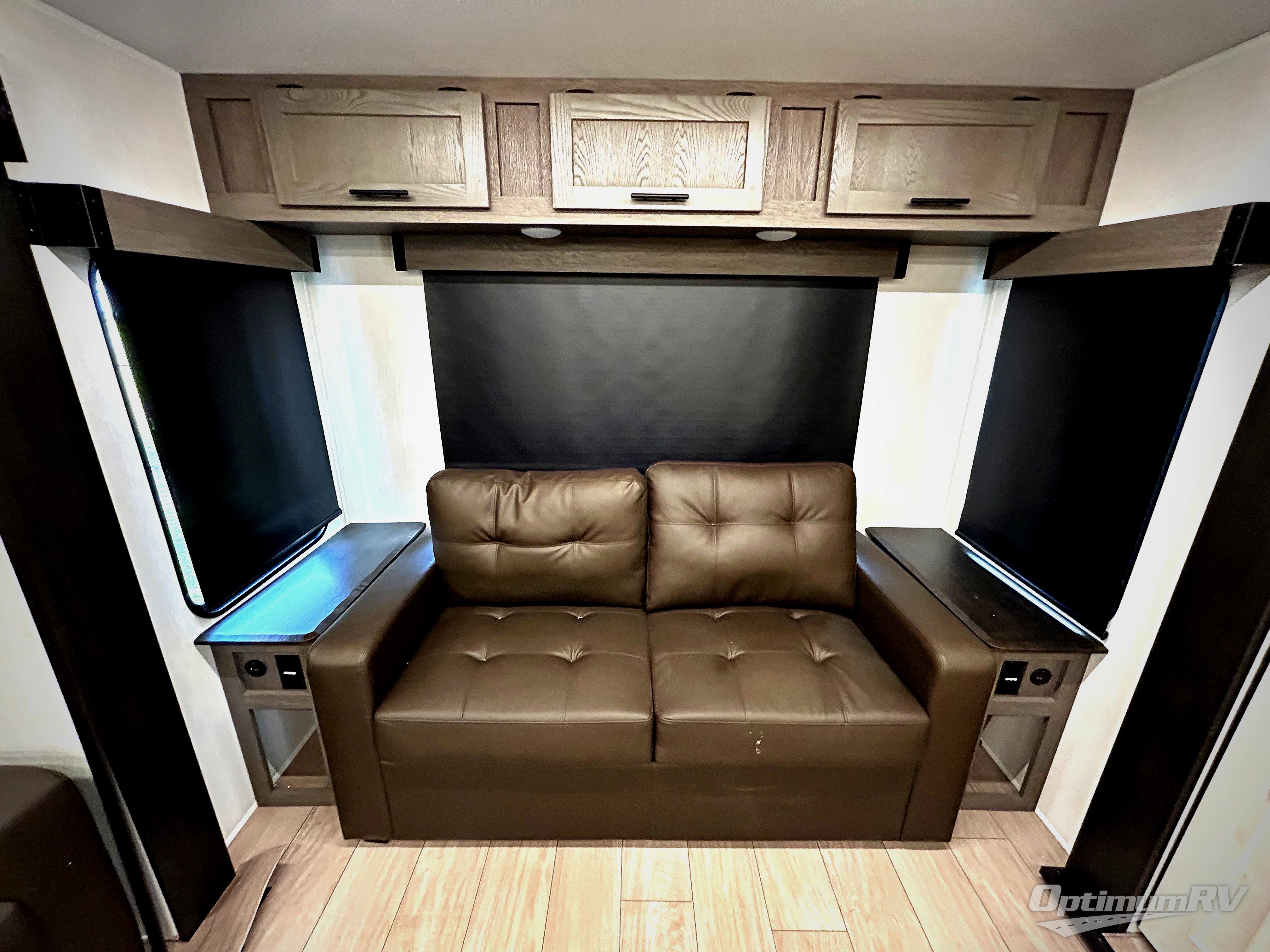 This trailer has it all for maximum comfort and convenience as well as entertainment! The rear living area includes a tri-fold sofa with a rear Pano-Vision window for great views of your campsite, and dual opposing slides widen this area so you can visit with friends. You'll also find theater seating, plus a free-standing table with two chairs and a storage ottoman seat. Enjoy the fireplace on a cool night or when you want a little ambiance while seated inside. Two patio awnings will provide an outdoor living area; just grab your camping chairs from the full pass-through storage. When you want to call it a night, fall quickly to sleep on the queen bed in the front bedroom with easy access to a dual entry bathroom!