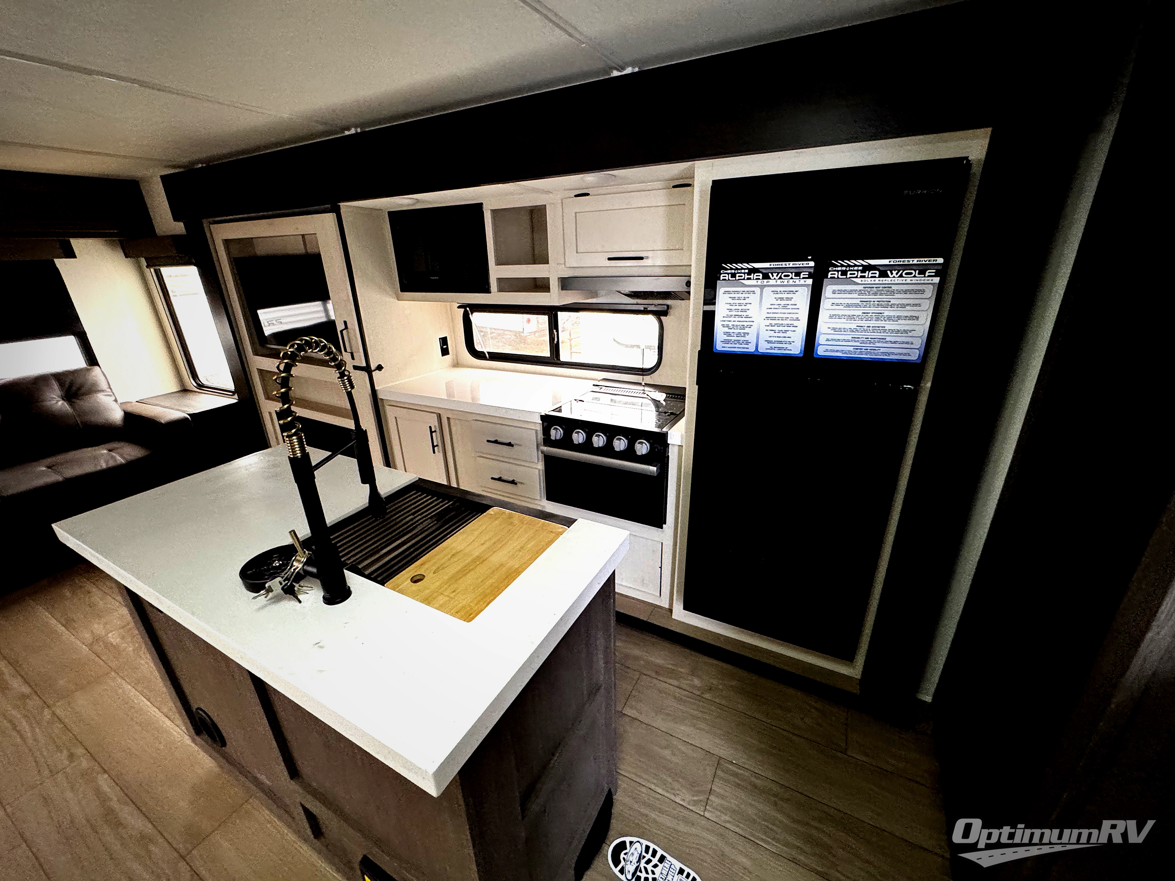 With any Cherokee Alpha Wolf travel trailer by Forest River you'll enjoy outstanding amenities, quality construction, and an affordable price. Each model features a "ToughBend" rigid skirt metal design, 5/8" tongue and groove plywood floor decking, and a "SuperTruss" roof structure that will hold up through years of camping memories. There is a pet friendly "clean sweep" floor design with no heat vents indoors, along with a super lumen lighting system, a 15,000 BTU quick cool central air conditioning, and many more comforts. There are many convenient exterior features such as, Leash Latch pet safety technology, an outside shower with hot and cold water, and exterior steps with oversized landing and quick release. The Weather Guard Package will add protection against the elements with an armored underbelly tank enclosure and forced air heat, thermo-control reflective safety glass windows, and upgraded laminated walls with block foam insulation!