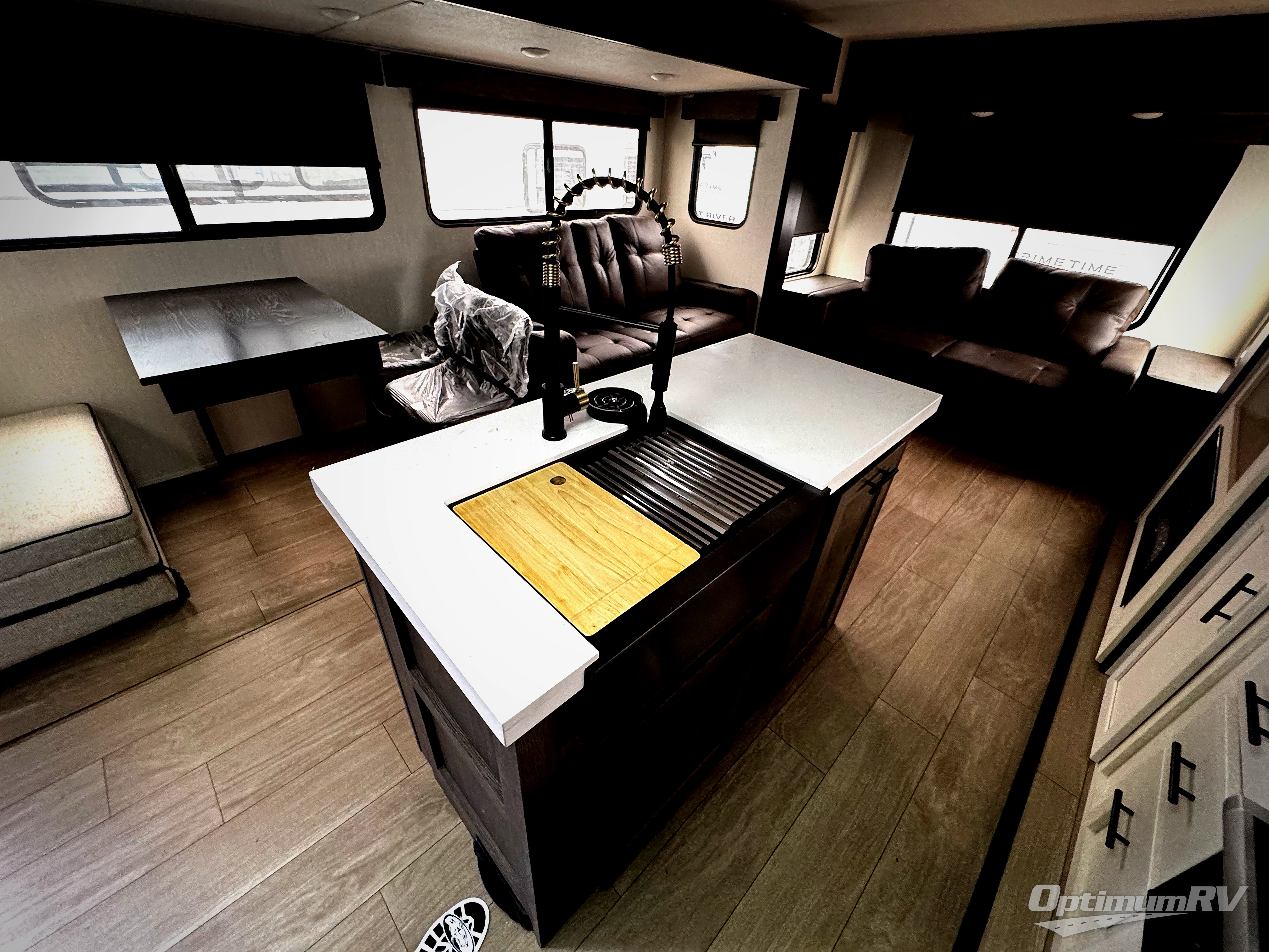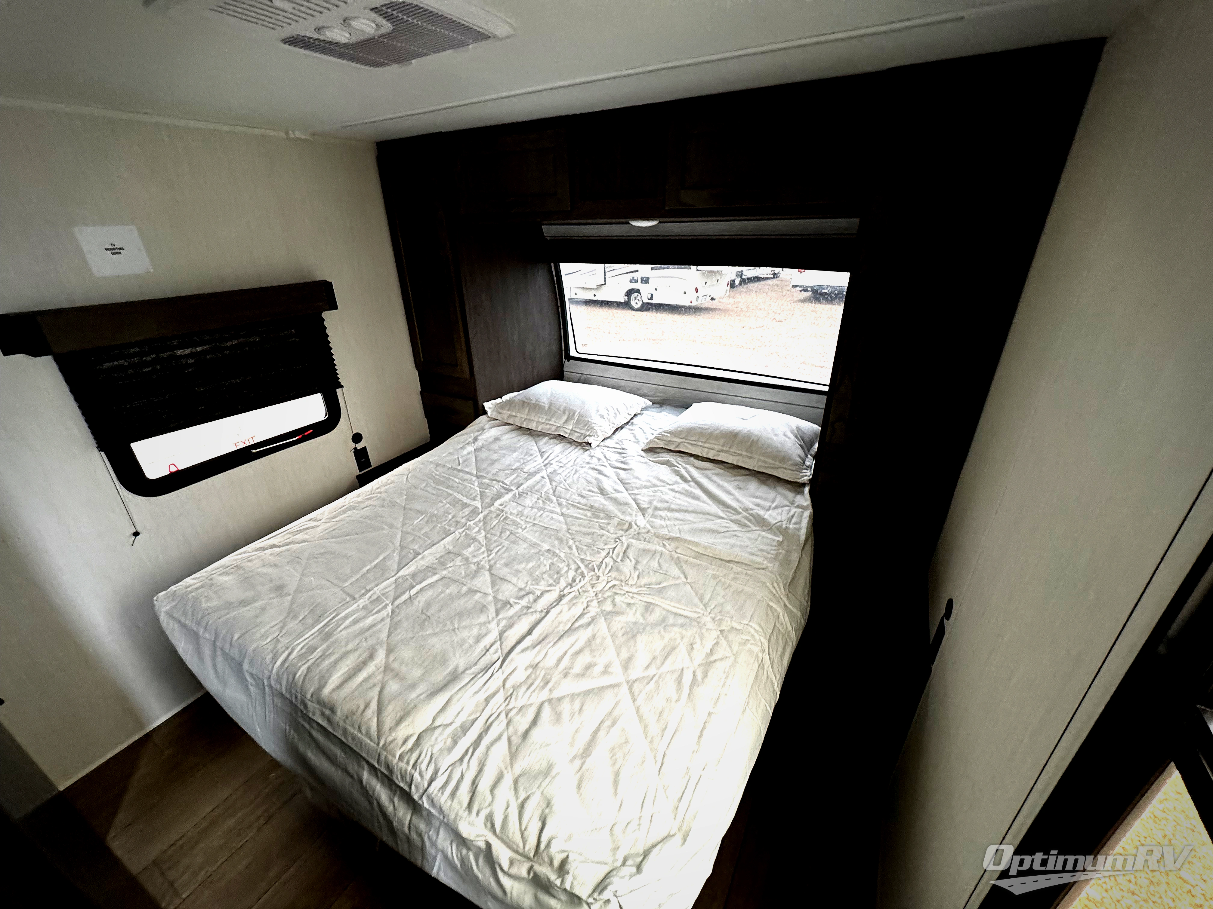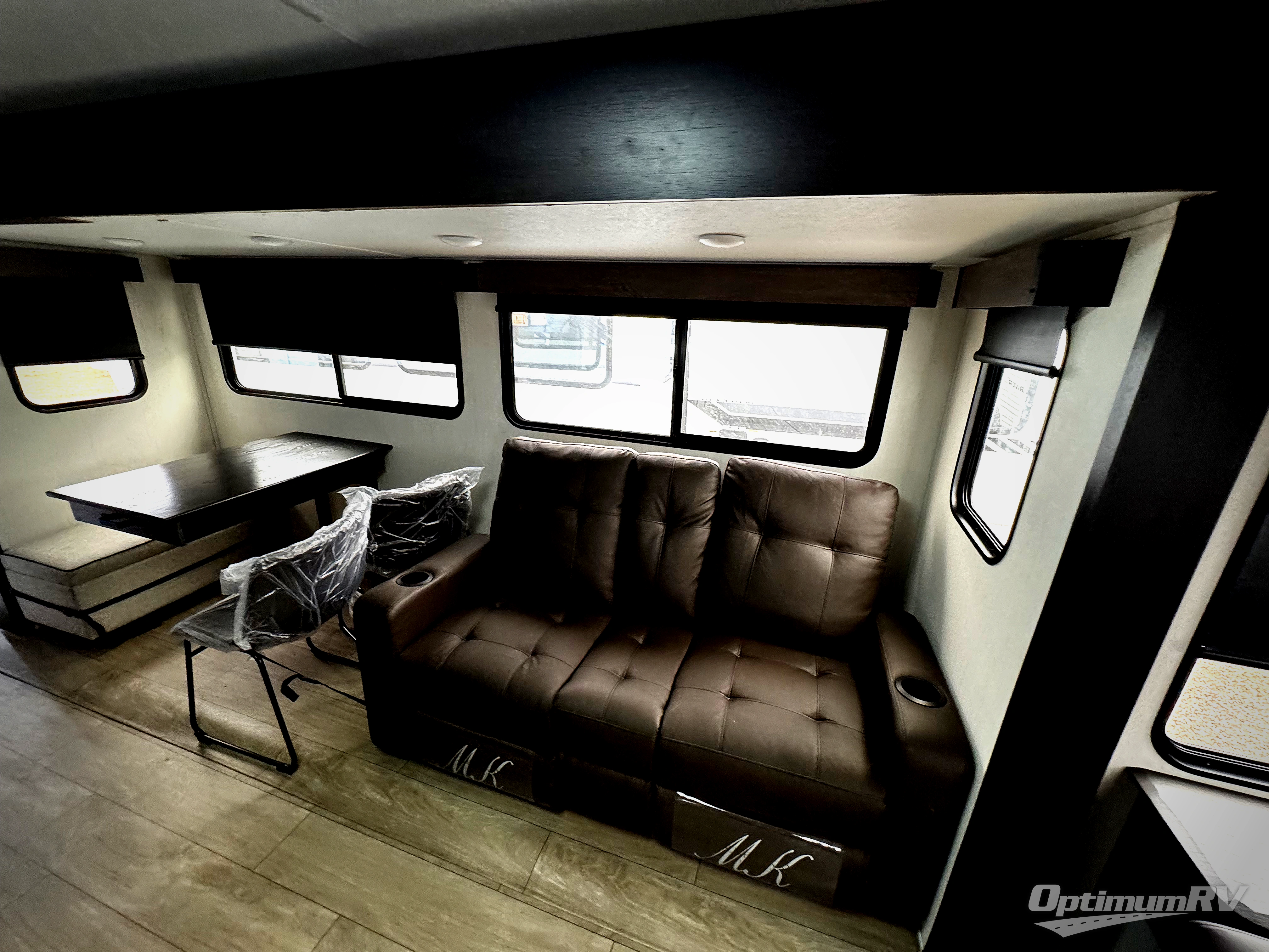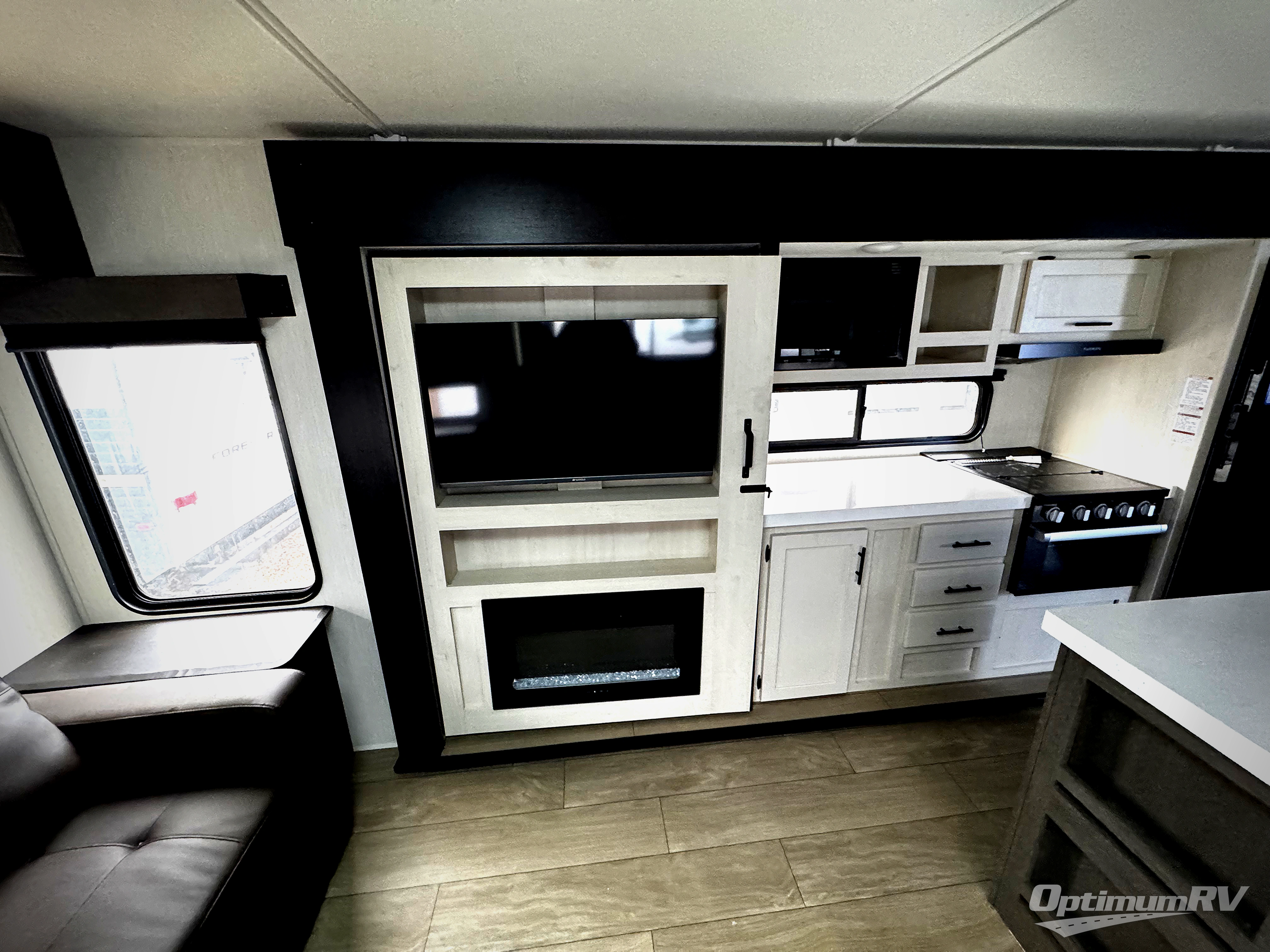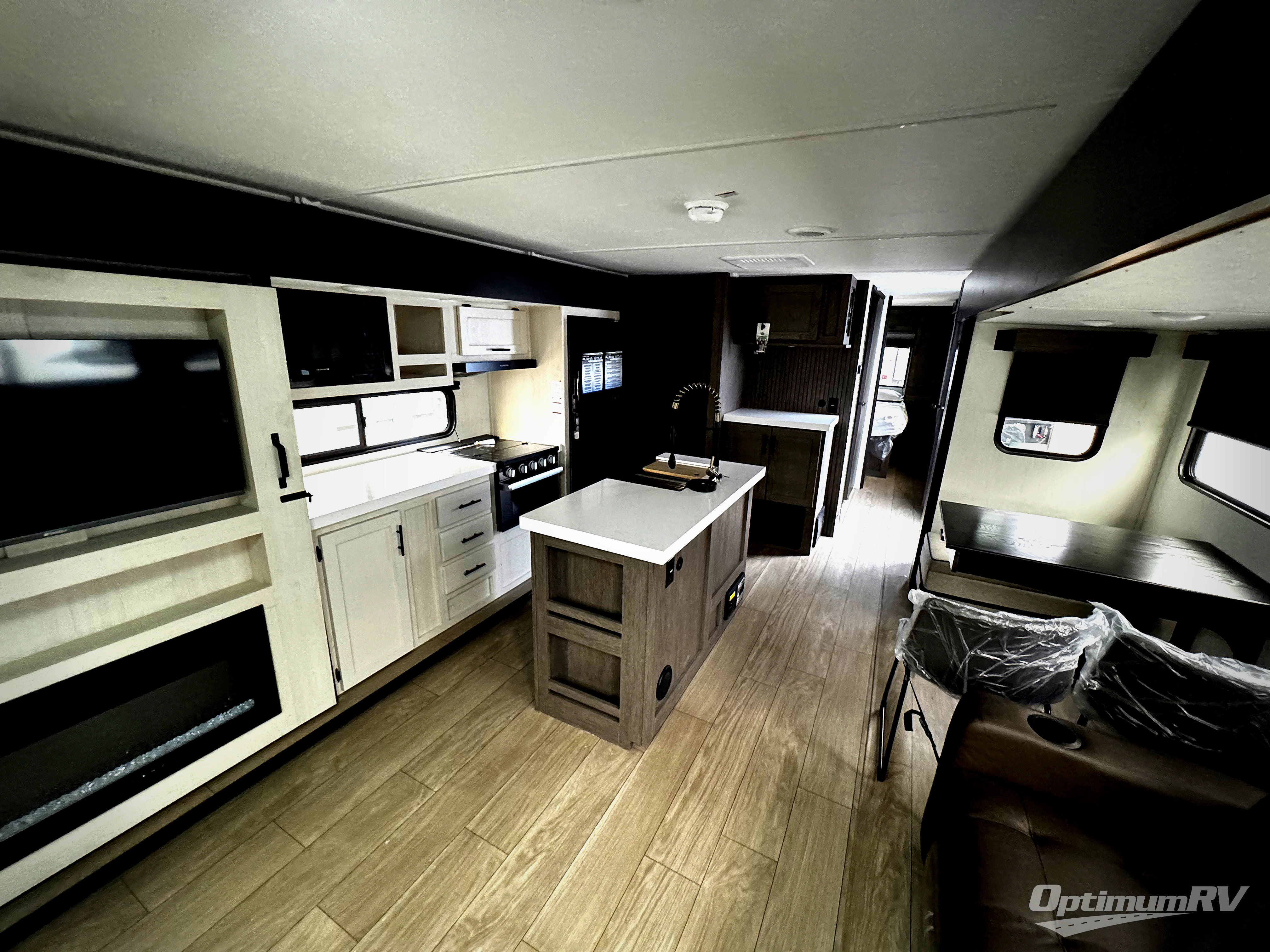 This trailer has it all for maximum comfort and convenience as well as entertainment! The rear living area includes a tri-fold sofa with a rear Pano-Vision window for great views of your campsite, and dual opposing slides widen this area so you can visit with friends. You'll also find theater seating, plus a free-standing table with two chairs and a storage ottoman seat. Enjoy the fireplace on a cool night or when you want a little ambiance while seated inside. Two patio awnings will provide an outdoor living area; just grab your camping chairs from the full pass-through storage. When you want to call it a night, fall quickly to sleep on the queen bed in the front bedroom with easy access to a dual entry bathroom!