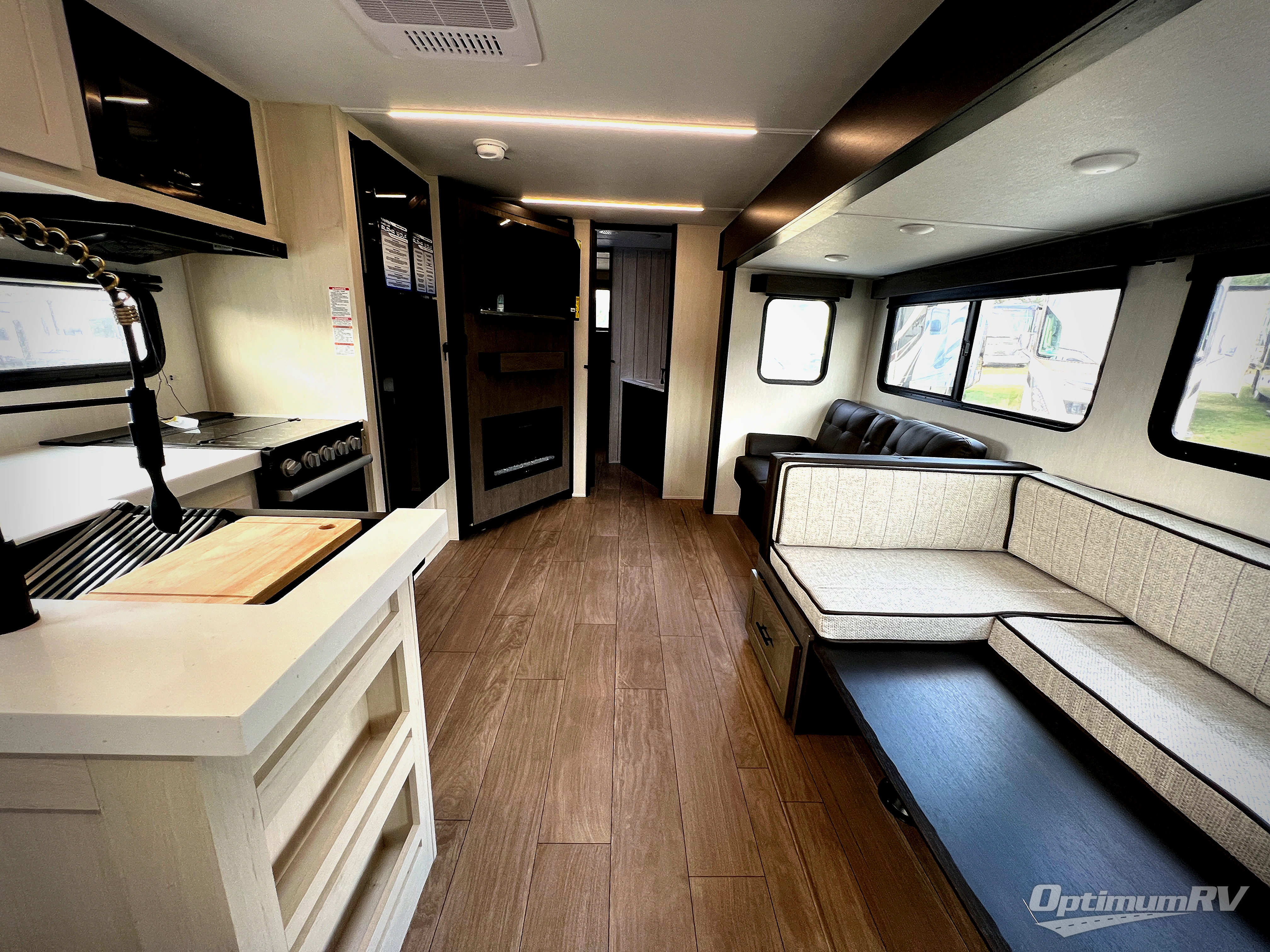 This stunning travel trailer is designed to provide comfort, luxury, and excitement on the open road. Starting with the two flip-up top bunk beds, perfect for kids or adults alike. The tri-fold sofa and jackknife sofa offer additional sleeping space or comfortable spots to lounge, making it easy to accommodate guests. The walk-through bathroom provides convenience and comfort, while the entertainment center with fireplace is a hub for fun and relaxation. Cozy up by the fire on chilly evenings and enjoy quality time with loved ones. The U-shaped dinette is ideal for meals or socializing, and the pantry, 12V refrigerator, microwave, and overhead cabinet ensure that you're well-equipped for cooking and storing food on the go. Featuring a spacious queen bed, convenient nightstands, stylish wardrobes, and overhead head cabinets for storing your belongings, this peaceful sanctuary is the perfect place to rest and recharge after a day of adventure.