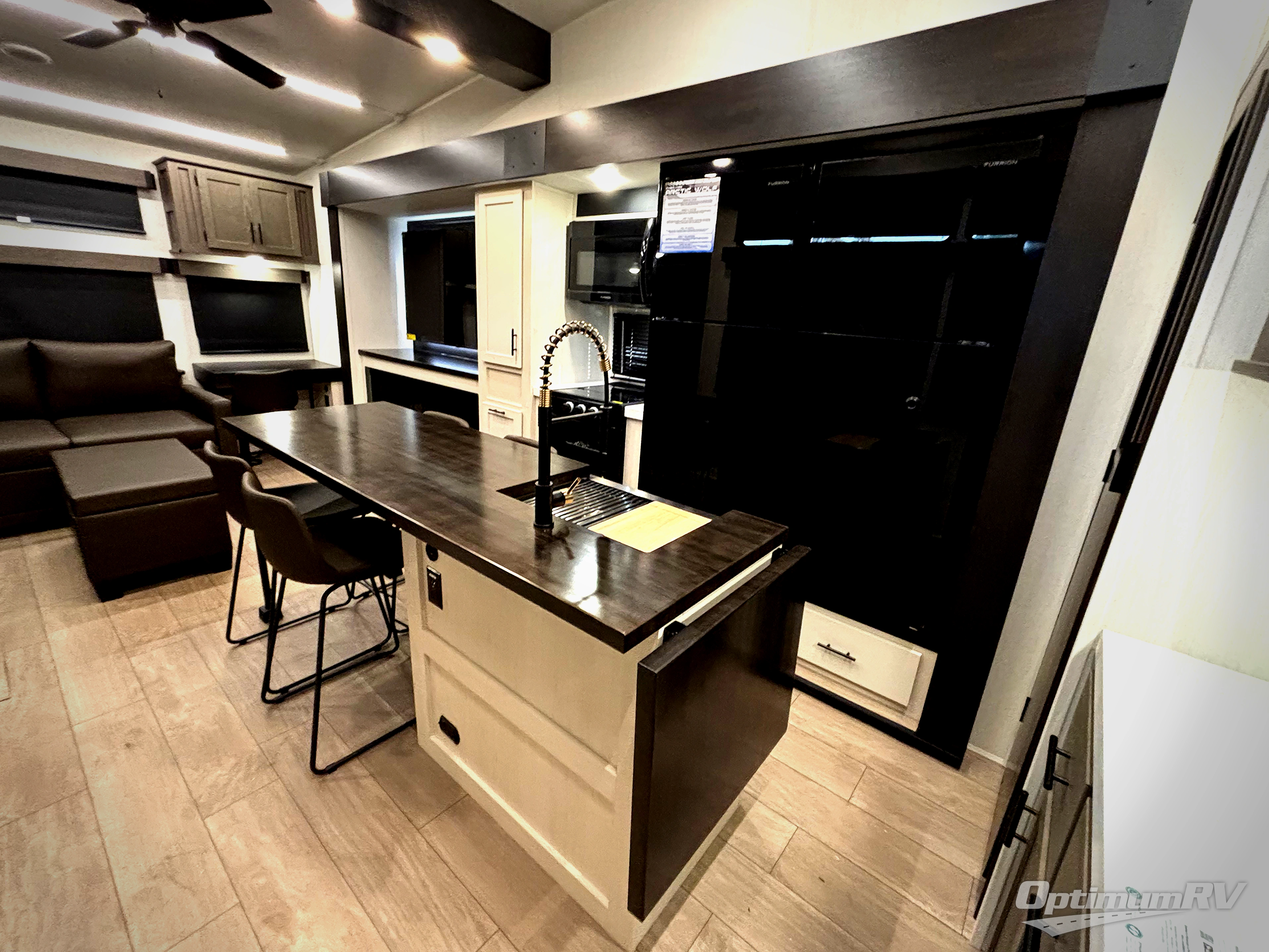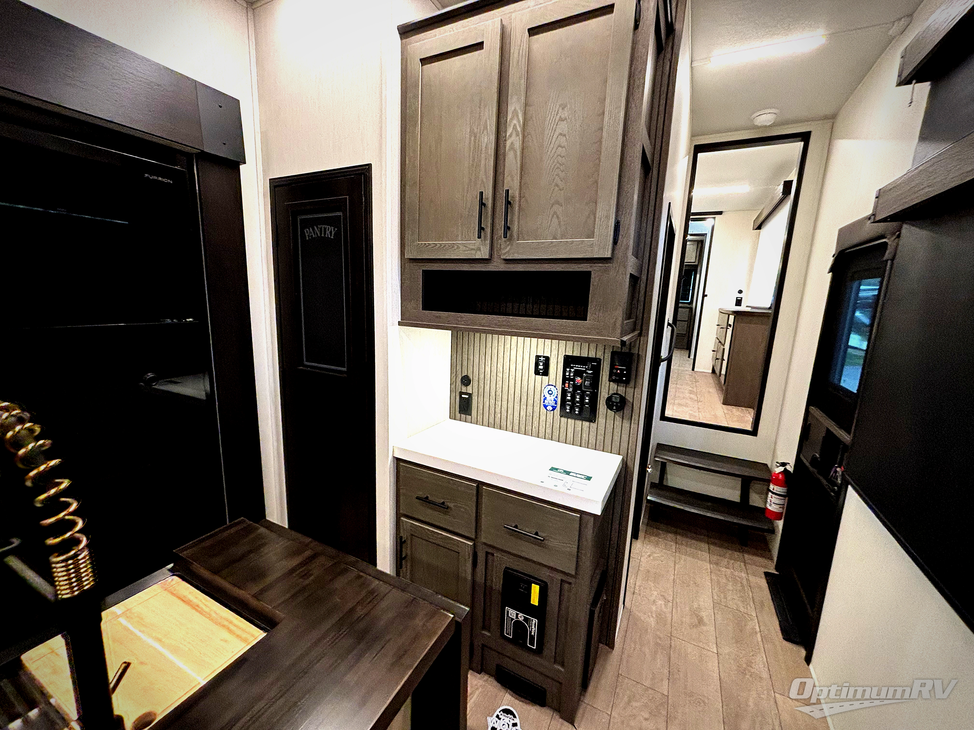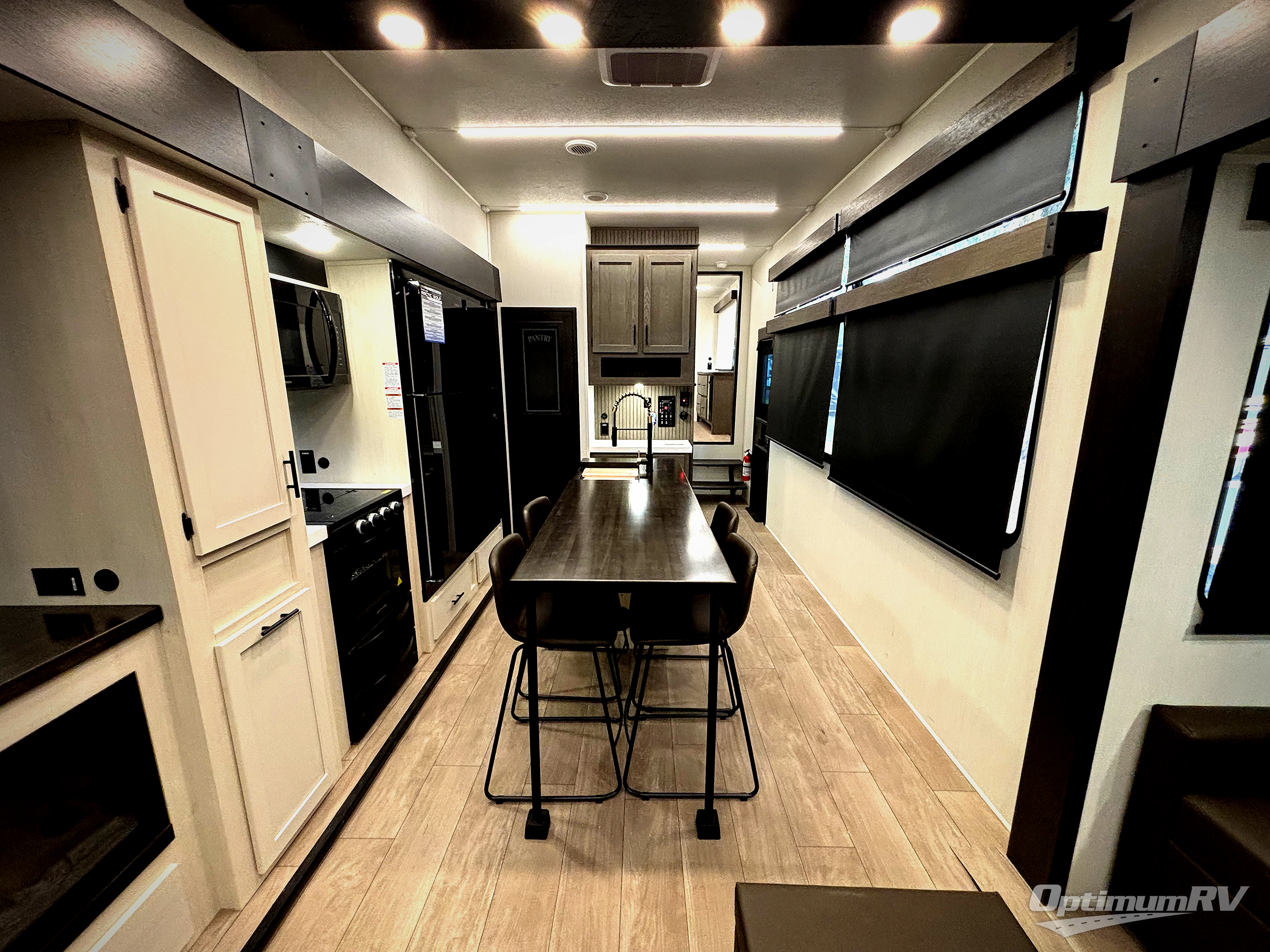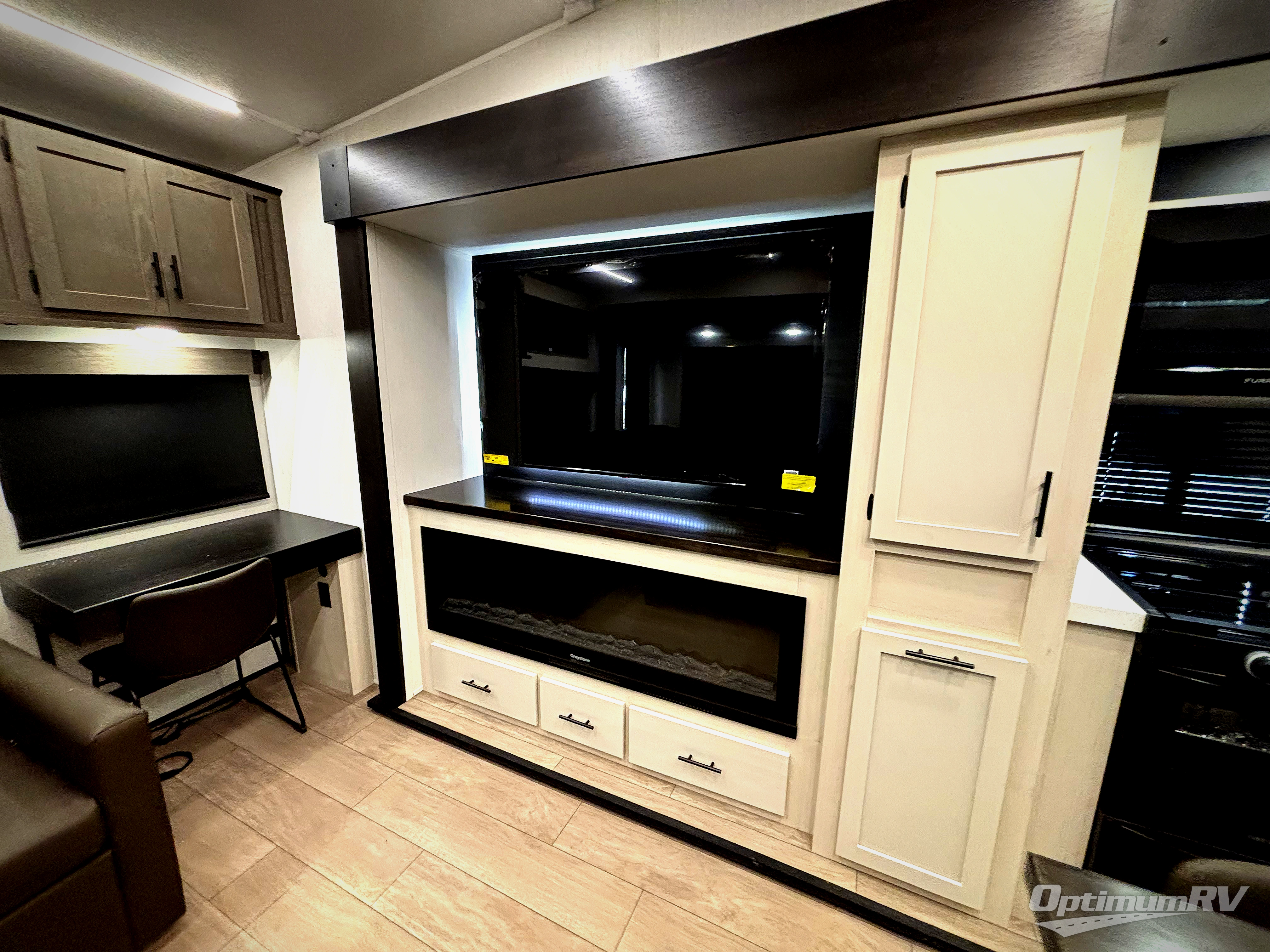 This thoughtfully arranged floorplan is built for extended stays and easy daily living. The rear lounge centers around an L-shaped sectional facing the entertainment wall and fireplace, with a nearby desk for work or hobbies. The kitchen’s island anchors a generous prep area, oversized pantry, and full cooking suite, so meals are simple whether you’re weekending or full-timing. Mid-coach, the guest half bath is convenient for all. Up front, the private bedroom’s king bed slide connects to a spa-style bath with large shower and dressing space, plus a substantial wardrobe to keep clutter out of sight. Outside, enjoy the campsite under dual power awnings that stretch along the patio side.