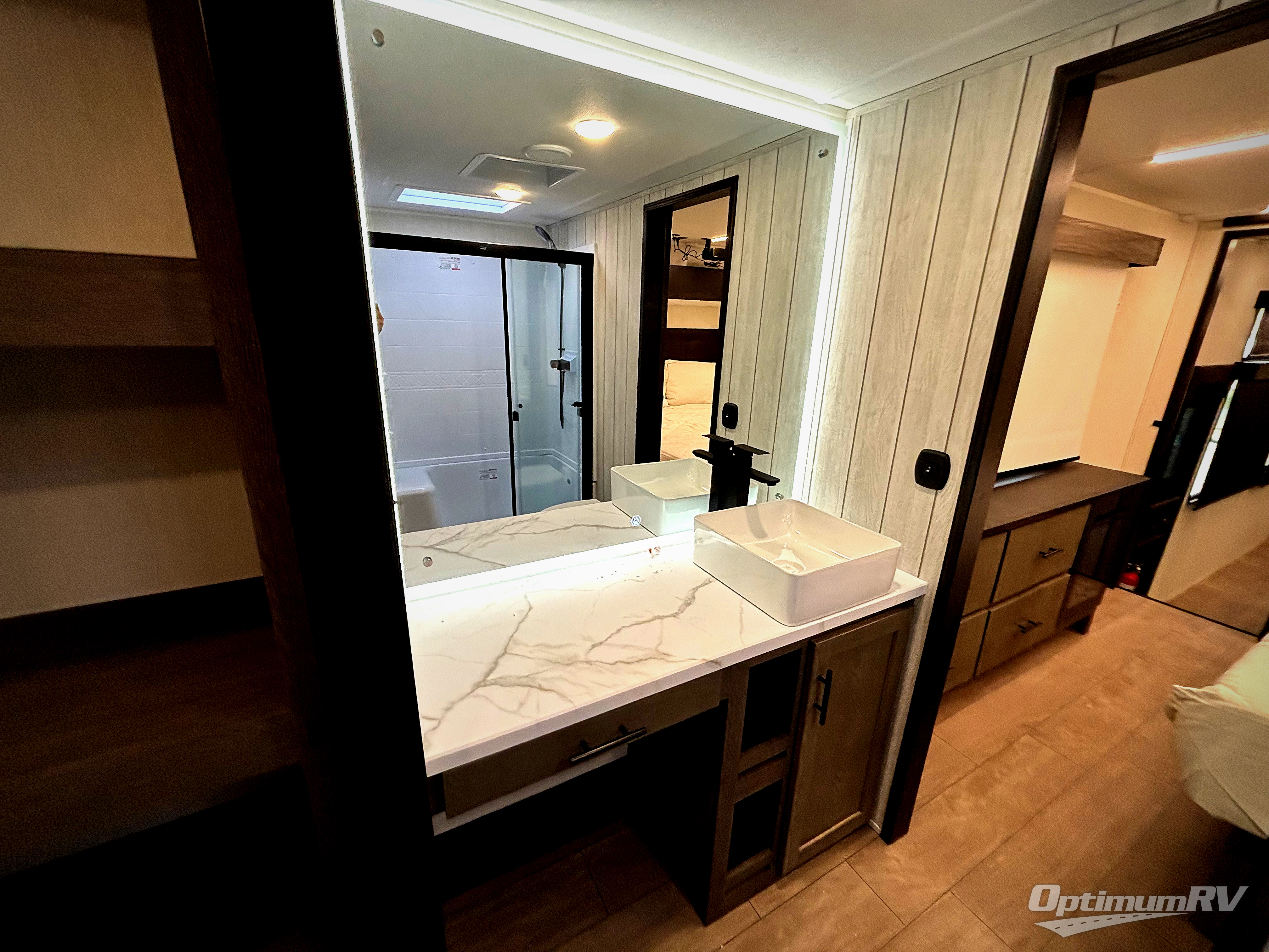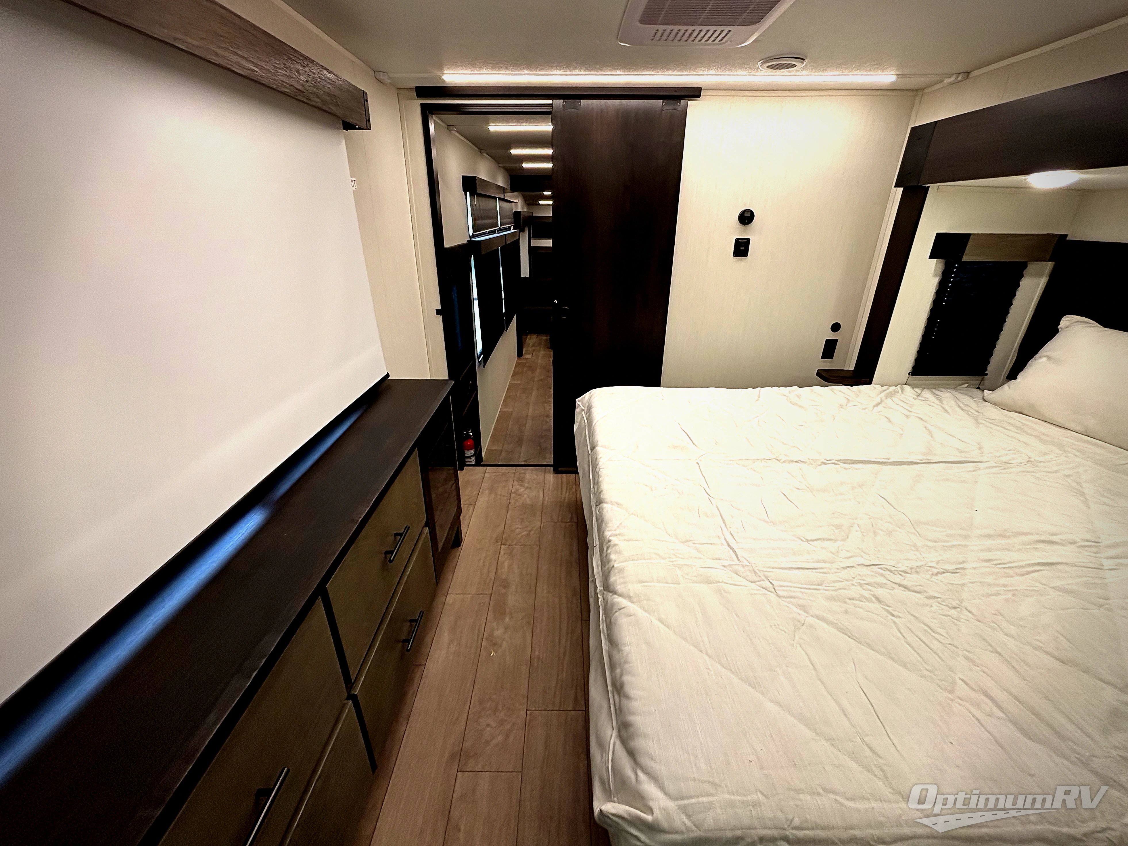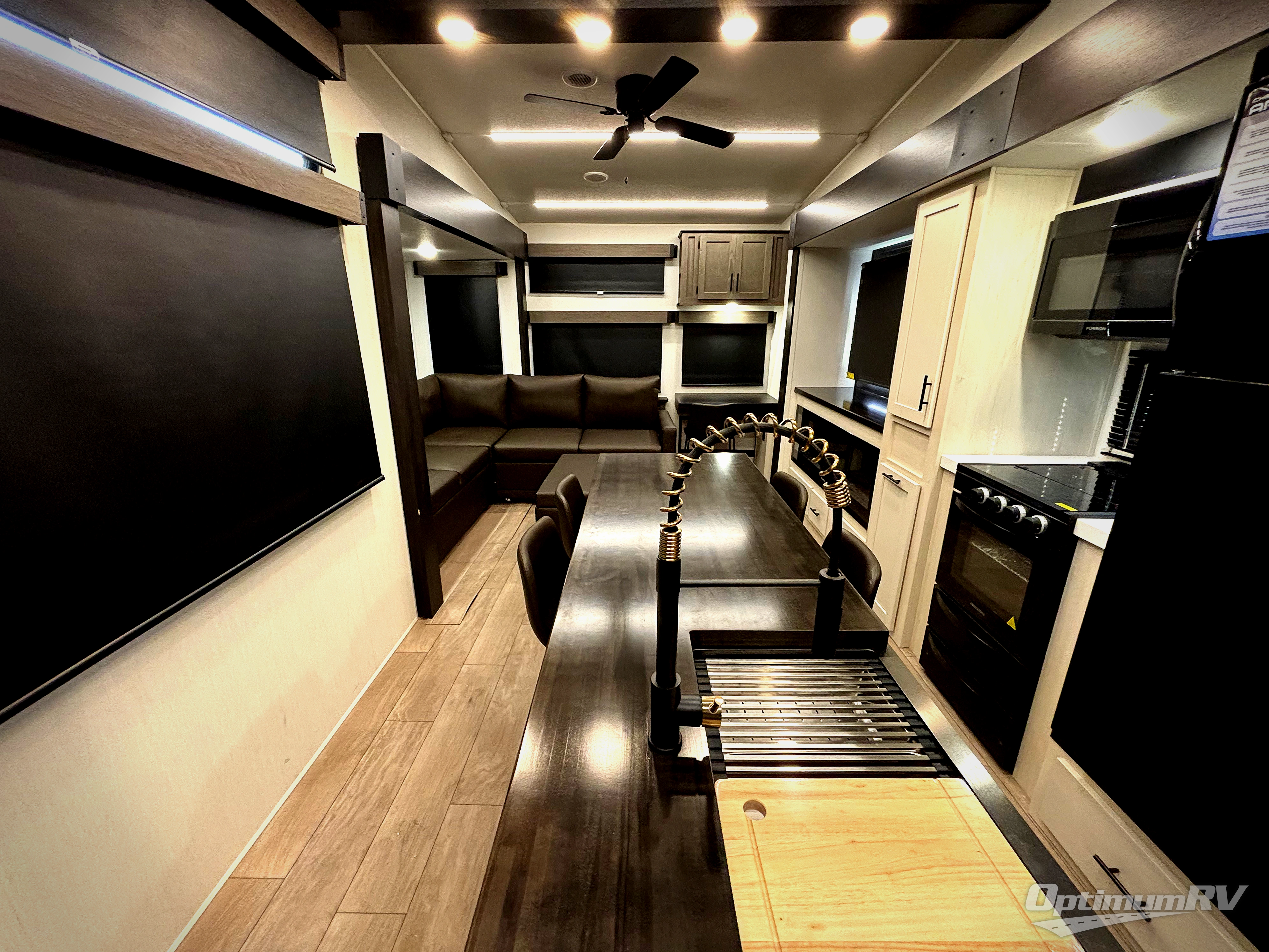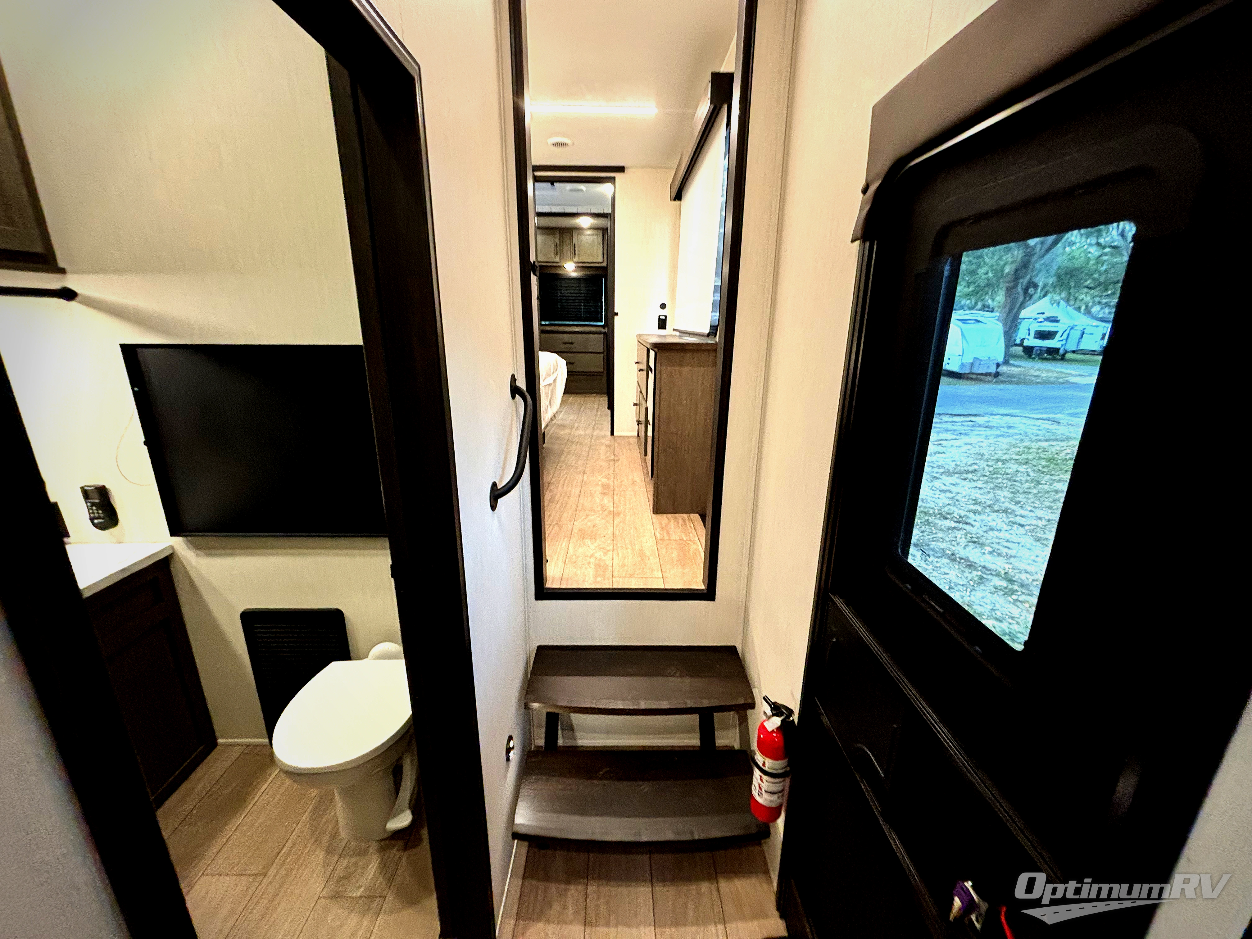 This thoughtfully arranged floorplan is built for extended stays and easy daily living. The rear lounge centers around an L-shaped sectional facing the entertainment wall and fireplace, with a nearby desk for work or hobbies. The kitchen’s island anchors a generous prep area, oversized pantry, and full cooking suite, so meals are simple whether you’re weekending or full-timing. Mid-coach, the guest half bath is convenient for all. Up front, the private bedroom’s king bed slide connects to a spa-style bath with large shower and dressing space, plus a substantial wardrobe to keep clutter out of sight. Outside, enjoy the campsite under dual power awnings that stretch along the patio side.