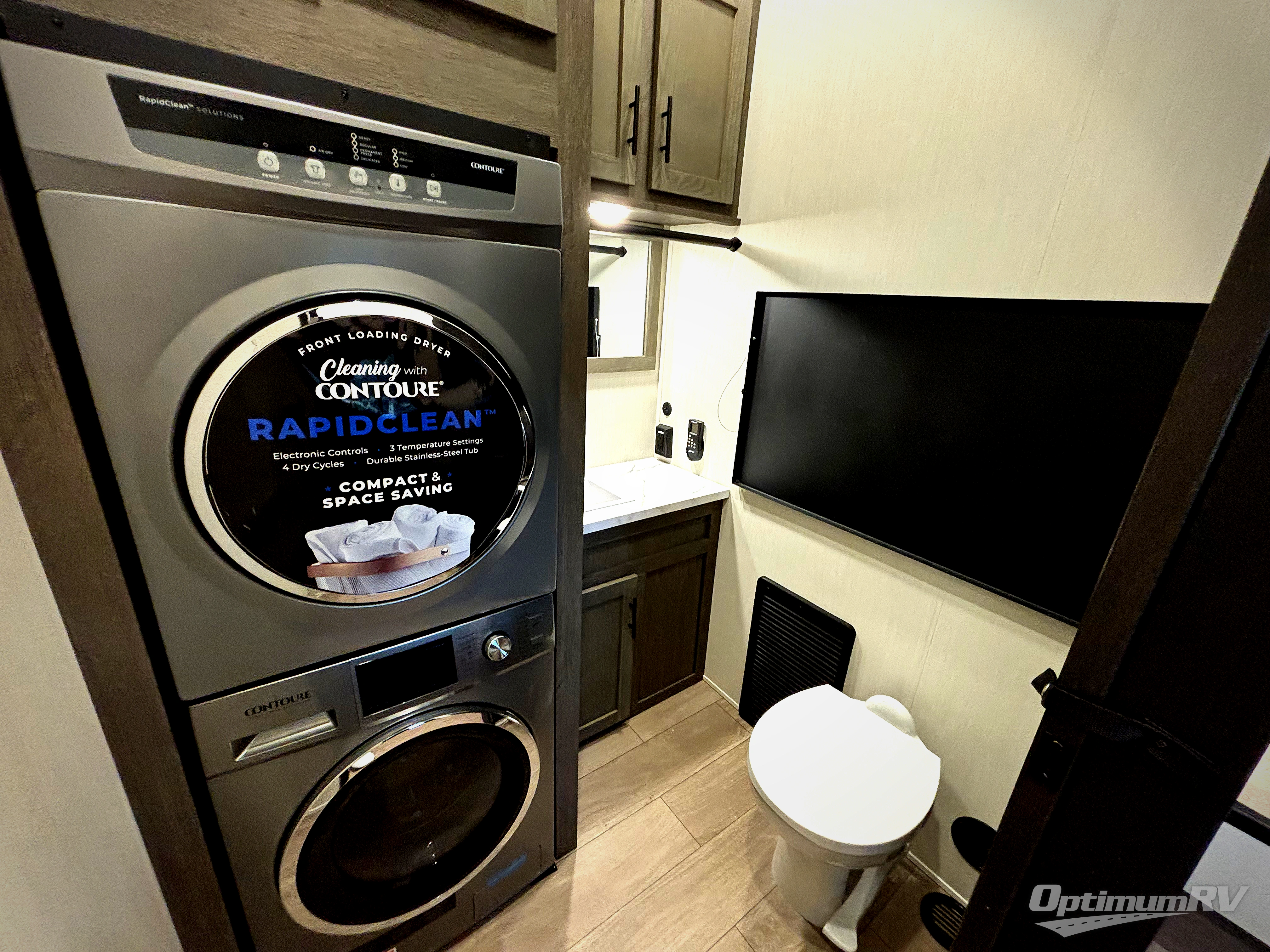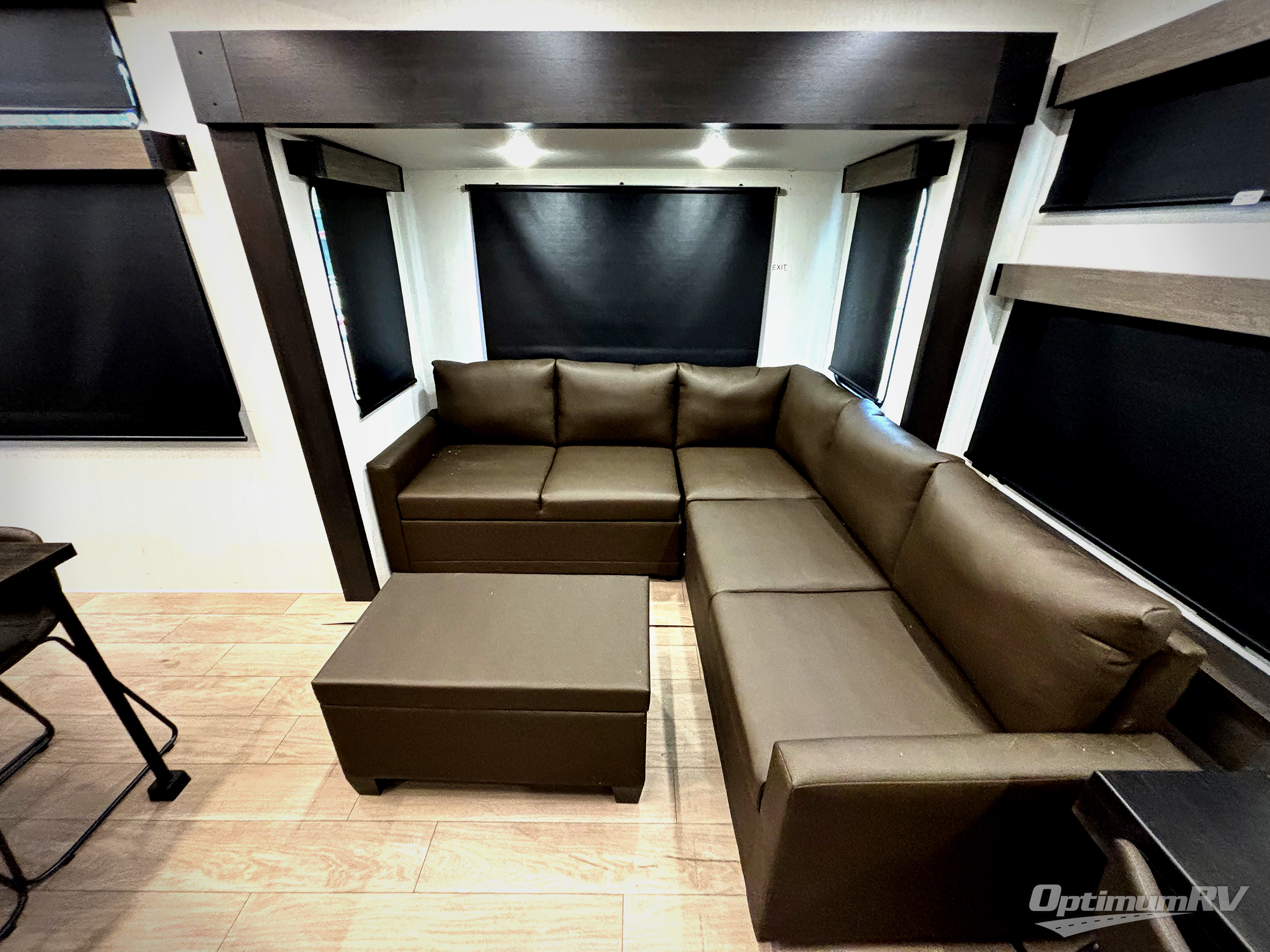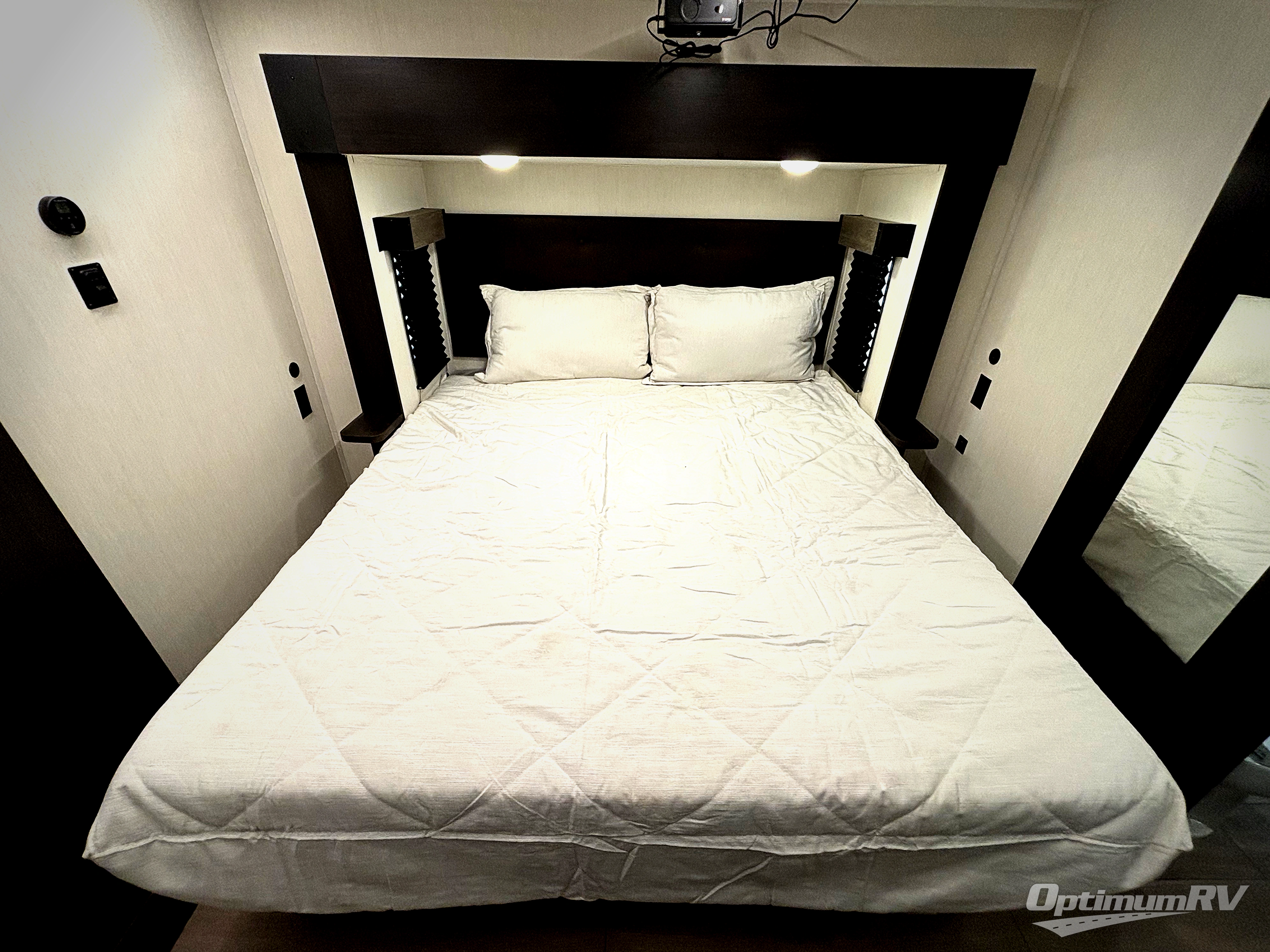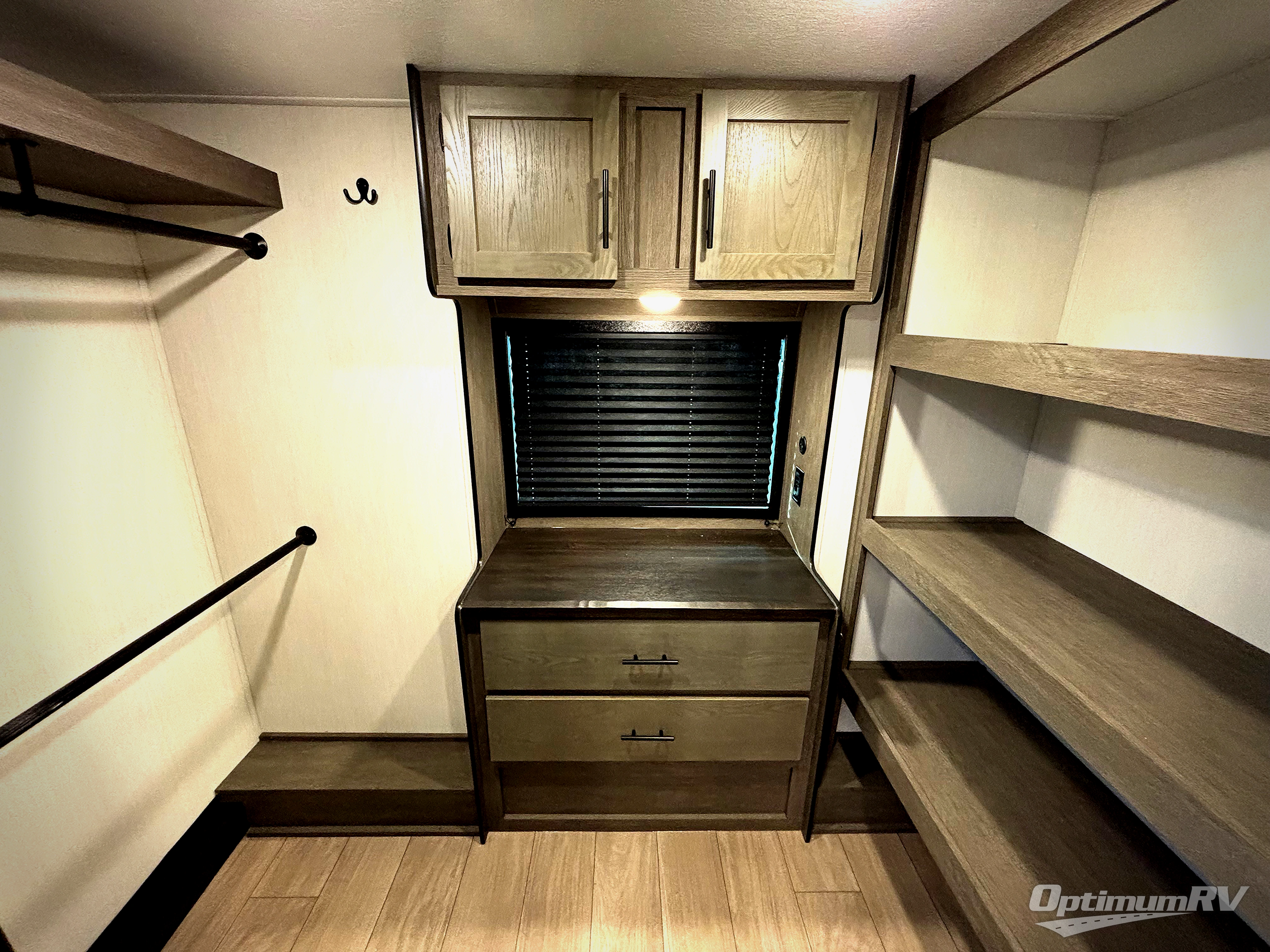 This thoughtfully arranged floorplan is built for extended stays and easy daily living. The rear lounge centers around an L-shaped sectional facing the entertainment wall and fireplace, with a nearby desk for work or hobbies. The kitchen’s island anchors a generous prep area, oversized pantry, and full cooking suite, so meals are simple whether you’re weekending or full-timing. Mid-coach, the guest half bath is convenient for all. Up front, the private bedroom’s king bed slide connects to a spa-style bath with large shower and dressing space, plus a substantial wardrobe to keep clutter out of sight. Outside, enjoy the campsite under dual power awnings that stretch along the patio side.