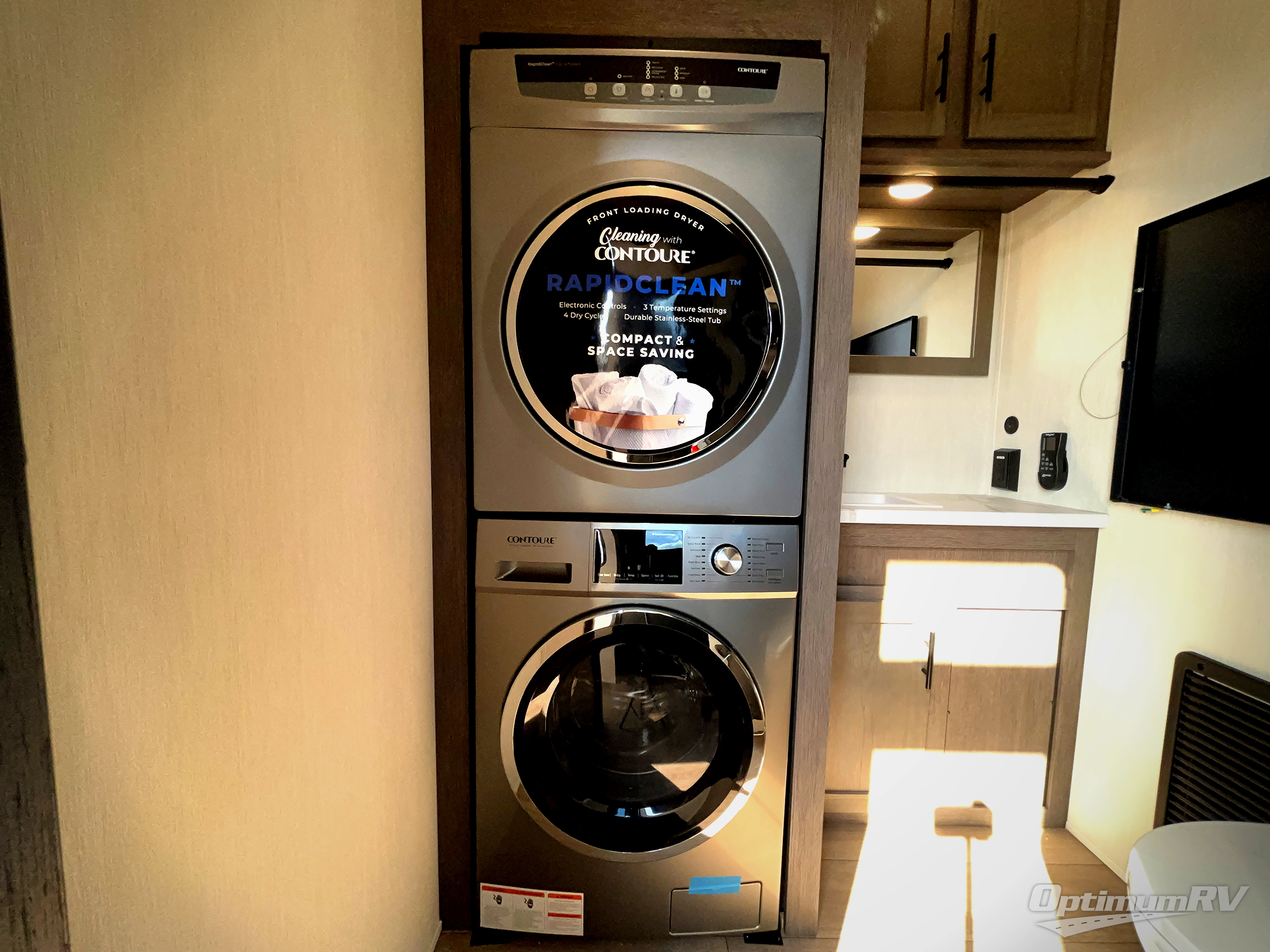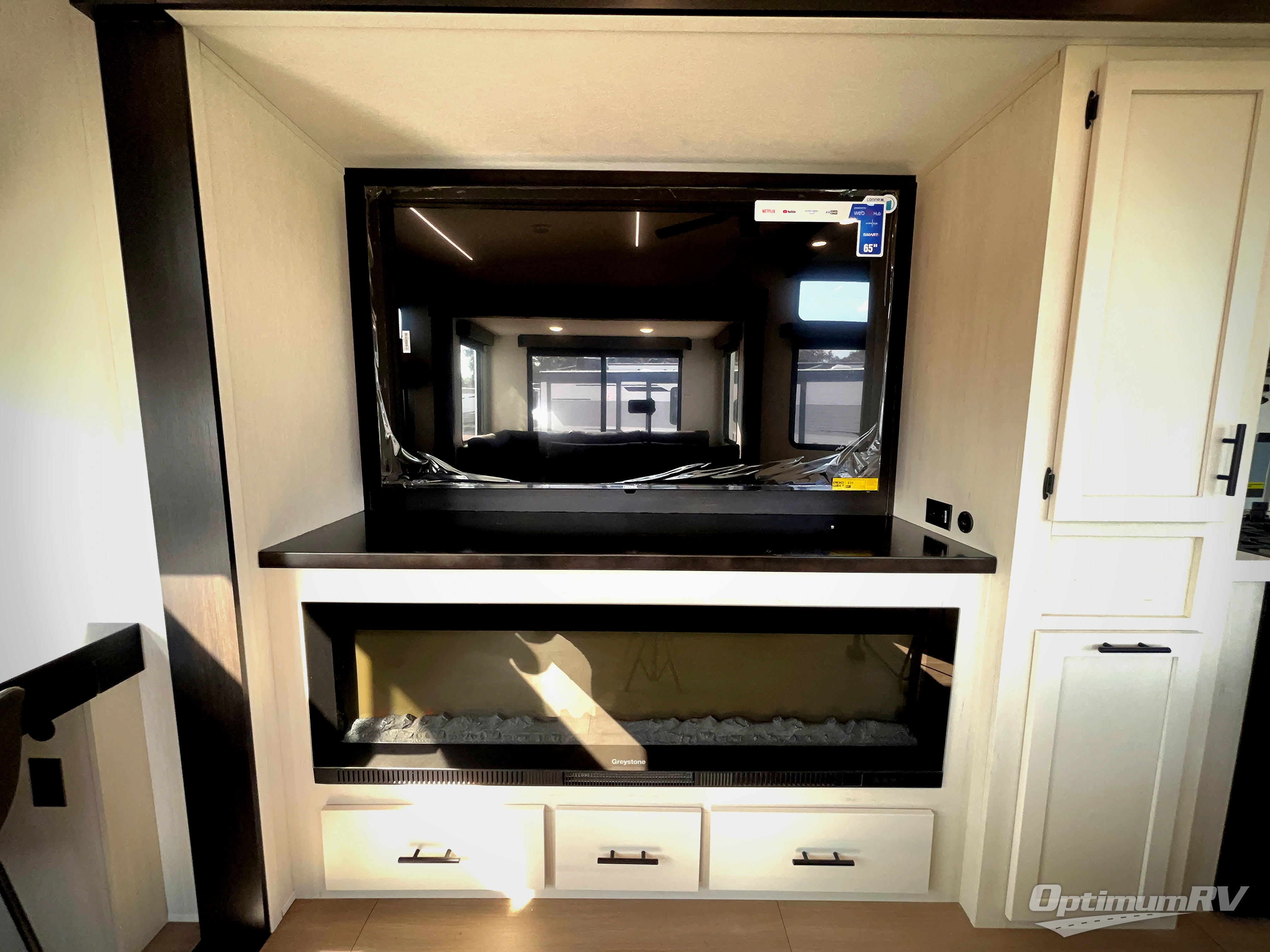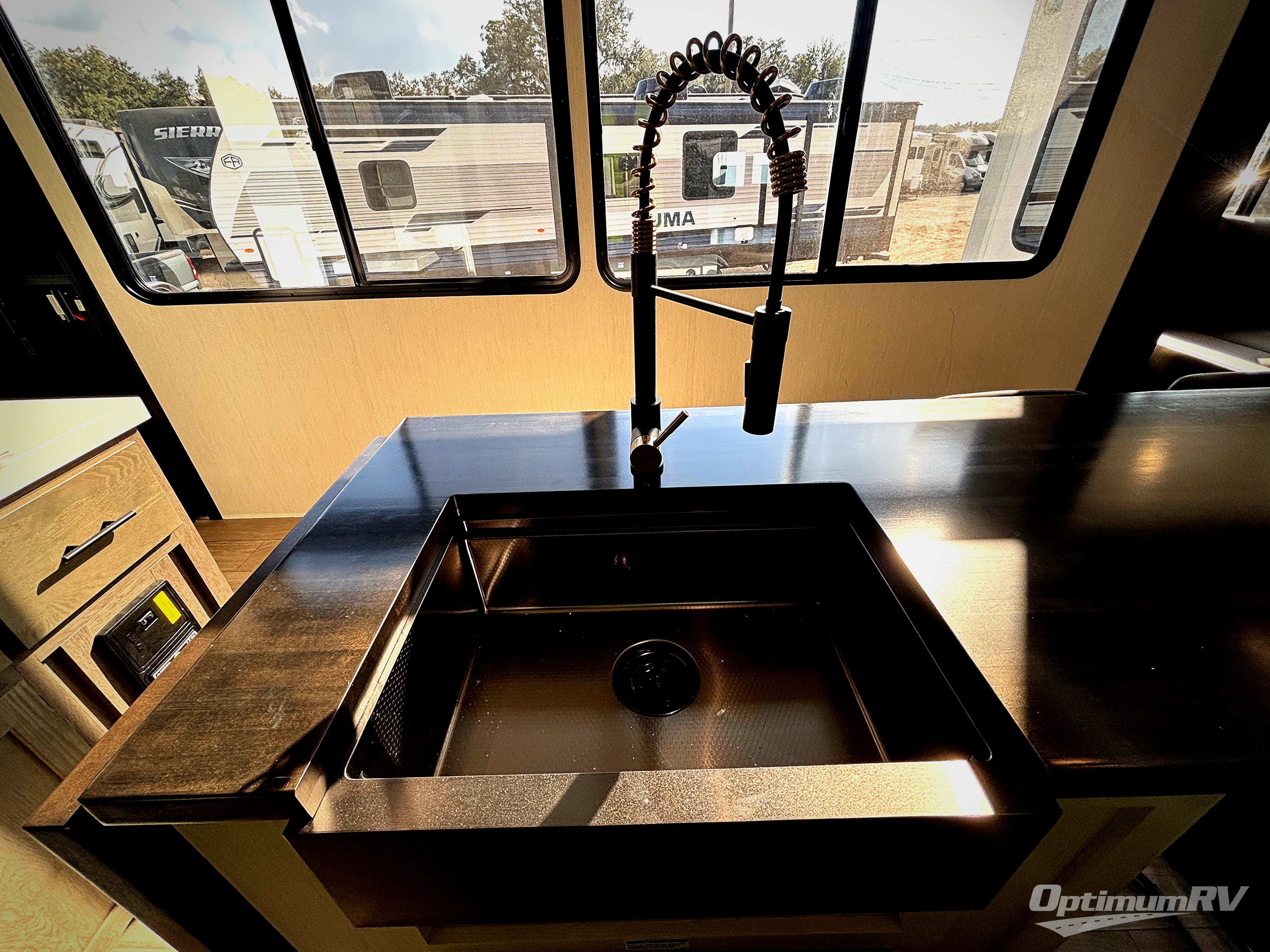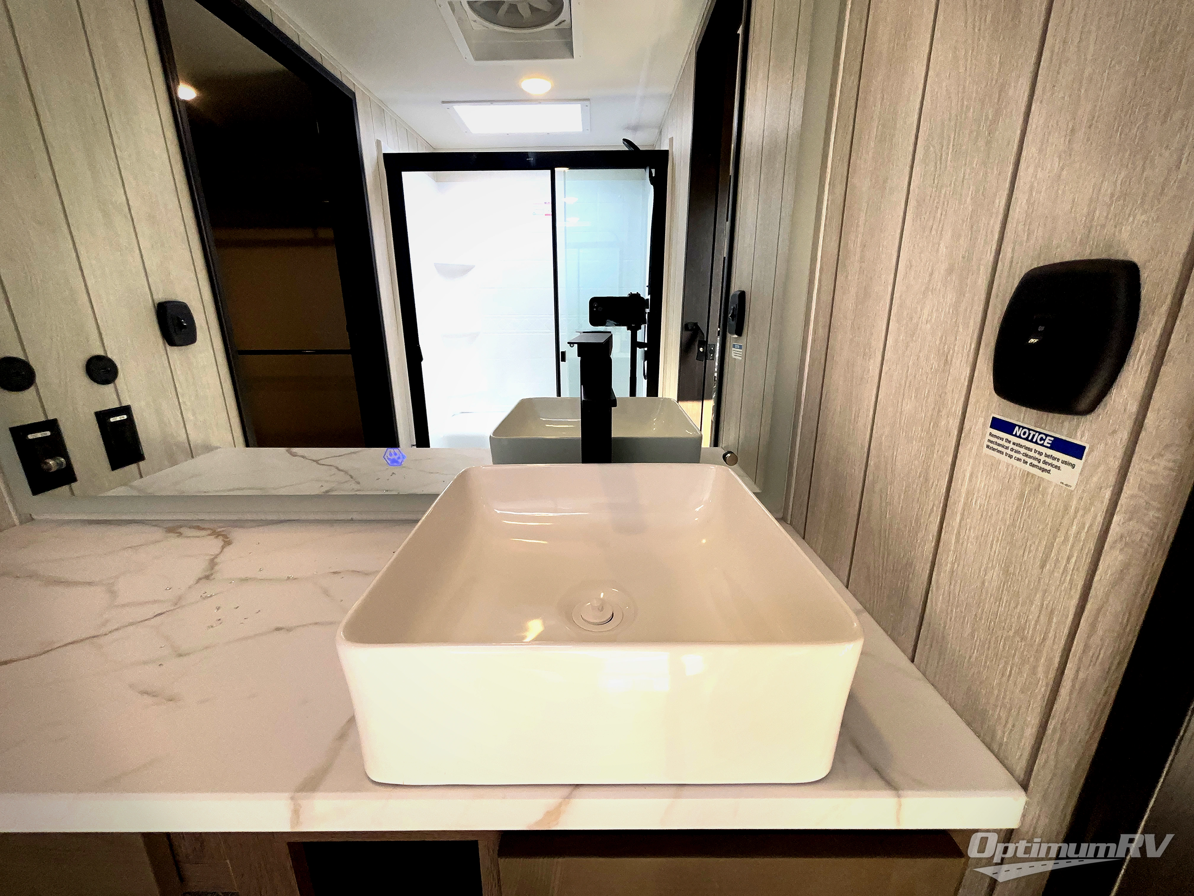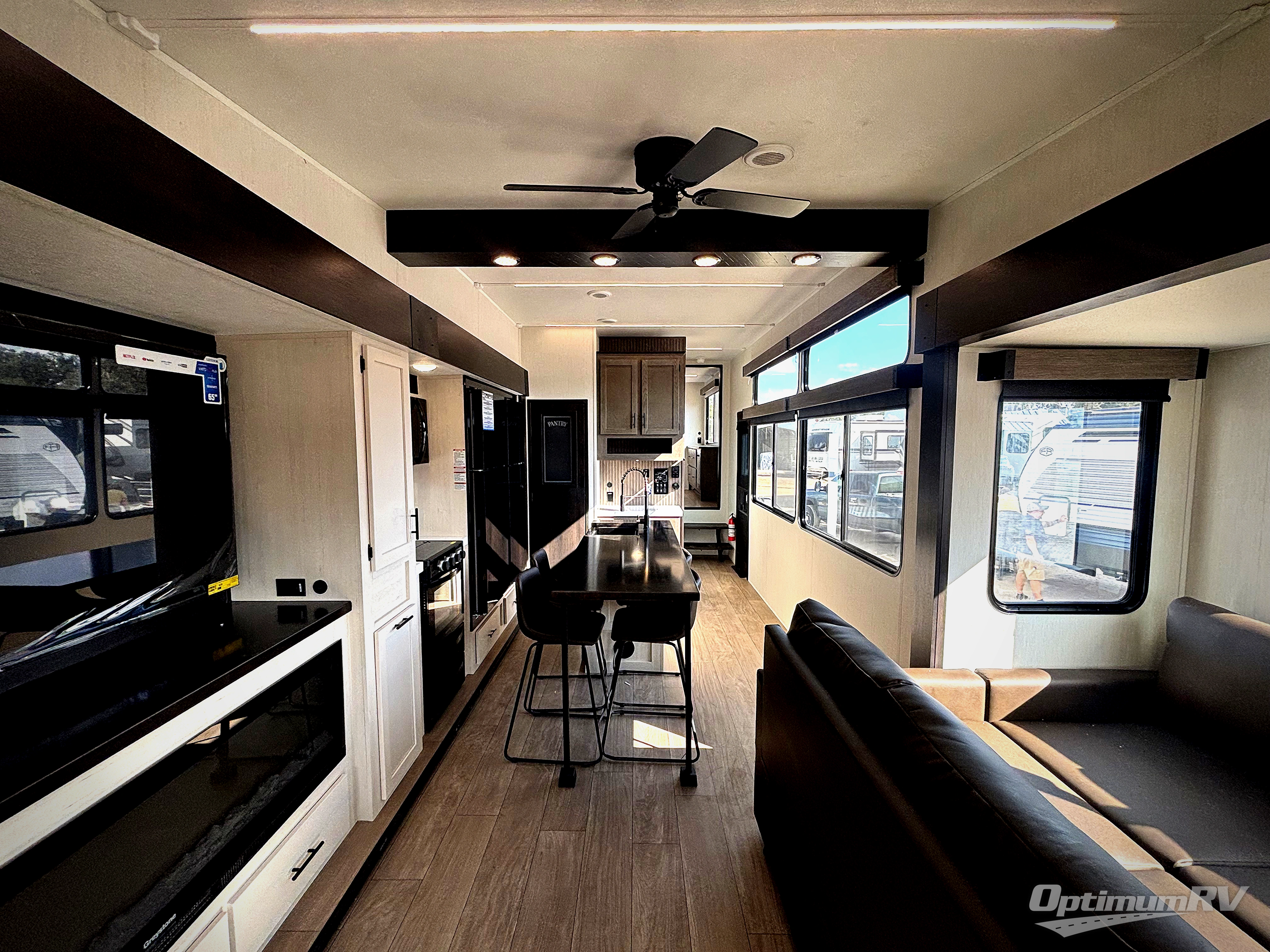 This thoughtfully arranged floorplan is built for extended stays and easy daily living. The rear lounge centers around an L-shaped sectional facing the entertainment wall and fireplace, with a nearby desk for work or hobbies. The kitchen’s island anchors a generous prep area, oversized pantry, and full cooking suite, so meals are simple whether you’re weekending or full-timing. Mid-coach, the guest half bath is convenient for all. Up front, the private bedroom’s king bed slide connects to a spa-style bath with large shower and dressing space, plus a substantial wardrobe to keep clutter out of sight. Outside, enjoy the campsite under dual power awnings that stretch along the patio side.