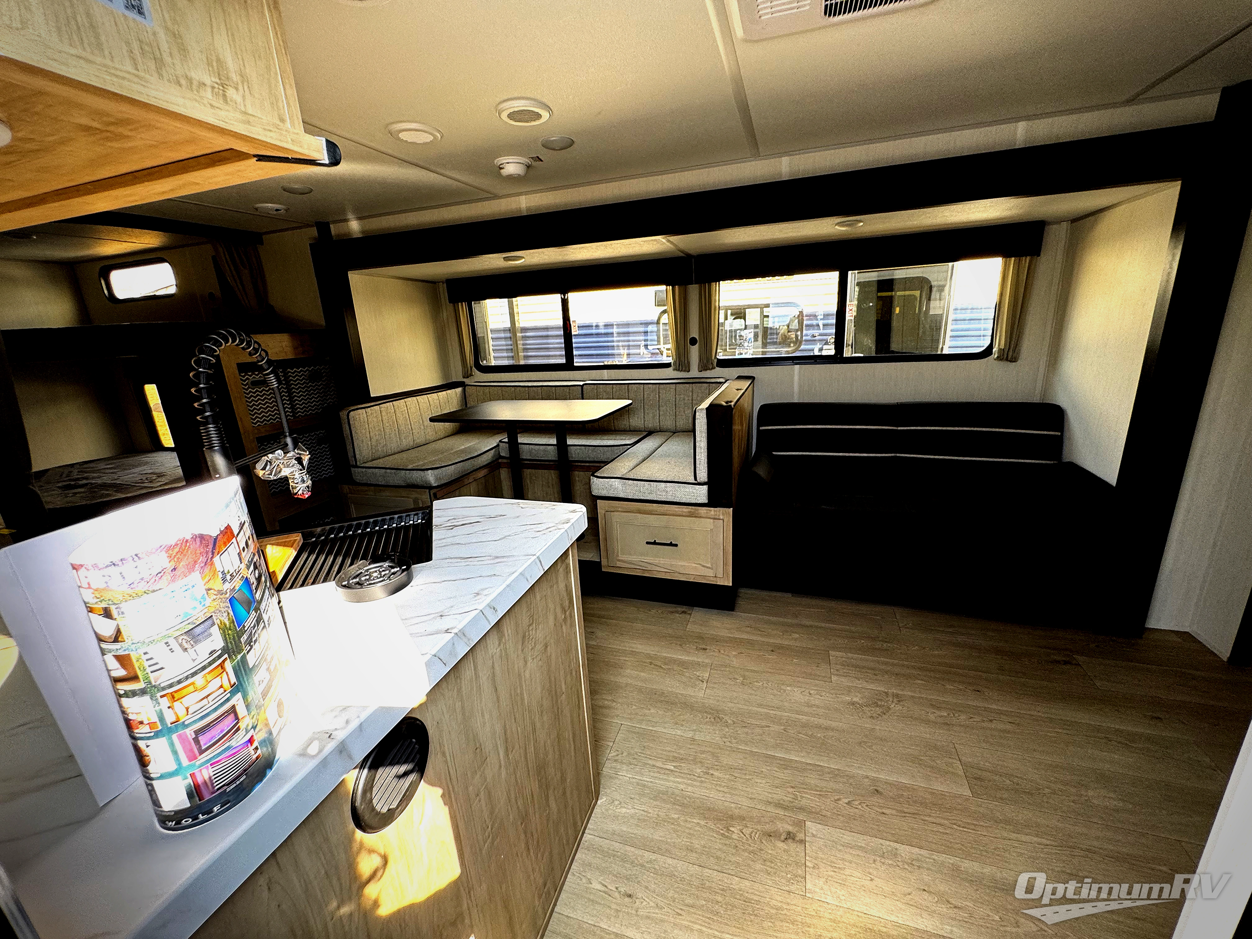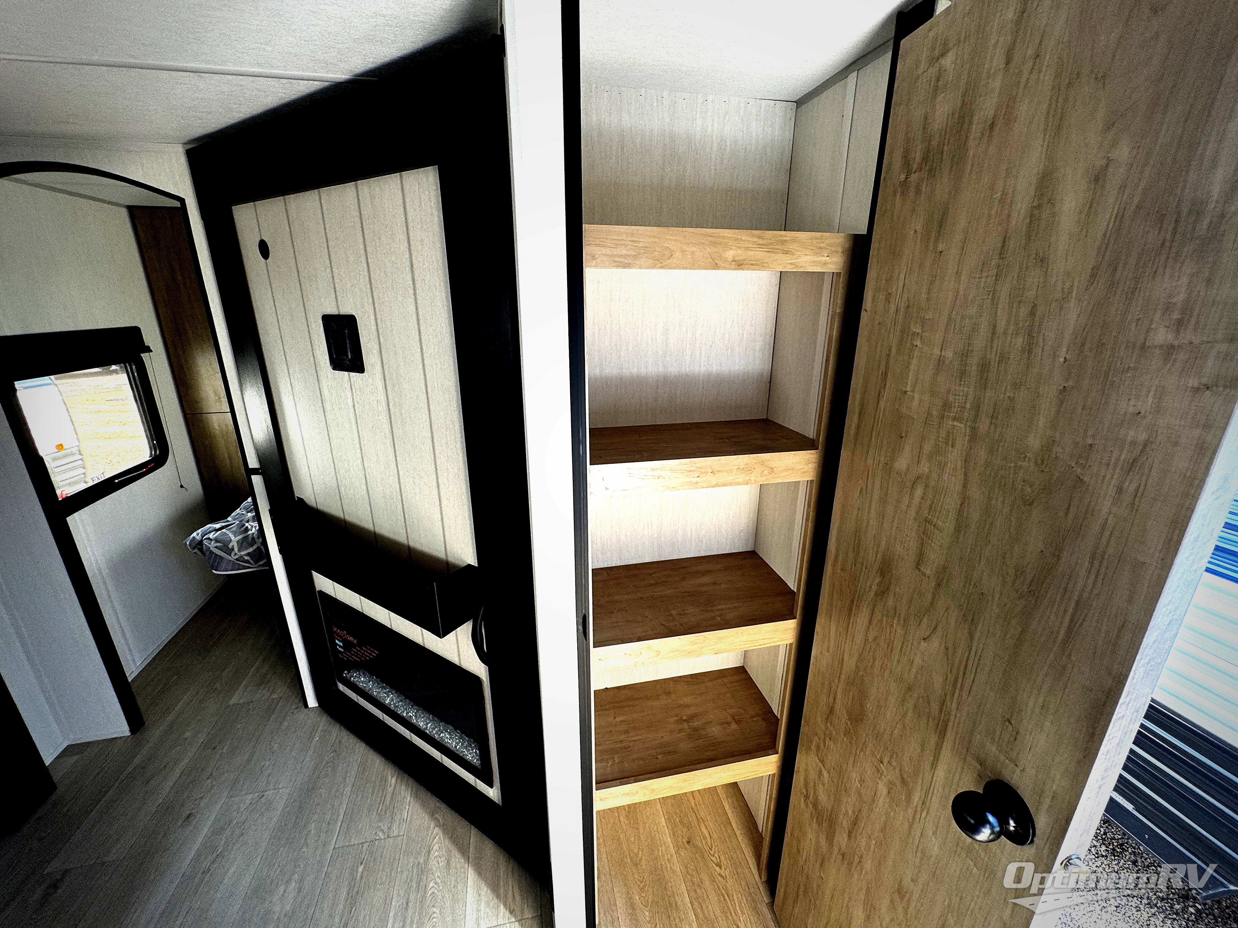 If you've been searching for a travel trailer with a larger sleeping capacity to camp with friends, this is the one! There are double-size bunks in the rear corner, and the full bath with its own exterior entry door is in the other rear corner for easy nighttime use. Up front, an RV king bed in the private bedroom is sure to bring a great night's rest, and you'll find a bedside wardrobe to keep your clothes picked up off of the floor. In the morning, everyone can meet in the main living room that includes a large slide out, U-shaped dinette, sofa, and a fireplace with a hidden pantry behind it for smart storage solutions. An outside kitchen will allow you to get some fresh air as you make dinner, but there's also a full interior kitchen if the weather isn't cooperating. Additional outdoor features include a rear storage rack, an outside TV mount, and a 15' awning for some shade!