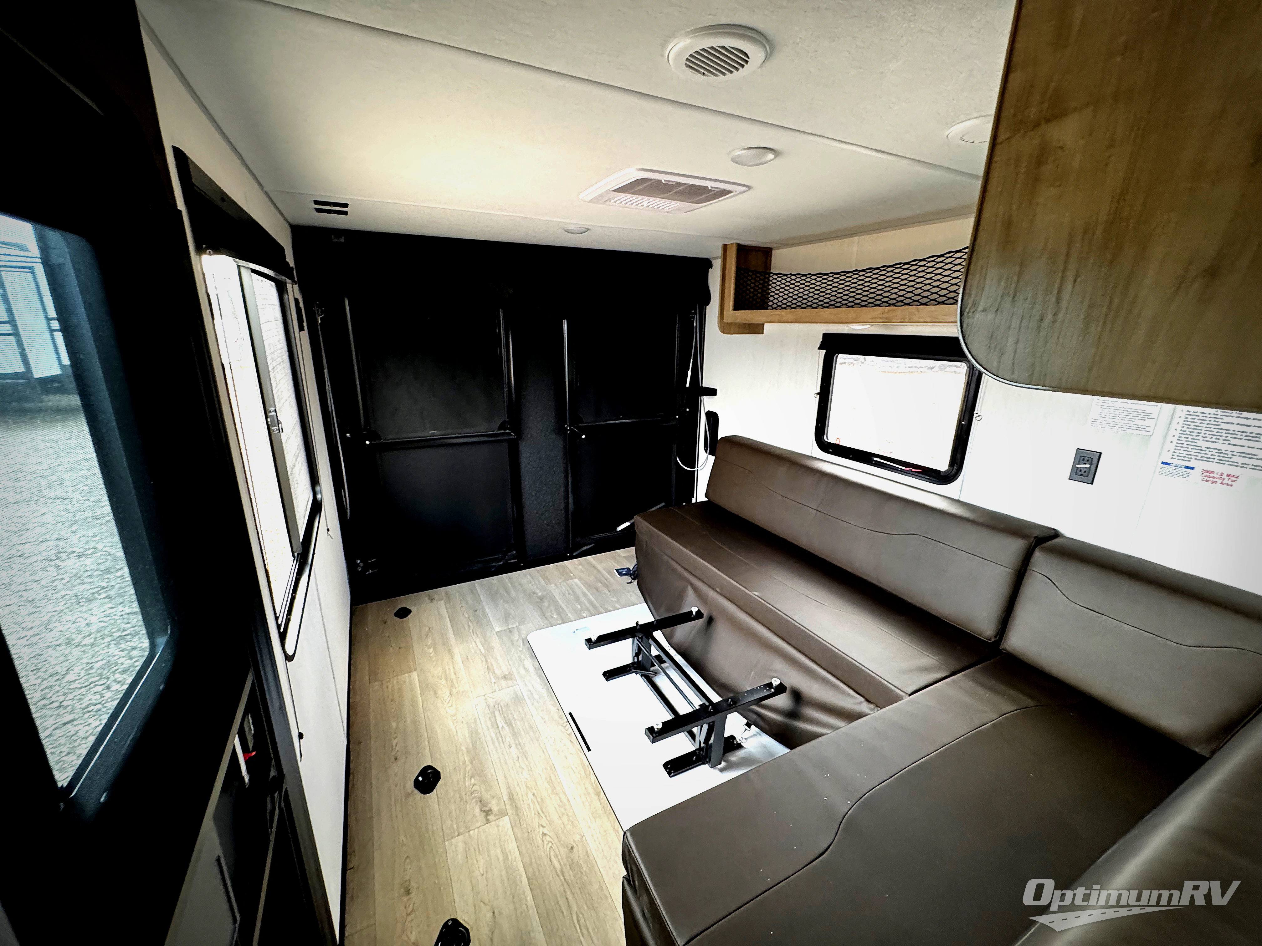 This Cherokee Grey Wolf toy hauler is perfect for those who are concerned about keeping the fuel smells and grime from entering the main living area. In this unit you can enjoy the separation with a door and the walk-though bath. In the cargo area, you will have plenty of space for hauling all of your favorite toys. This area also features a fold-down sofa with a removable table that is great for your thrill seekers to come in for a break from riding. It also allows quick access into the bathroom without having to wander through the entire main living area where you are likely to leave a trail behind. After a full day of playing hard, you can get cleaned up and head into the main kitchen area where you will enjoy a U-shaped dinette. A full kitchen allows you to refuel your body, and there is an entertainment center with a fireplace and hidden shelves behind for books or movies. The front private bedroom will give you your own space at night, and you'll love the RV king bed!