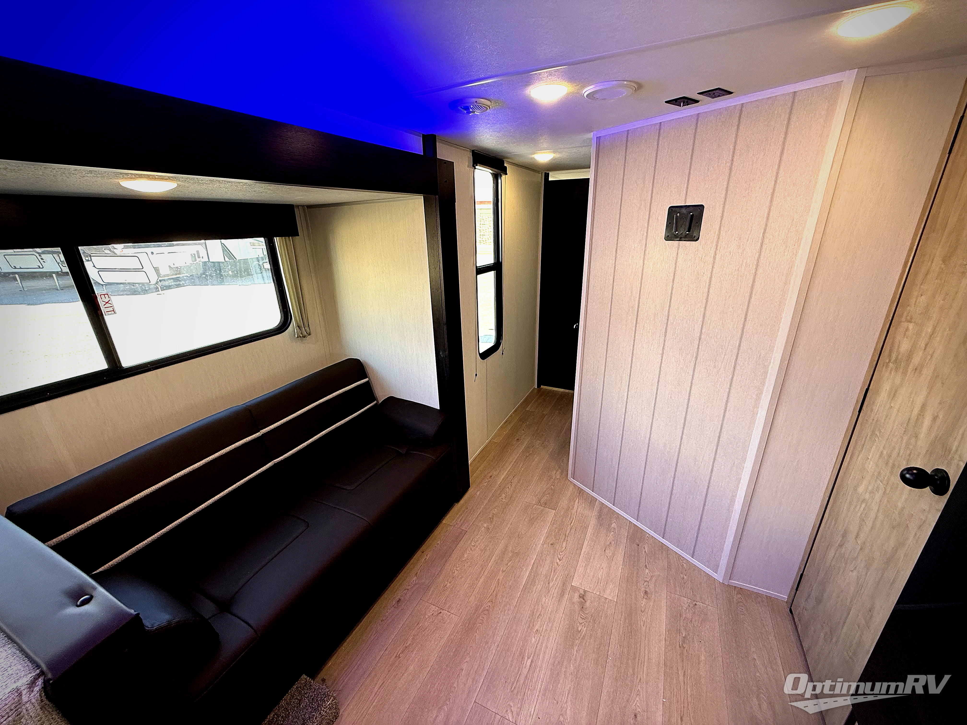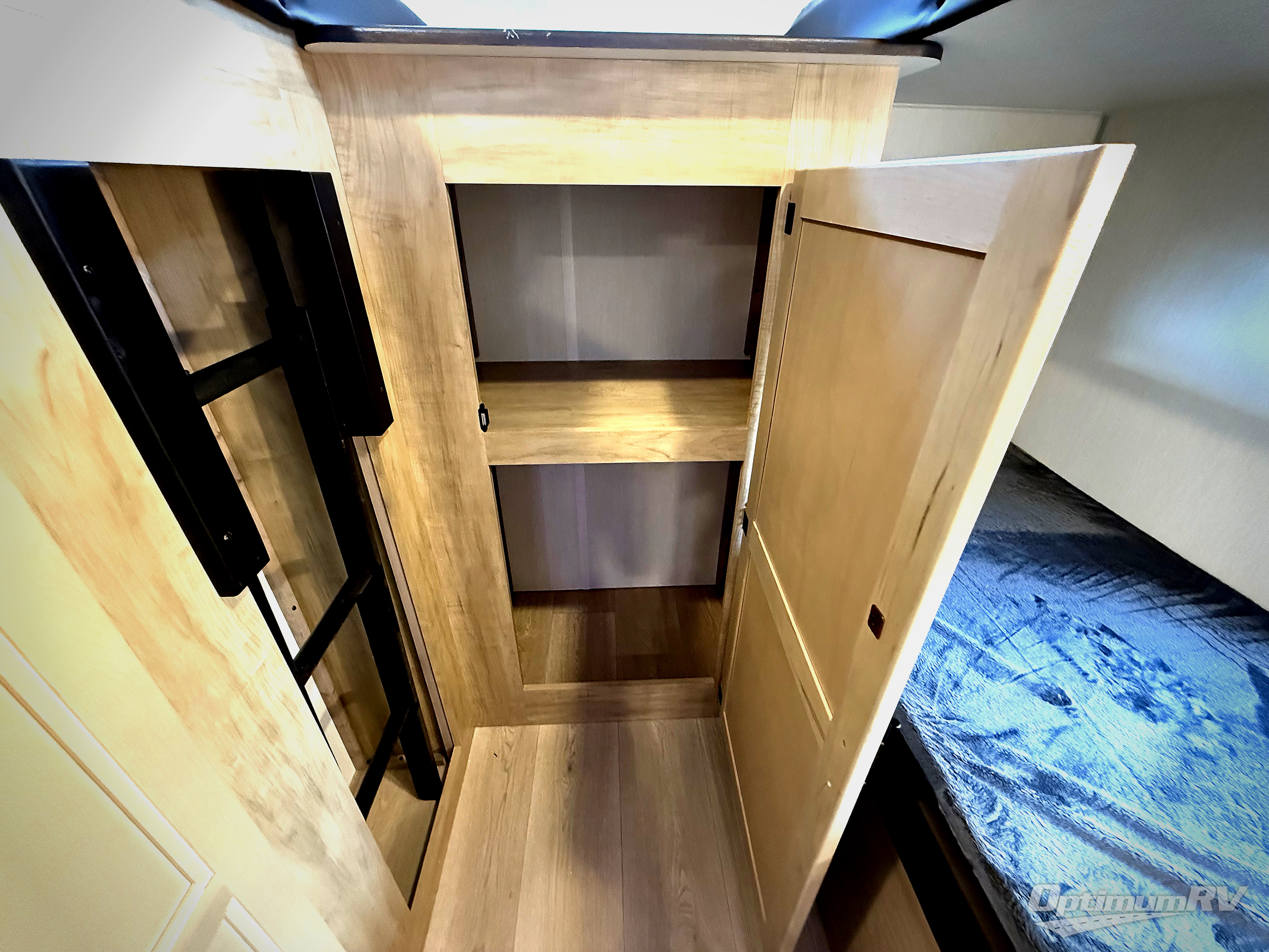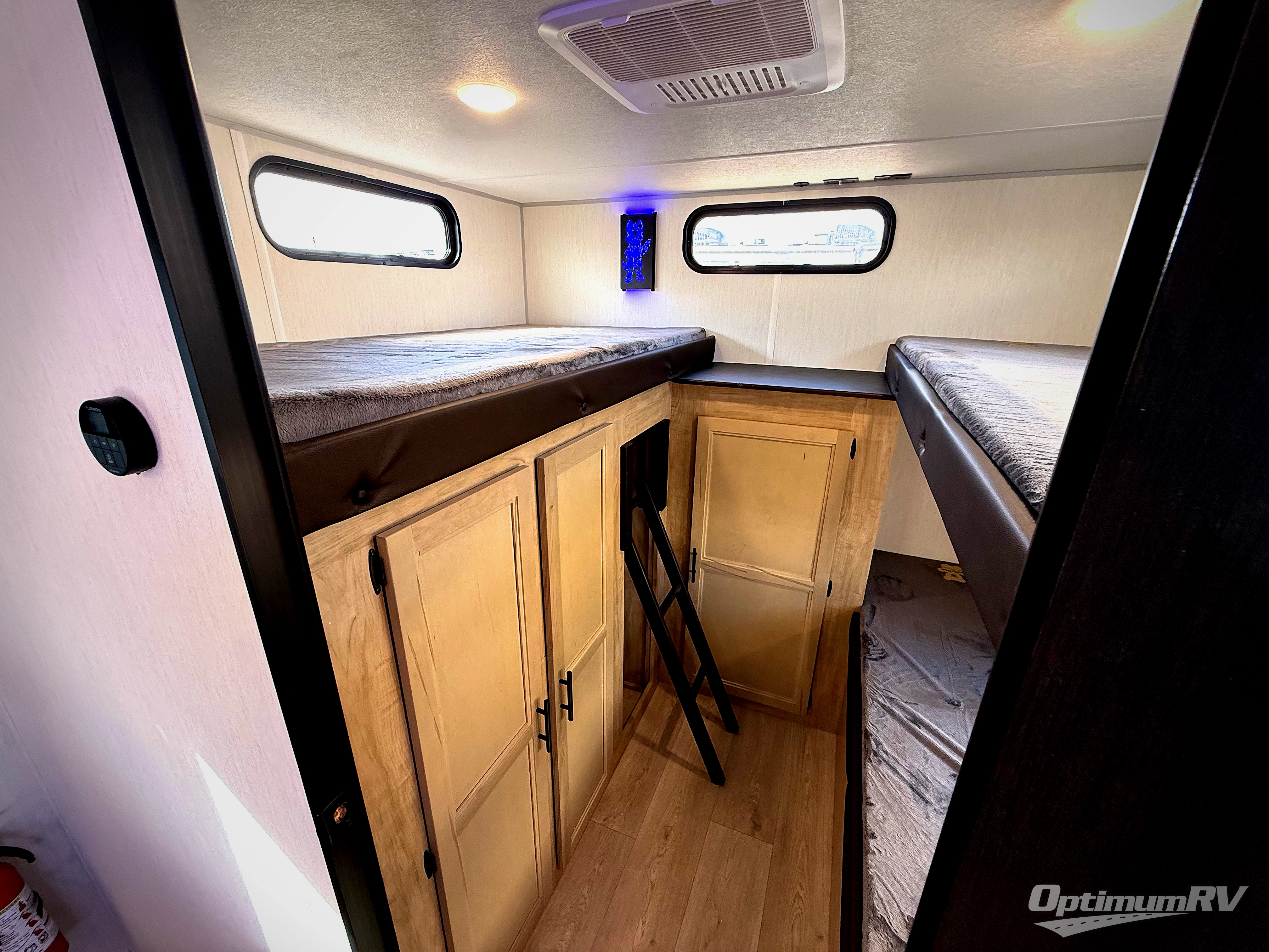 Your larger family will love spending weekends away with this Cherokee Grey Wolf travel trailer as their home away from home. This model offers lots of sleeping space with three bunk beds in the rear private bunkhouse. In the front, there is a master suite with a wardrobe beside RV king bed, and it even has private access to the dual-entry bath. The two entry doors will make accessing the trailer easy for everyone, and you will appreciate the abundant storage throughout this unit including large overhead cabinets, a spacious pantry, and numerous outside storage compartments for all of your outdoor gear. There's even an outside bar & grill!