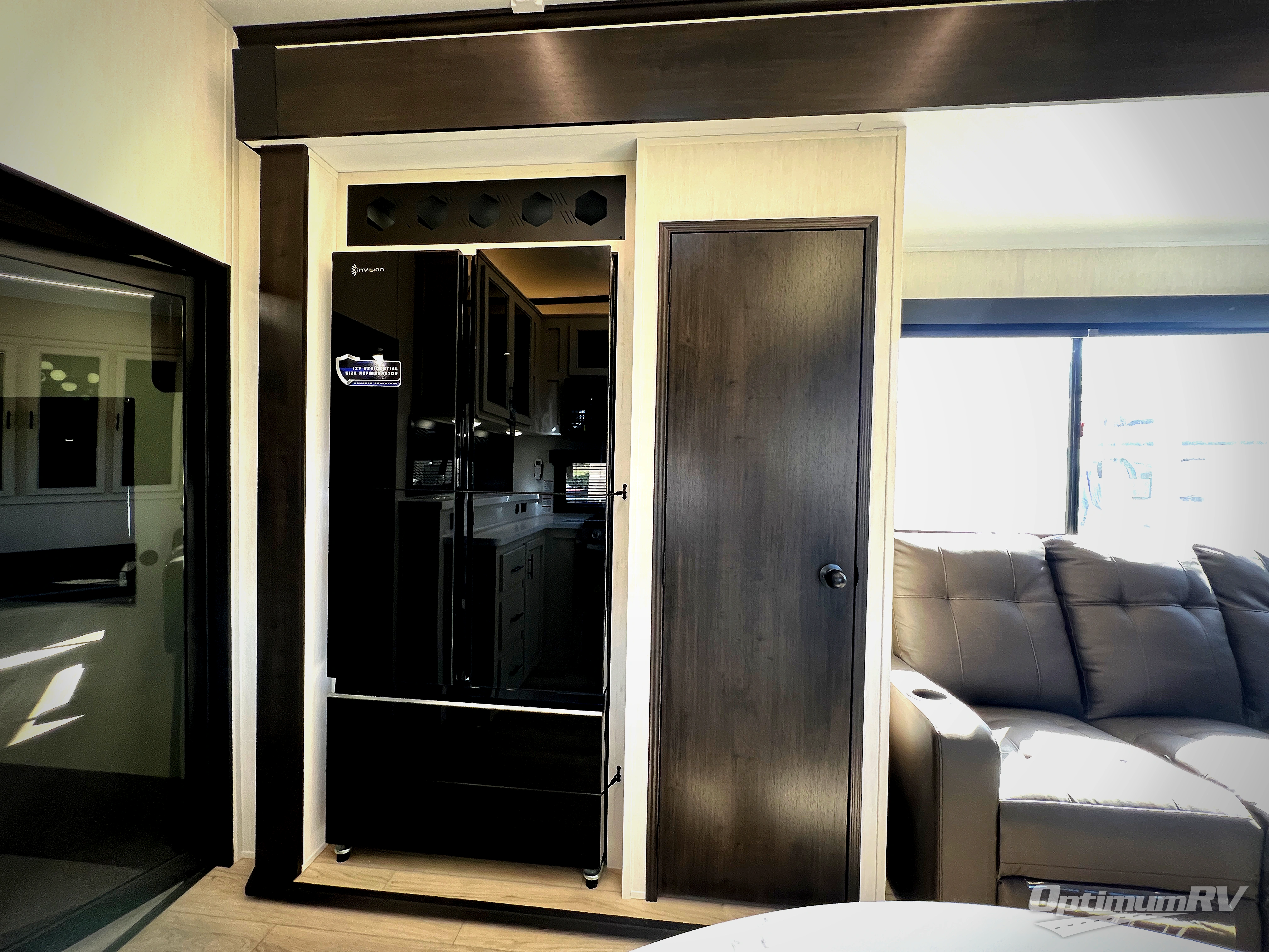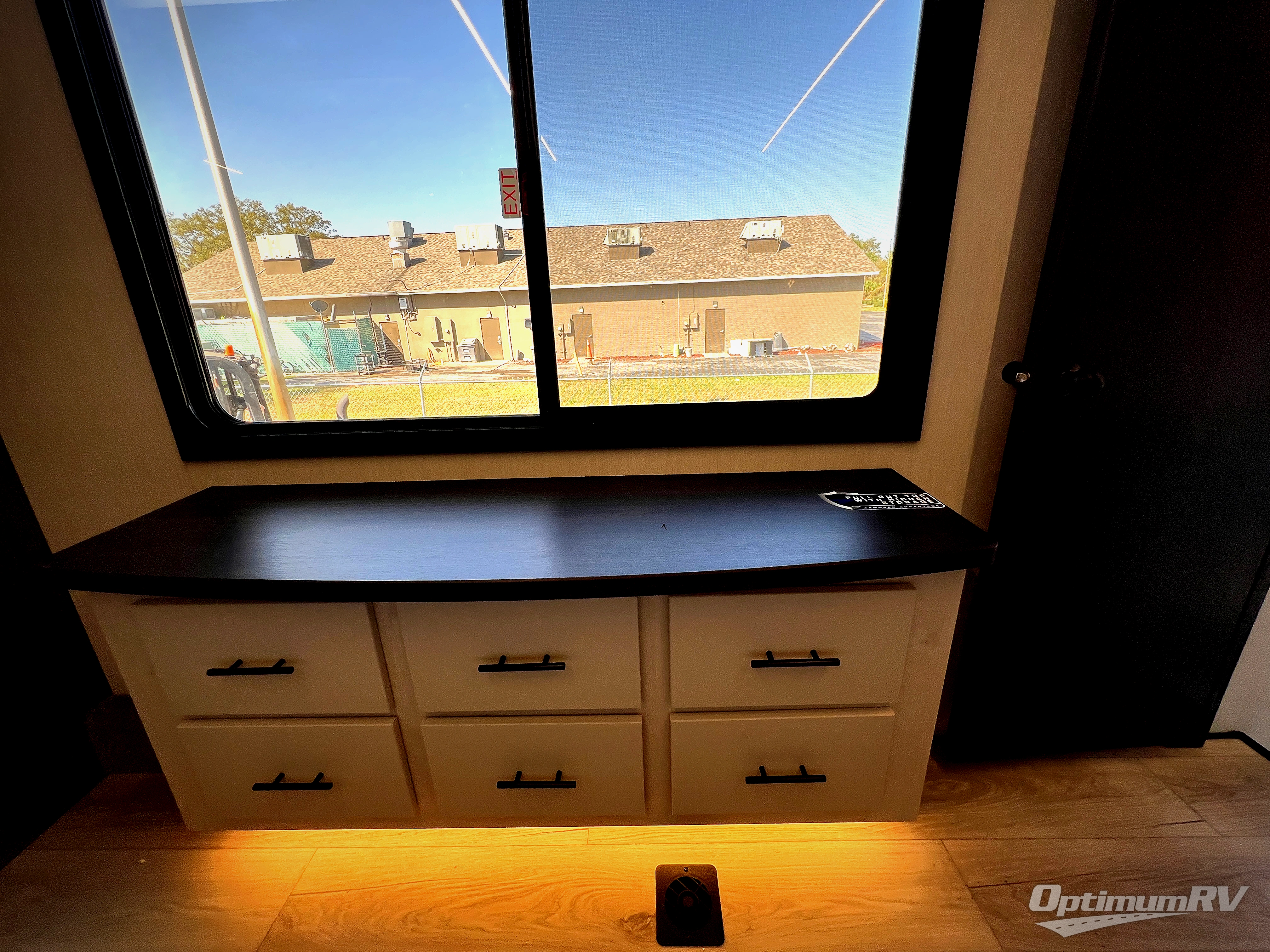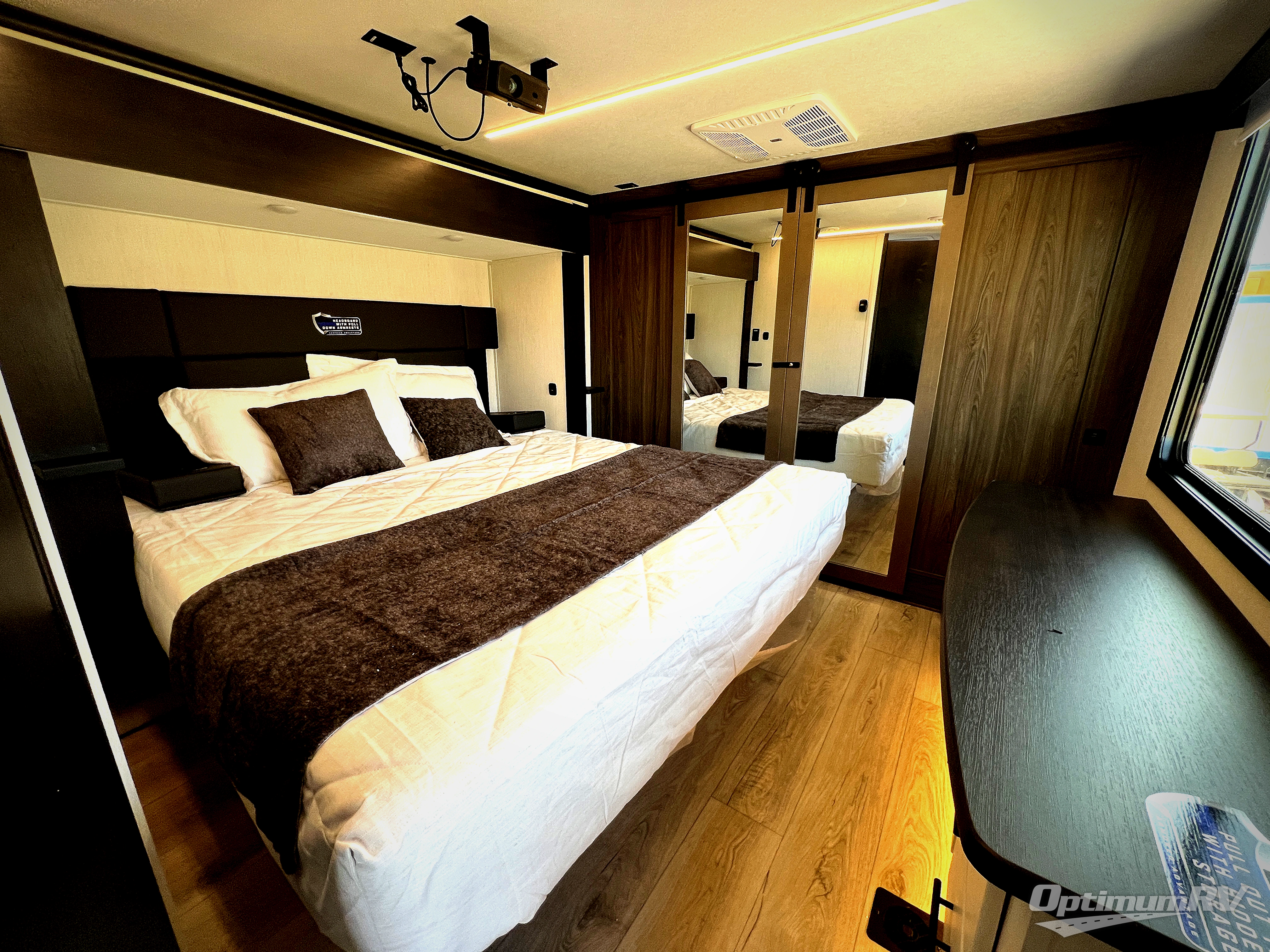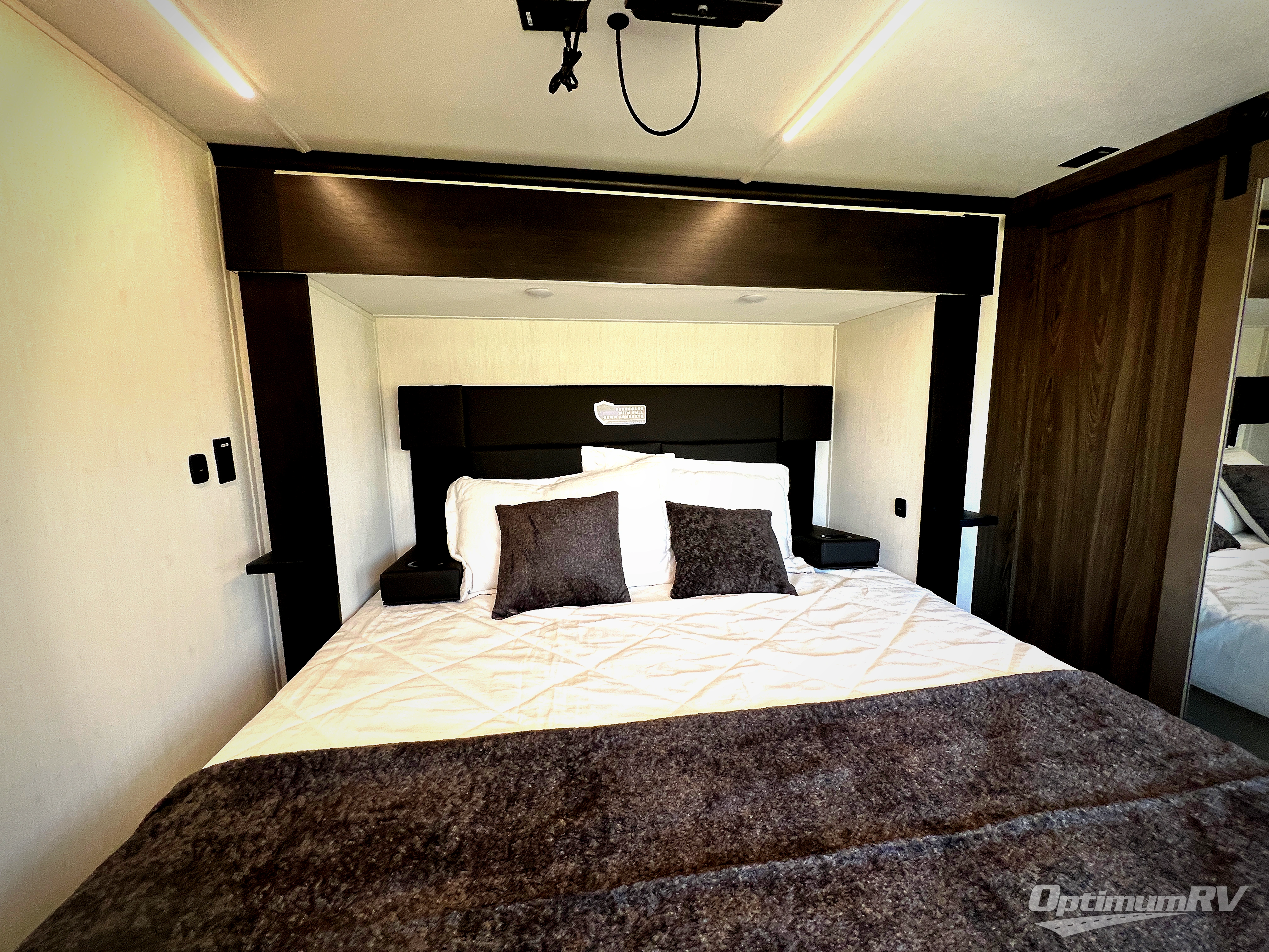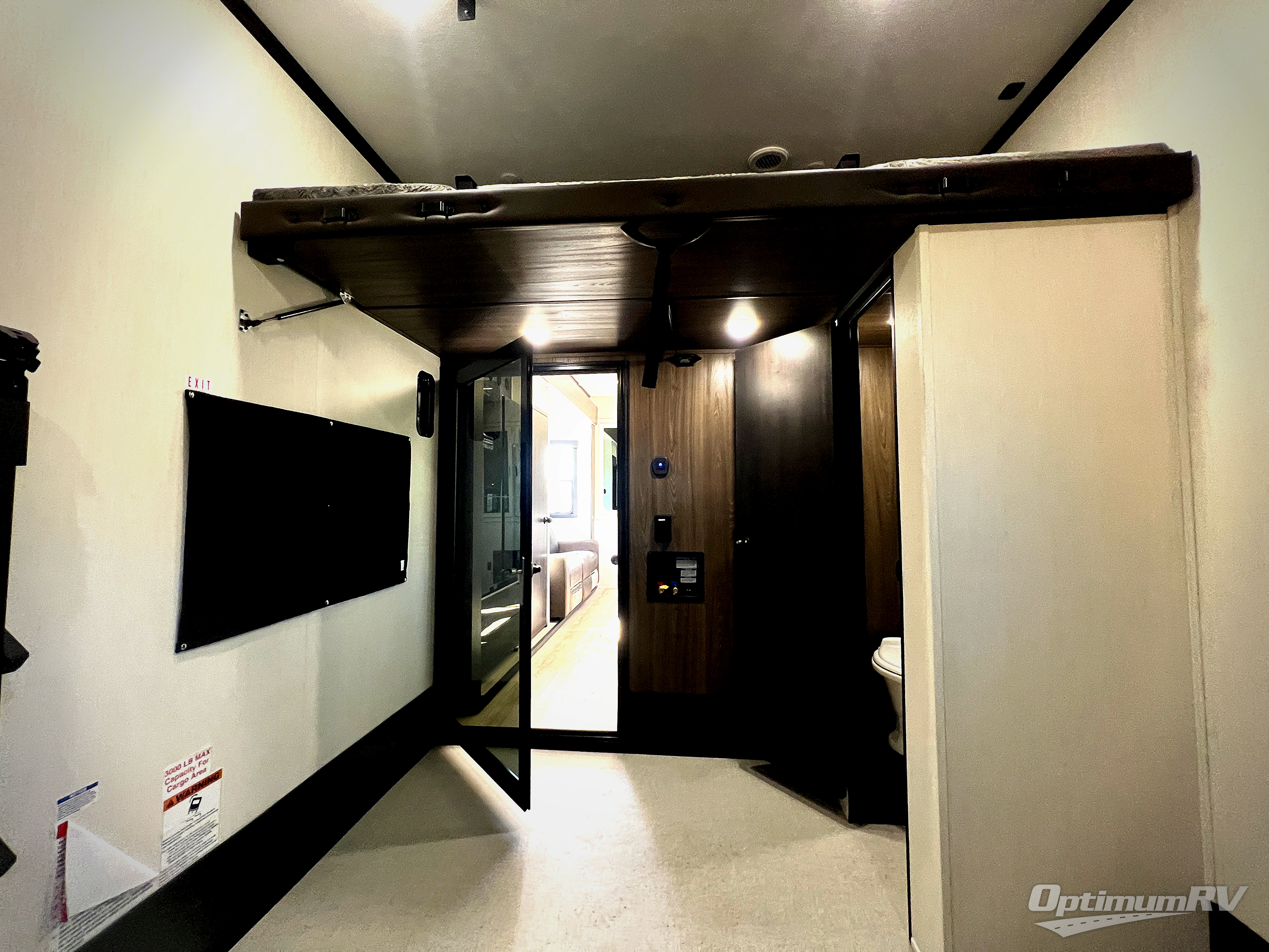 This toy hauler is perfect for a larger group since it can sleep up to eight with the added loft in the garage. There are also dual flip-up sofas here, along with a queen bed above and a half bath for added convenience! The dual entry full bath is up front, creating a master bedroom you are sure to love. There is a king bed slide out, a front wardrobe, and a dresser to keep your things organized. Head to the middle kitchen and living room to relax on the sofa within the large slide out, dine at the table with four chairs, and cook in the full kitchen. This unit also includes a fireplace to make it cozier, a large pantry to keep snacks stocked, and dual power awnings to expand your living space outdoors!