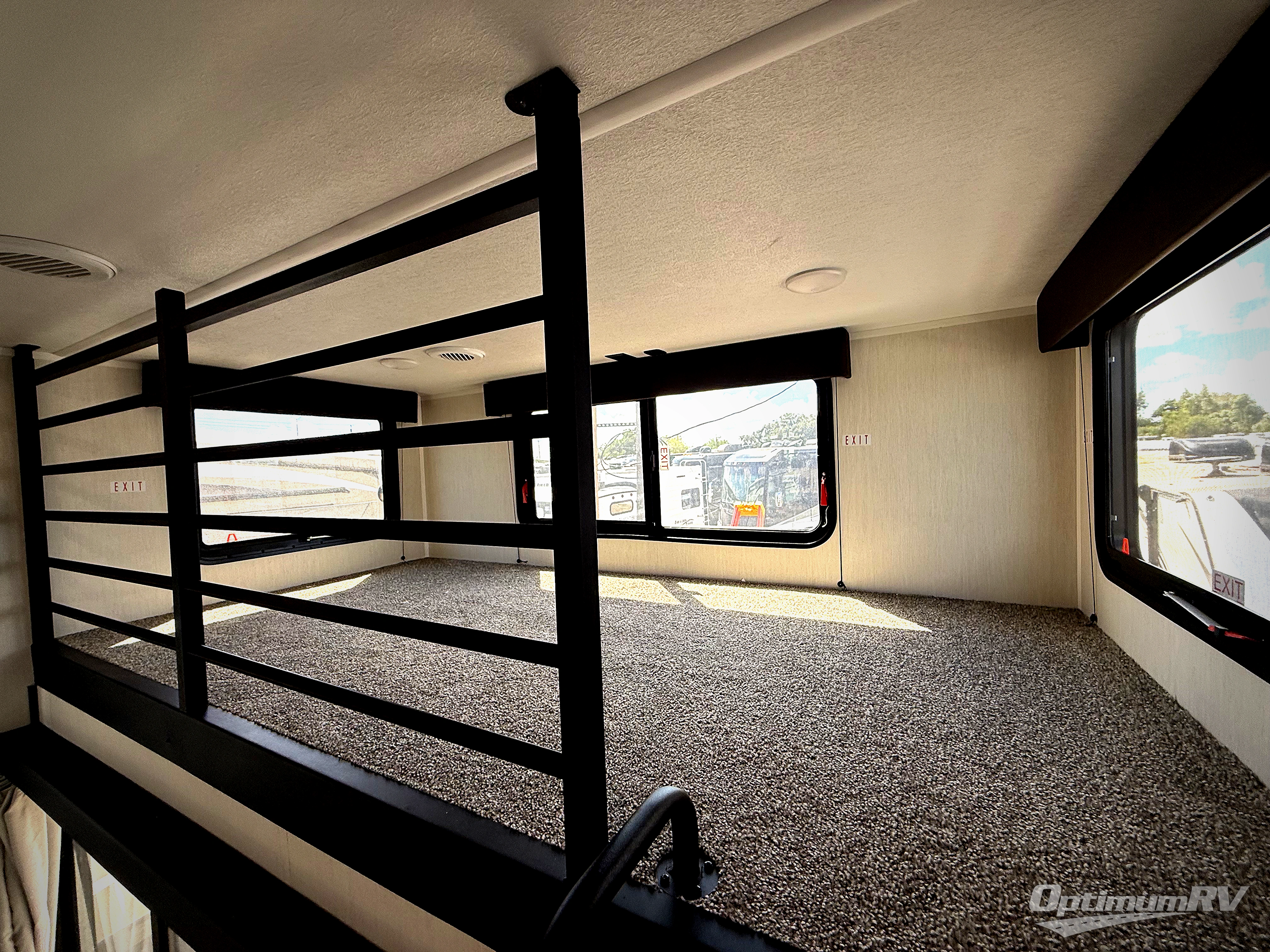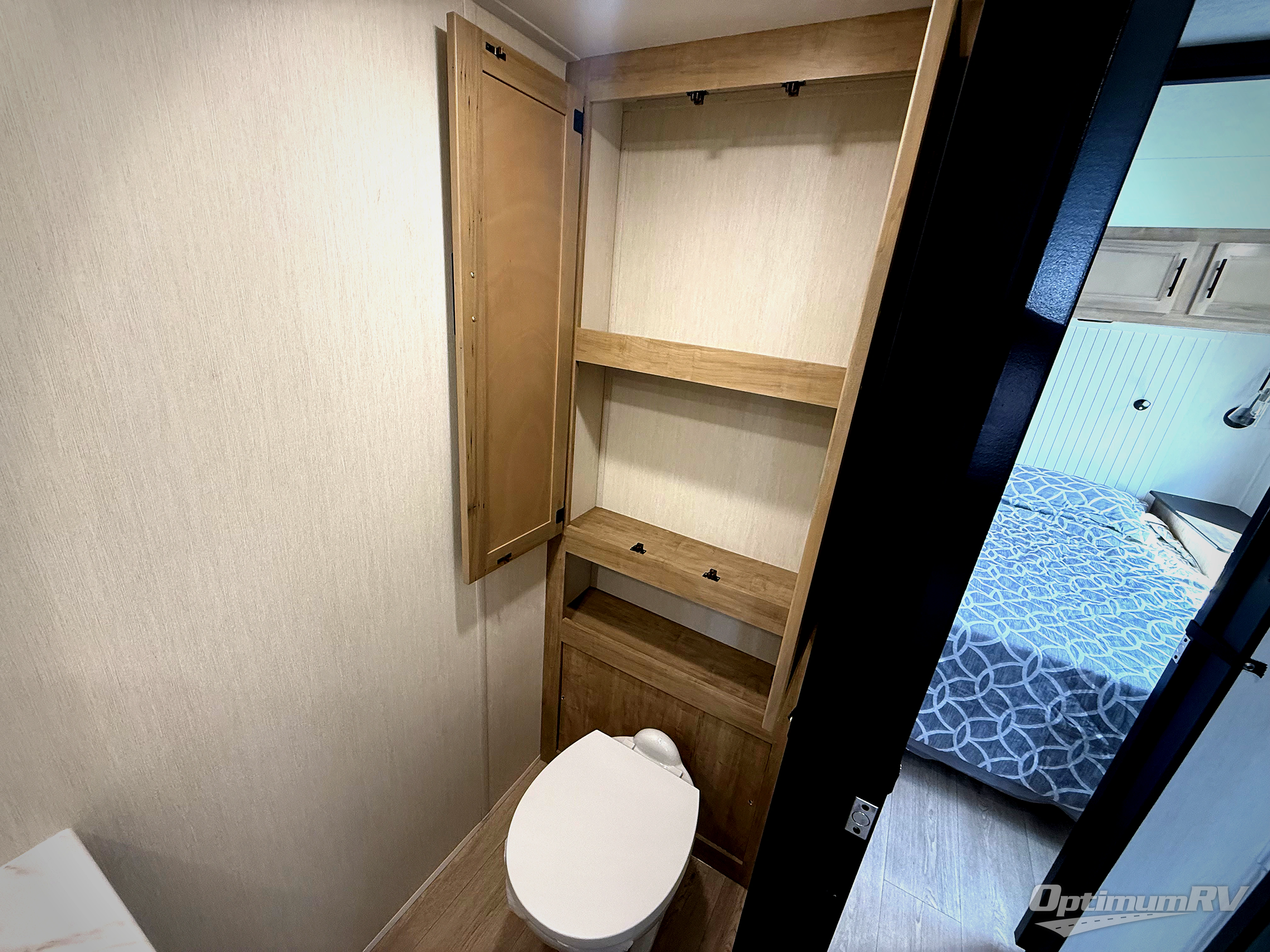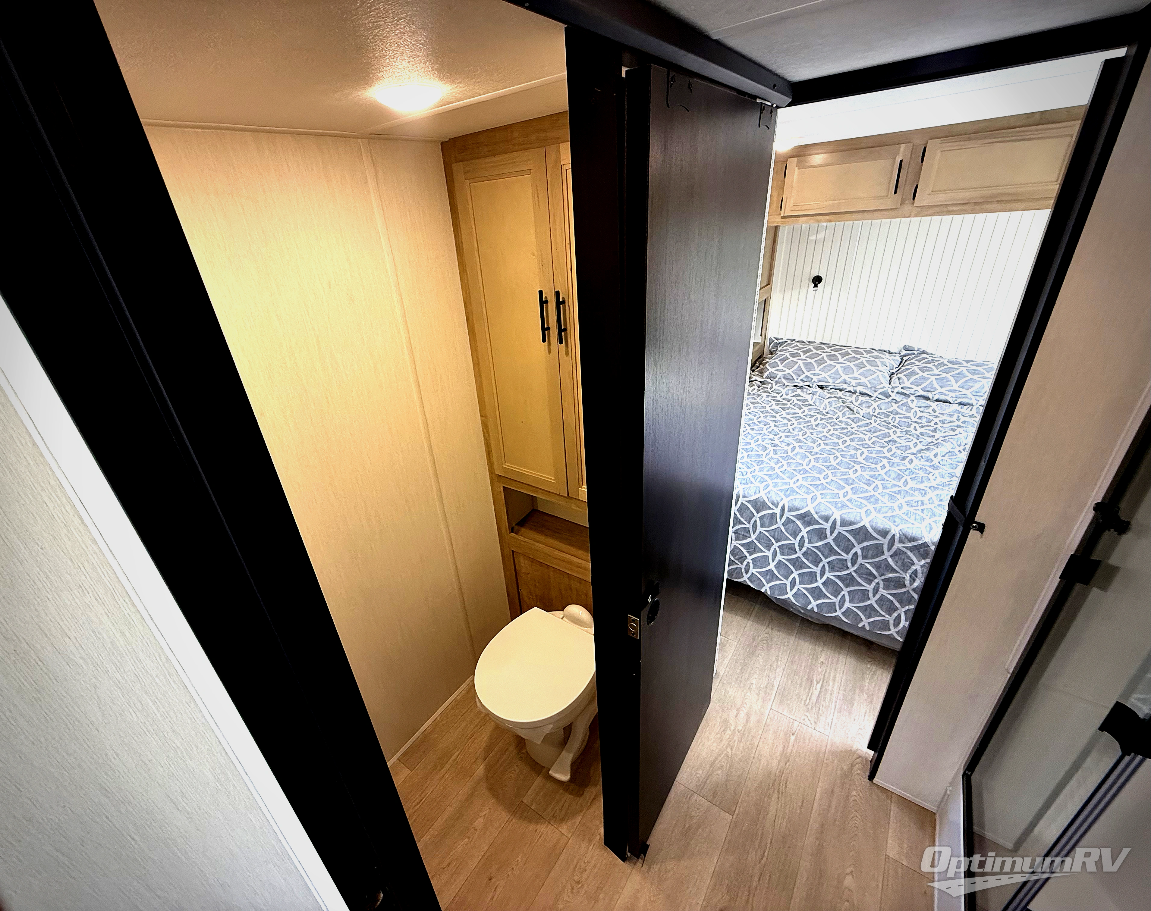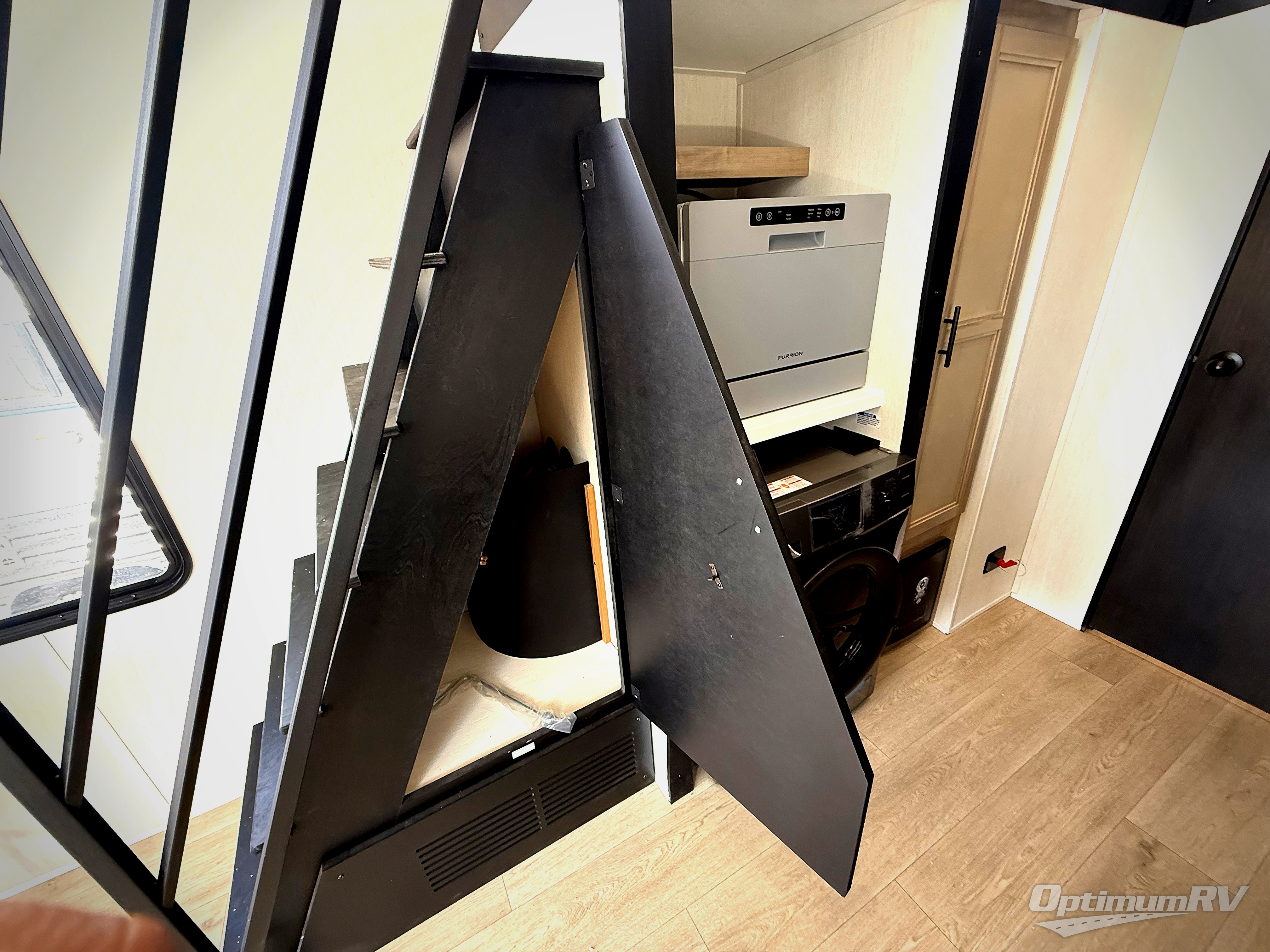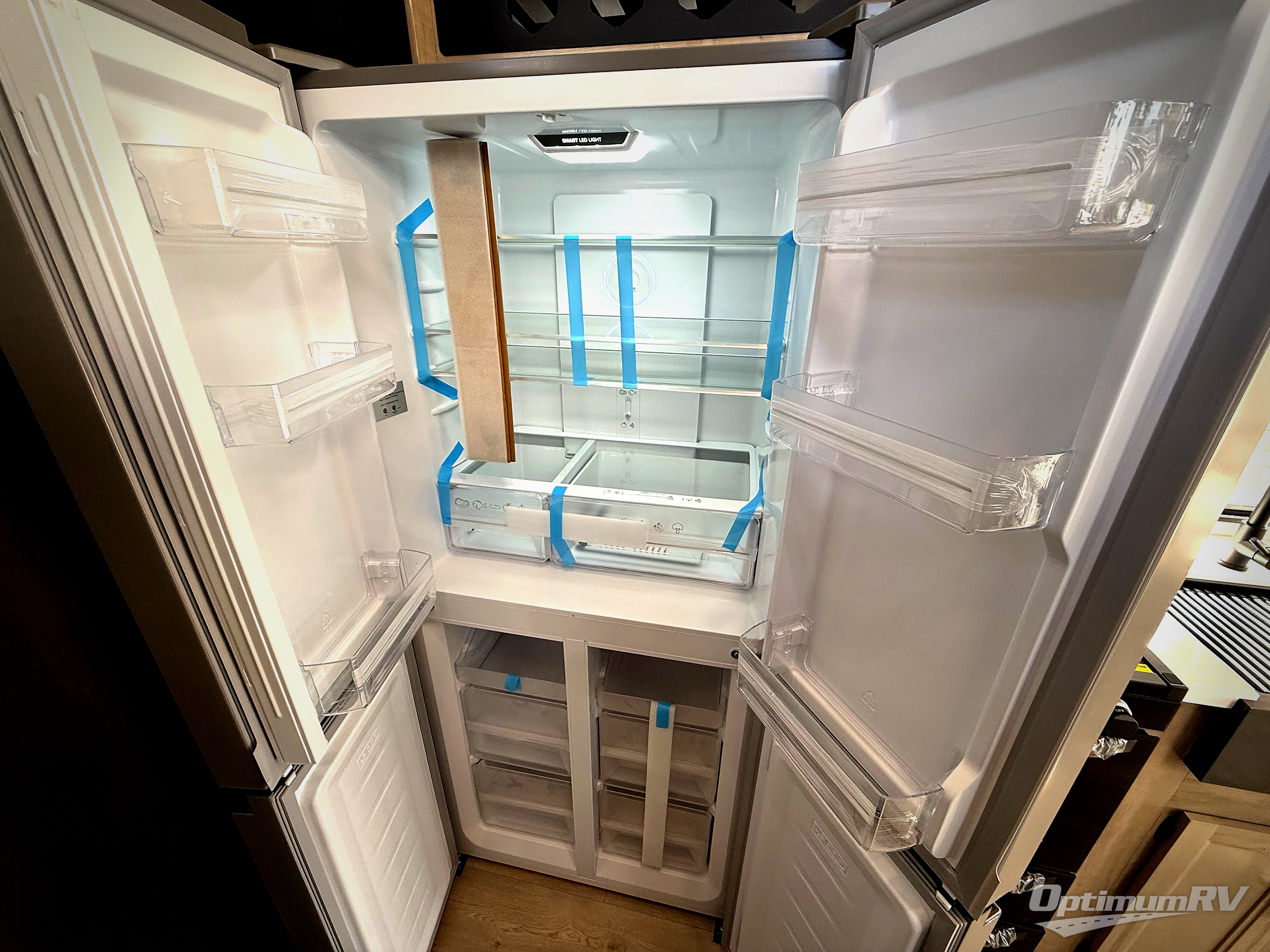 This model is similar to 16ML but larger! A bigger bathroom, RV king bed in the lower master, and a queen bed plus a twin bunk mat in the front loft. And the second loft can be utilized as extra sleeping space or storage space! There is an 18 cu. ft. refrigerator so you can stock up for a week long vacation, a hide-a-bed sofa that can transform into added sleeping for guests, and a high top table with two stools to dine at. The bathroom below is split with a shower on one side, and a private toilet area and sink opposite. And the view is amazing from just about anywhere inside.