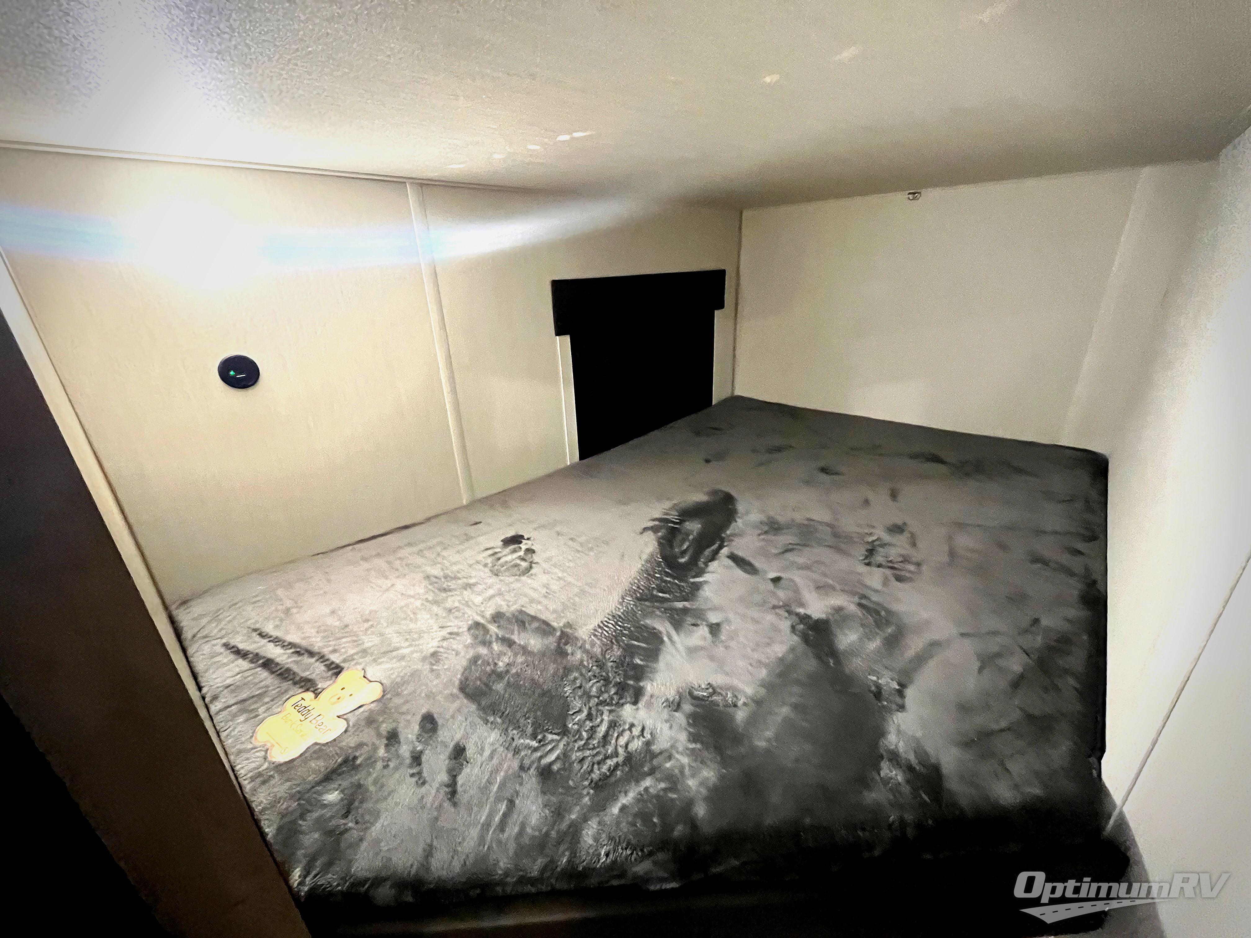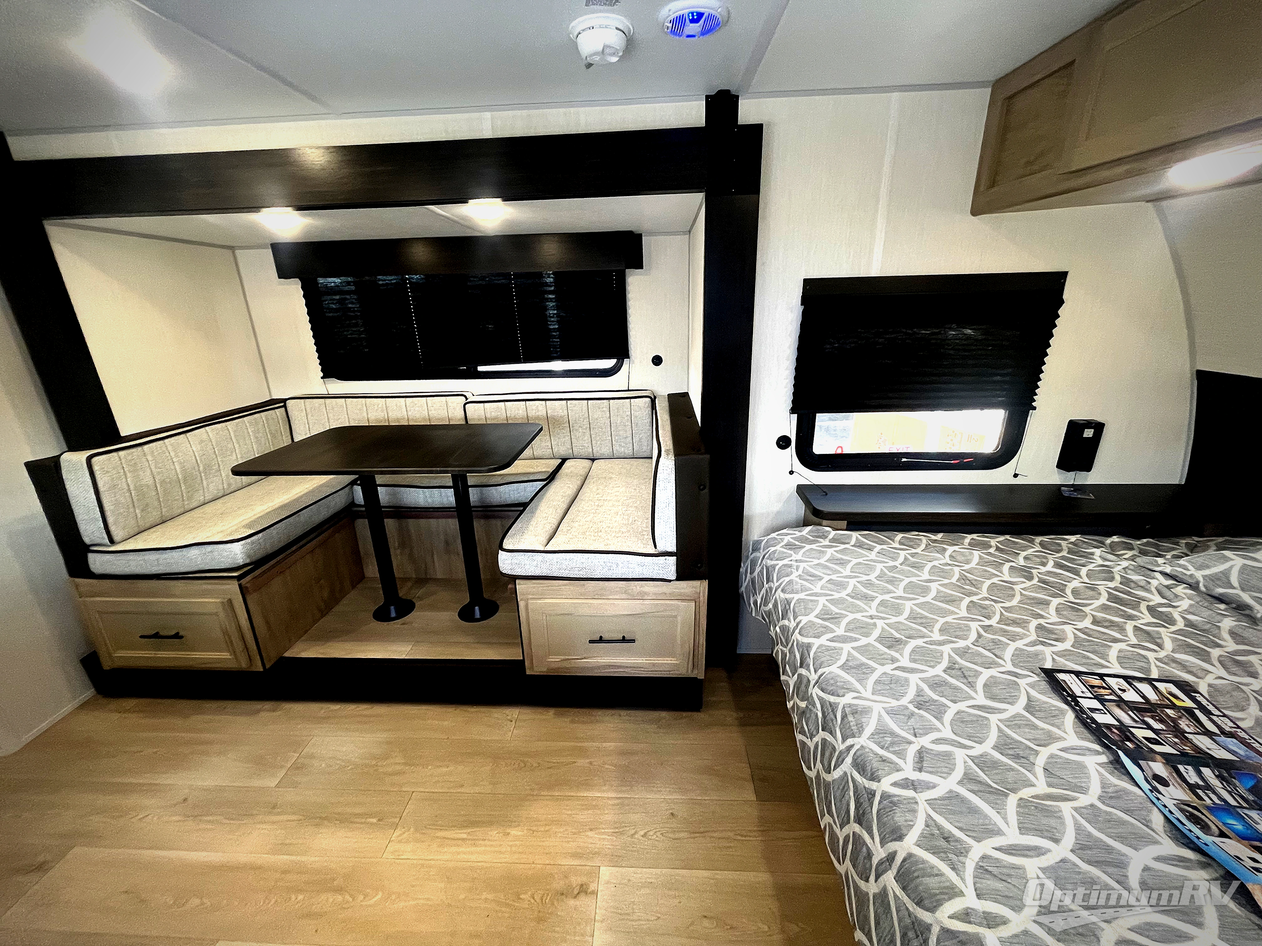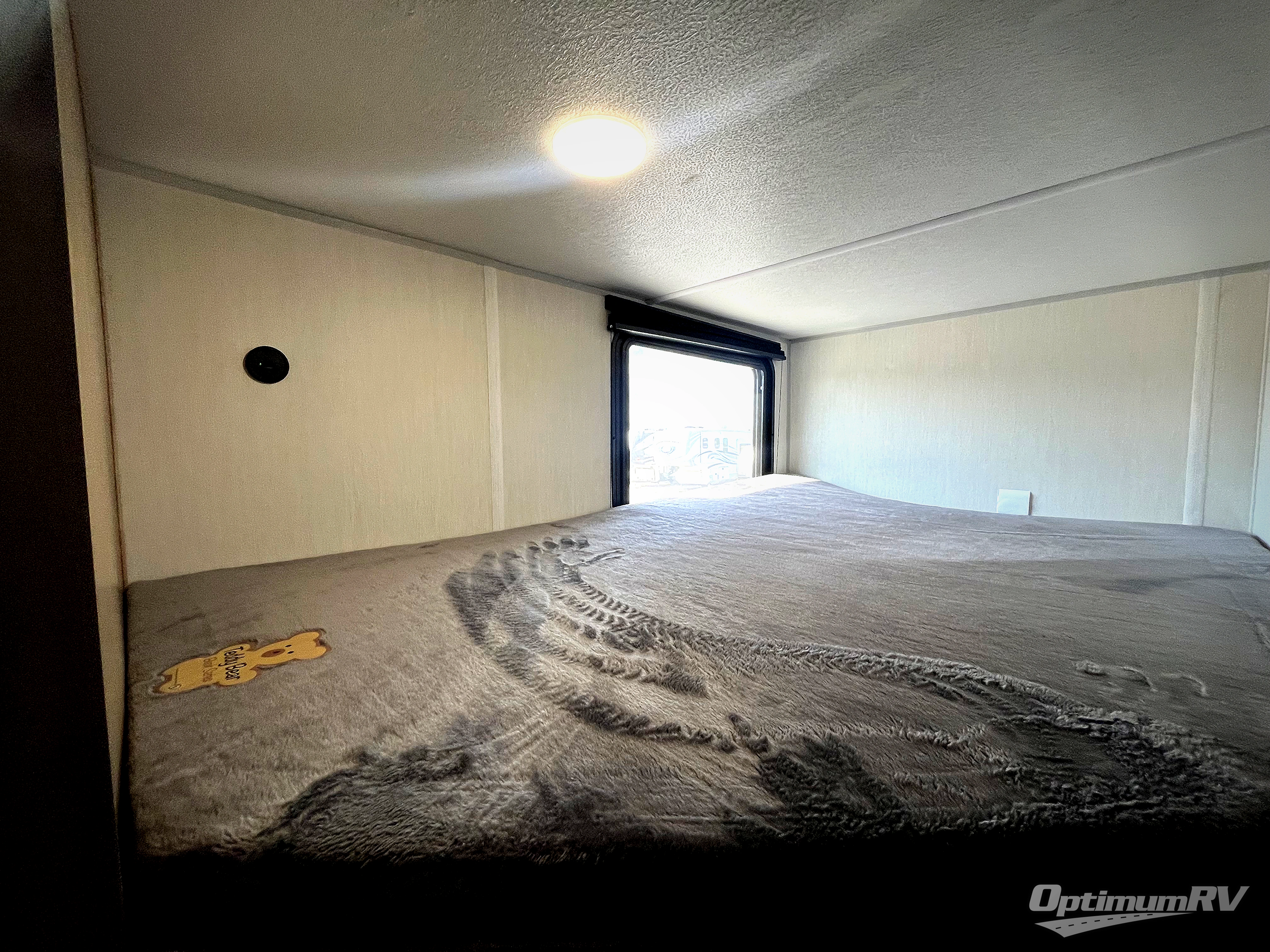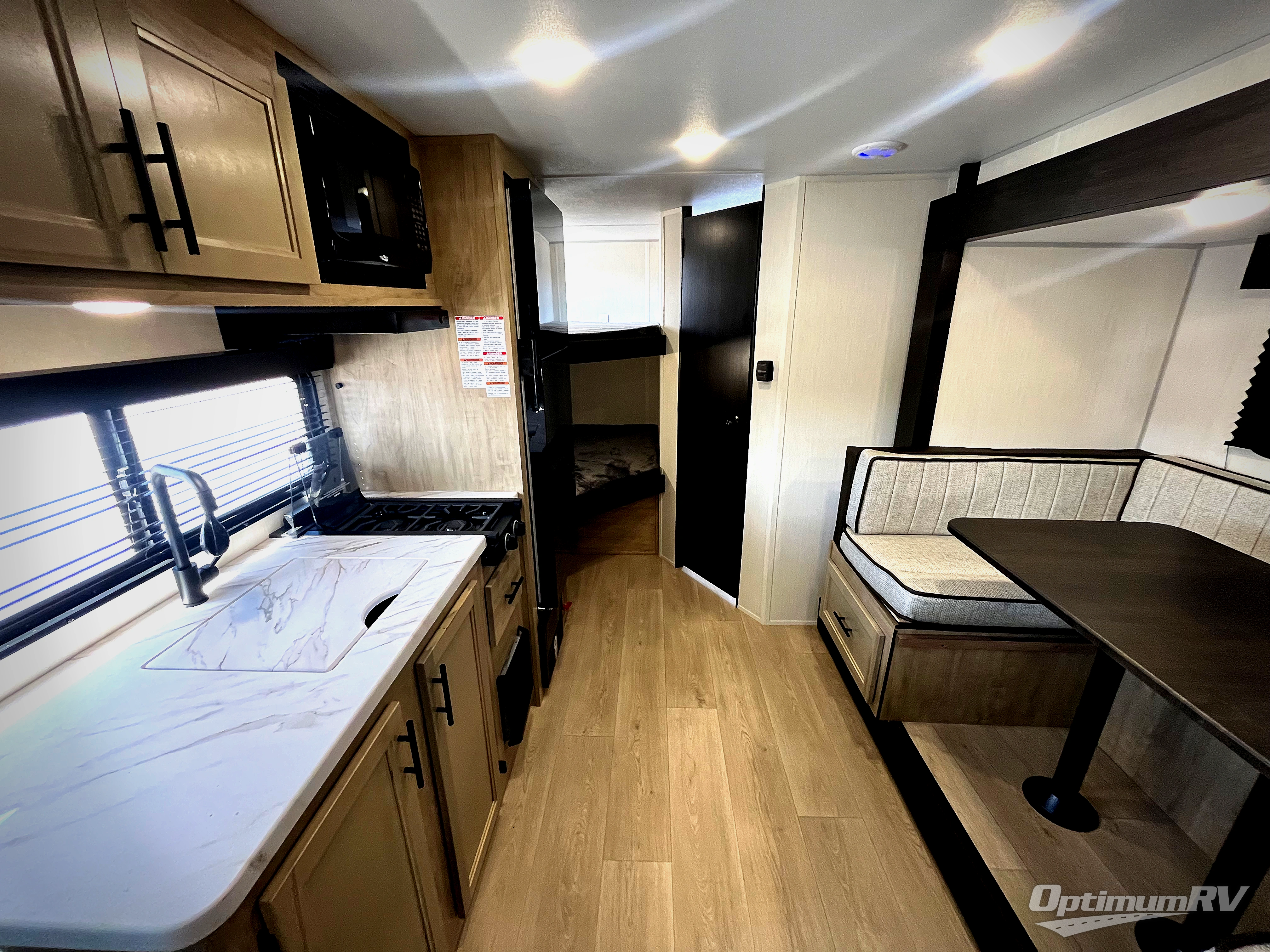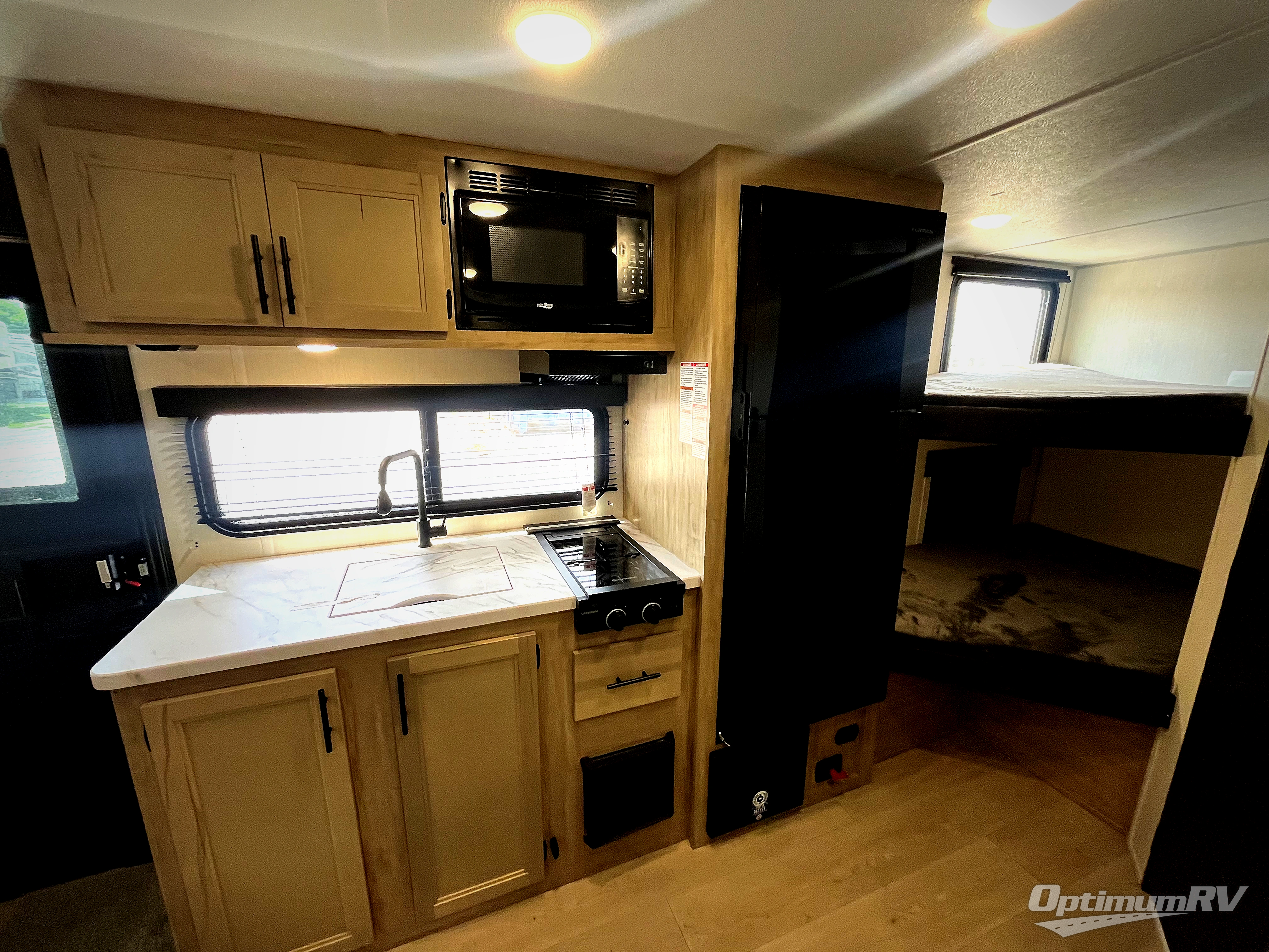 This family travel trailer is ready to head to the campground whenever you are! The kiddos can sleep on the set of double-size bed bunks, and you can sleep on the front queen bed, plus the U-shaped dinette slide can also transform into an extra sleeping space when you aren't using it to enjoy a meal prepared with the cooktop. You can also prepare your delicious meals at the outside mini kitchen and stay protected by the power awning. The exterior not only has outside storage and an outside TV mount but also features an outside storage plus door for access to the storage space underneath the bottom bunk bed. The rear corner bath allows everyone to stay clean and refreshed while you camp.