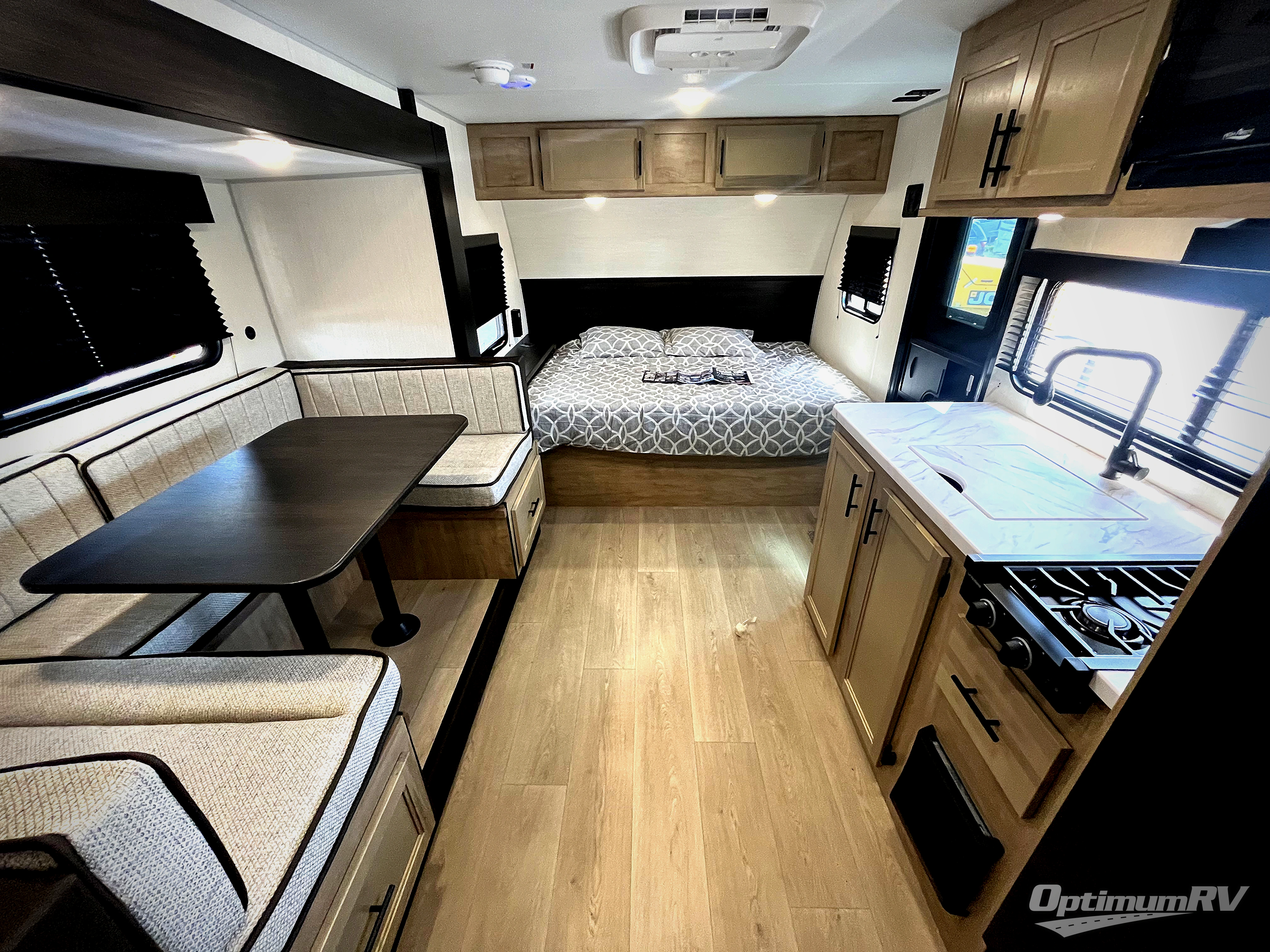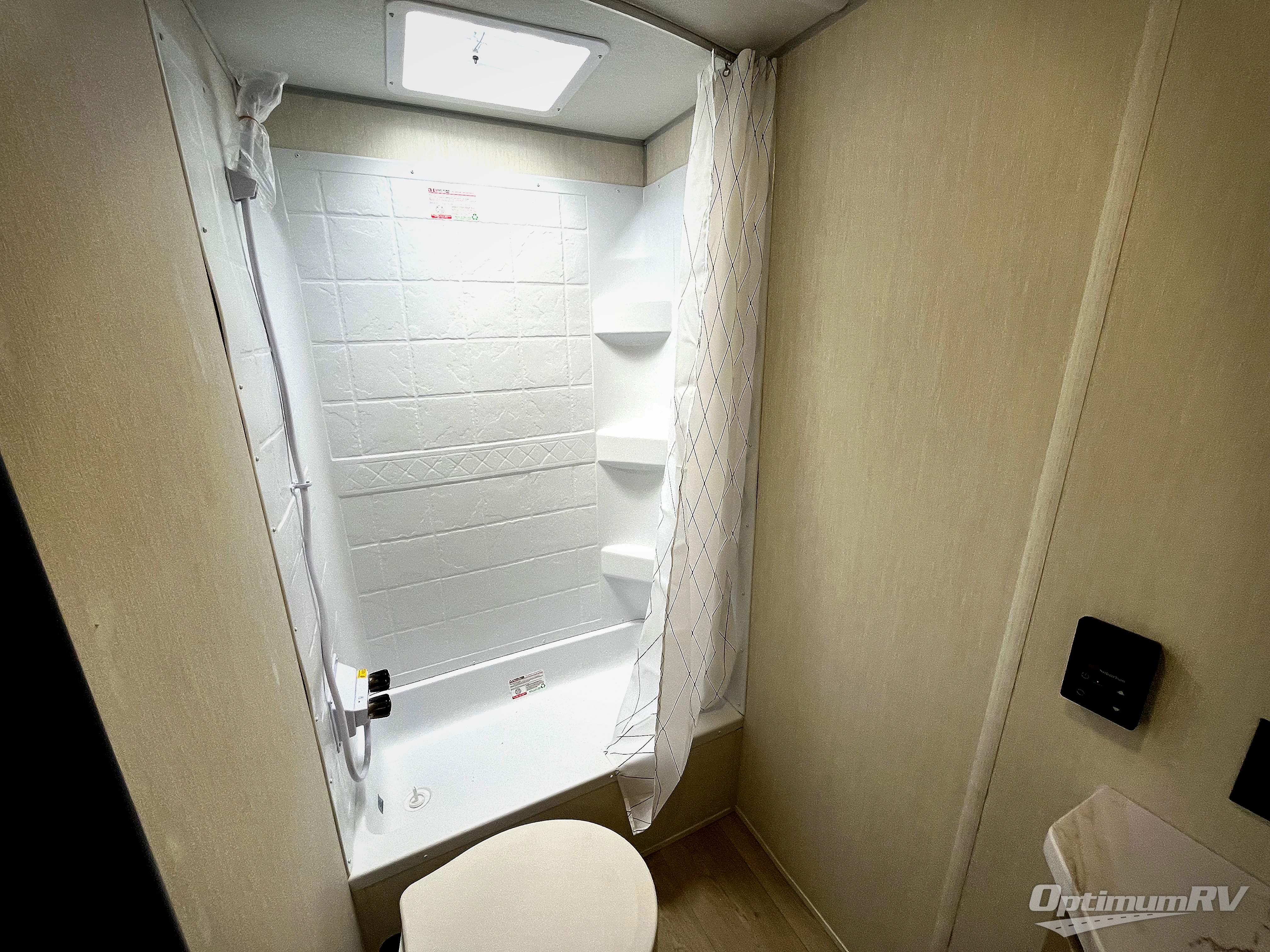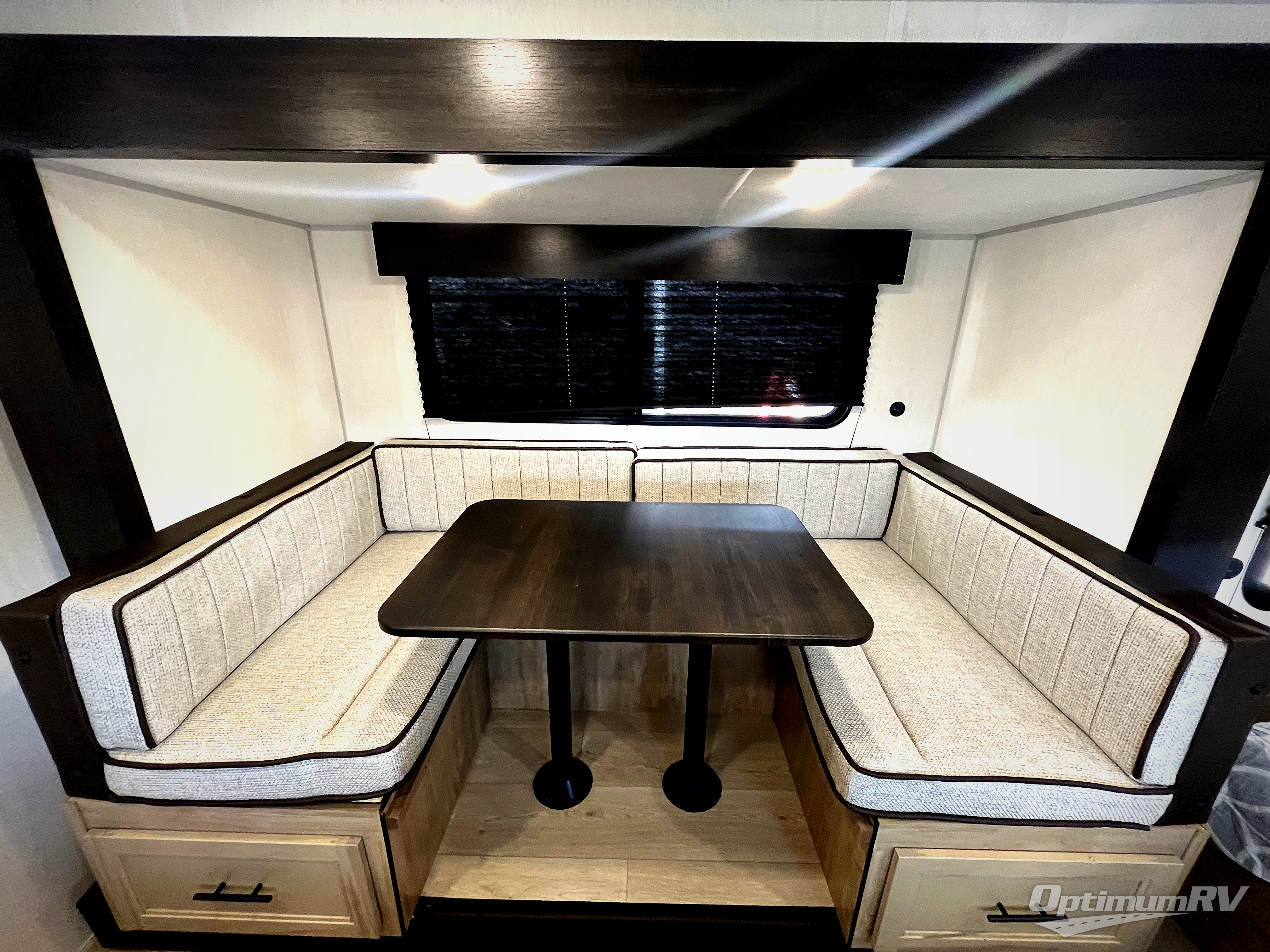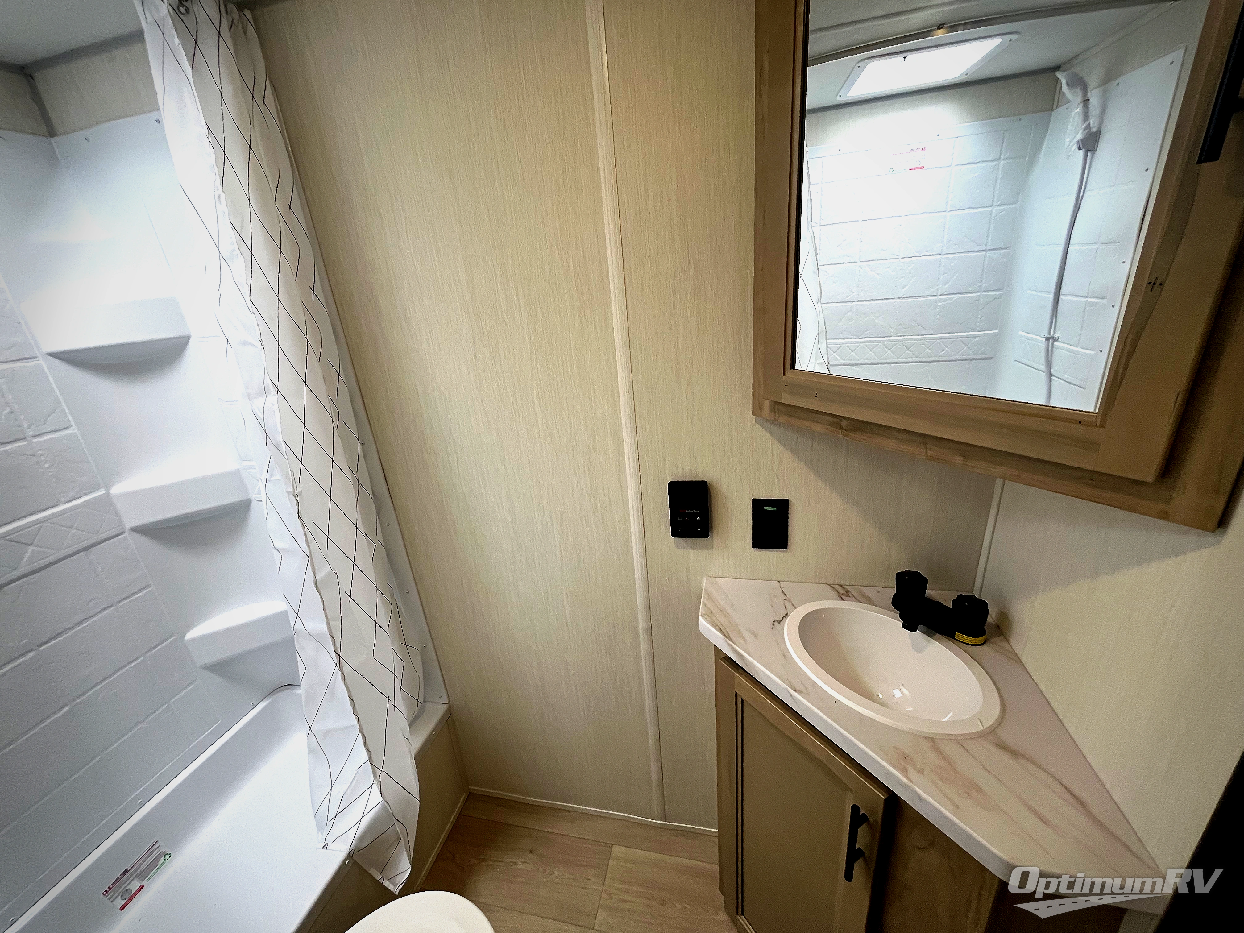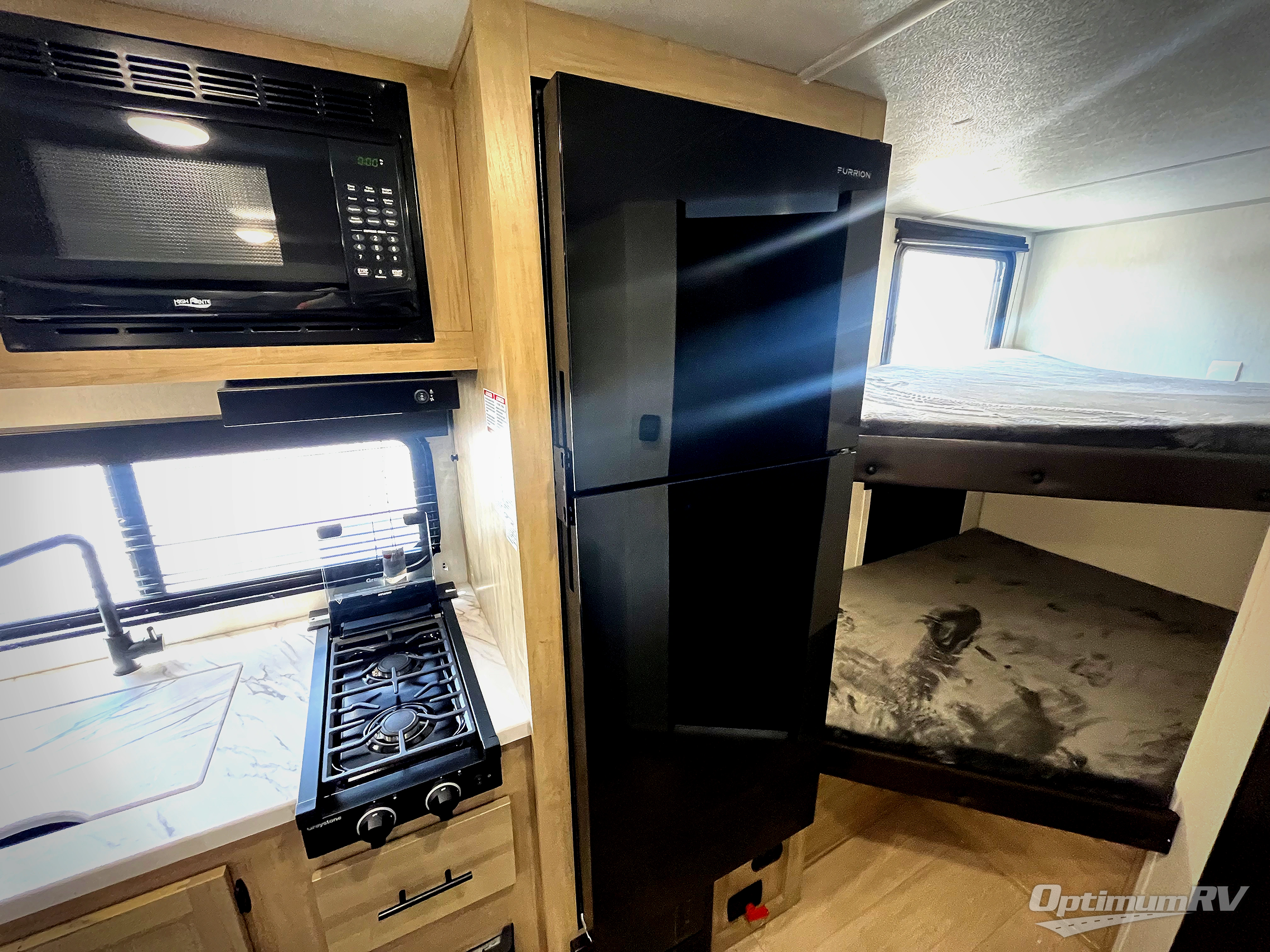 This family travel trailer is ready to head to the campground whenever you are! The kiddos can sleep on the set of double-size bed bunks, and you can sleep on the front queen bed, plus the U-shaped dinette slide can also transform into an extra sleeping space when you aren't using it to enjoy a meal prepared with the cooktop. You can also prepare your delicious meals at the outside mini kitchen and stay protected by the power awning. The exterior not only has outside storage and an outside TV mount but also features an outside storage plus door for access to the storage space underneath the bottom bunk bed. The rear corner bath allows everyone to stay clean and refreshed while you camp.