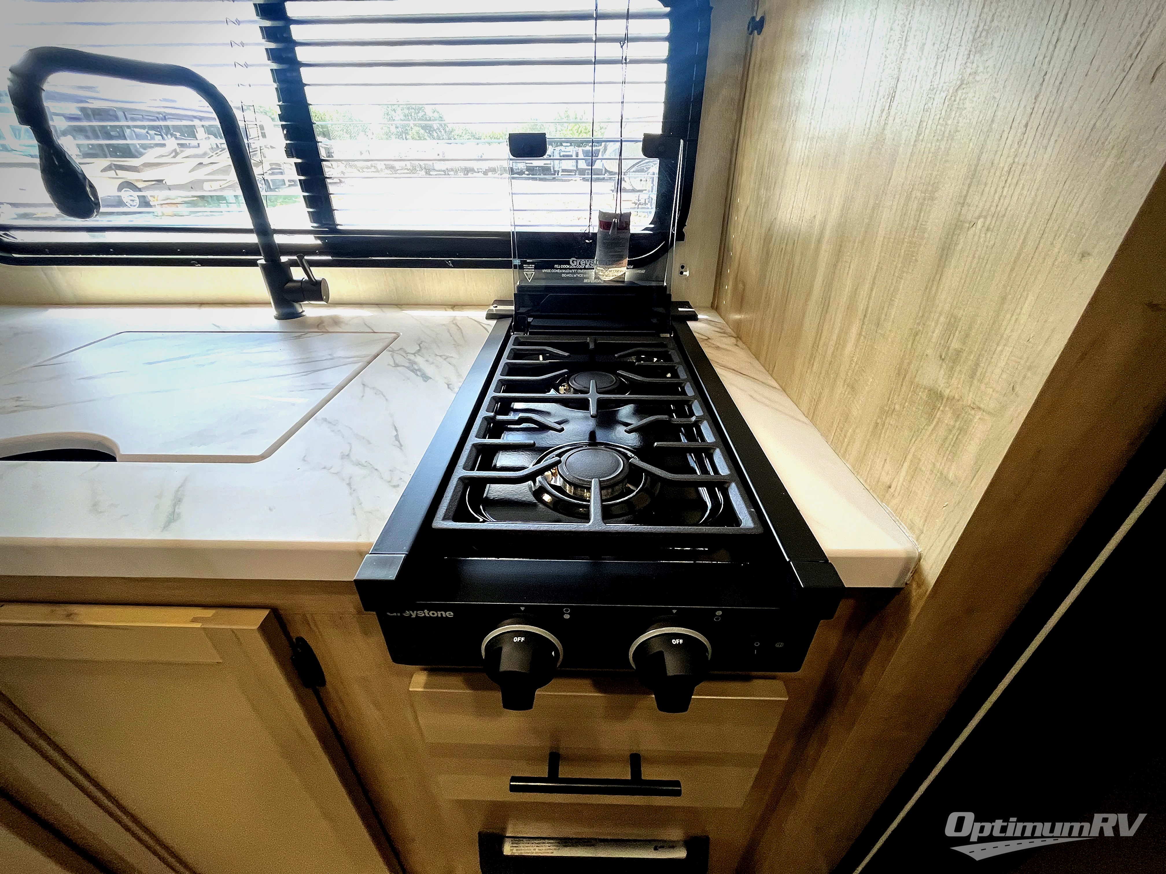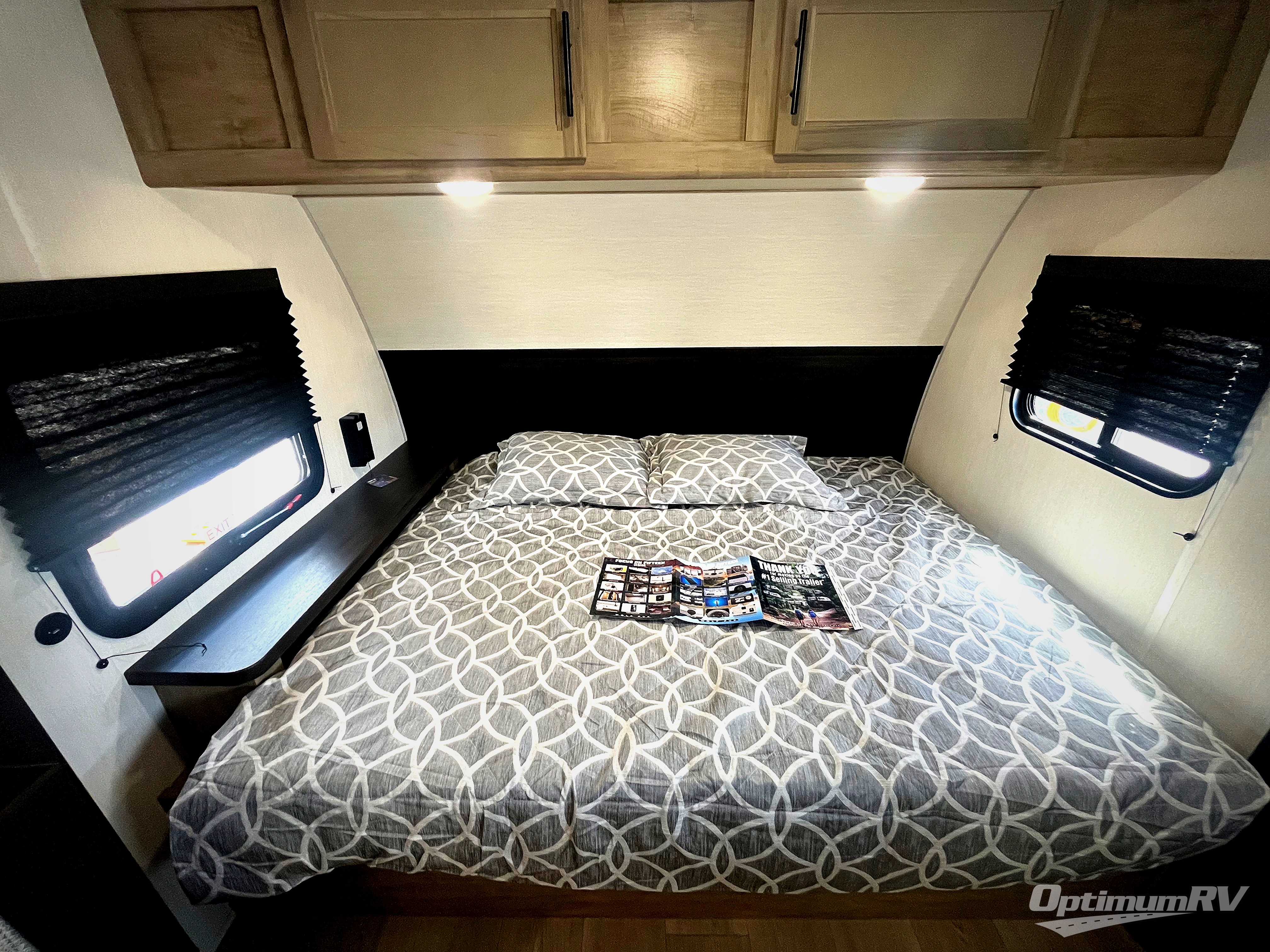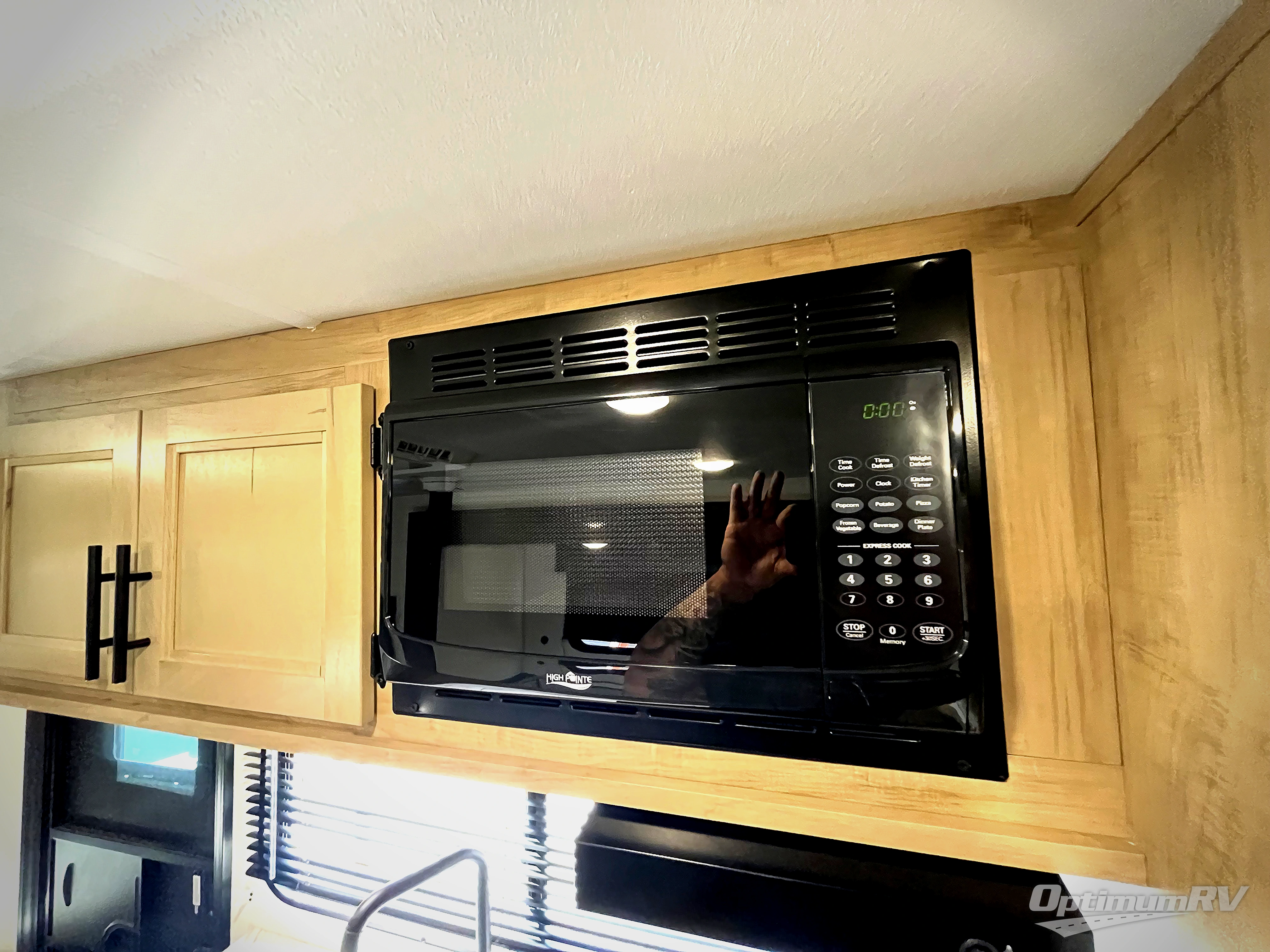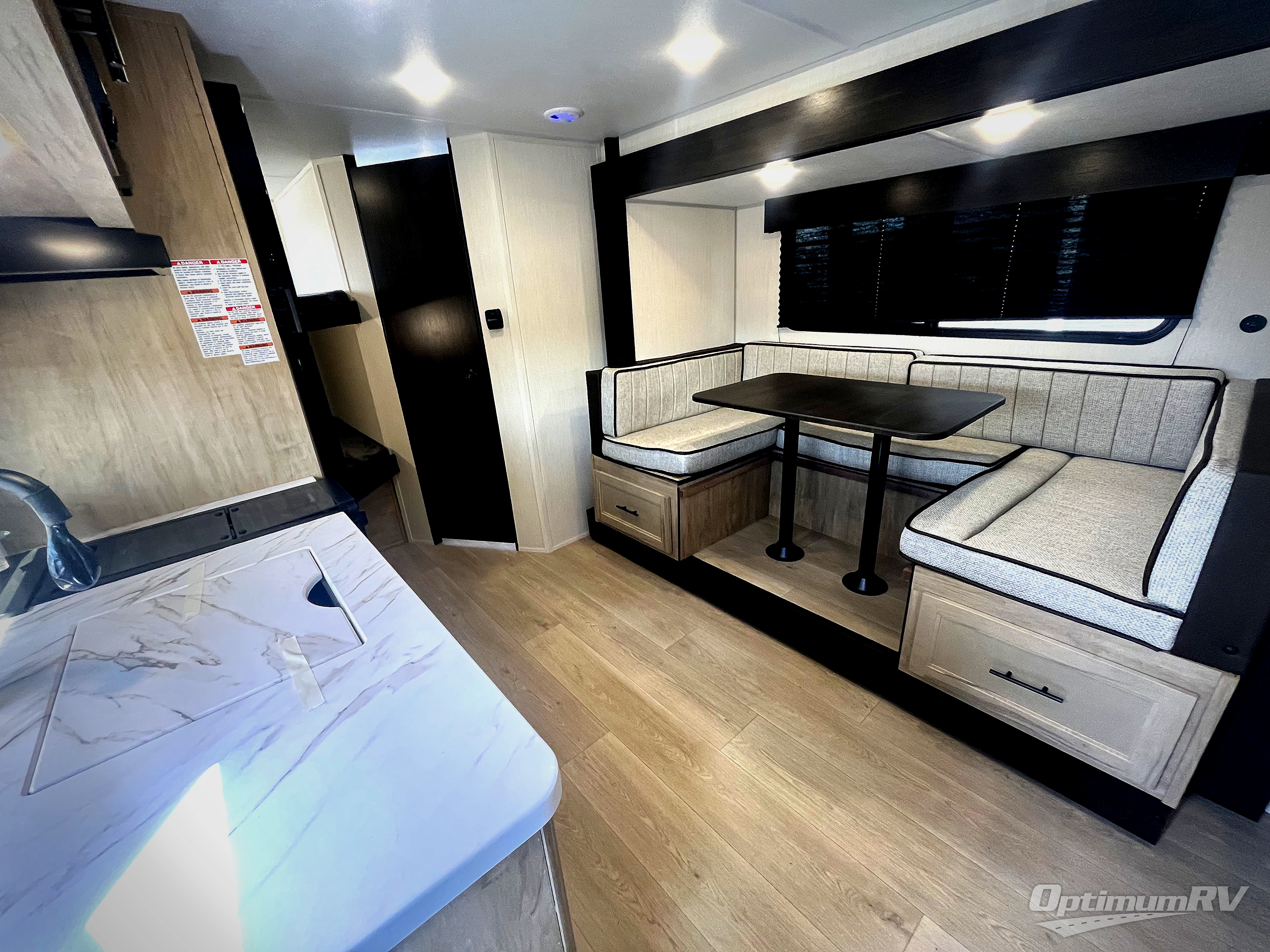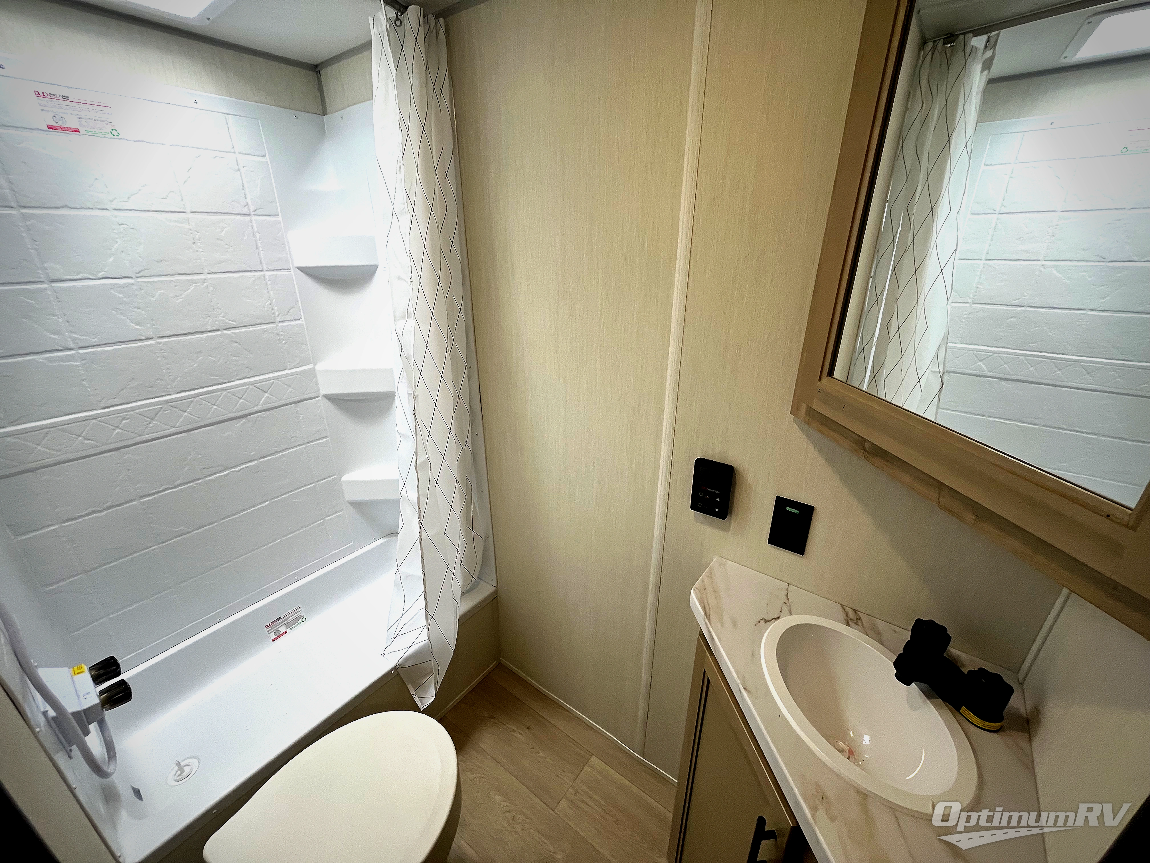 This family travel trailer is ready to head to the campground whenever you are! The kiddos can sleep on the set of double-size bed bunks, and you can sleep on the front queen bed, plus the U-shaped dinette slide can also transform into an extra sleeping space when you aren't using it to enjoy a meal prepared with the cooktop. You can also prepare your delicious meals at the outside mini kitchen and stay protected by the power awning. The exterior not only has outside storage and an outside TV mount but also features an outside storage plus door for access to the storage space underneath the bottom bunk bed. The rear corner bath allows everyone to stay clean and refreshed while you camp.