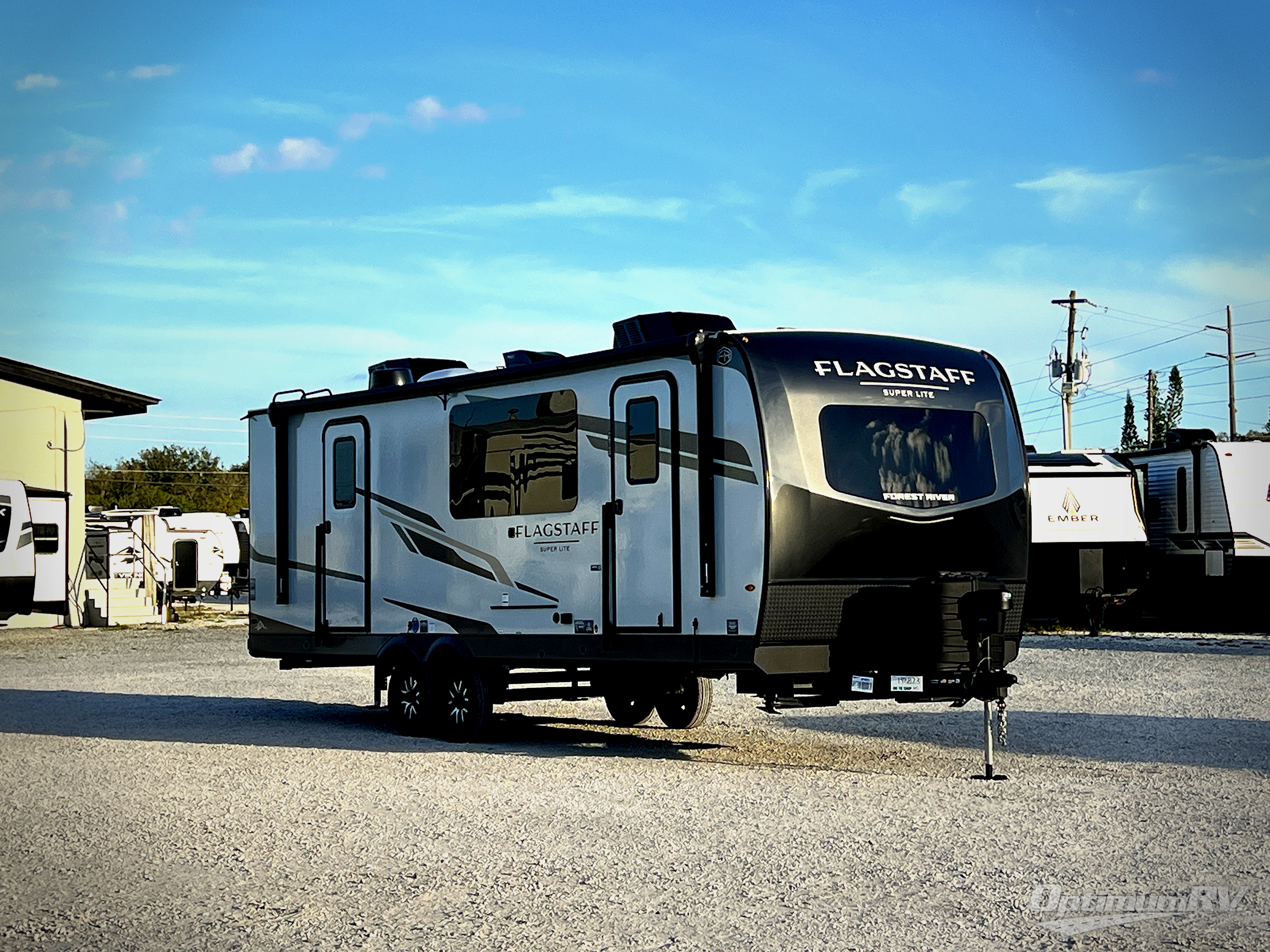 With any Flagstaff Super Lite travel trailer by Forest River, you can enjoy quality features with lightweight towing! The Climate Protection Package includes radiant foil in the front cap, underbelly, and slides, plus there are 12V thermostat-controlled heated tanks for added protection. The complete composite wall construction and 6-sided full-aluminum frame is ultra durable, and the RoadTech tire pressure monitoring adds safety. Each model also includes the Coast to Coast Package that comes with slam latch baggage doors, a high gloss fiberglass cap, Goodyear Endurance tires, plus a 200W solar panel with an optional additional 200W panel for more off grid capabilities. Inside, you'll love the roller shades, solid surface kitchen countertops, a shower miser system, and many more comforts!